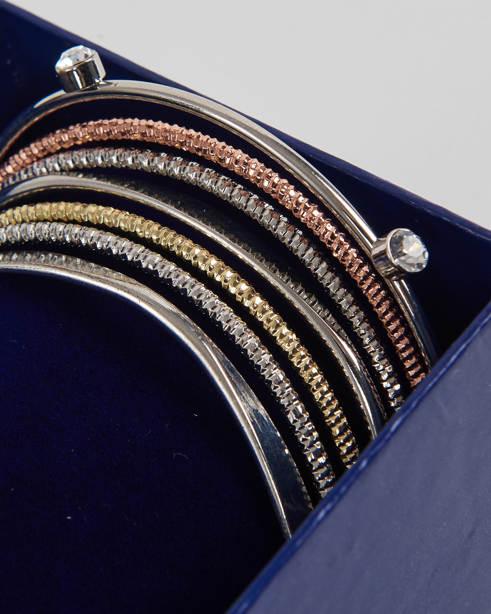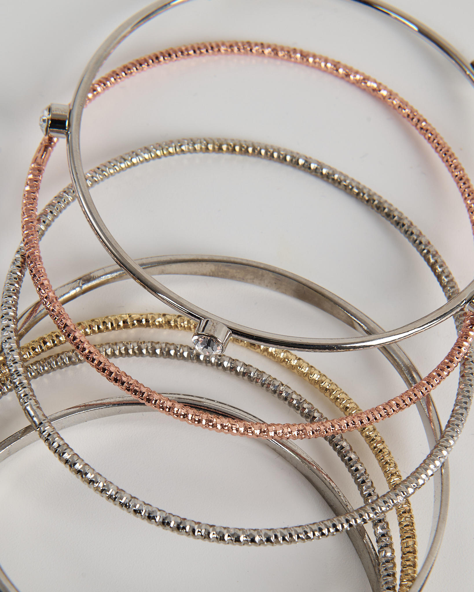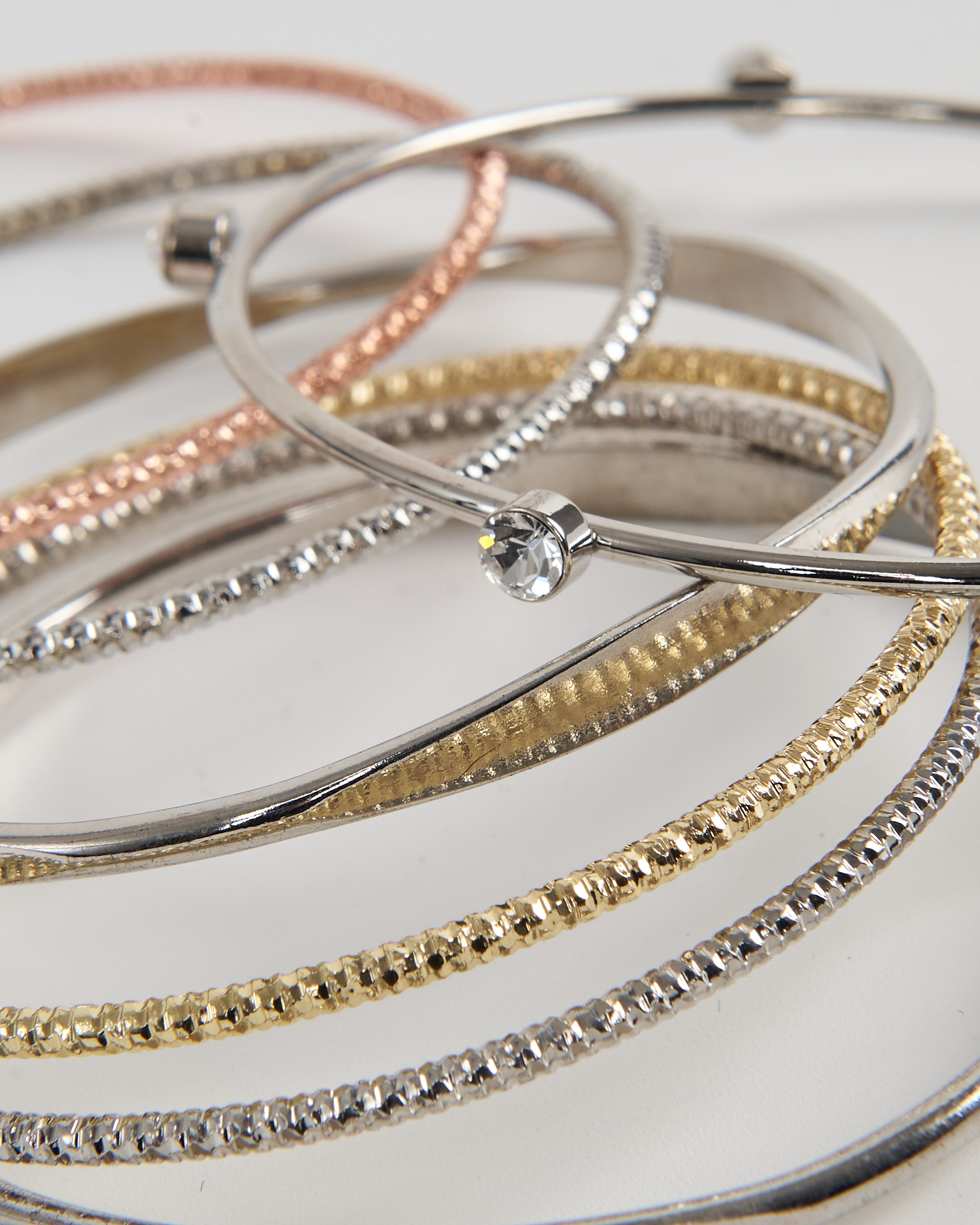 Браслет из металла в трёх оттенках: серебро, золото и розовое золото. Поверхность гладкая и фактурная. Декоративные вставки с кристаллами добавляют акцент.