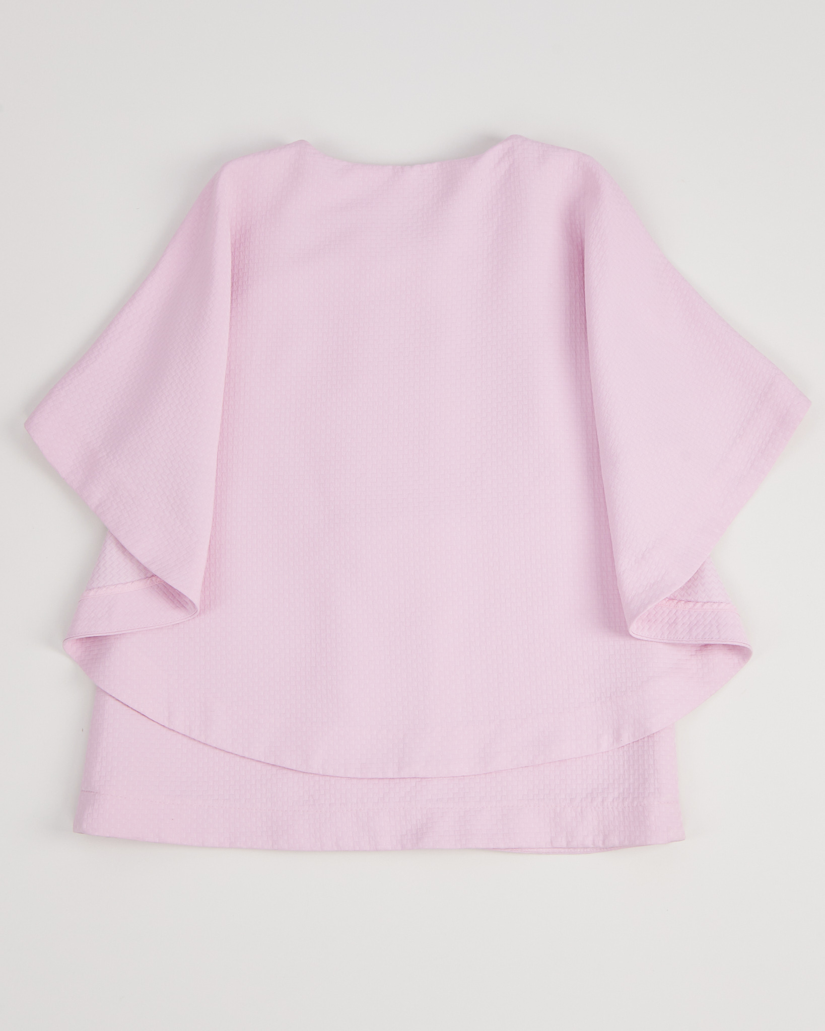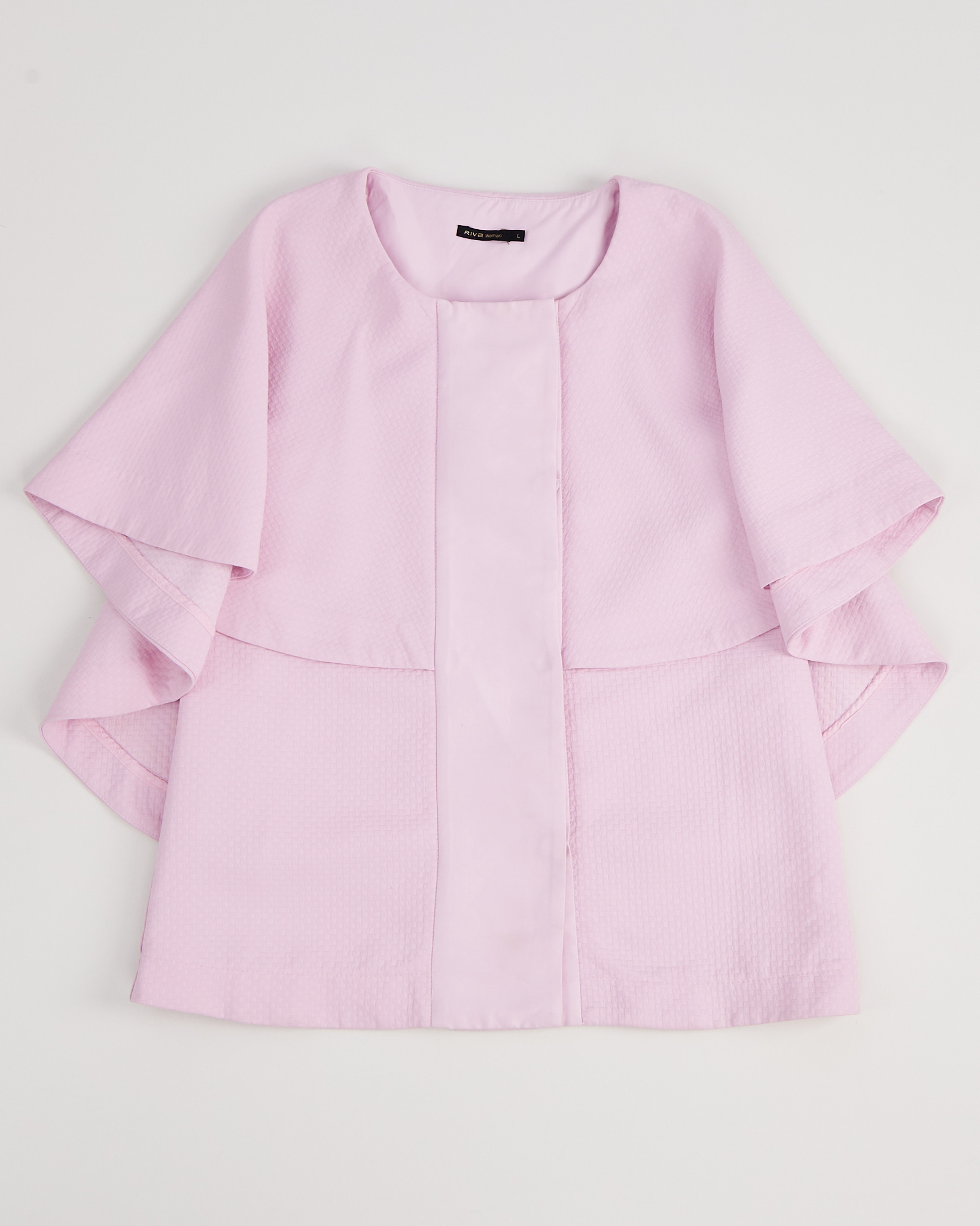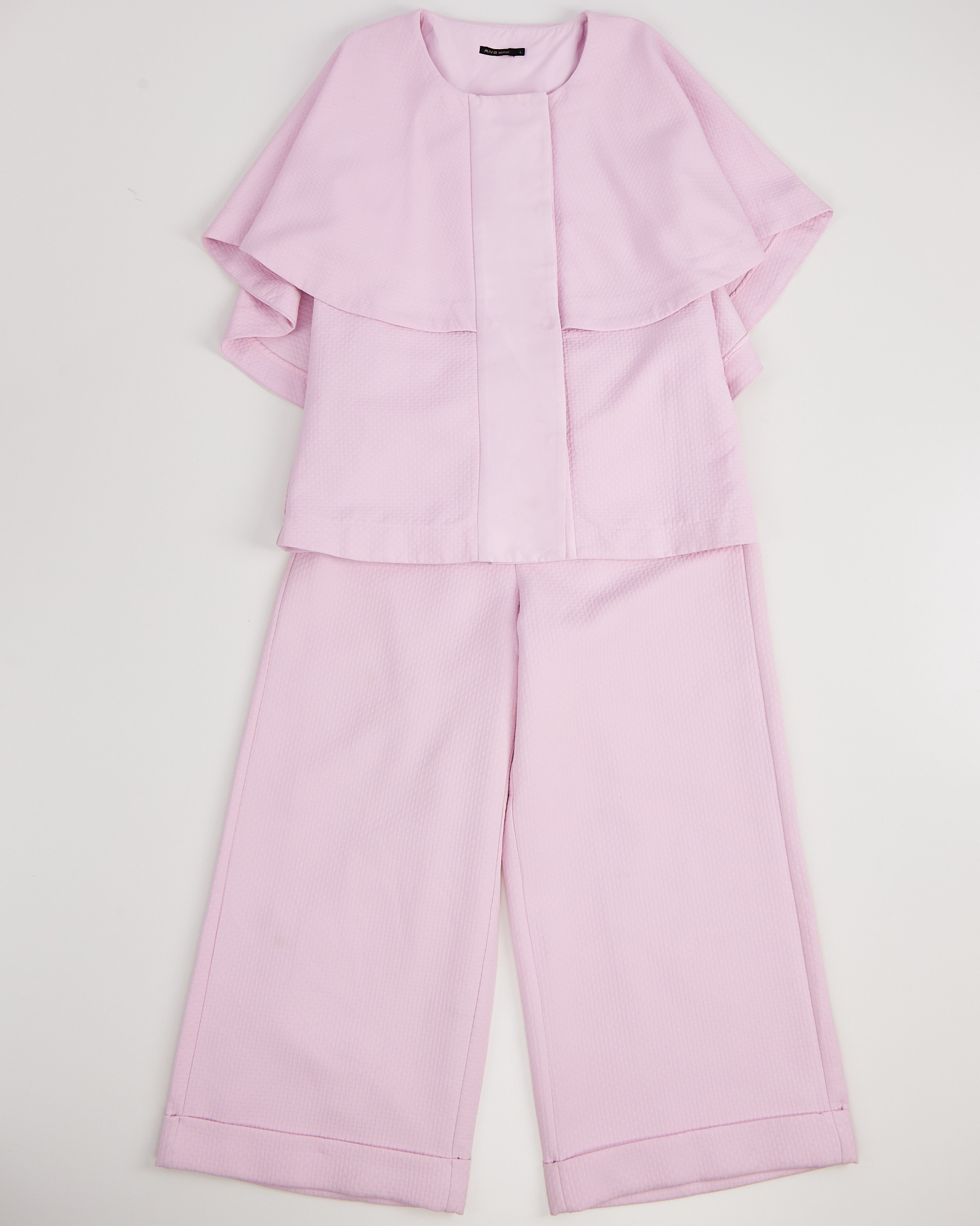 Костюм нежного розового цвета с фактурным узором. Брюки - кюлоты, свободного кроя с прямыми штанинами. Жакет с накидкой в стиле кейп.