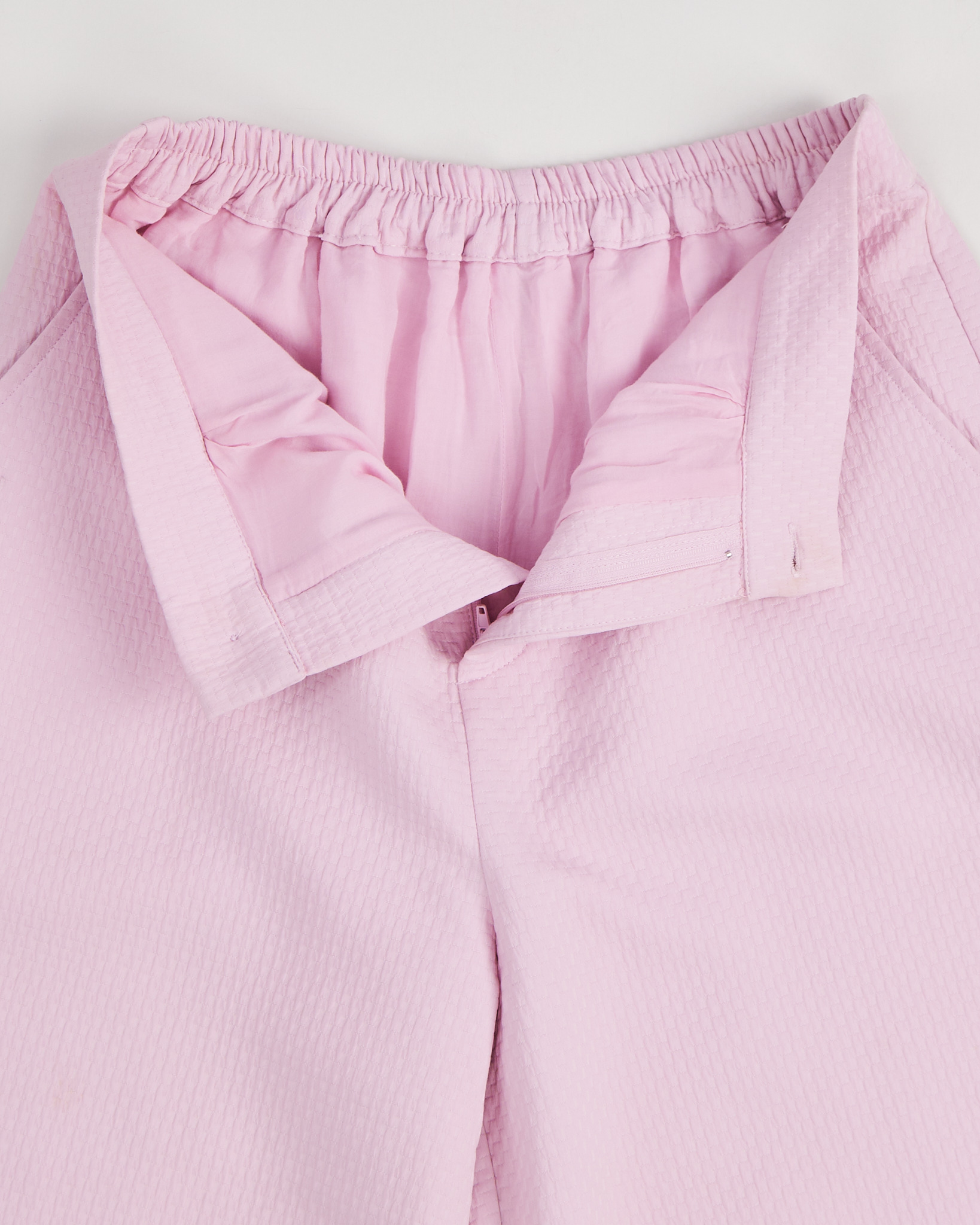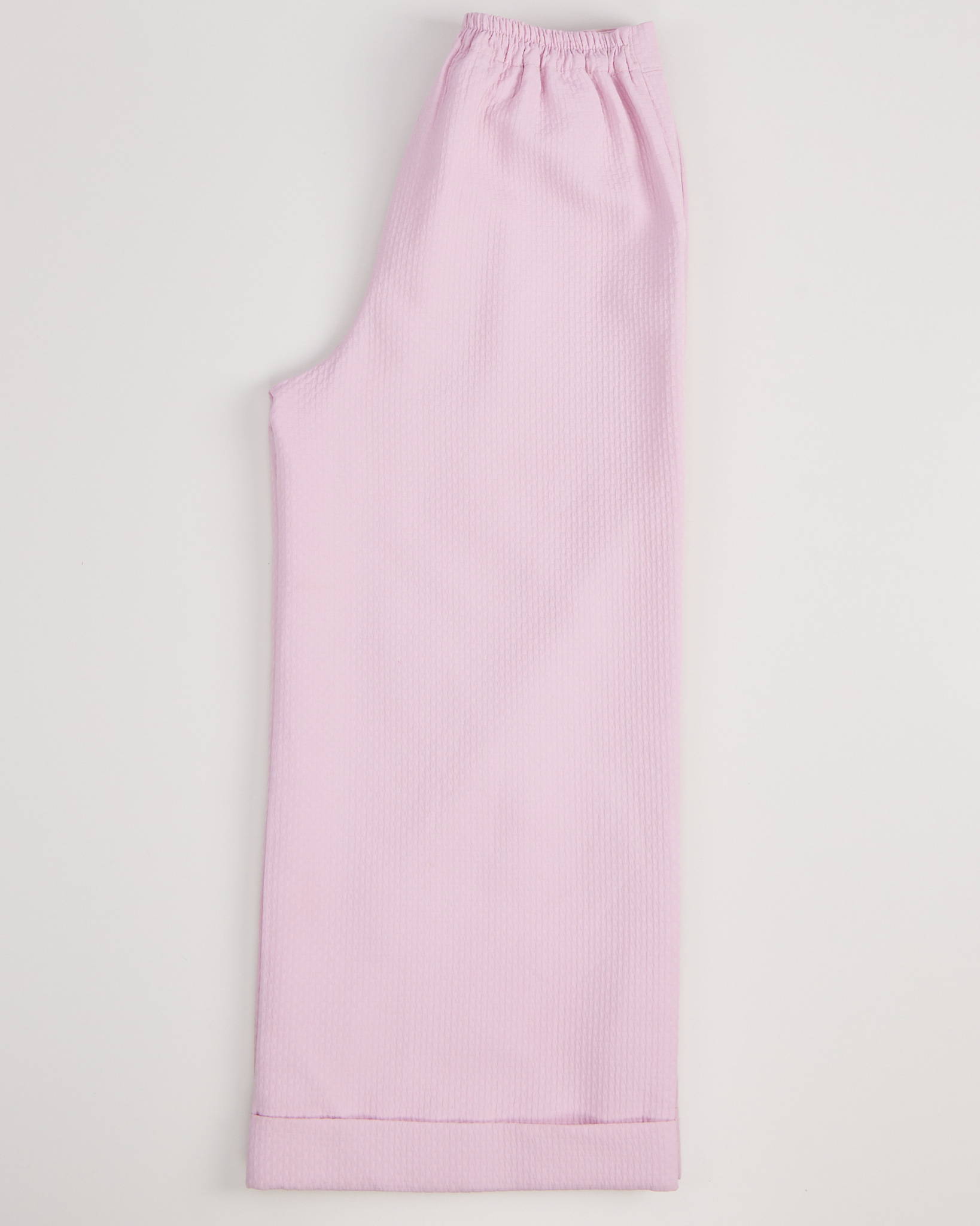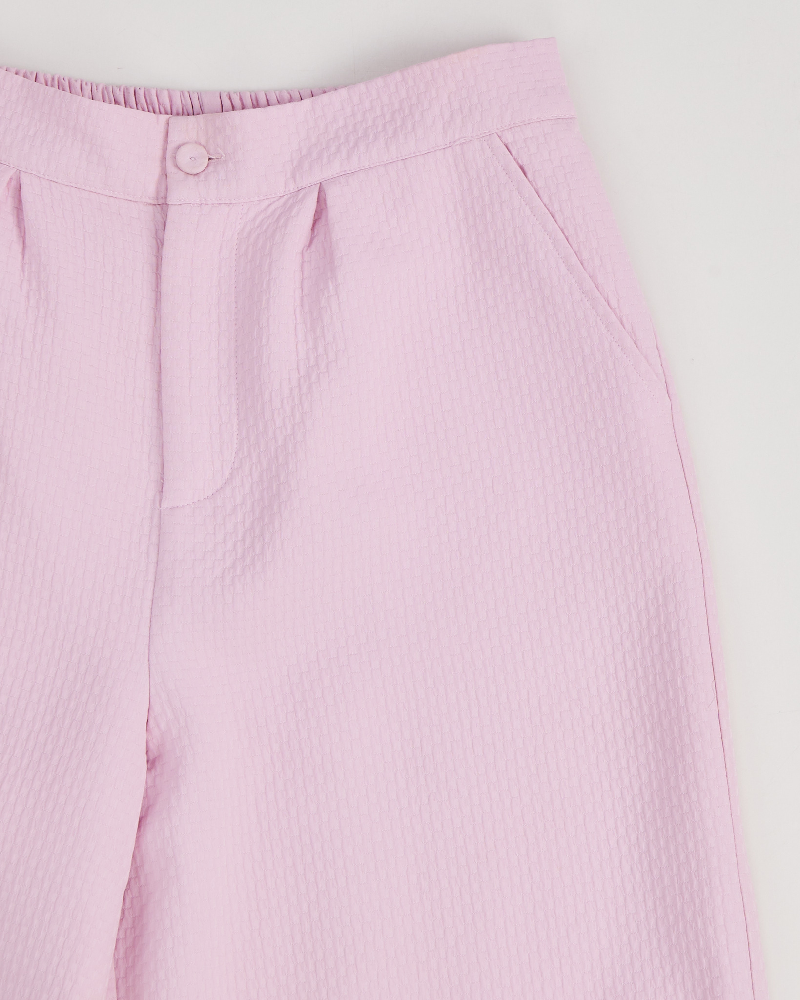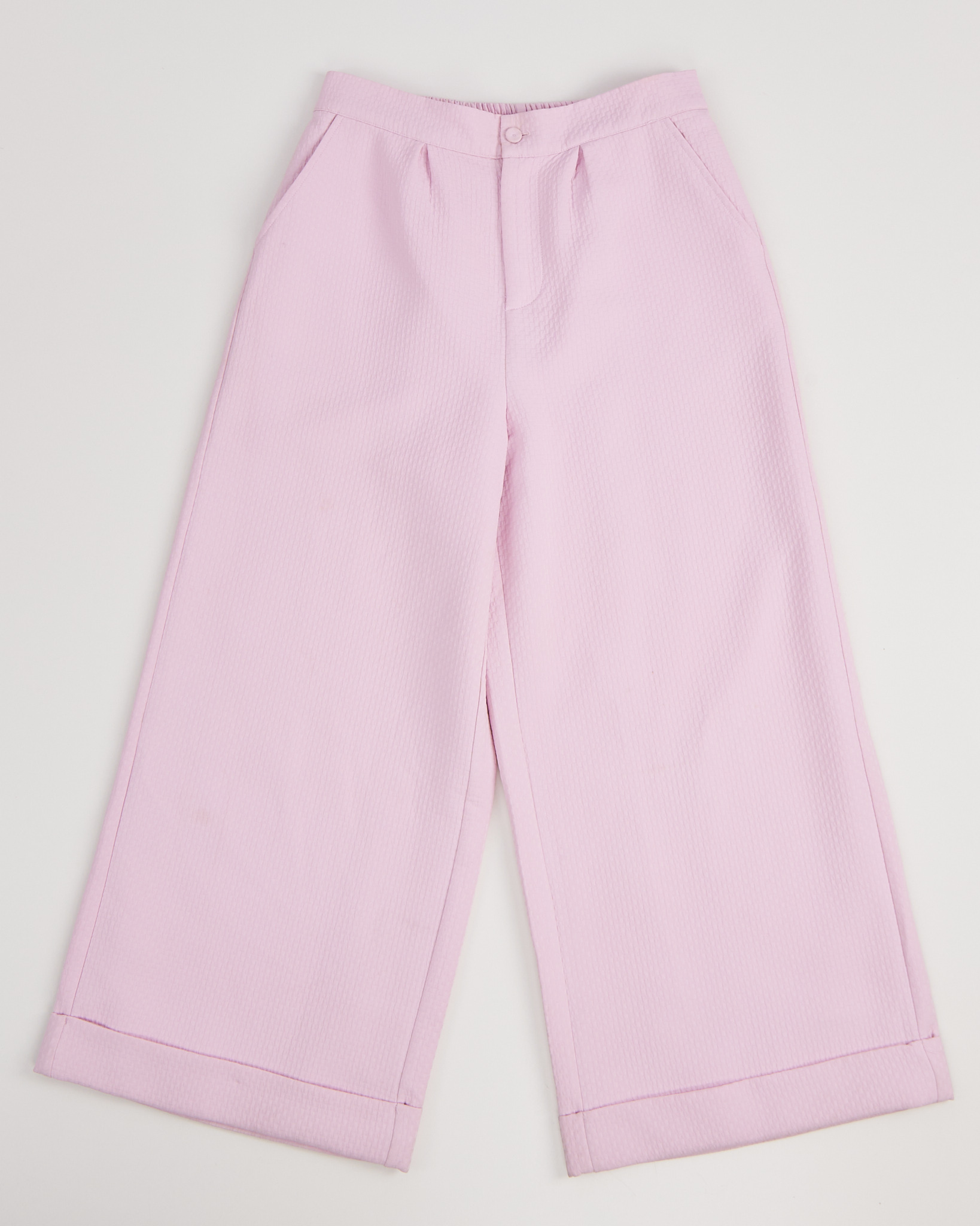 Костюм нежного розового цвета с фактурным узором. Брюки - кюлоты, свободного кроя с прямыми штанинами. Жакет с накидкой в стиле кейп.