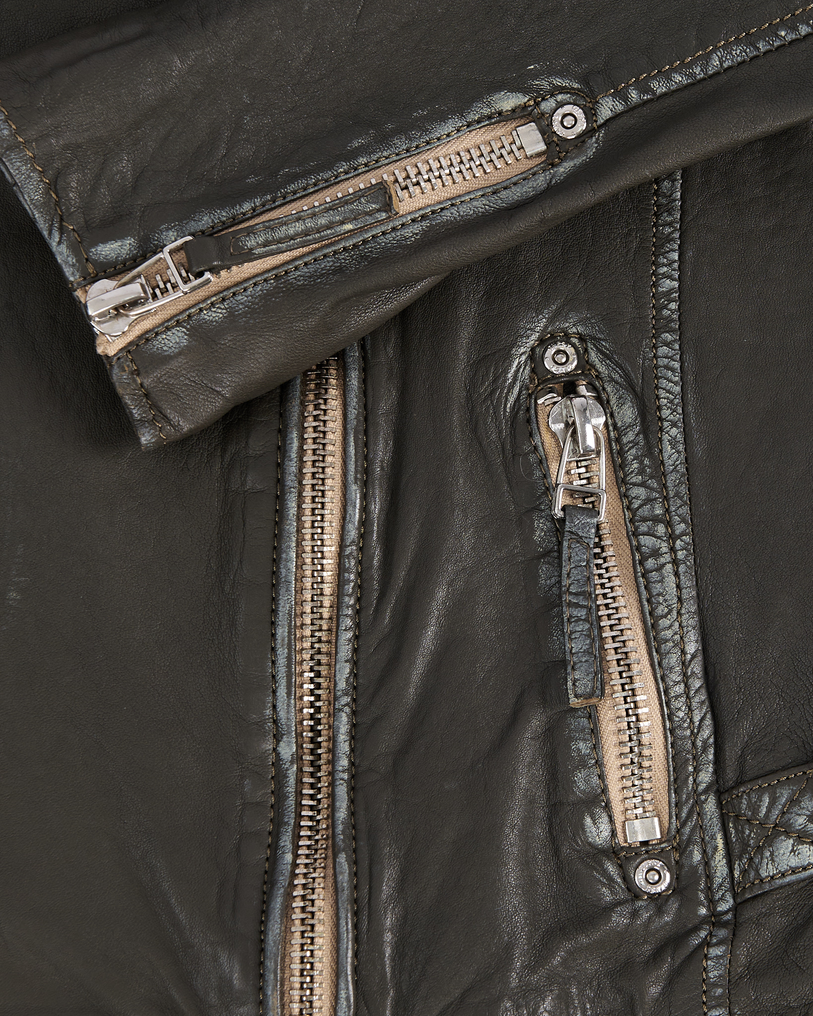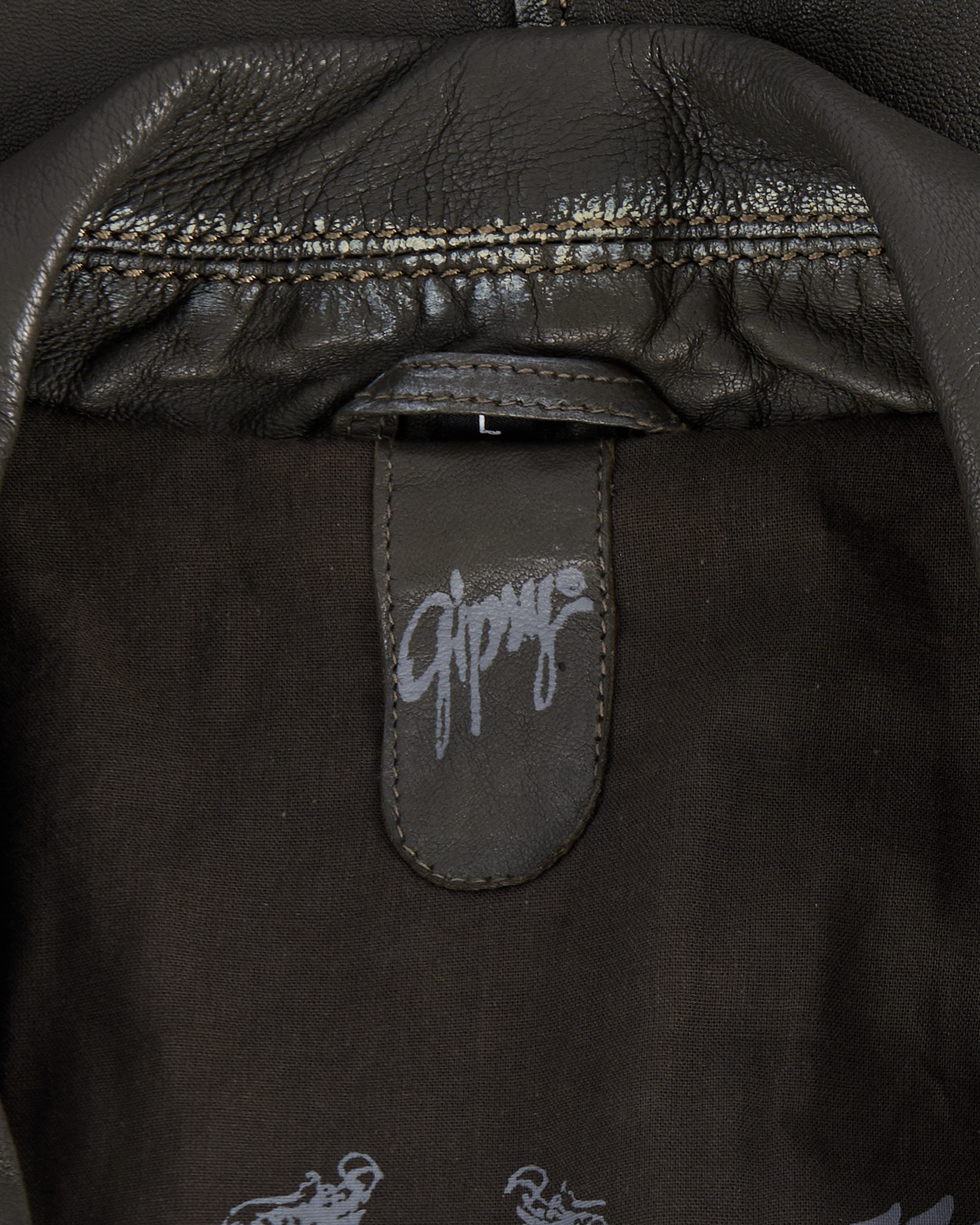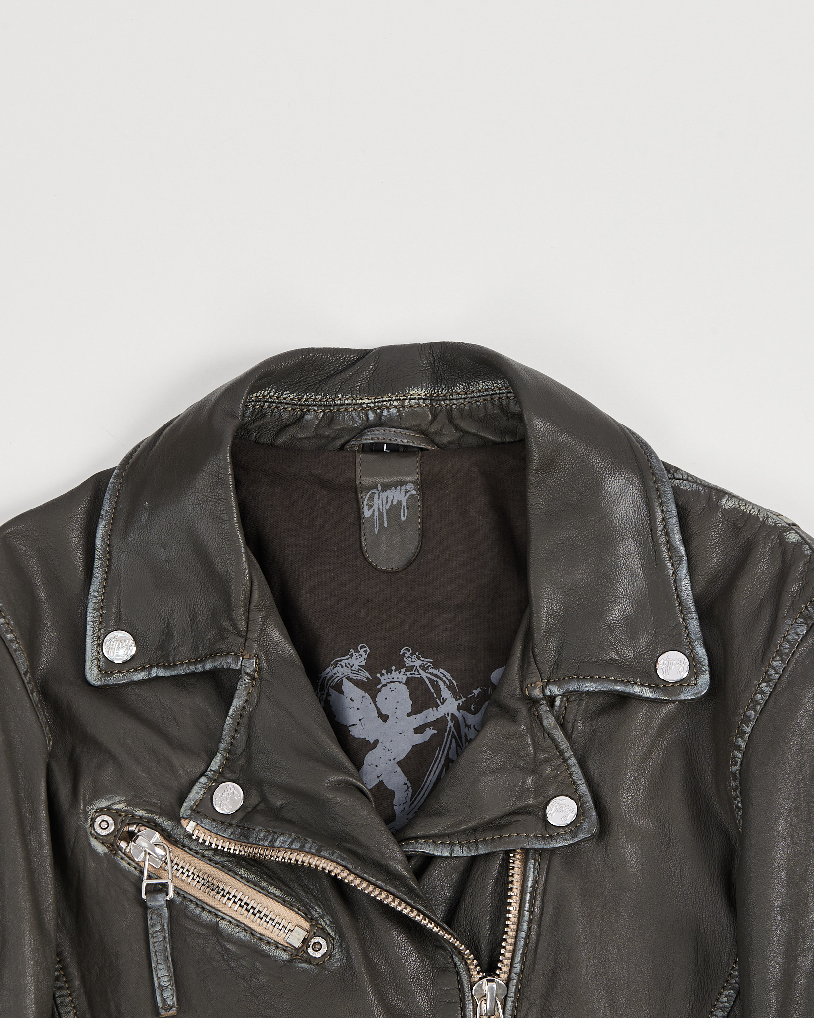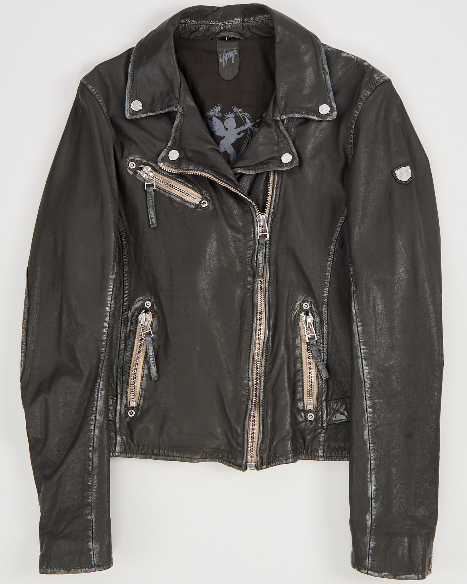 Винатжная косуха Gipsy из натуральной кожи. Винтажный дистресс вдоль швов и грубые металлические молнии.  Приталенная посадка, темная  подкладка с графичным принтом, функциональные карманы, акцентные ремешки по бокам.
