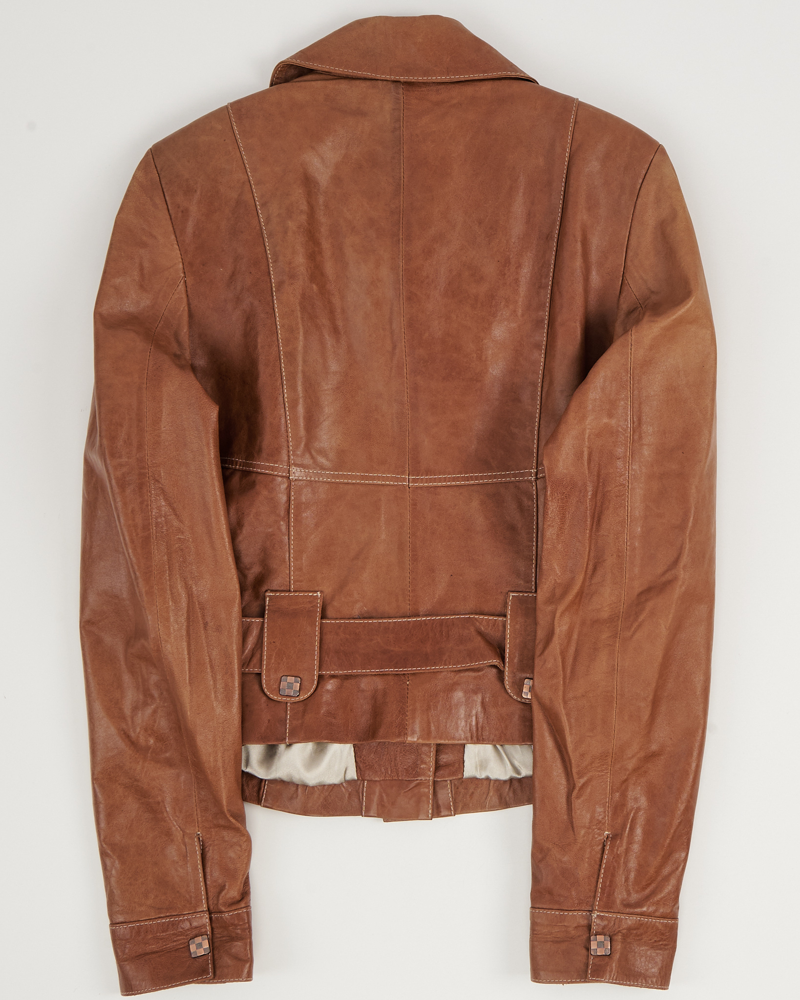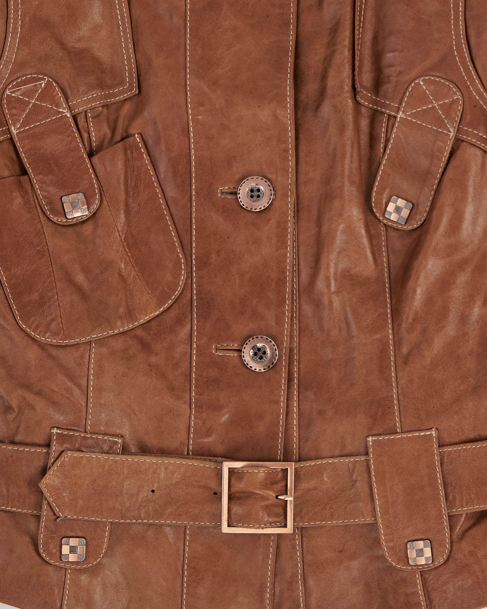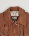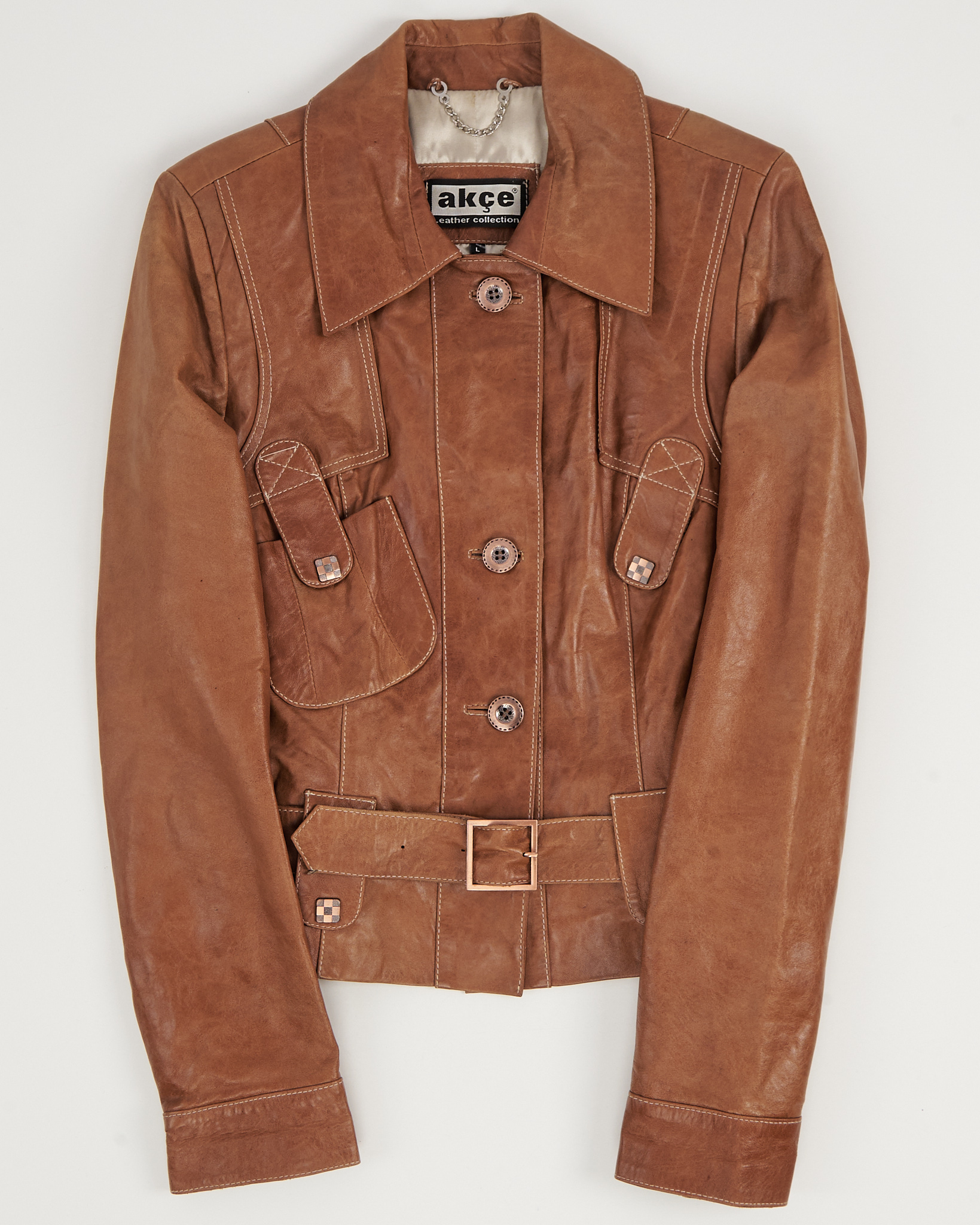 Куртка Akçe из 100% натуральной кожи тёплого карамельного оттенка. Посадка аккуратная, линия талии подчёркнута поясом с квадратной пряжкой. Контрастная строчка и объёмные карманы, акцентная фурнитура.