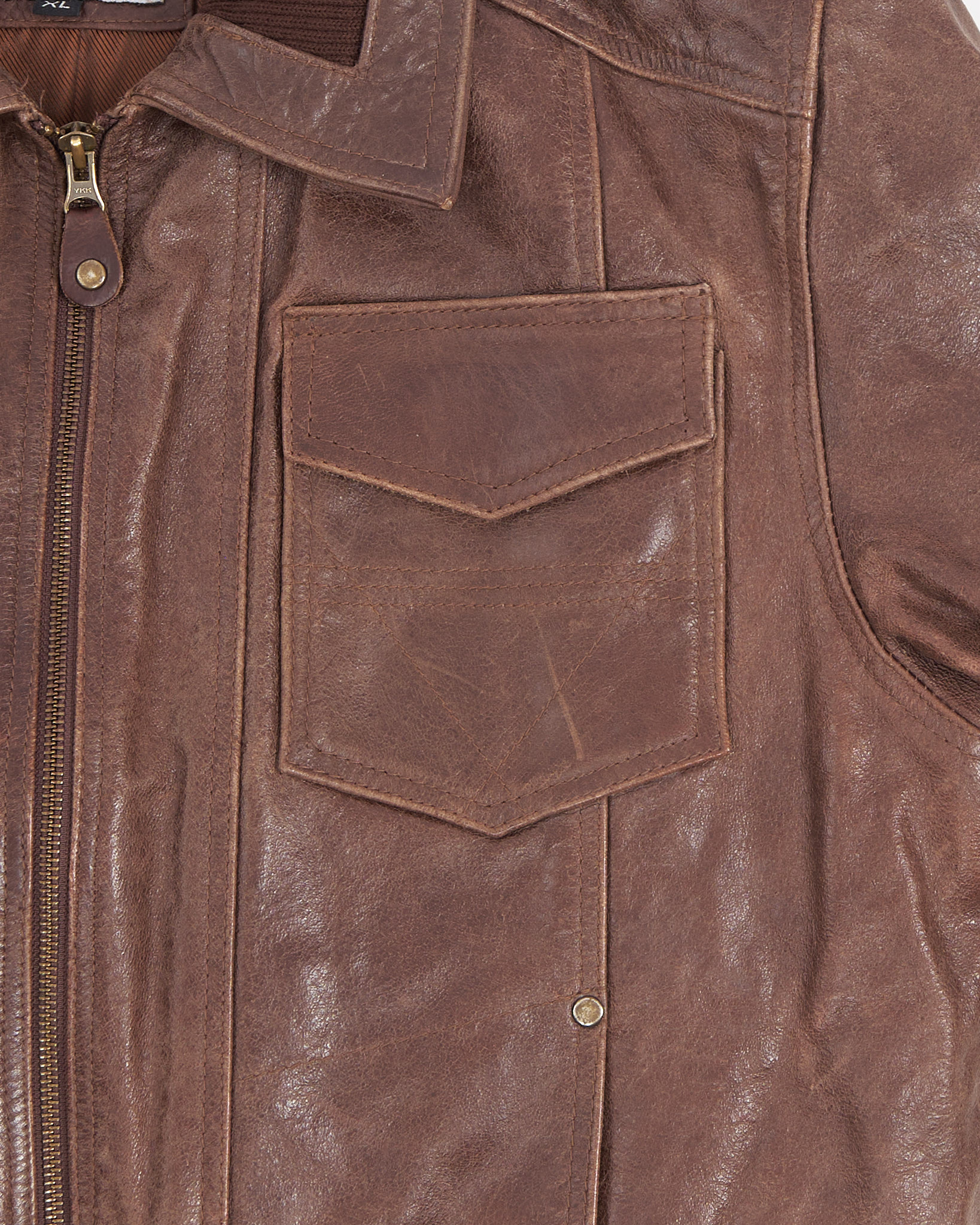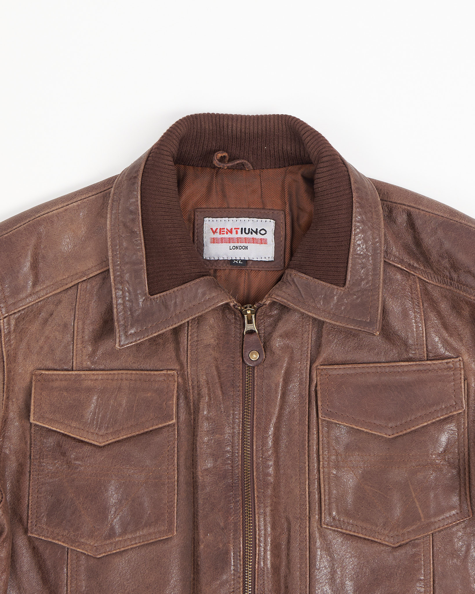 Винтажная куртка- бомбер из кожи Ventiuno London. Широкие трикотажные резинки на поясе и манжетах, двойной воротник и крупные накладные карманы, удобная застёжка на молнию.