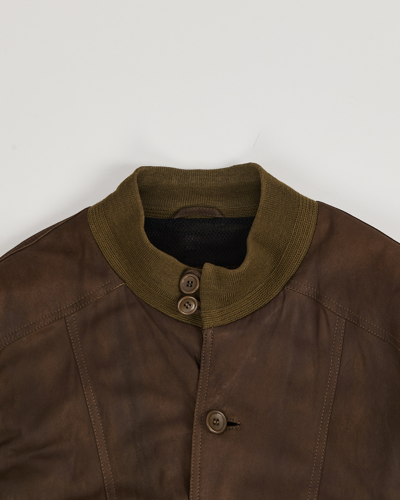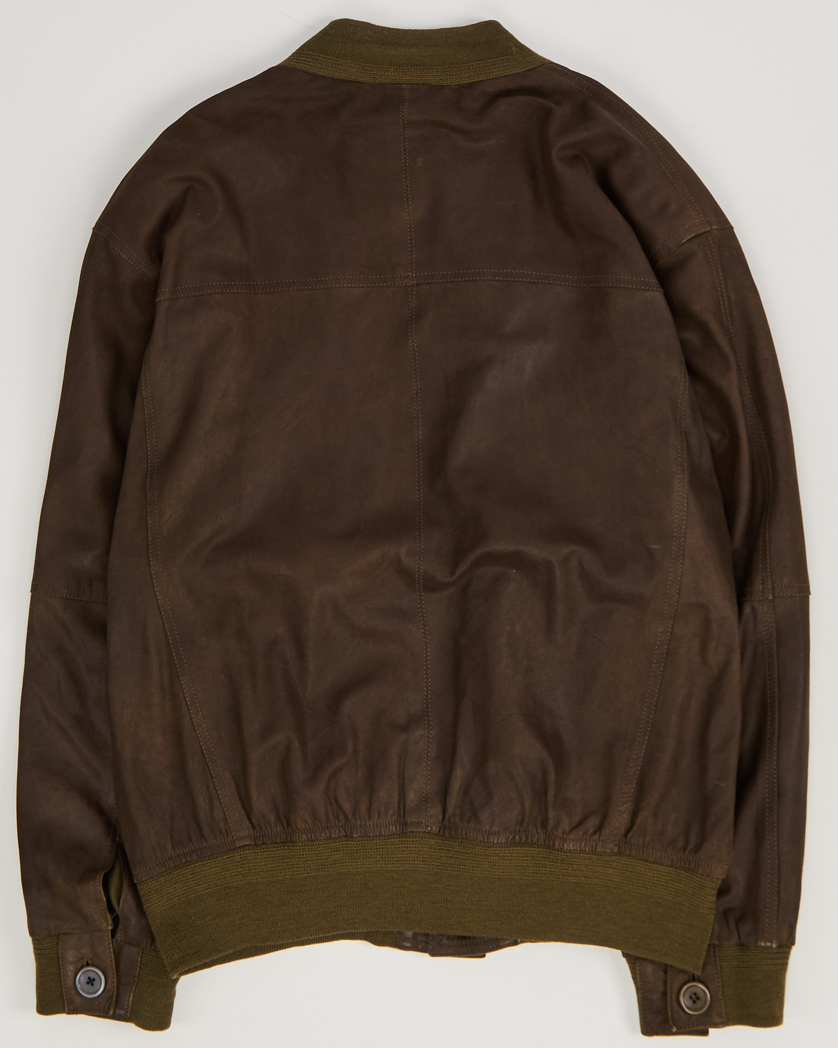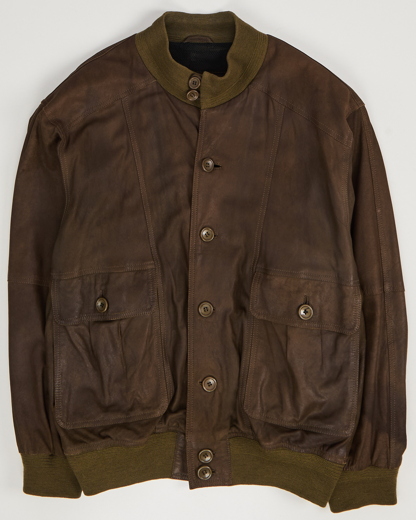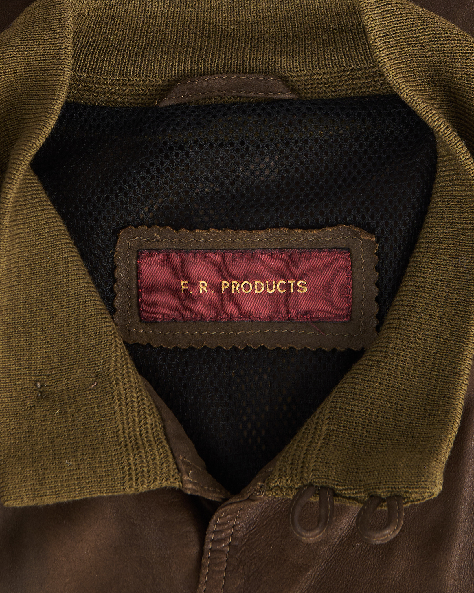 Кожаная куртка F.R. Products глубокого коричневого оттенка. Свободная посадка, плотная резинка на воротнике и по нижнему краю. Крупные накладные карманы, удобная застежка на пуговицы.