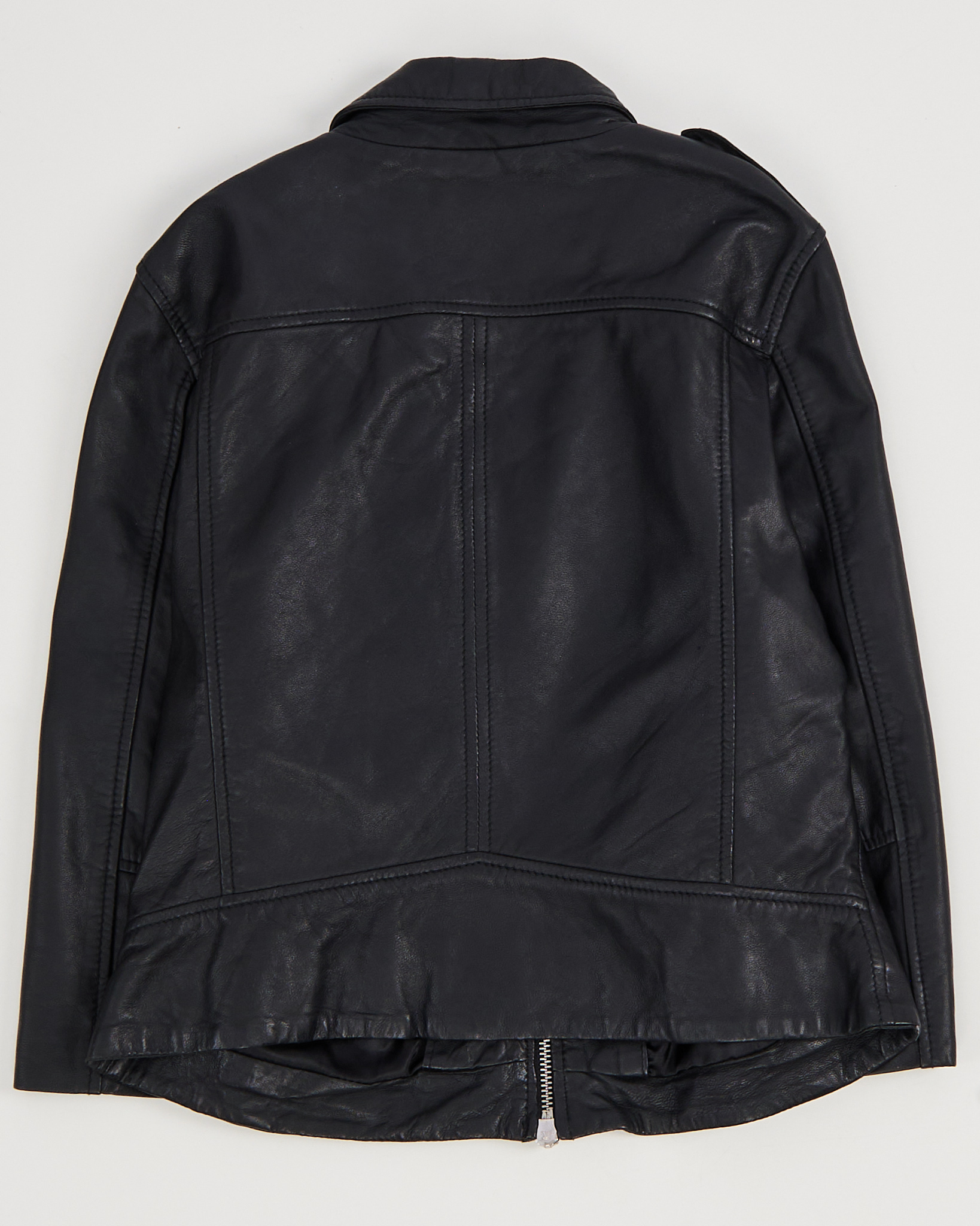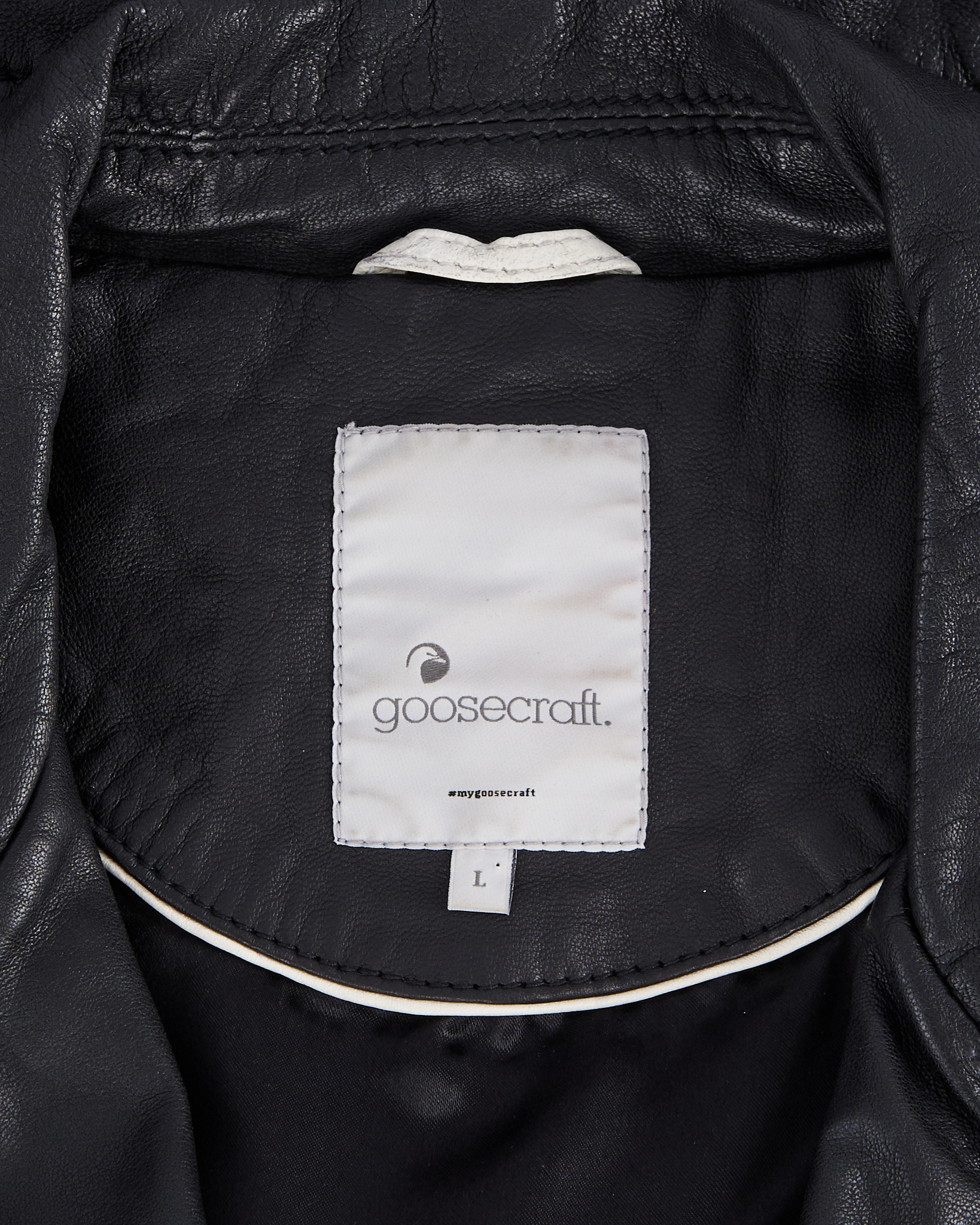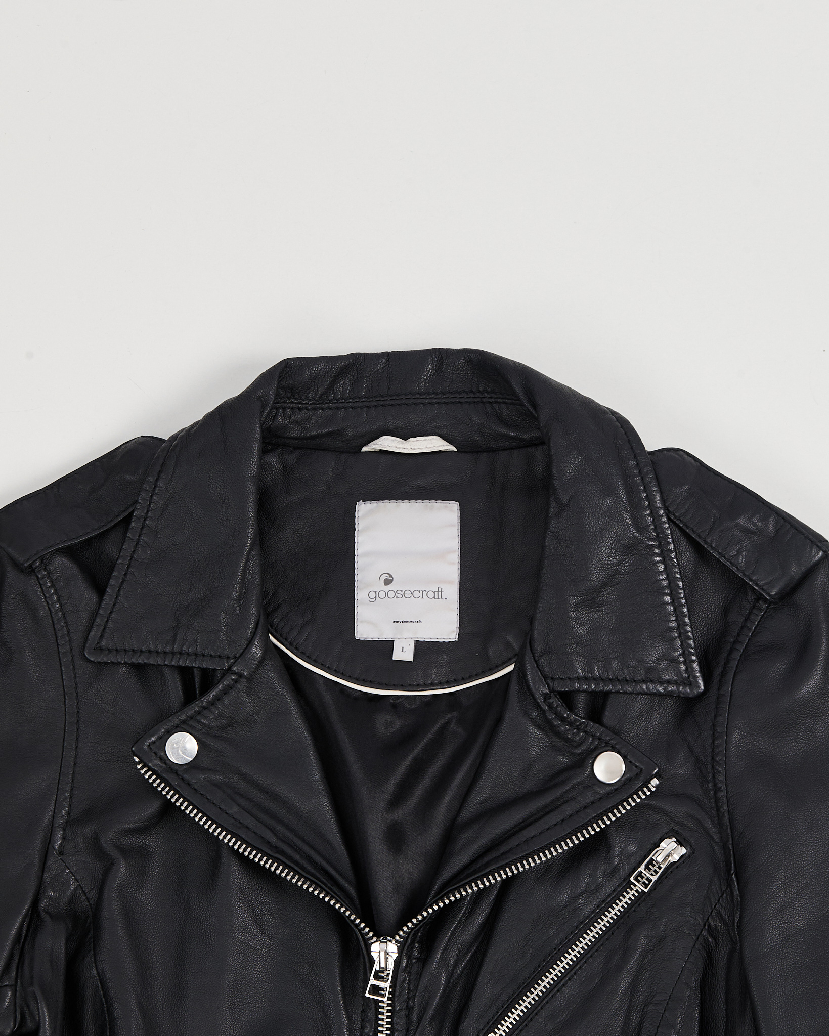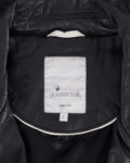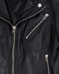Куртка goosecraft выполнена из натуральной кожи чeрного цвета. Материал мягкий и гладкий на ощупь. Посадка свободная, укороченная длина. Косая молния и металлическая фурнитура