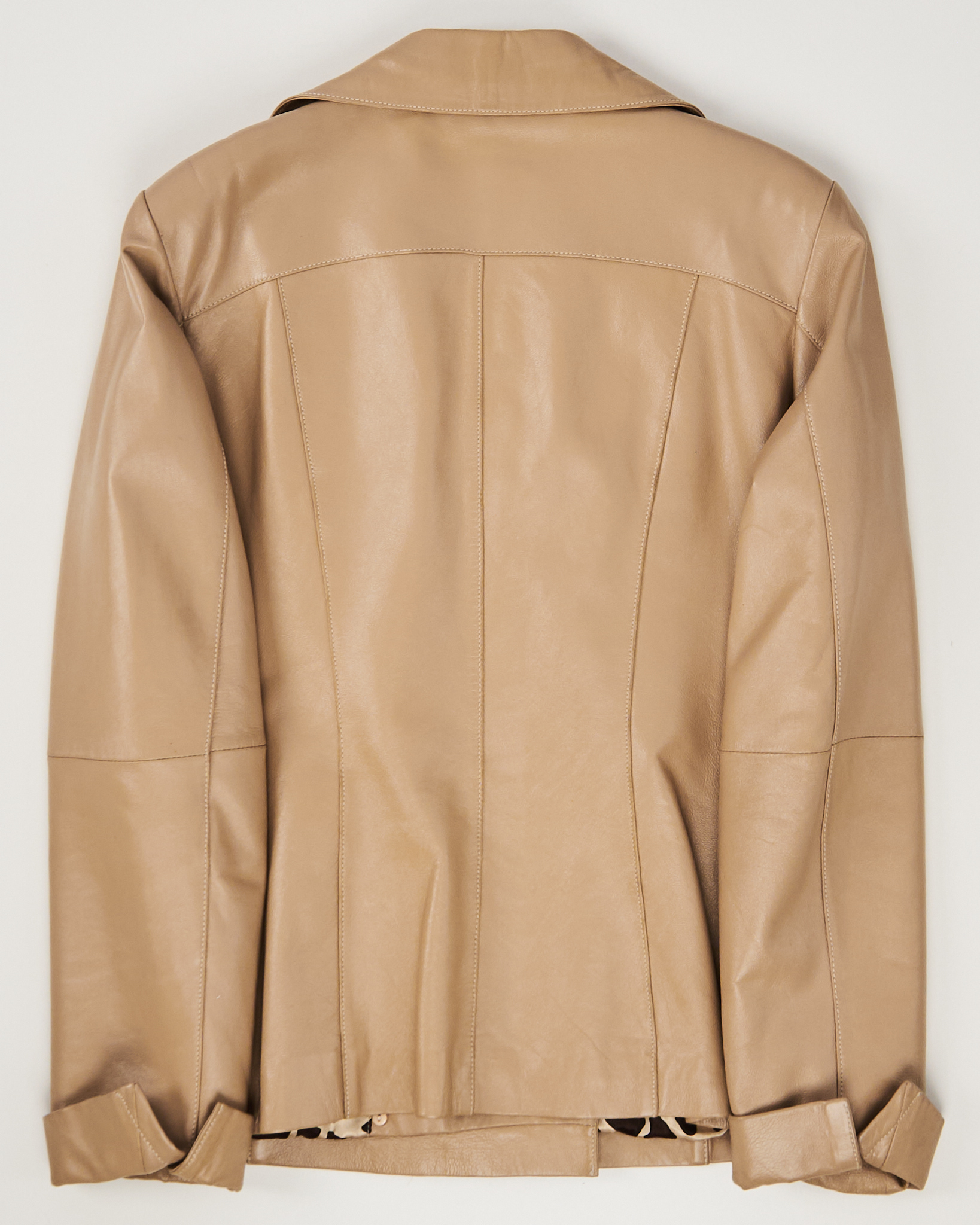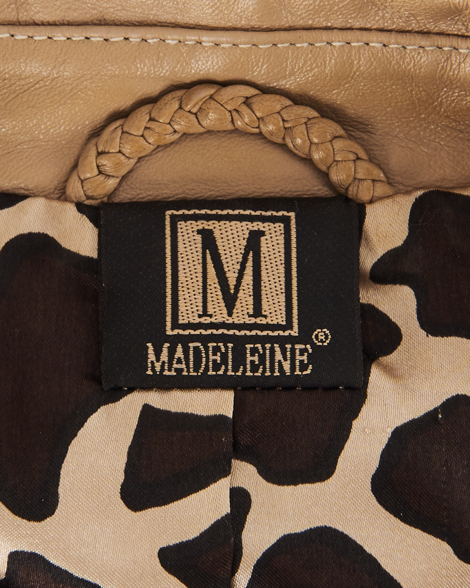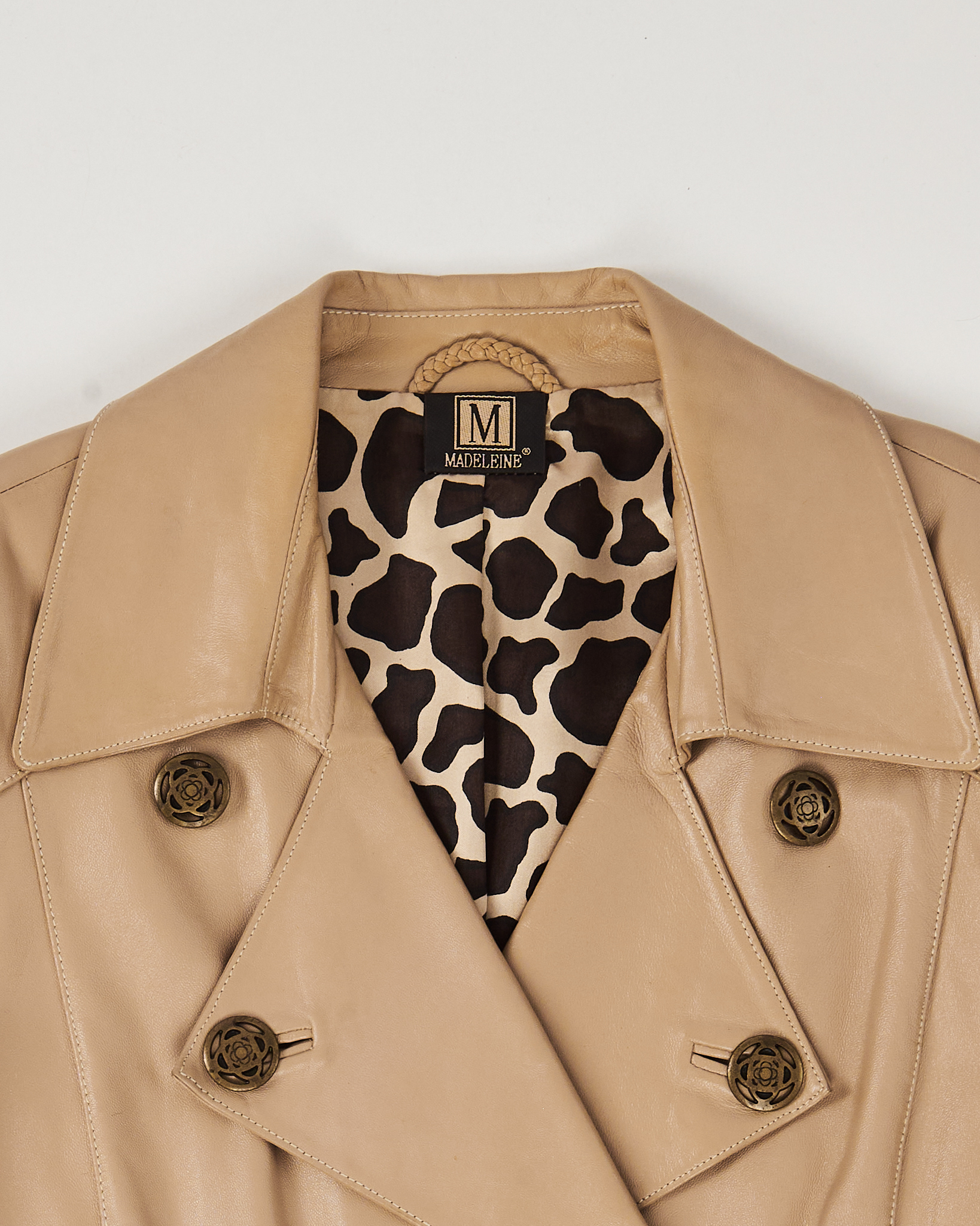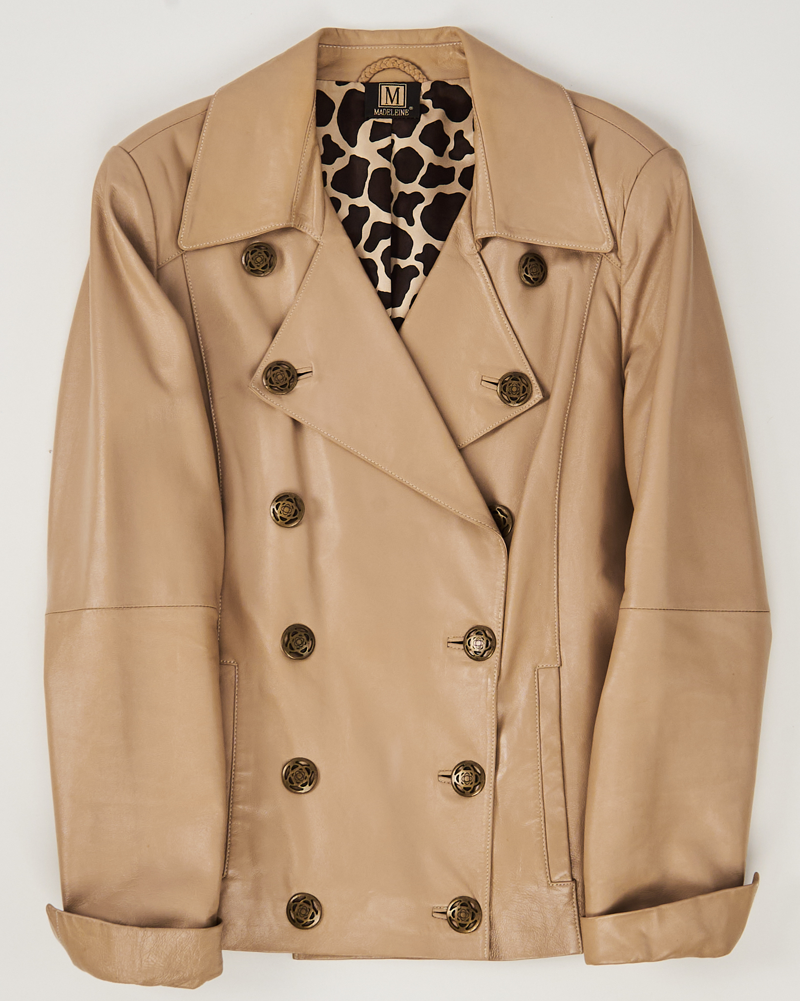 Куртка из натуральной кожи от Madeleine. Посадка прямая, двубортный воротник, функциональные карманы по бокам. Подкладка с контрастным принтом, акцентная фурнитура.