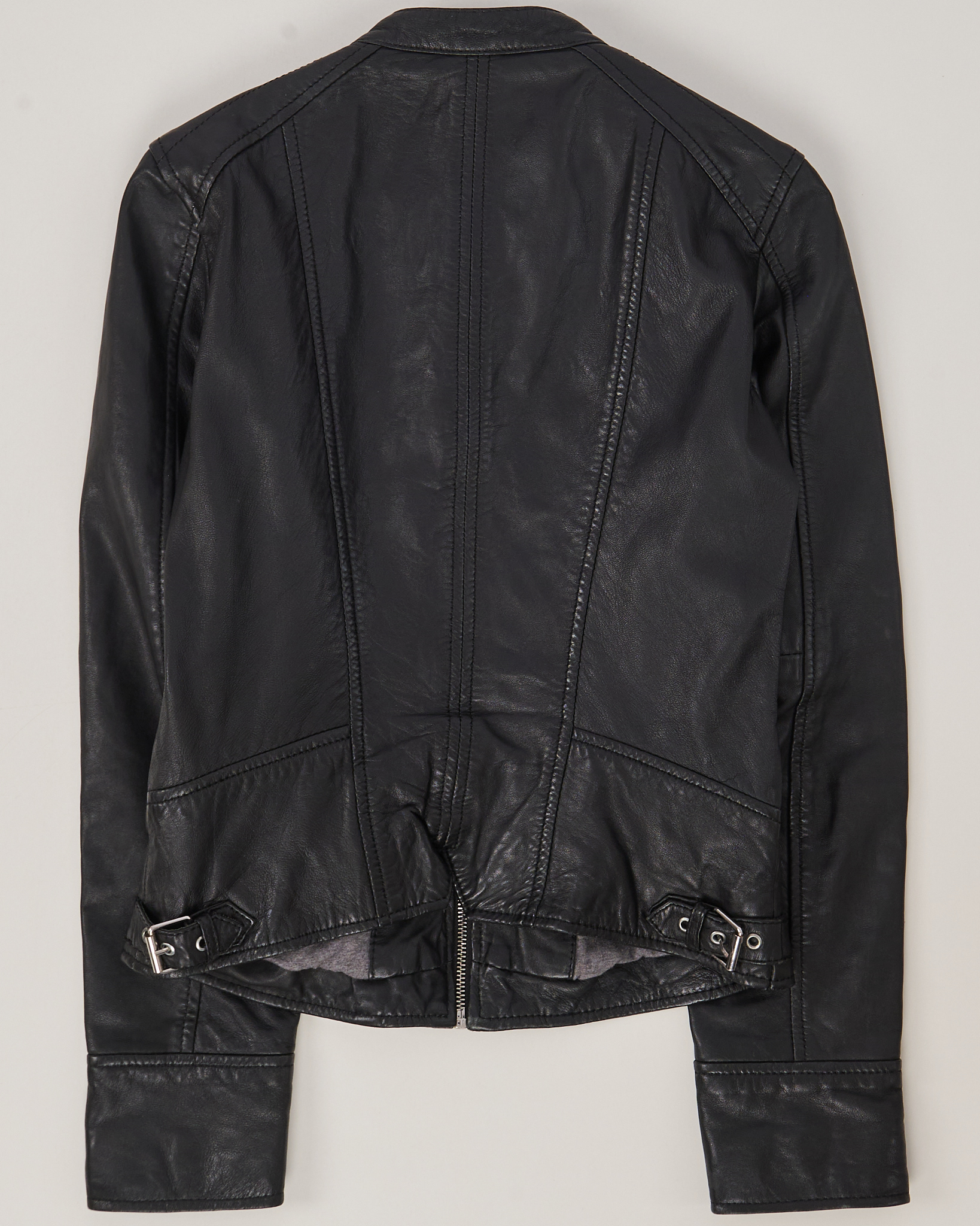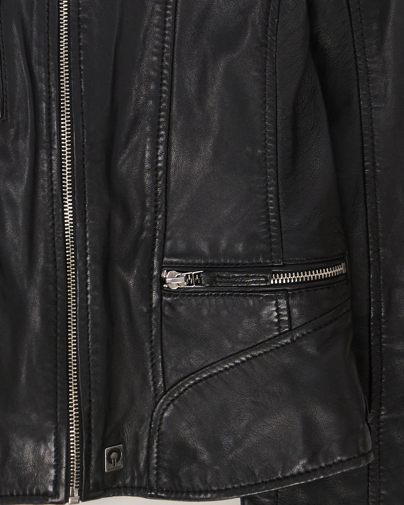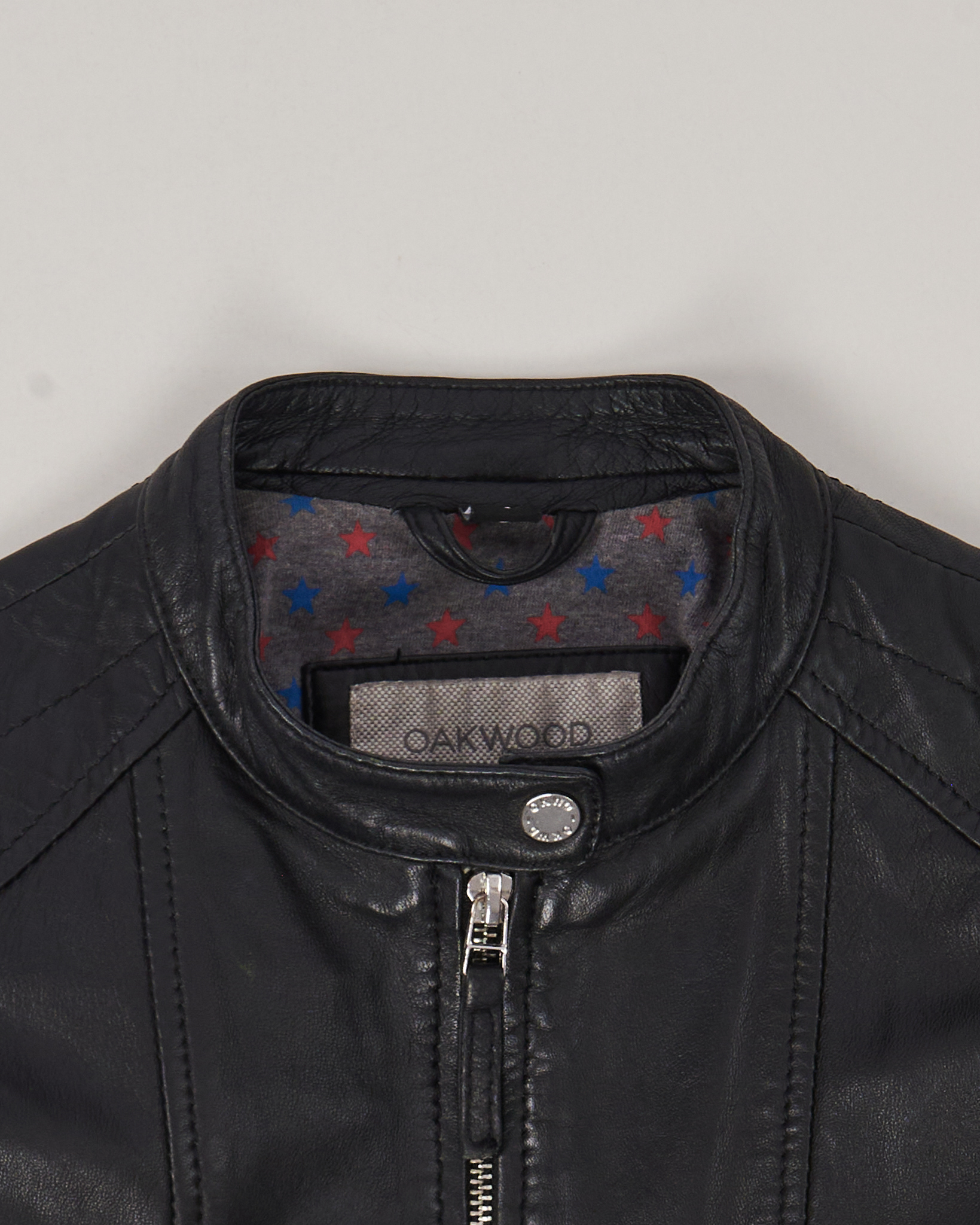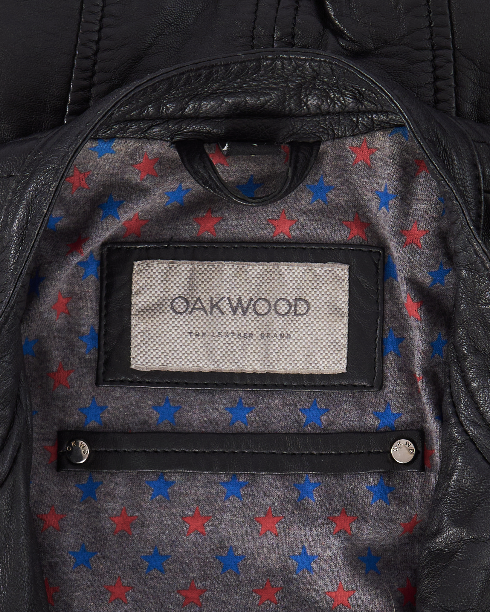 Куртка из натуральной кожи Oakwood. Воротник на застежке, приталенная посадка. Контрастная подкладка, акцентные ремешки внизу и разрез.