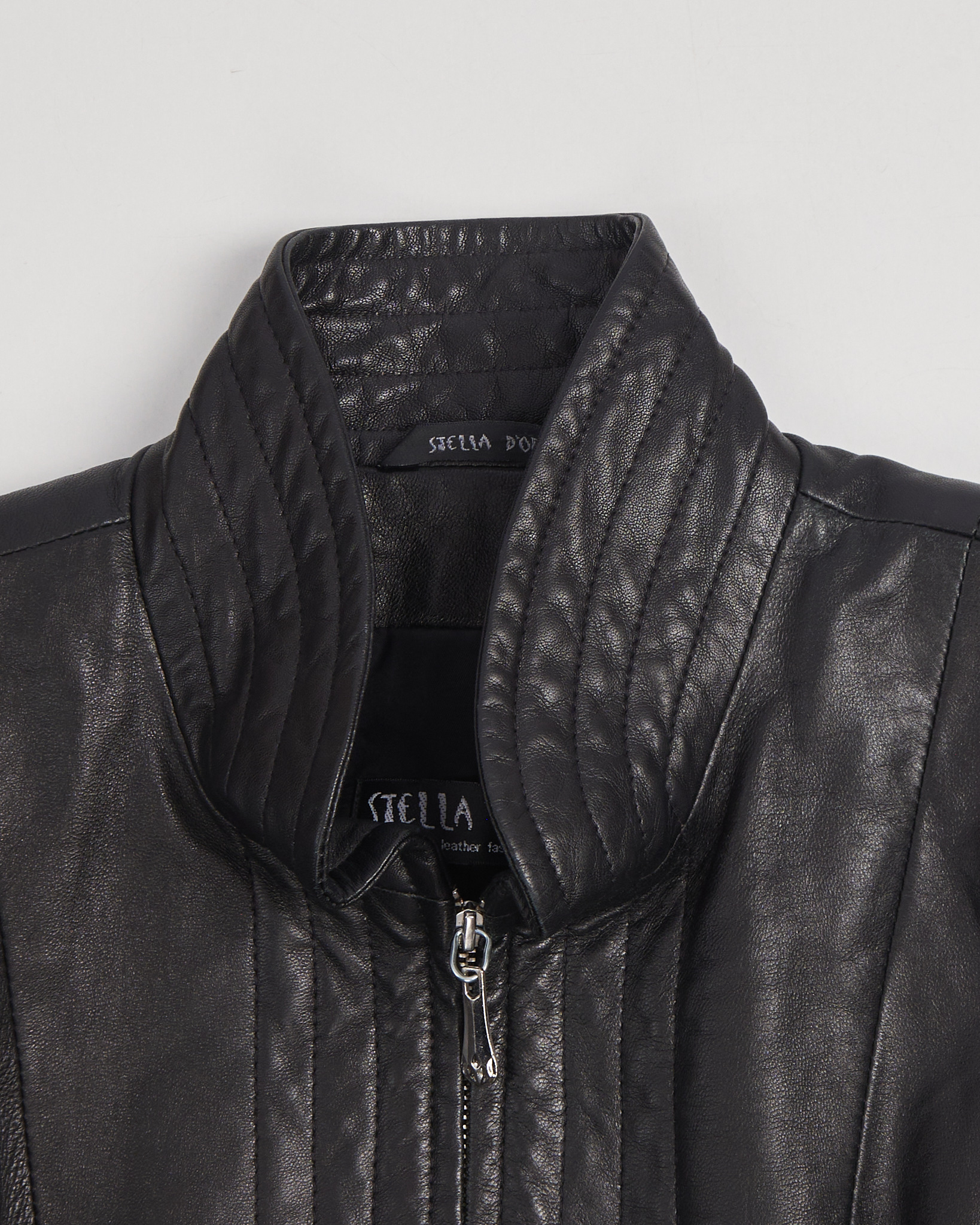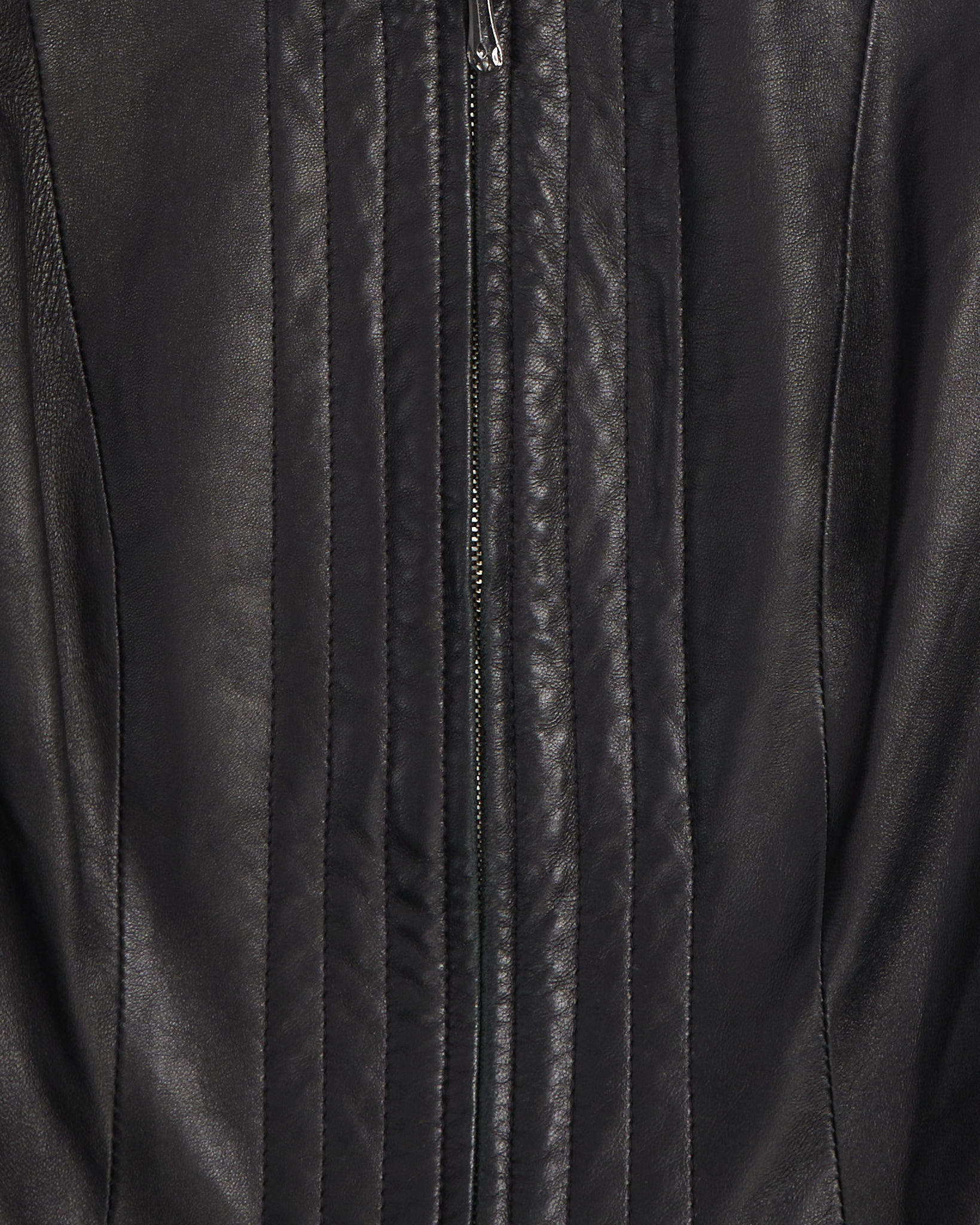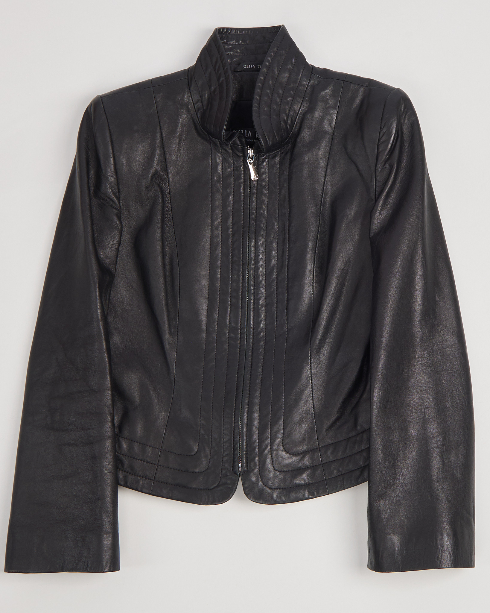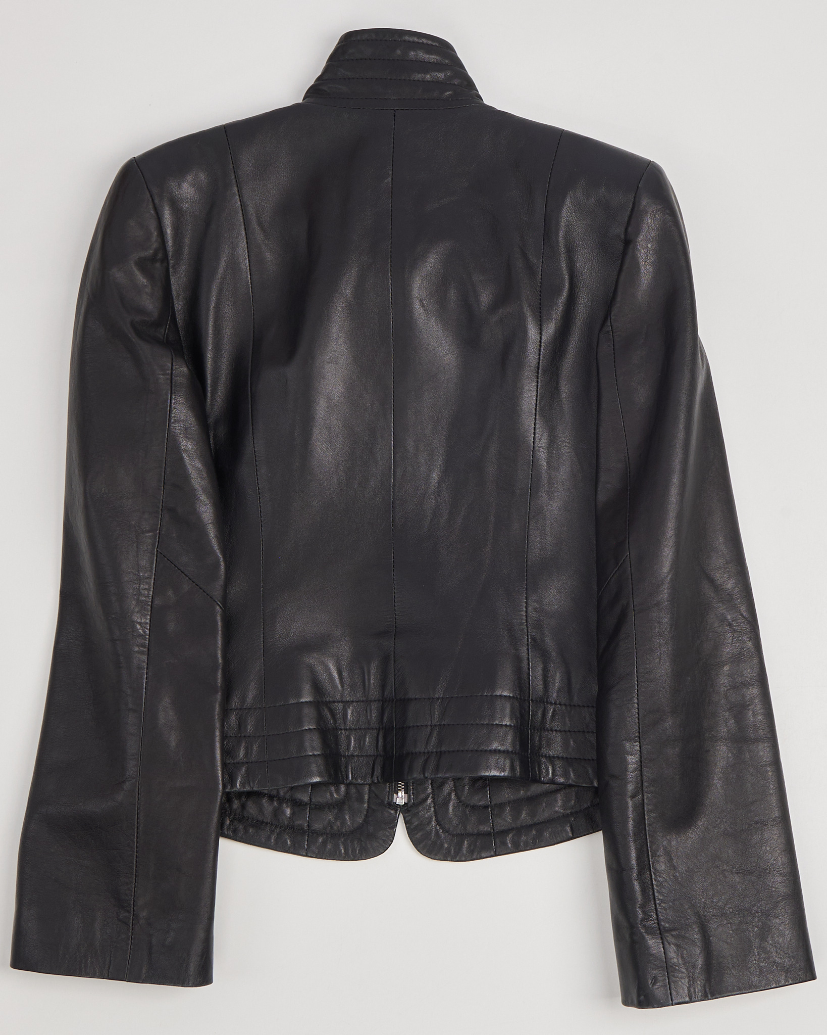 Куртка из натуральной кожи насыщенного чёрного цвета. Посадка по фигуре, линия плеч чёткая, силуэт укороченный и собранный. Вертикальные швы и высокий ворот придают акцент.