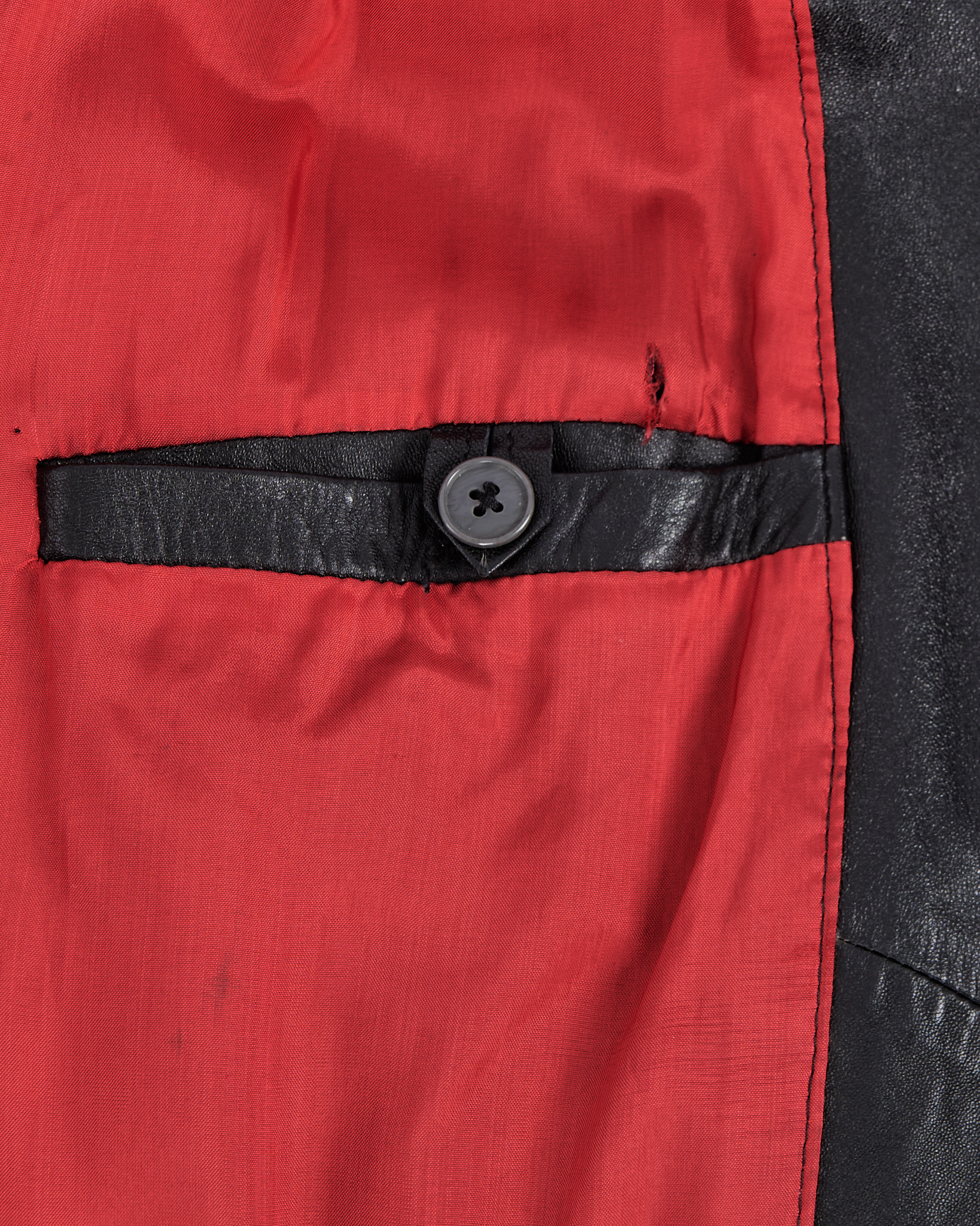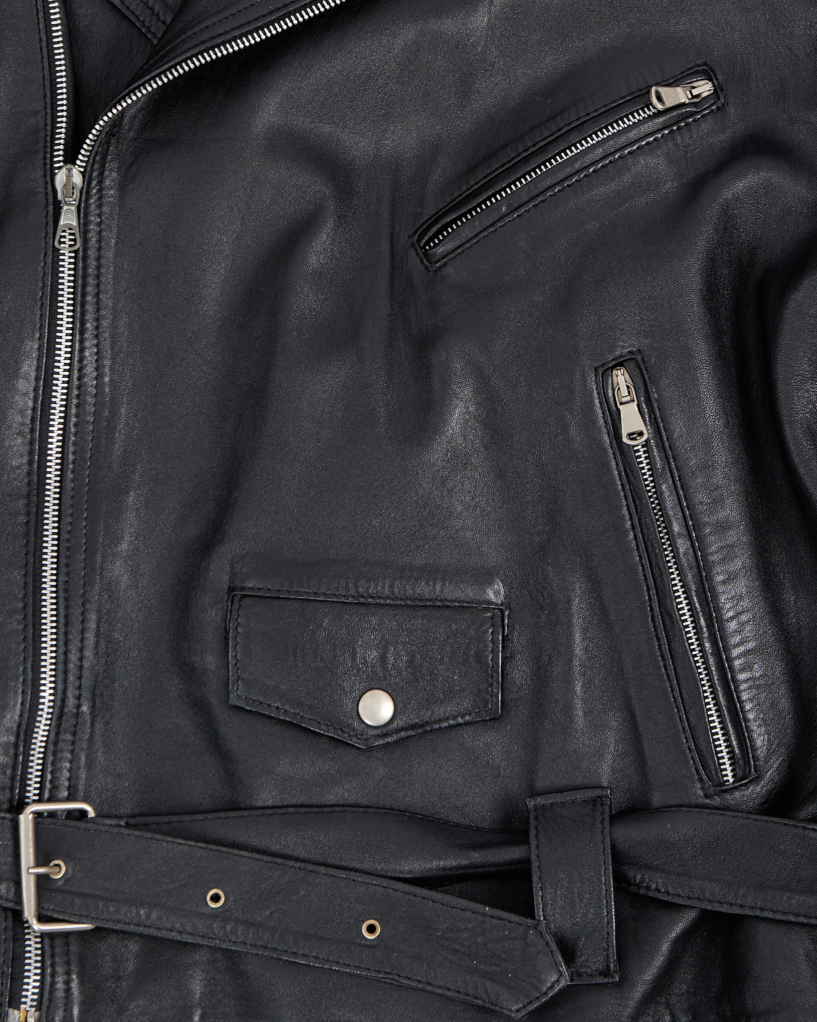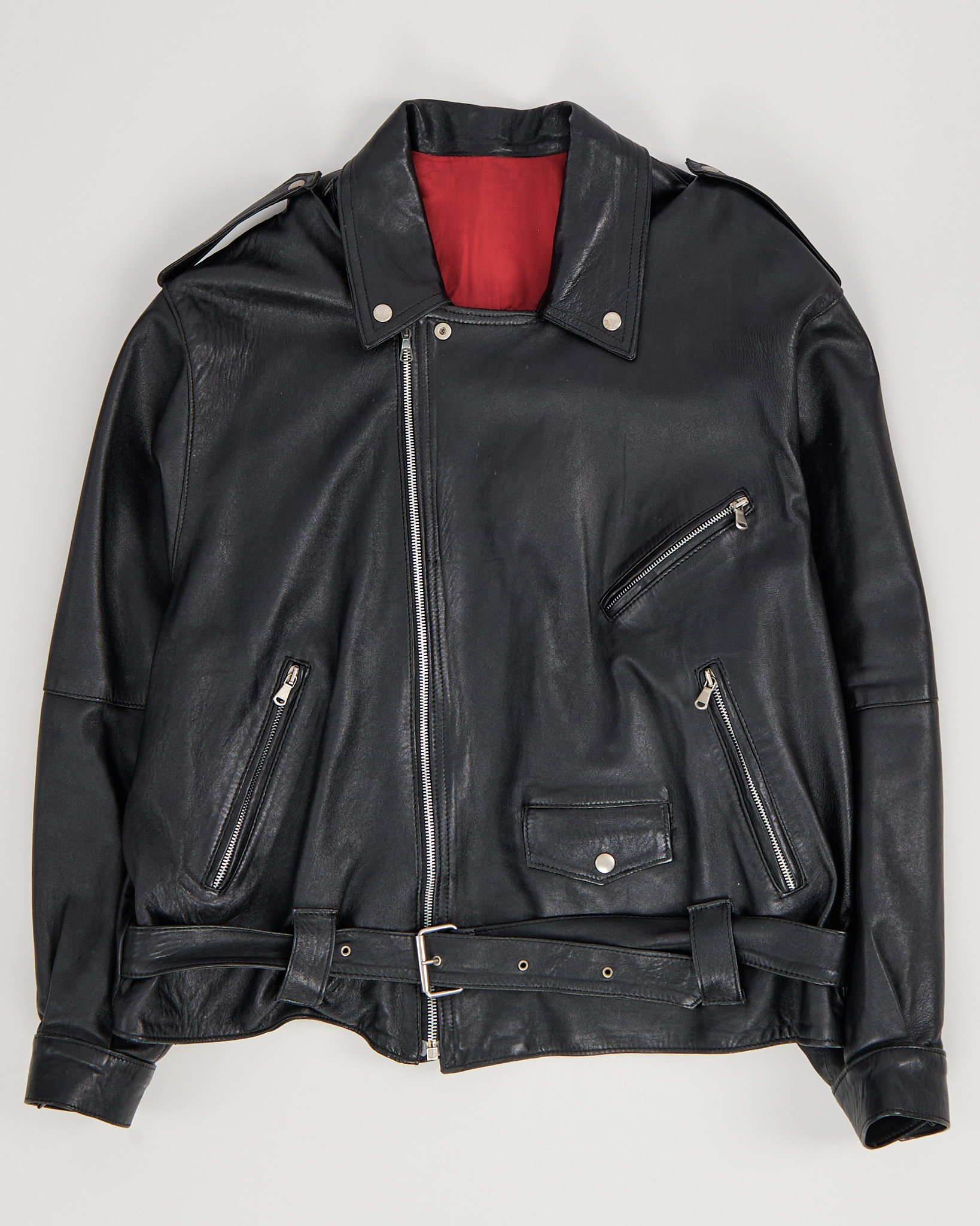 Куртка из натуральной кожи. Свободный крой с поясом позволяет регулировать посадку. Косая молния, металлическая фурнитура и накладные элементы. Контрастная красная подкладка