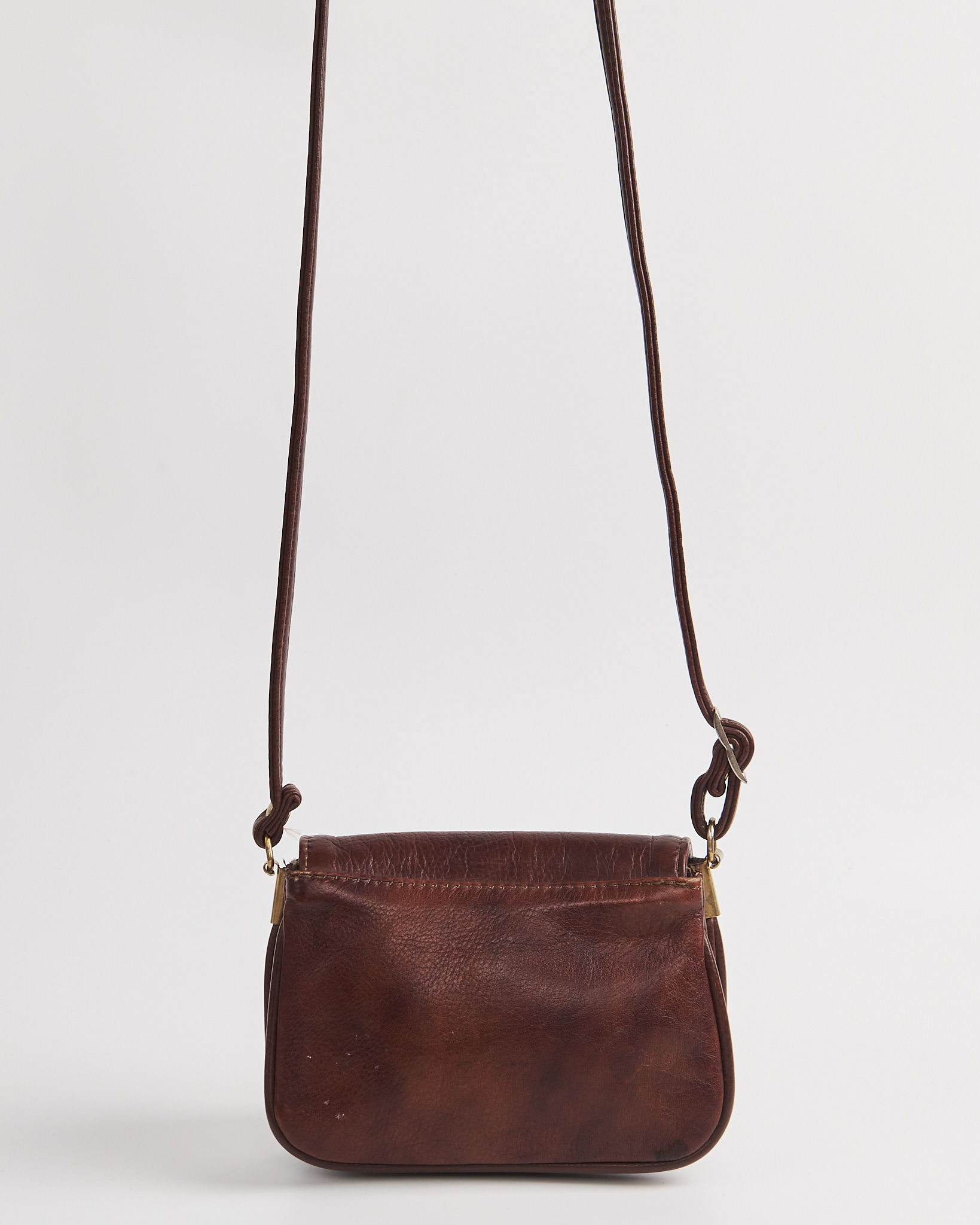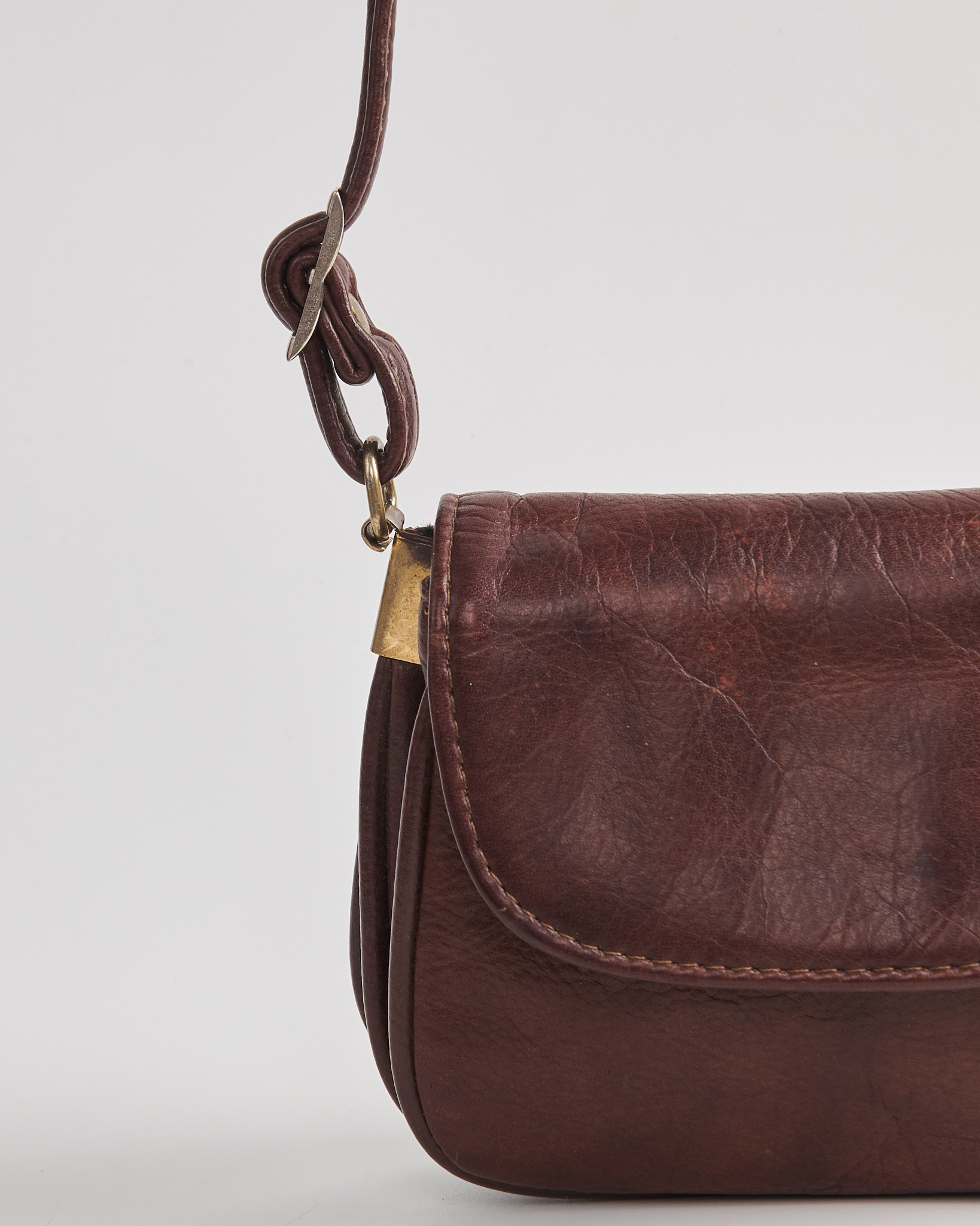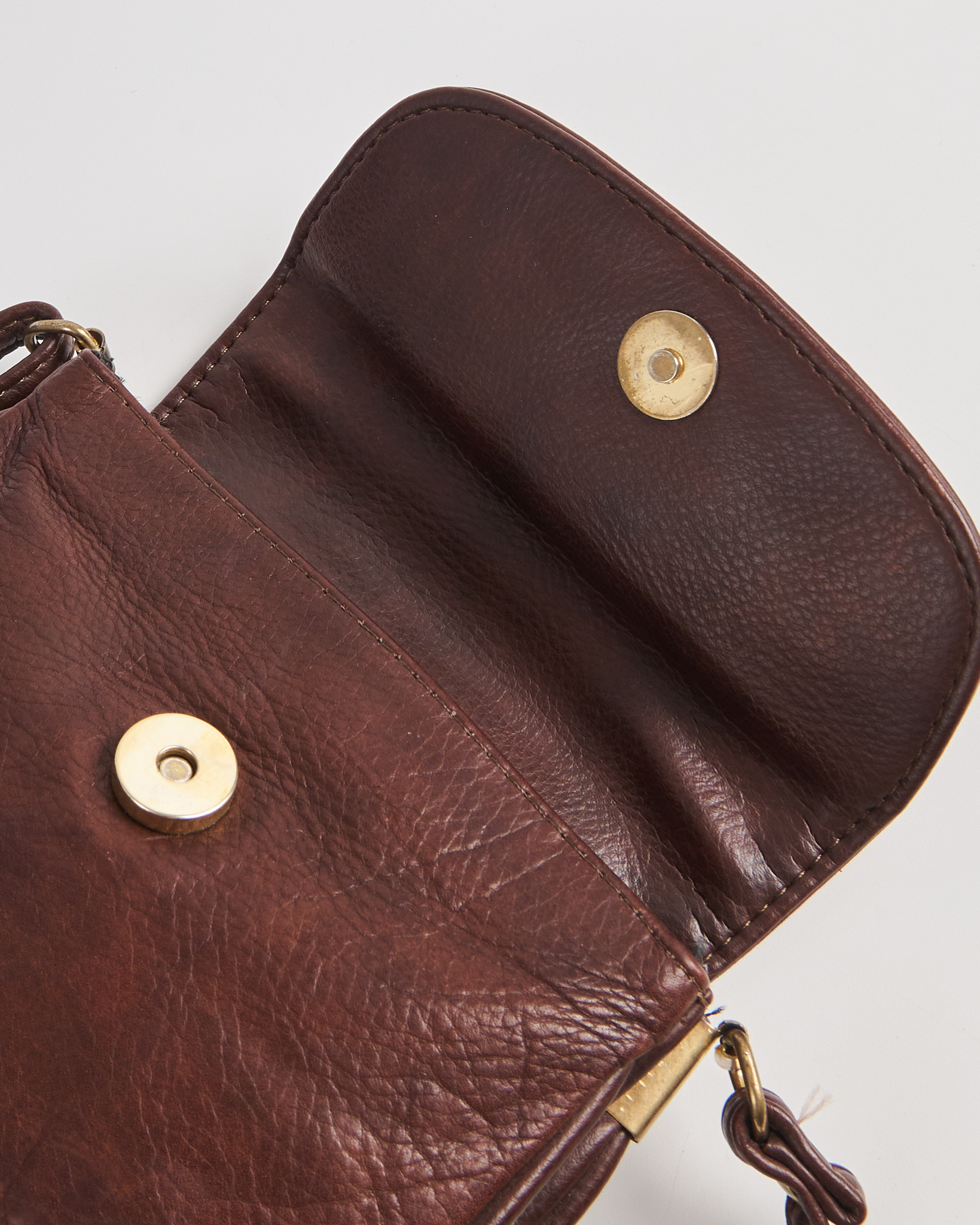 Сумка из натуральной кожи в глубоком коричневом оттенке. Удобная посадка, ремень регулируется по длине. Форма компактная, клапан на магнитной кнопке, края аккуратно обработаны. Фурнитура в тёплом металлическом оттенке, крепления ремня выполнены через узлы.