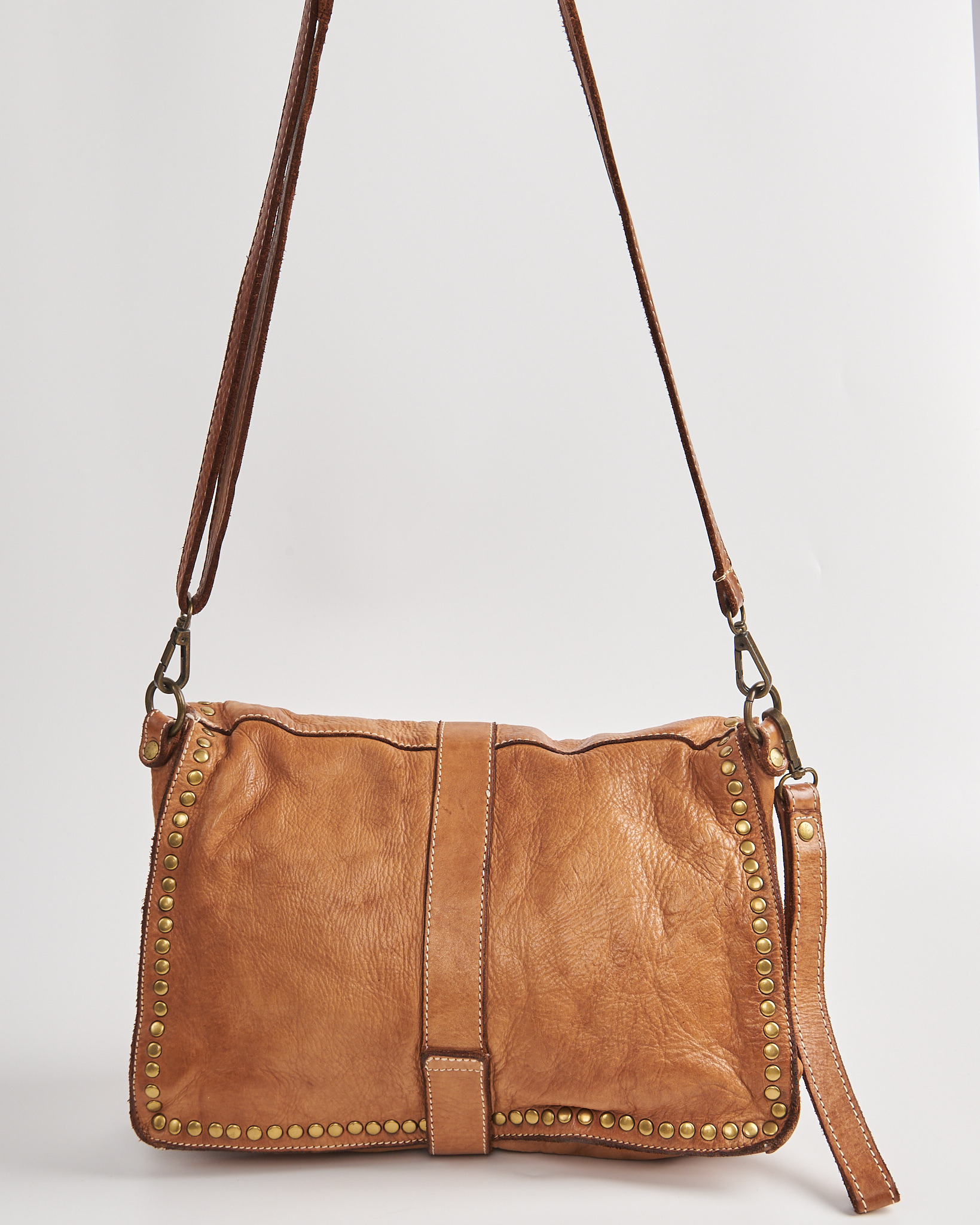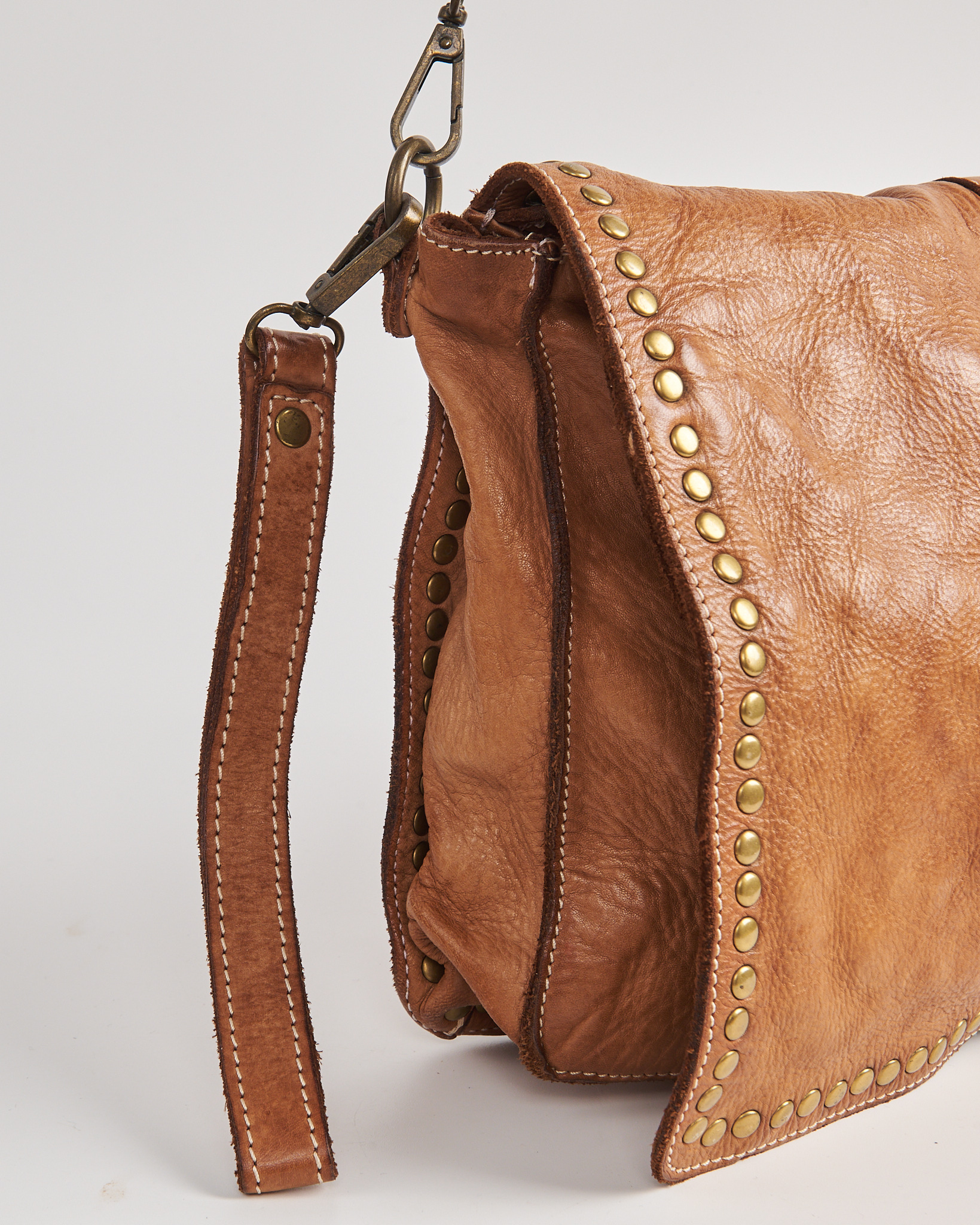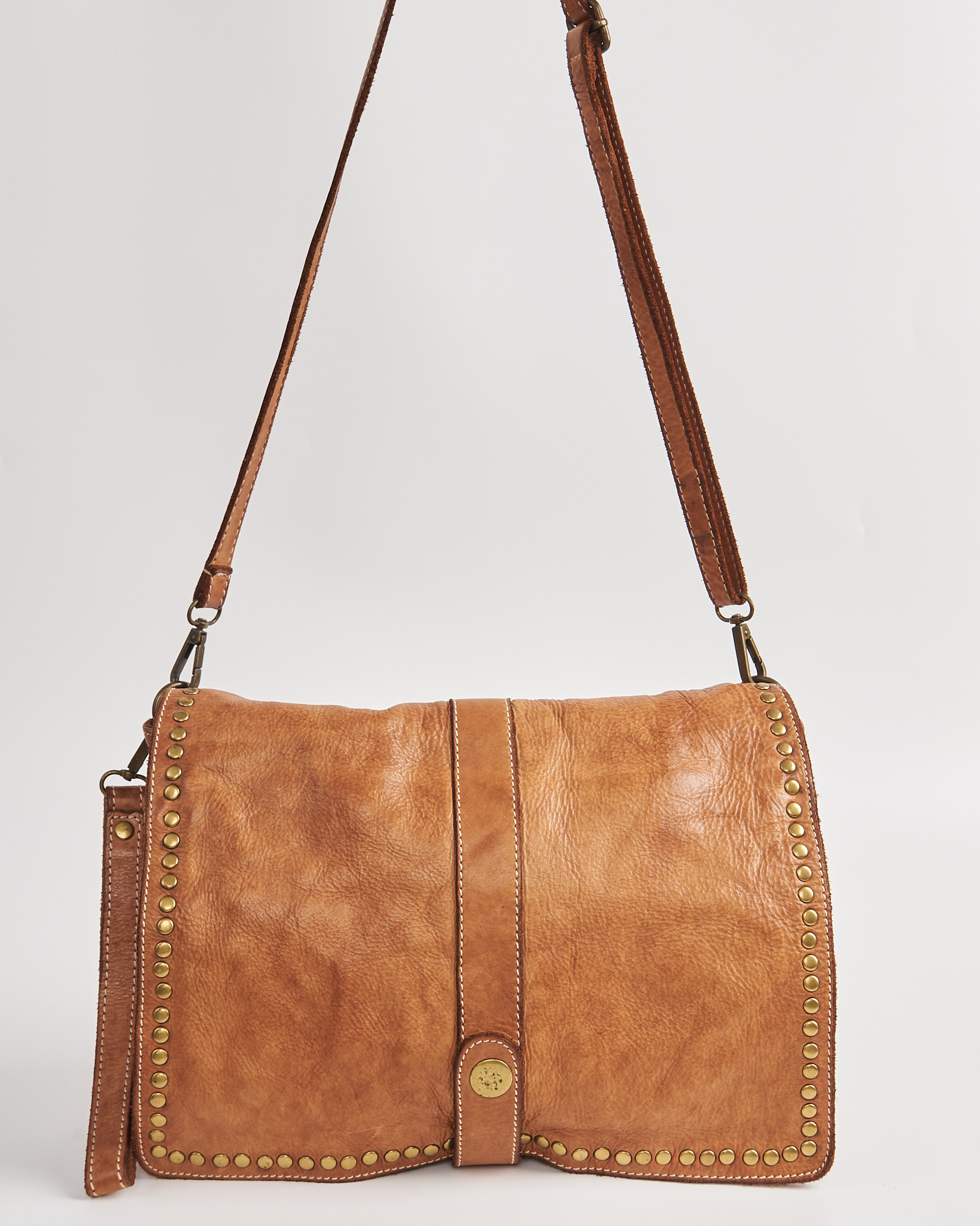 Кожаная сумка с клёпками из натуральной кожи. Клапан фиксируется на кнопку, по краю проходит ряд акцентных металлических клёпок. Посадка комфортная за счет длинного ремня, который регулируется.