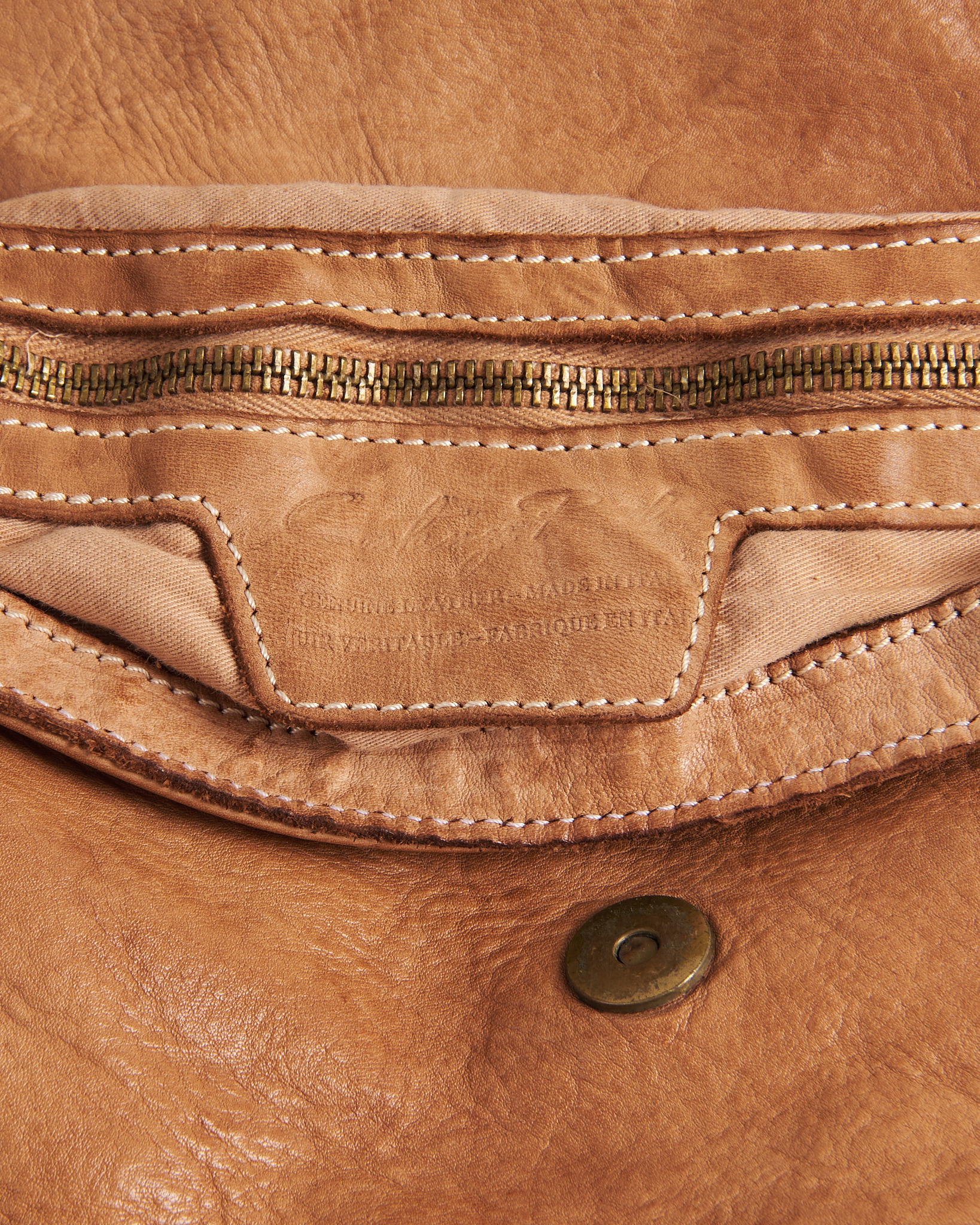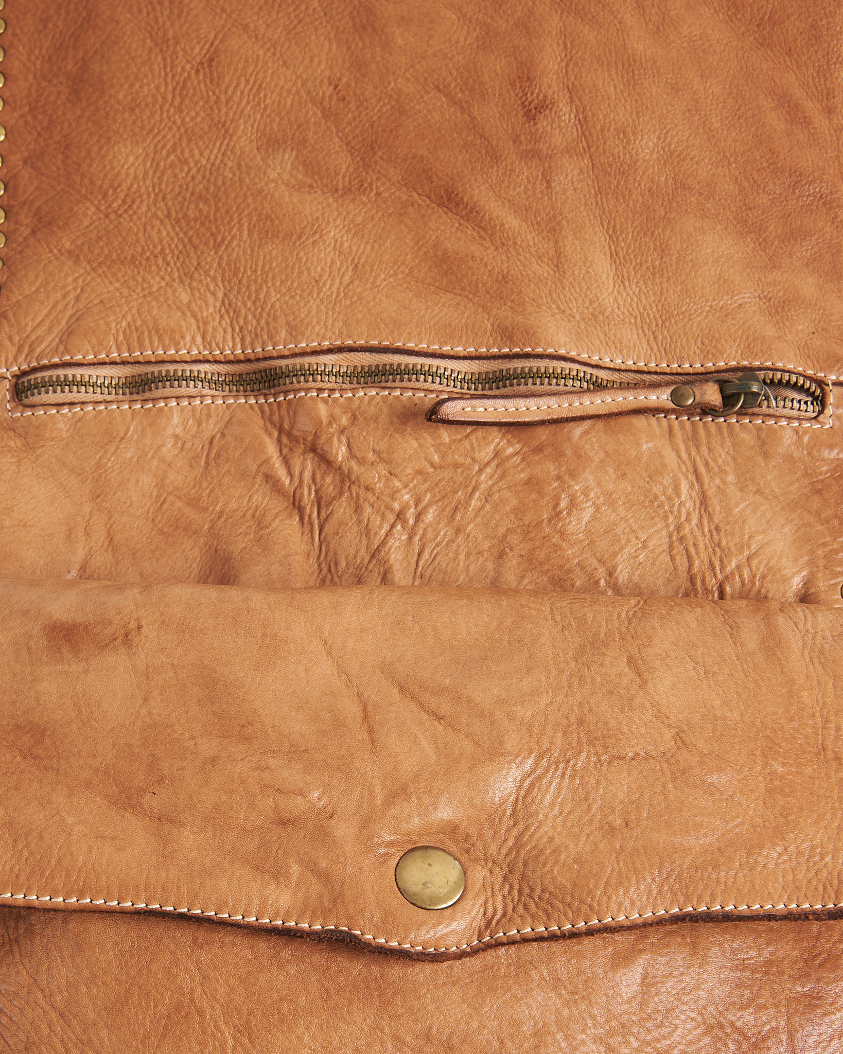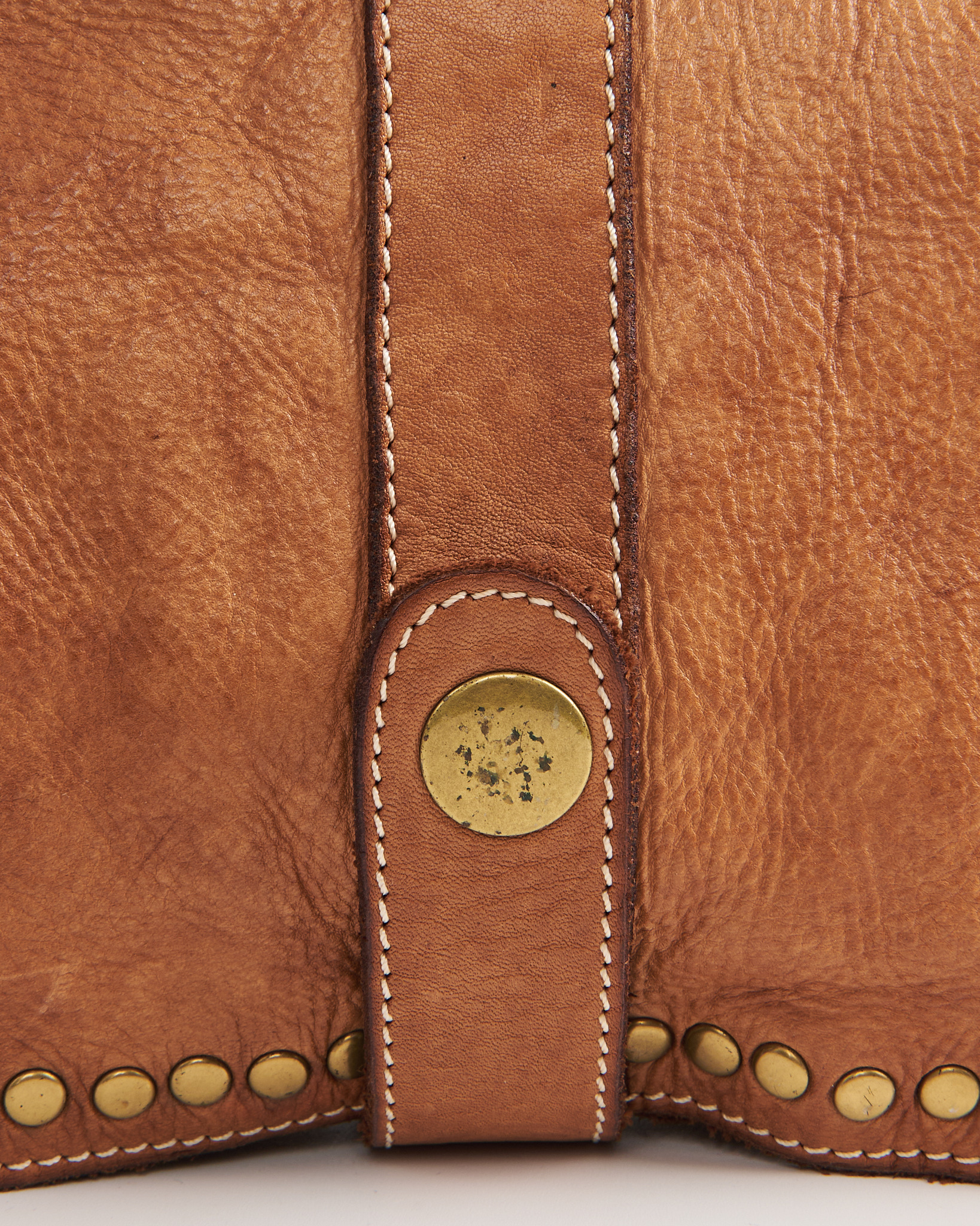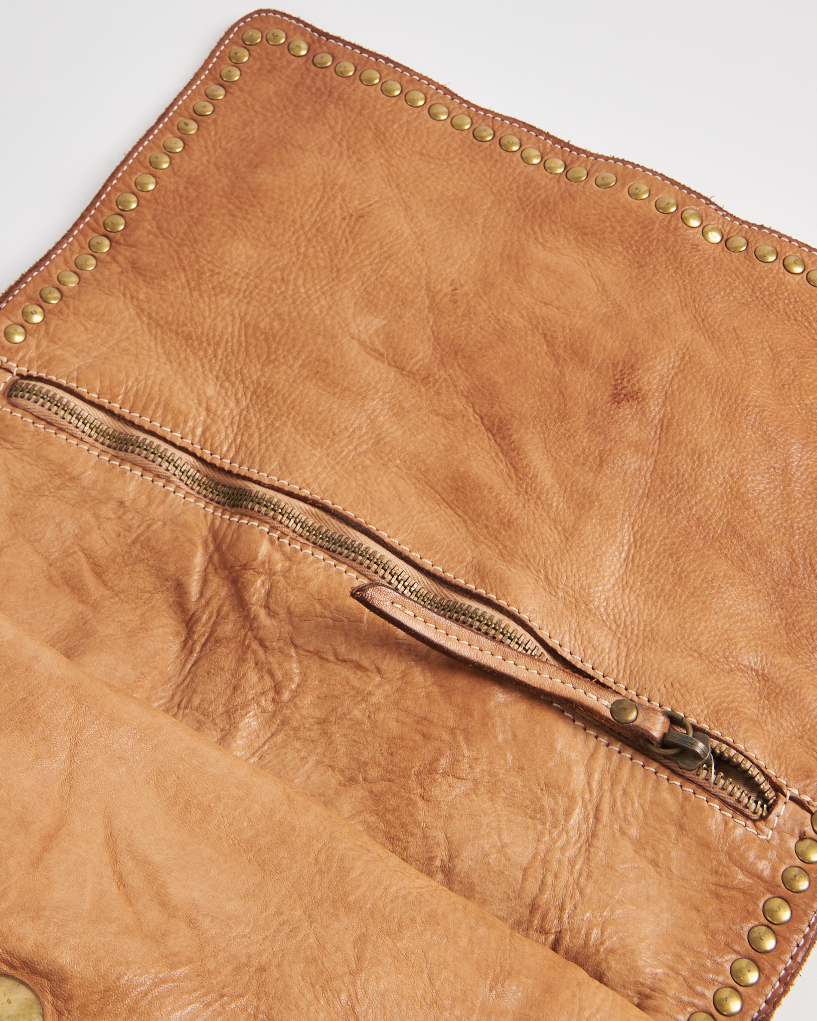 Кожаная сумка с клёпками из натуральной кожи. Клапан фиксируется на кнопку, по краю проходит ряд акцентных металлических клёпок. Посадка комфортная за счет длинного ремня, который регулируется.