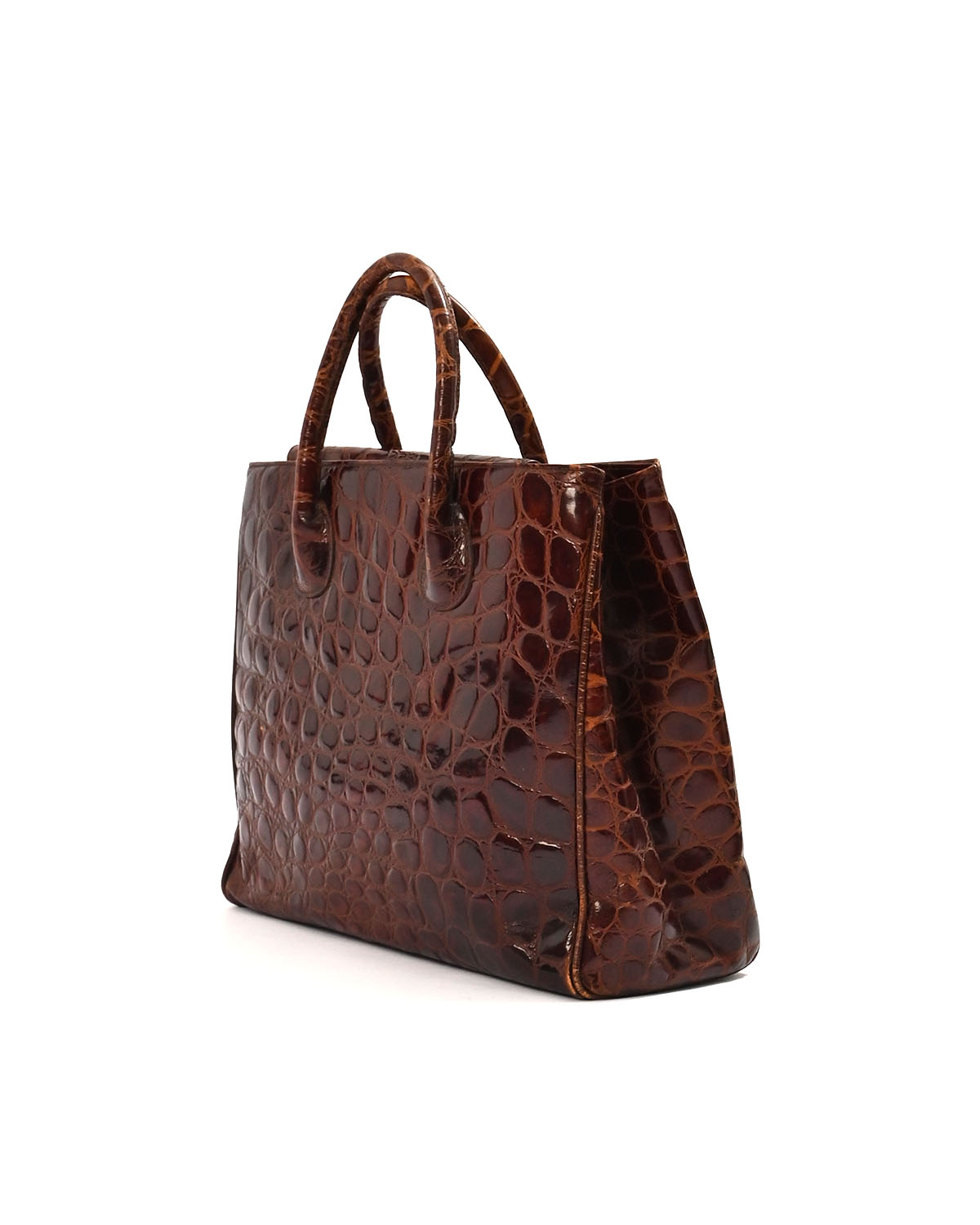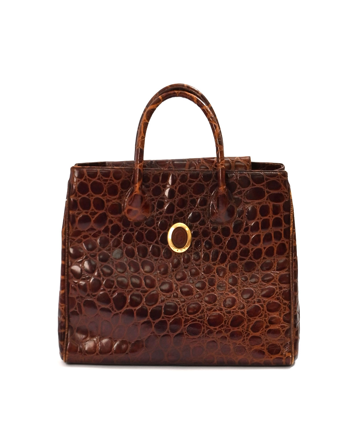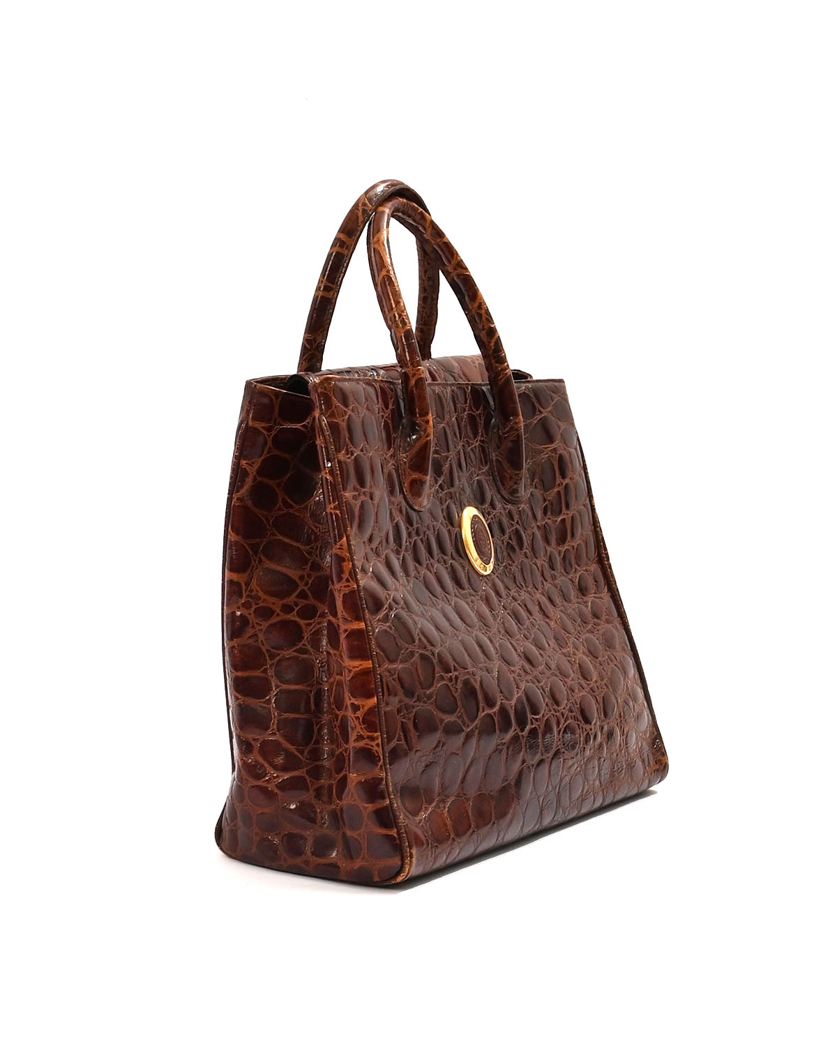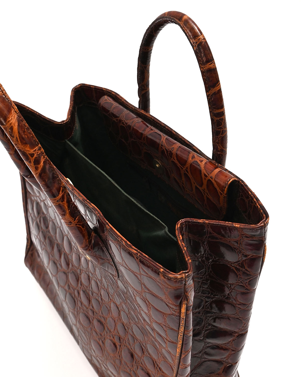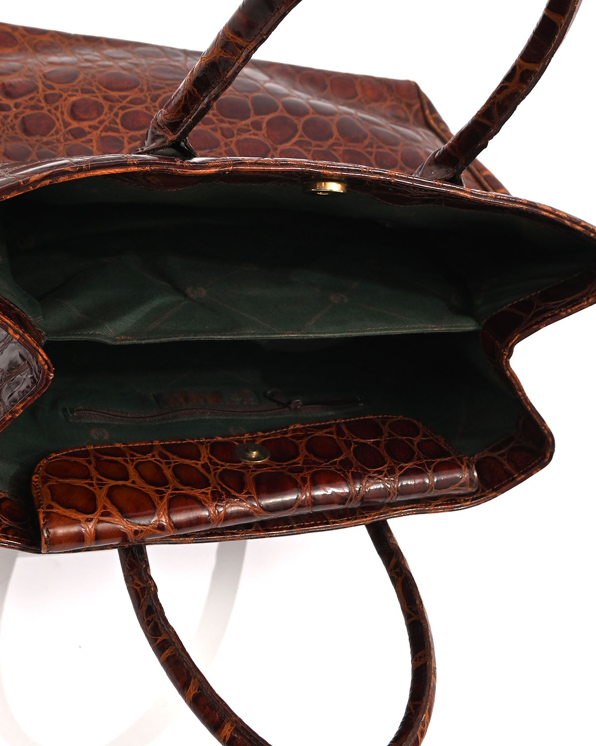 • Выполнена из натуральной кожи тёплого коньячного оттенка с тиснением под крокодила. Поверхность гладкая, с лёгким глянцем.