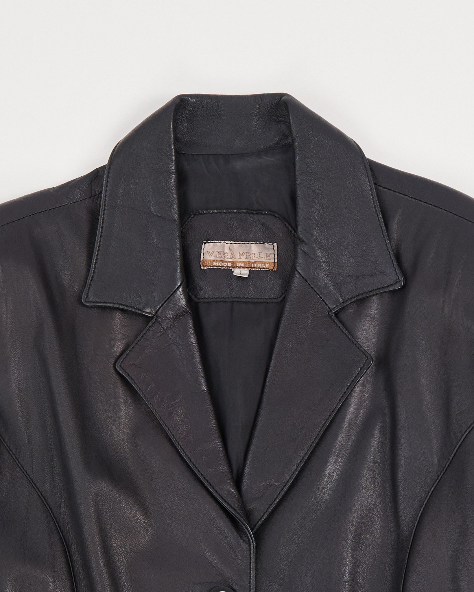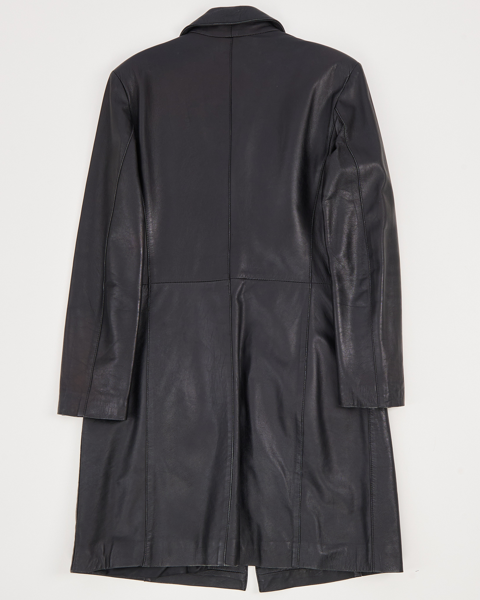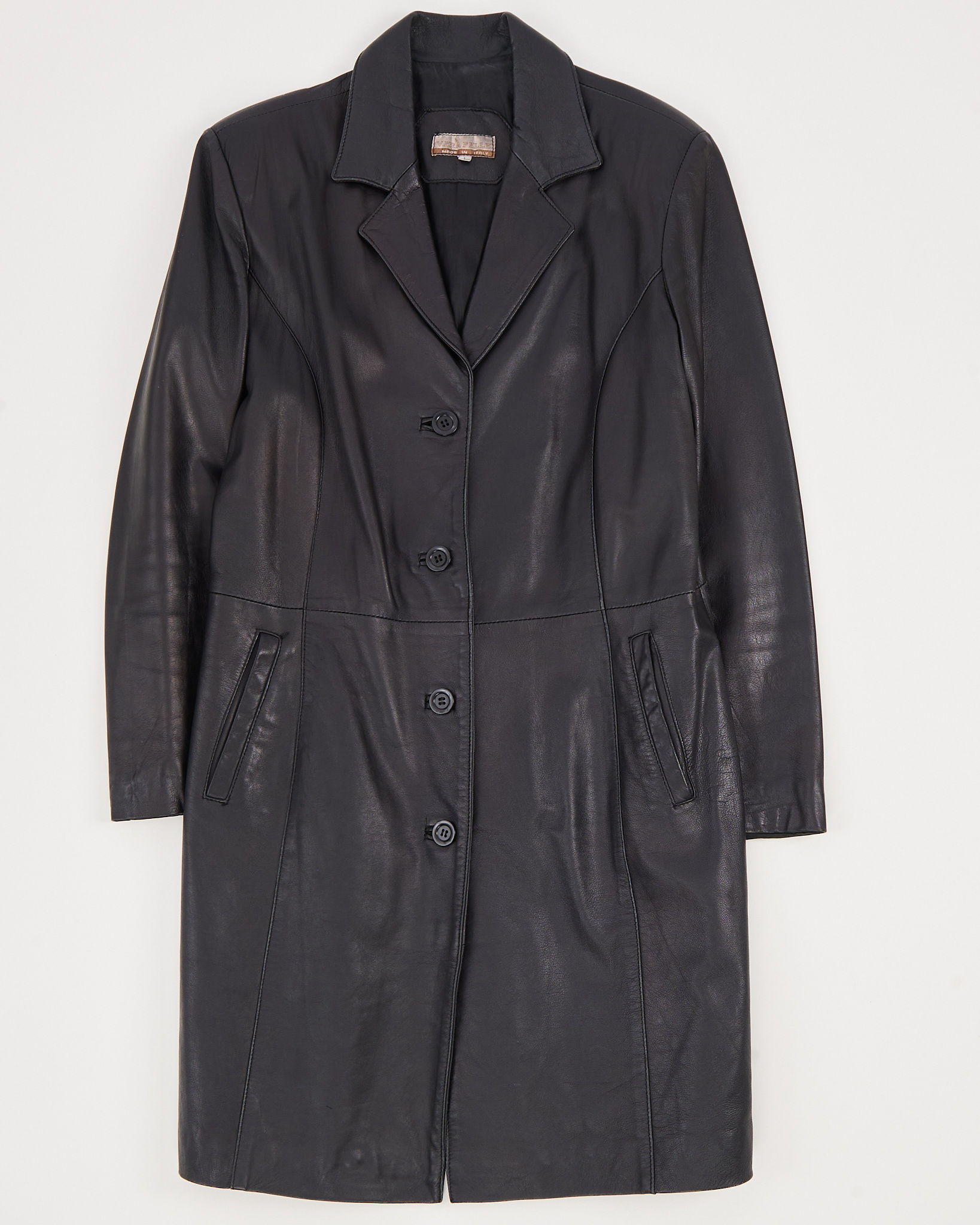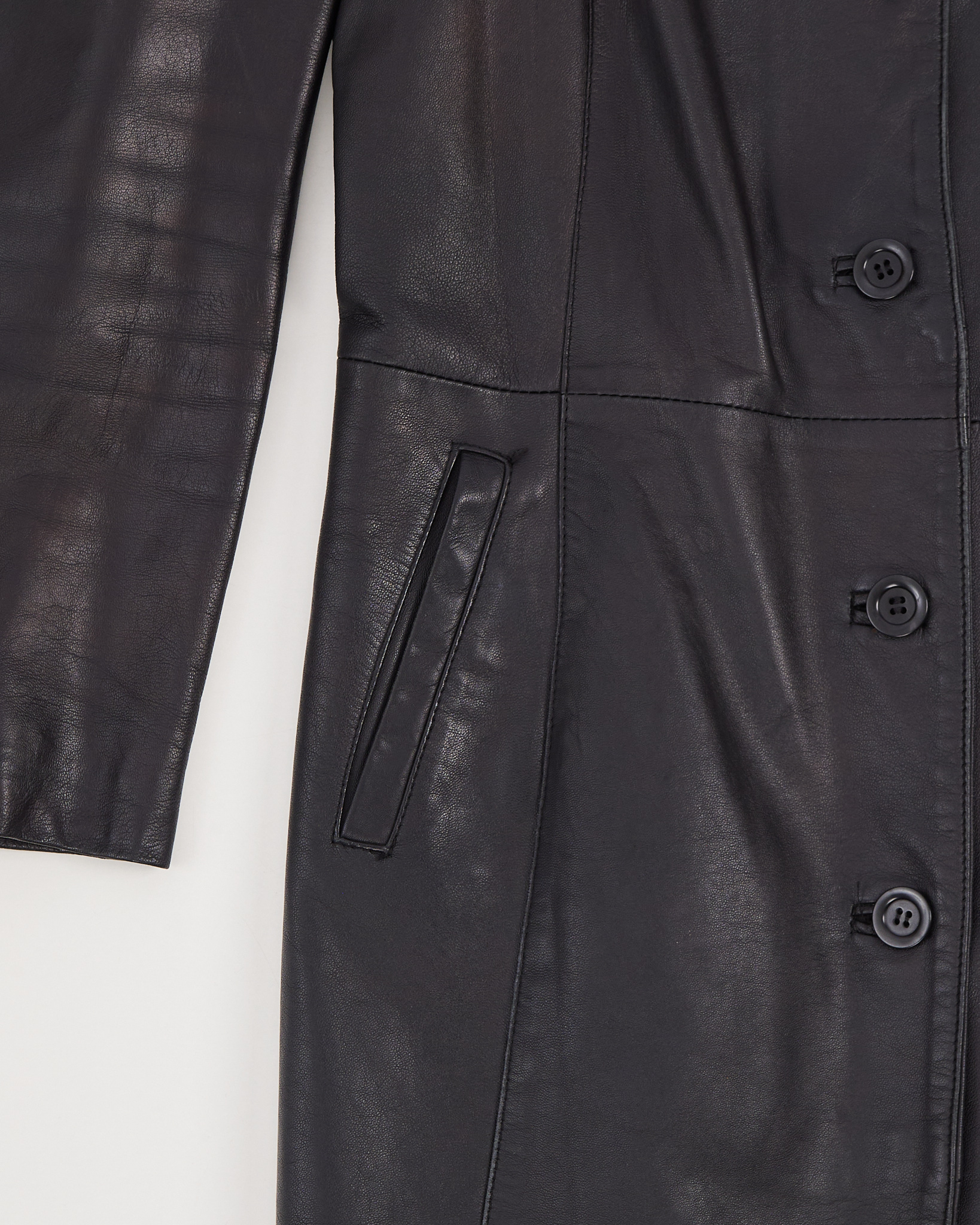 Пальто из натуральной кожи, плотного материала. Прямого силуэта с чёткой линией плеч и аккуратной длиной до колена. Застёжка на пуговицах, прорезные карманы.