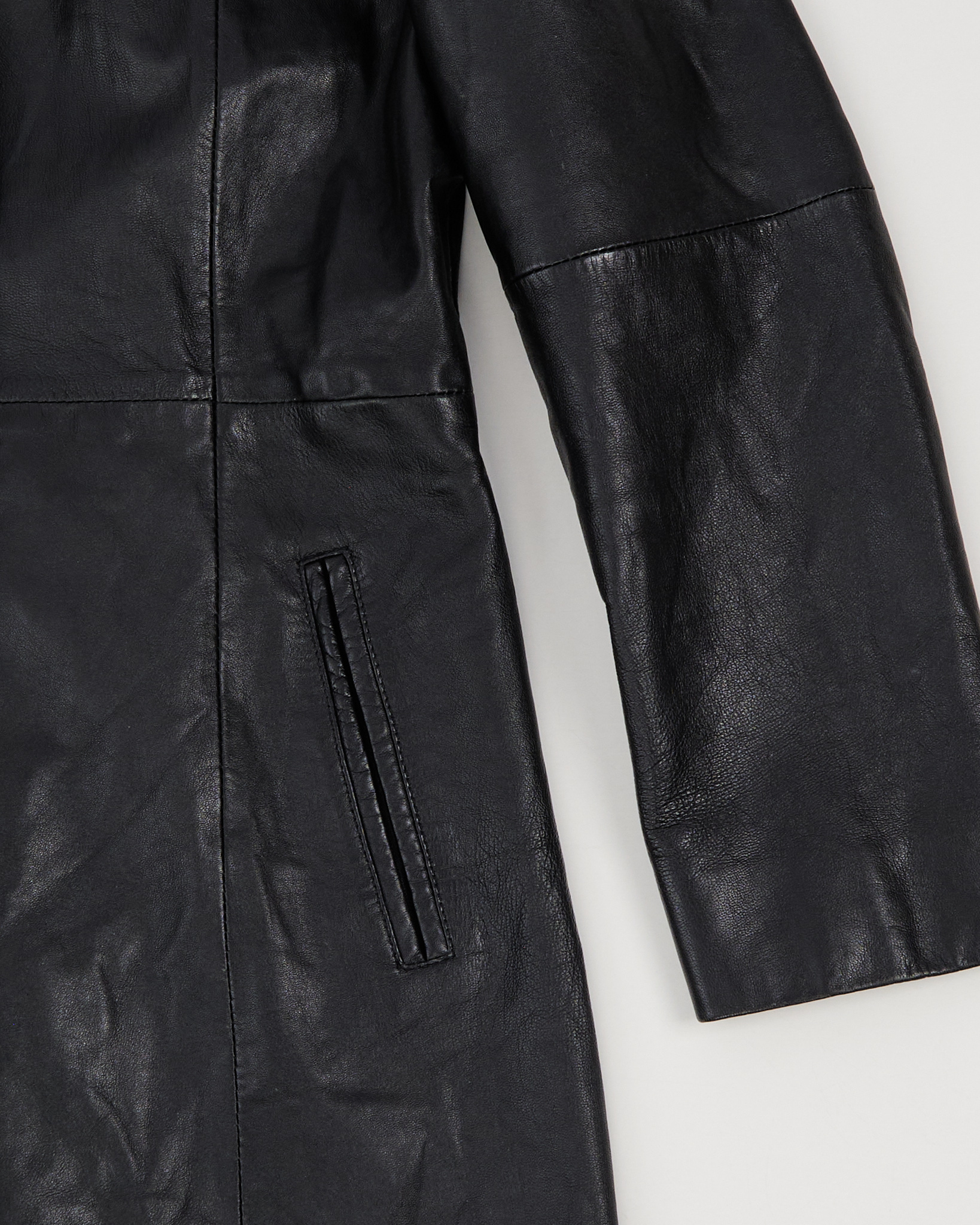 Классическое кожаное пальто приталенного кроя. Отложной воротник, однобортная конструкция с центральной застёжкой на пуговицы, два накладных кармана.