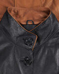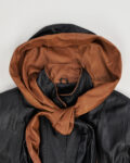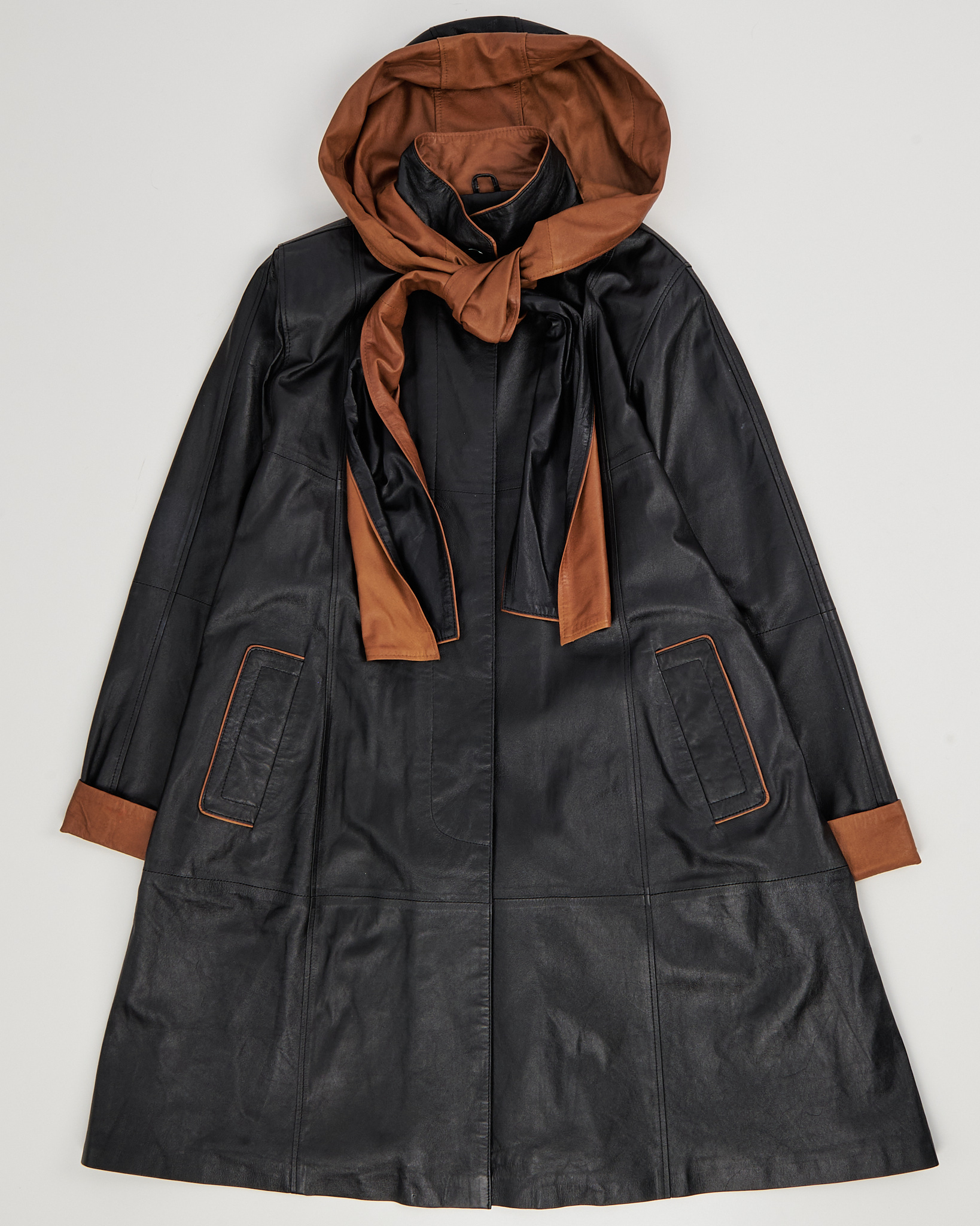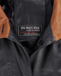Кожаное пальто Turquoise Collection by Uysallar из натуральной кожи. Посадка свободная, линия кроя создаёт вытянутый силуэт. Контрастные вставки на манжетах и капюшоне, декоративные клапаны карманов, удобная застежка на пуговицы. Капюшон с завязками, акцентная вставка на спинке.