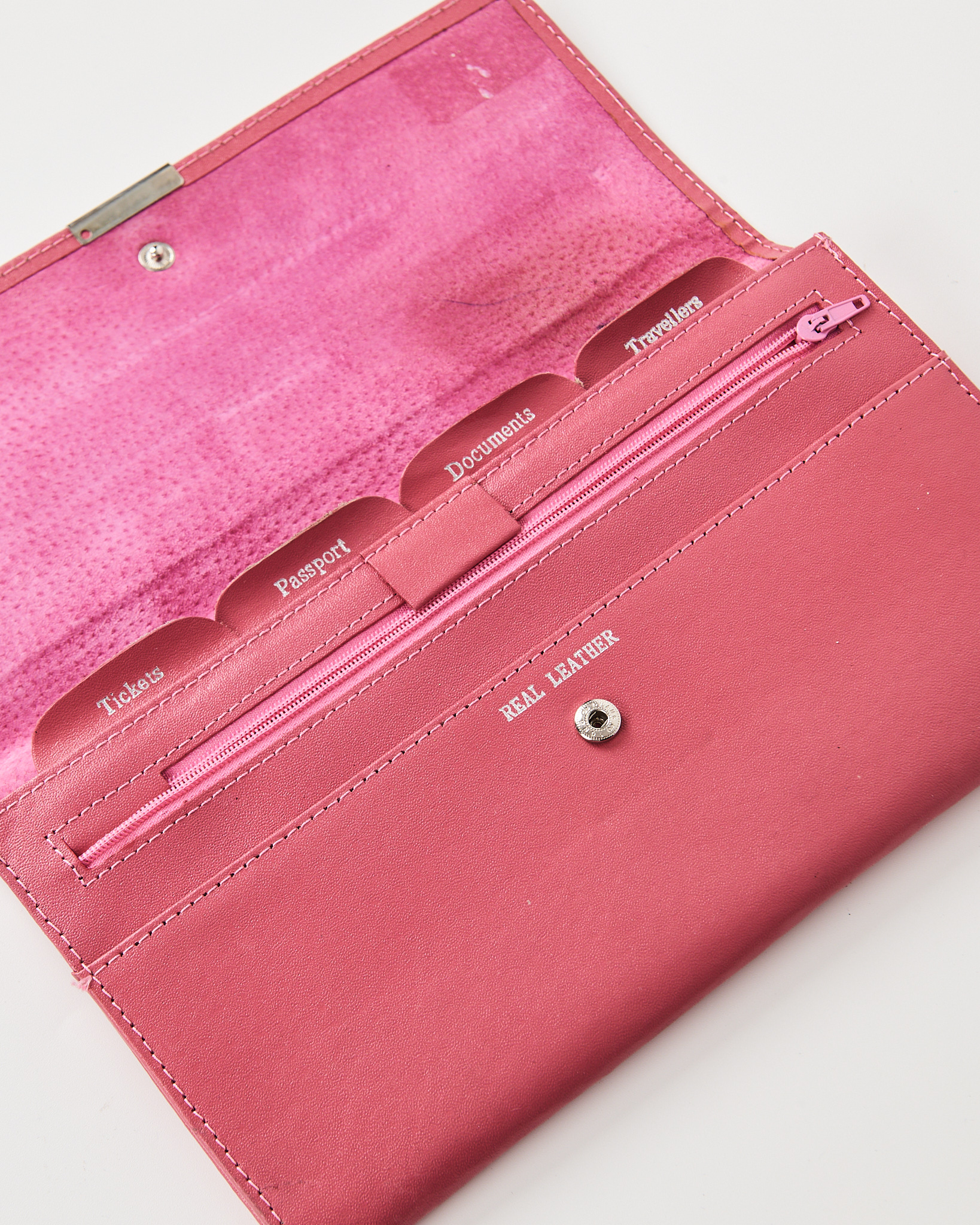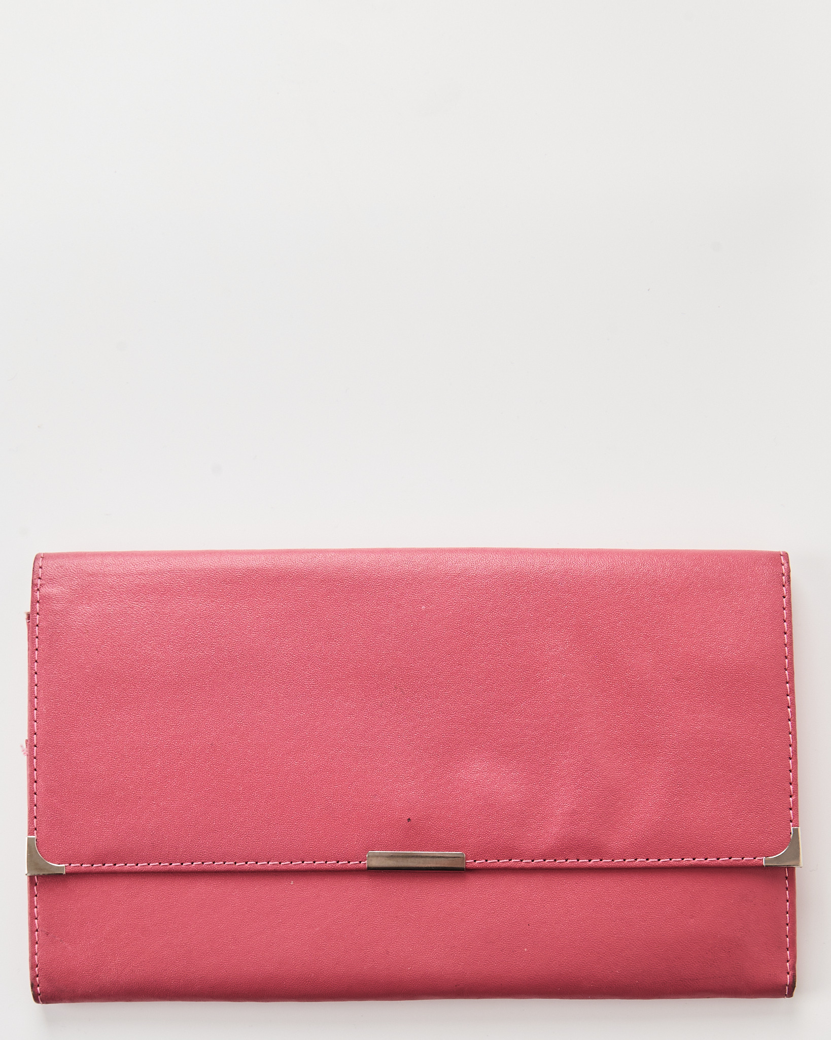 Портмоне из натуральной кожи в насыщенном розовом оттенке. Удобная застежка, внутри предусмотрены отделения для билетов, паспорта и документов, есть карман на молнии. Металлические уголки и аккуратная строчка.