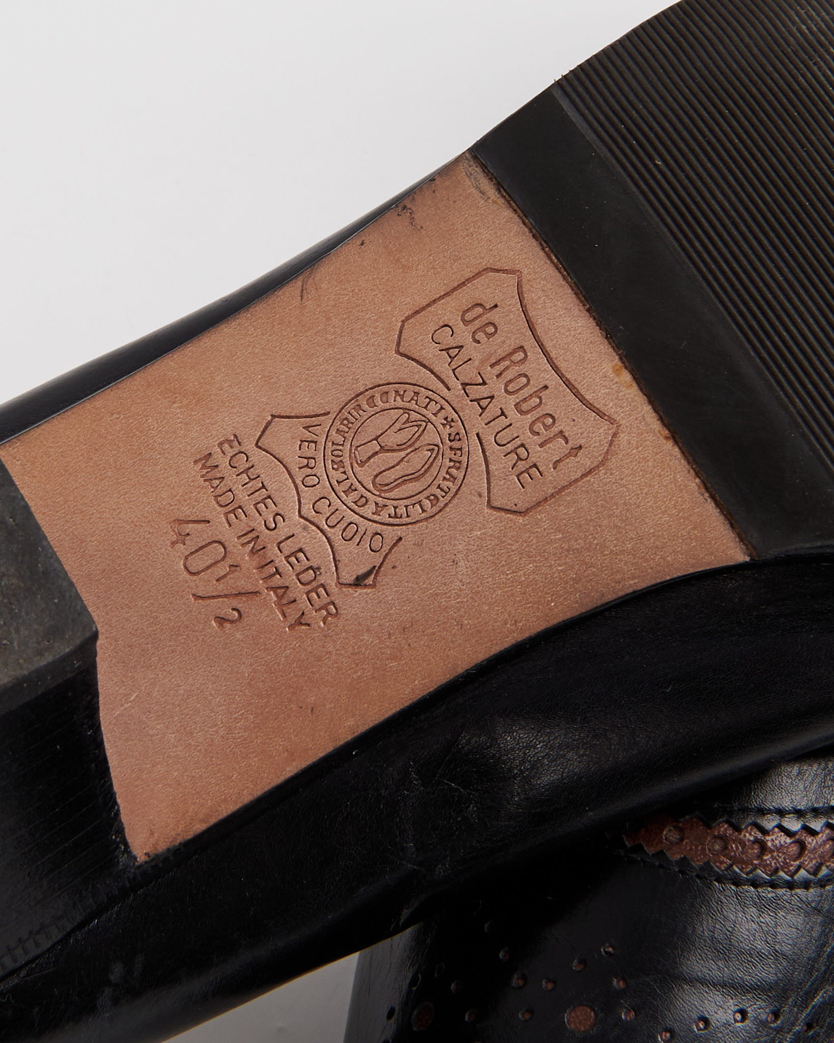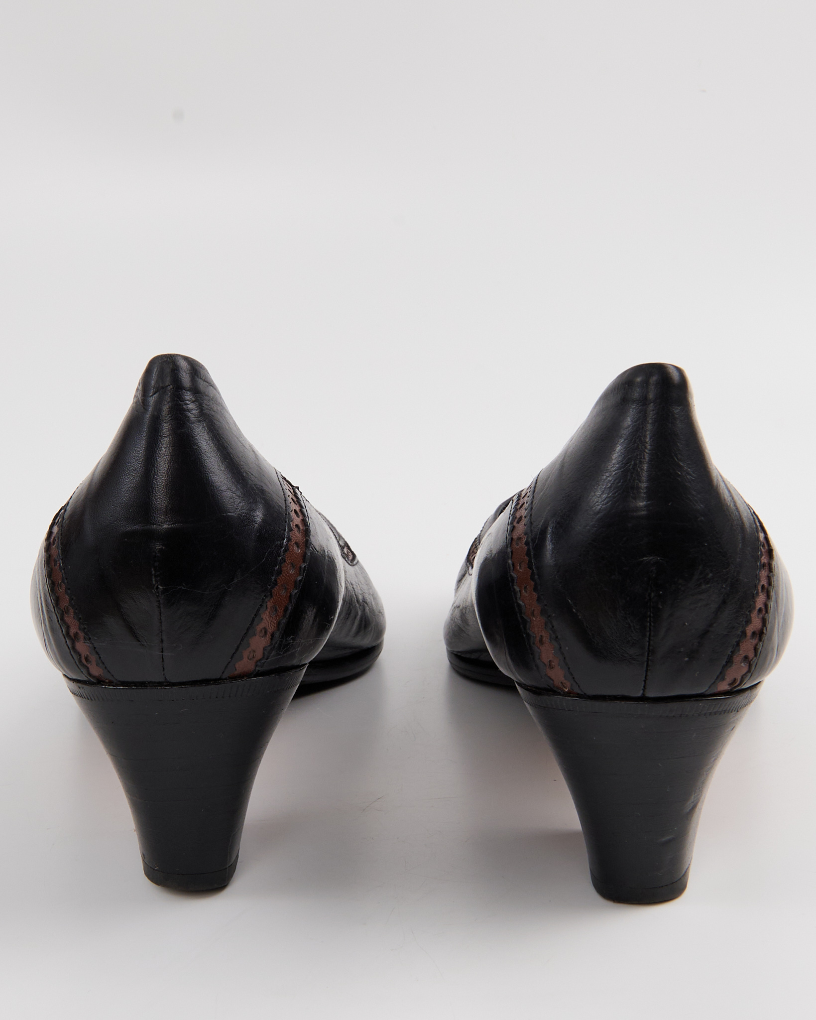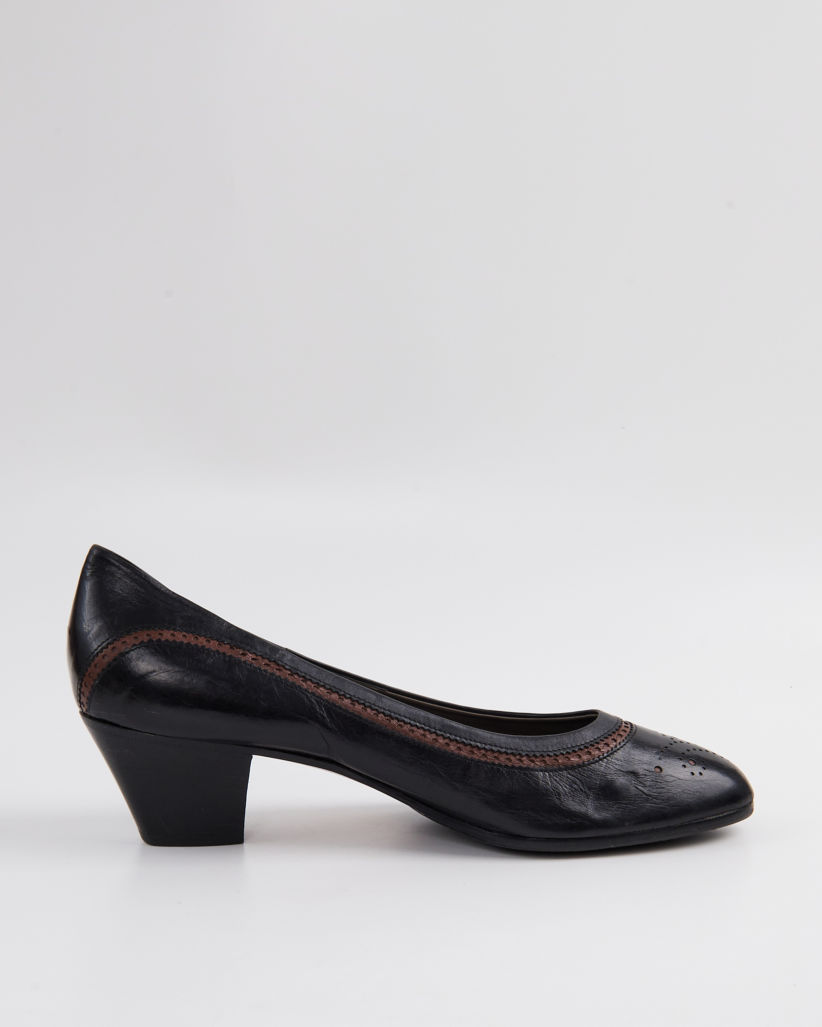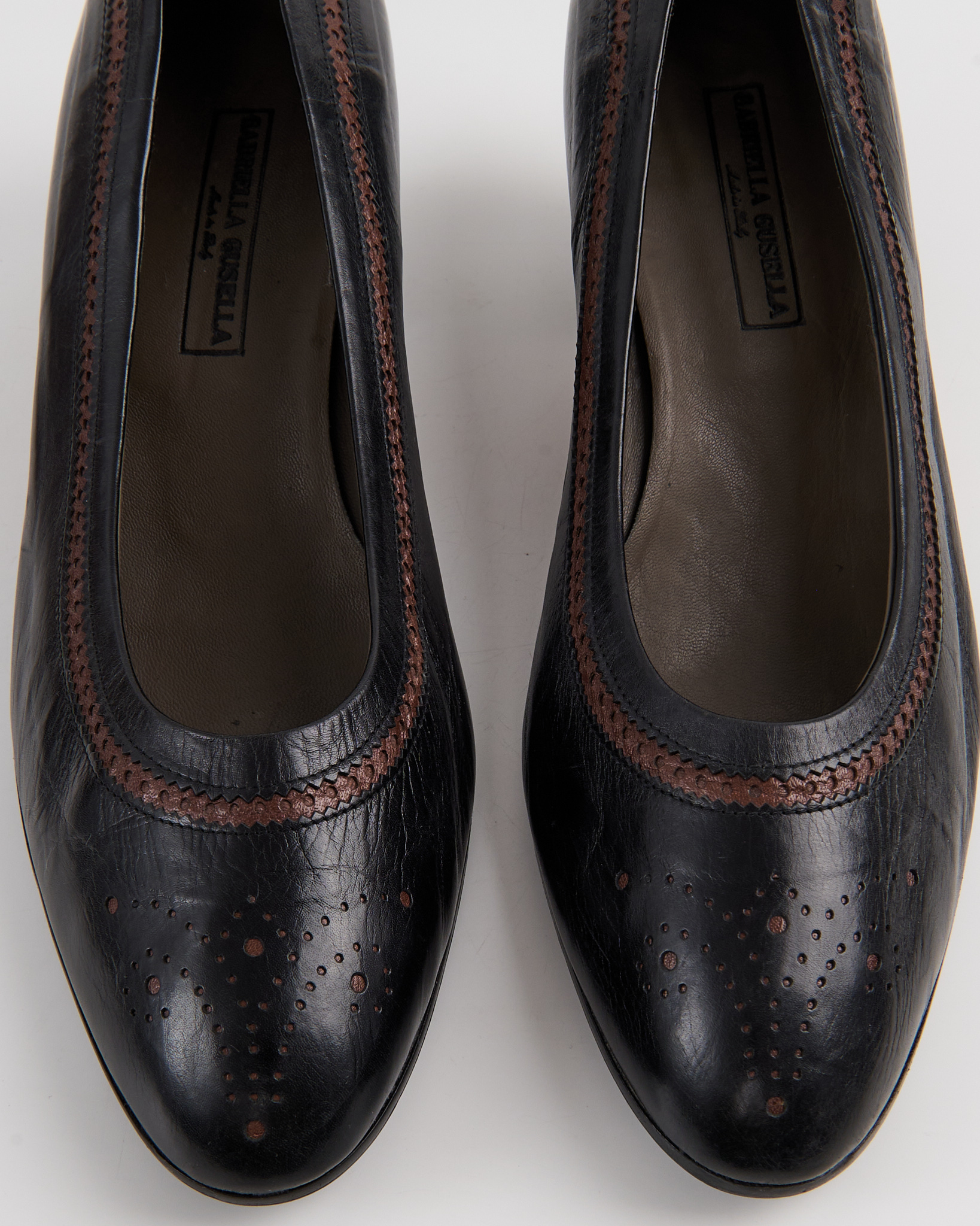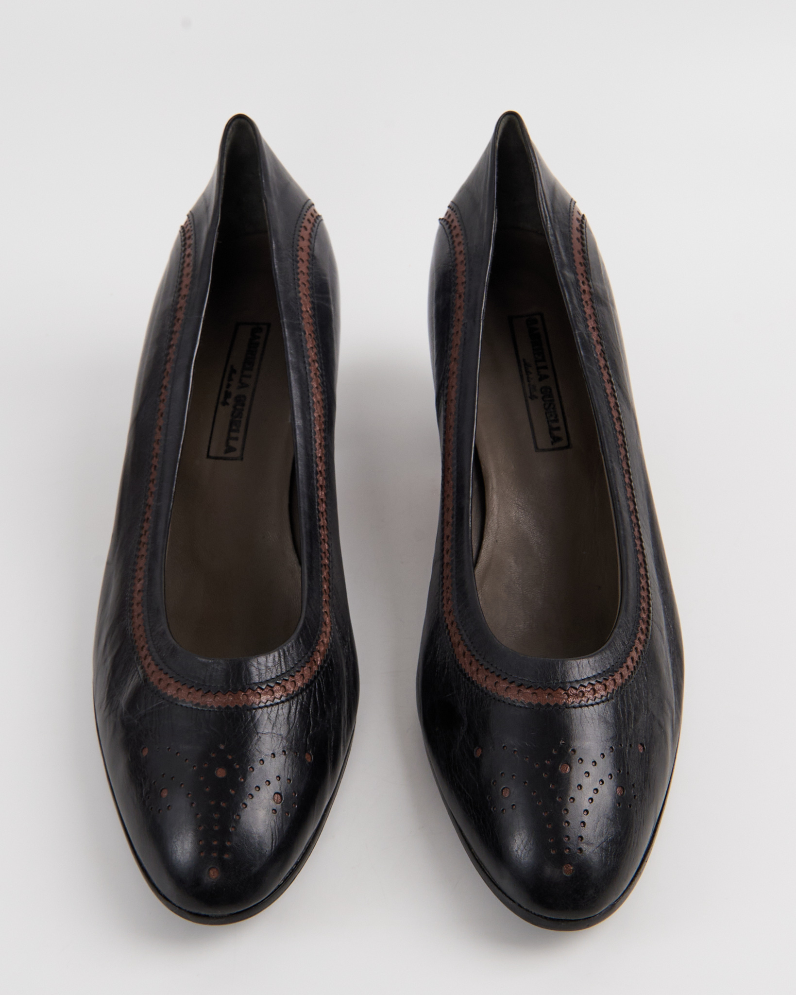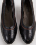 Элегантные итальянские туфли De Roberti Calzature из натуральной кожи. Стильный классический дизайн с округлым носком, дополненный изящными декоративными перфорациями и контрастной коричневой строчкой. Удобный устойчивый каблук средней высоты. Сделаны в Италии