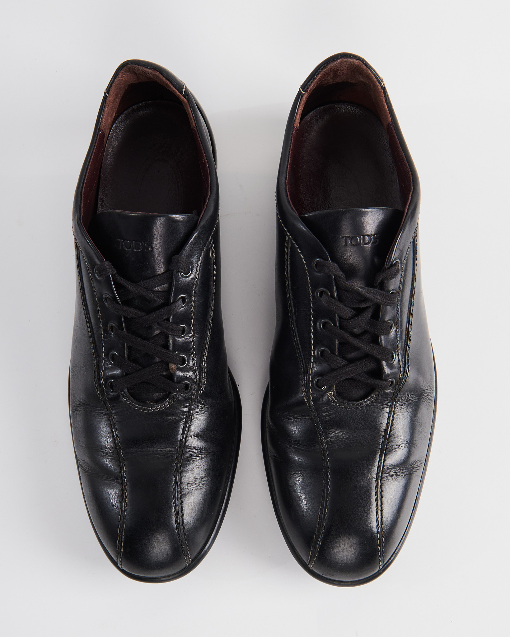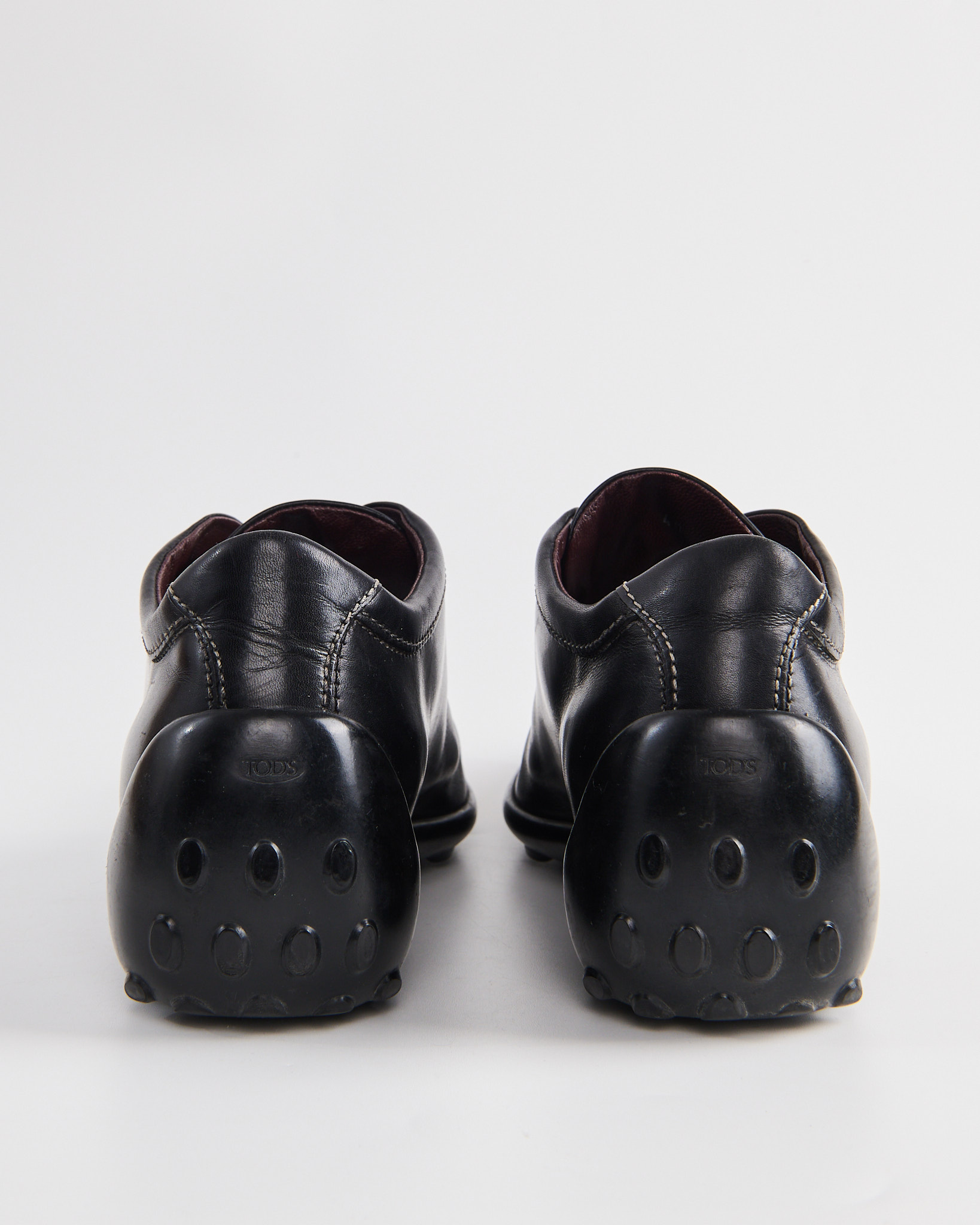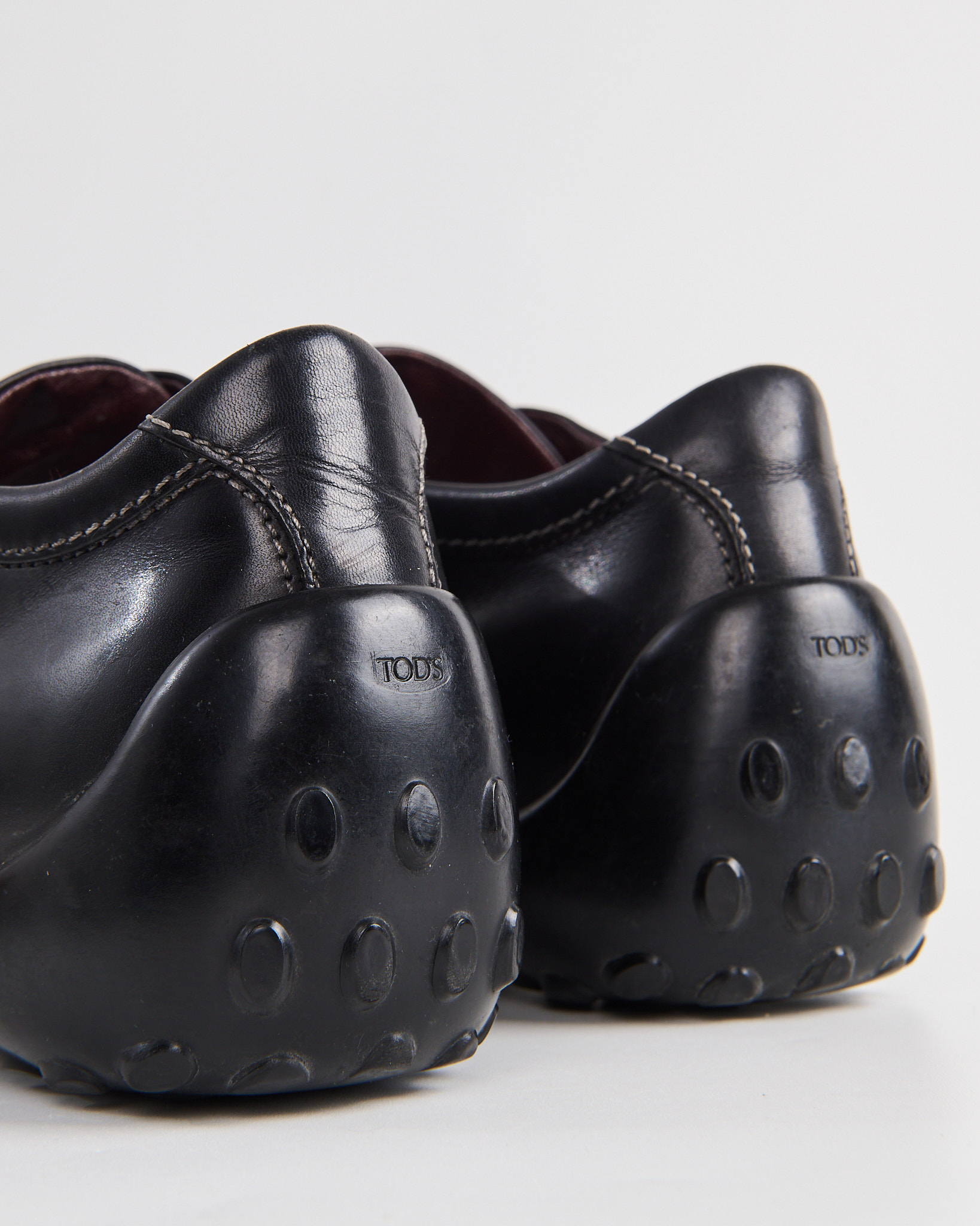 Кожаные туфли Tod’s в чёрном цвете. Посадка плотная, обувь фиксирует стопу и держит форму. Фирменная подошва с резиновыми шипами, удобная шнуровка.