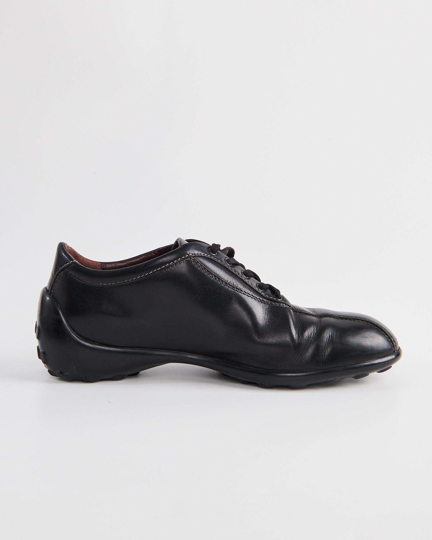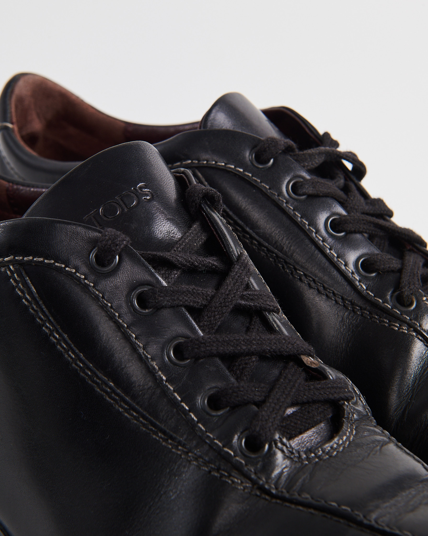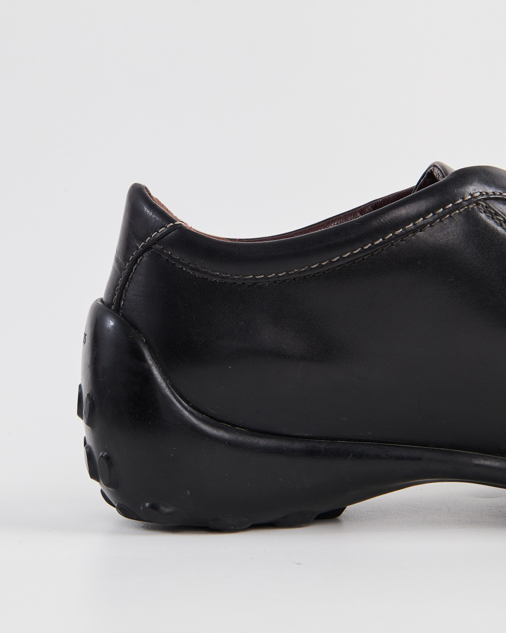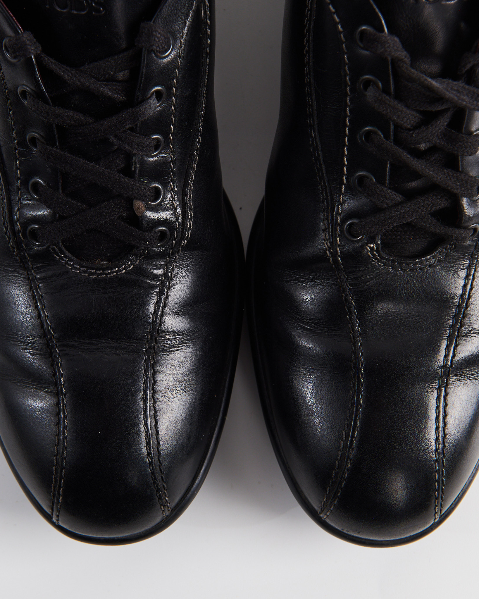 Кожаные туфли Tod’s в чёрном цвете. Посадка плотная, обувь фиксирует стопу и держит форму. Фирменная подошва с резиновыми шипами, удобная шнуровка.