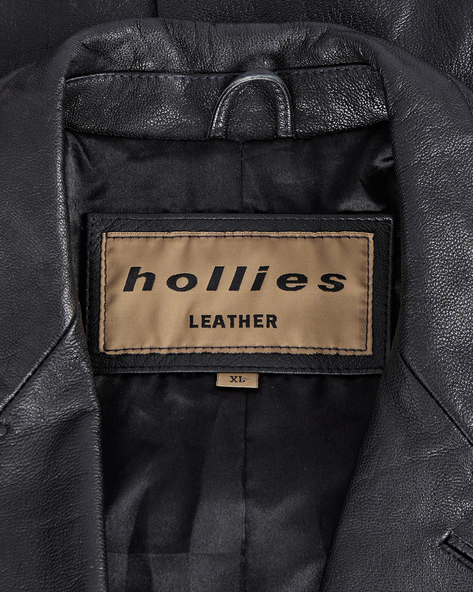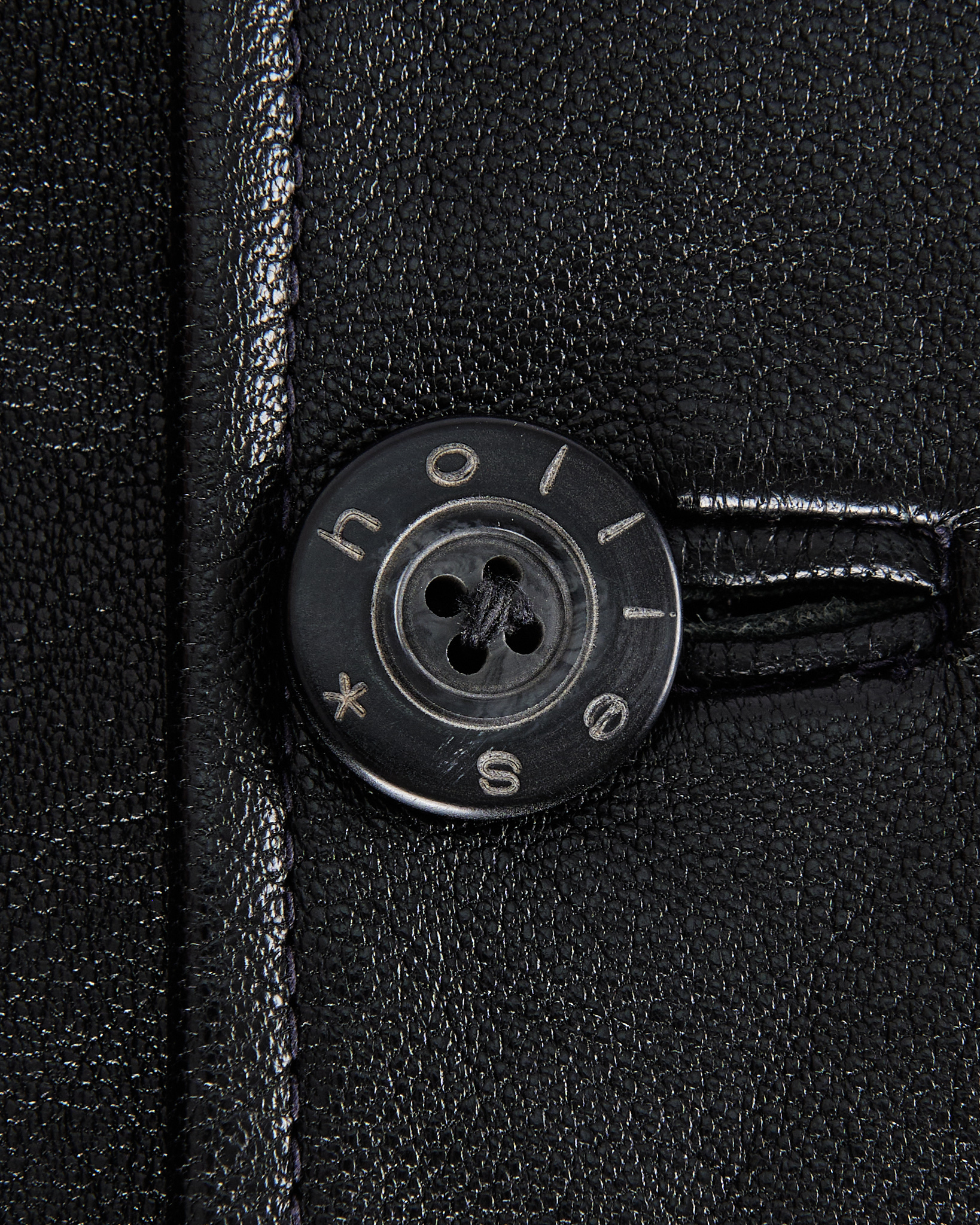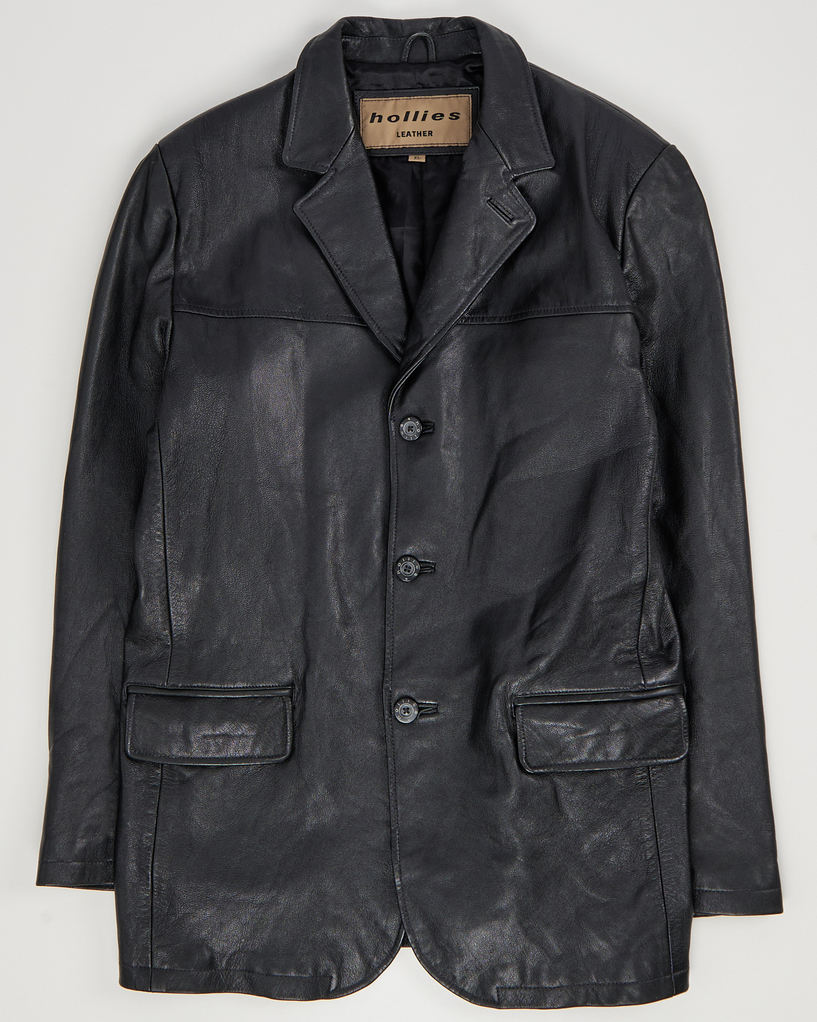 Кожаный пиджак от Hollies. Классический прямой крой, застёжка на трёх пуговицах, два боковых кармана, отложной воротник.