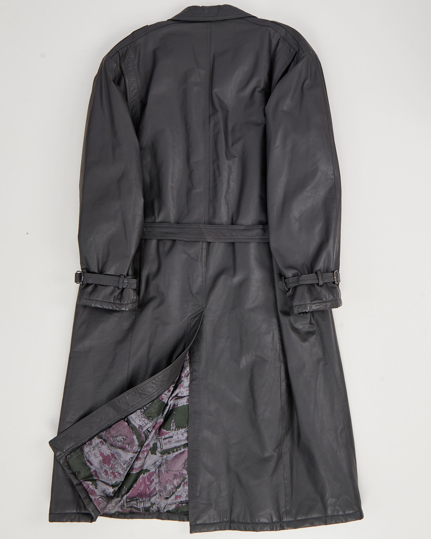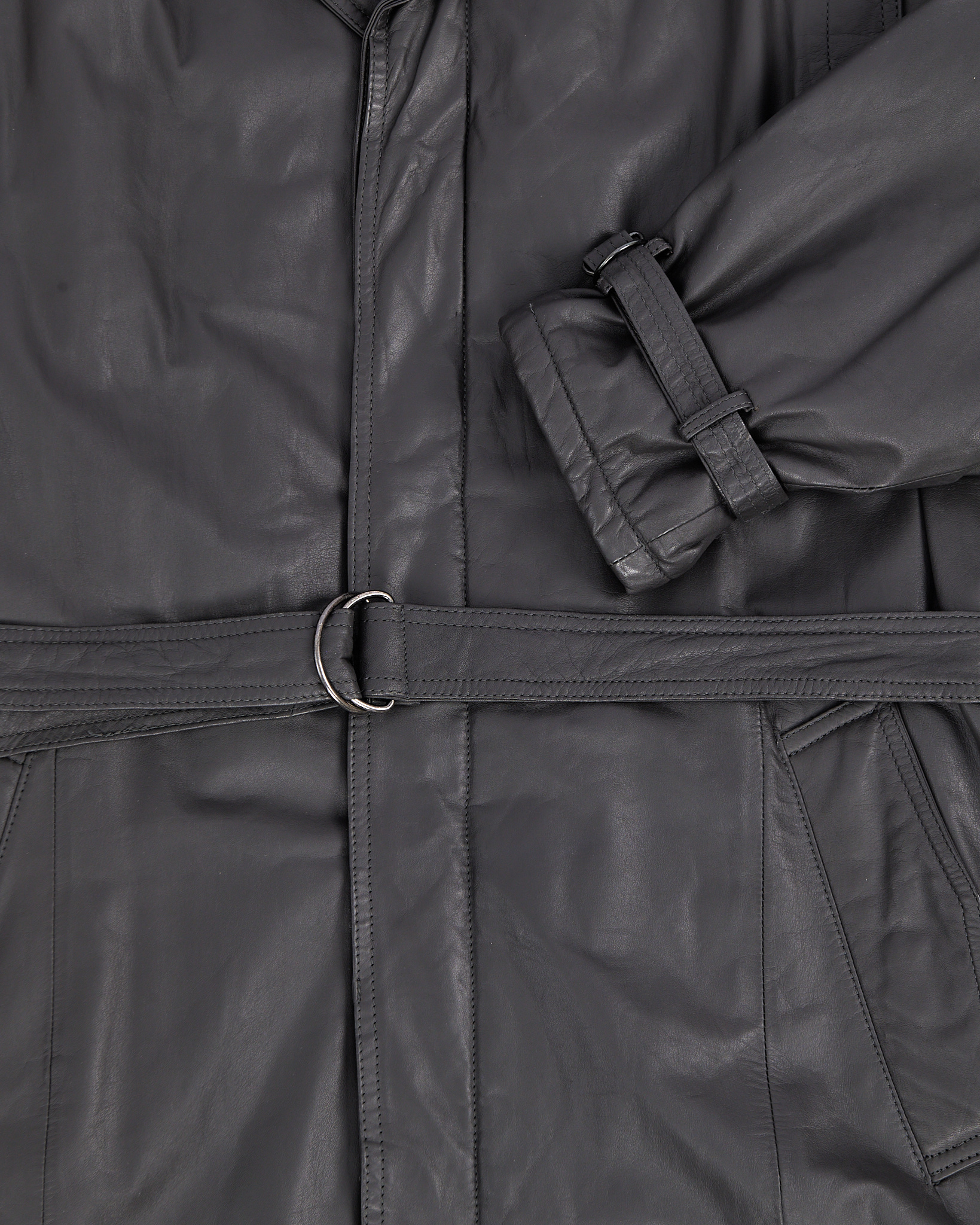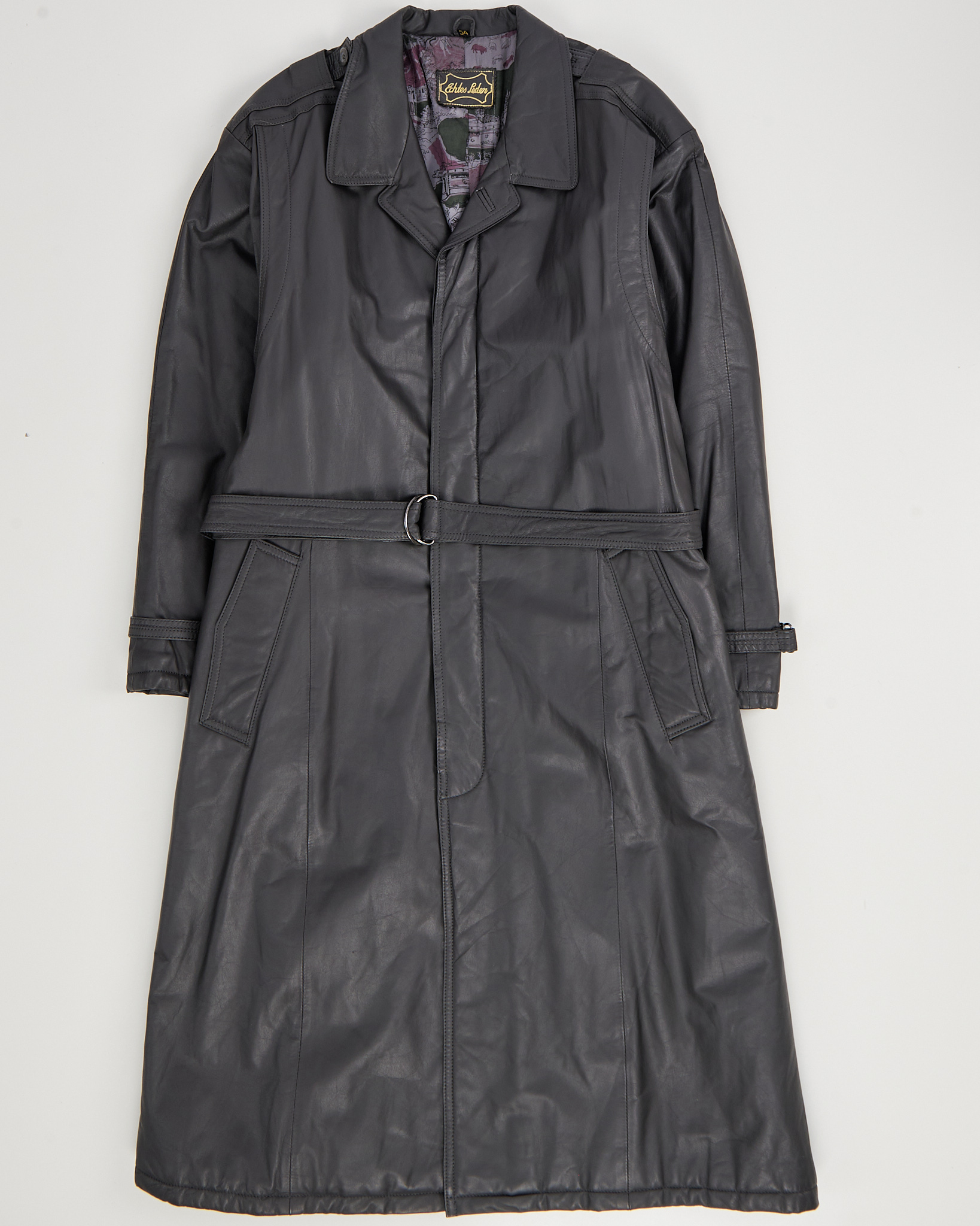 Кожаный плащ от Rene Styled by Renaldo прямого, удлиненного кроя. Классический отложной воротник, потайная застежка на пуговицы, пояс с металлической пряжкой, два накладных кармана по бокам, на рукавах ремни для утяжки манжет.
