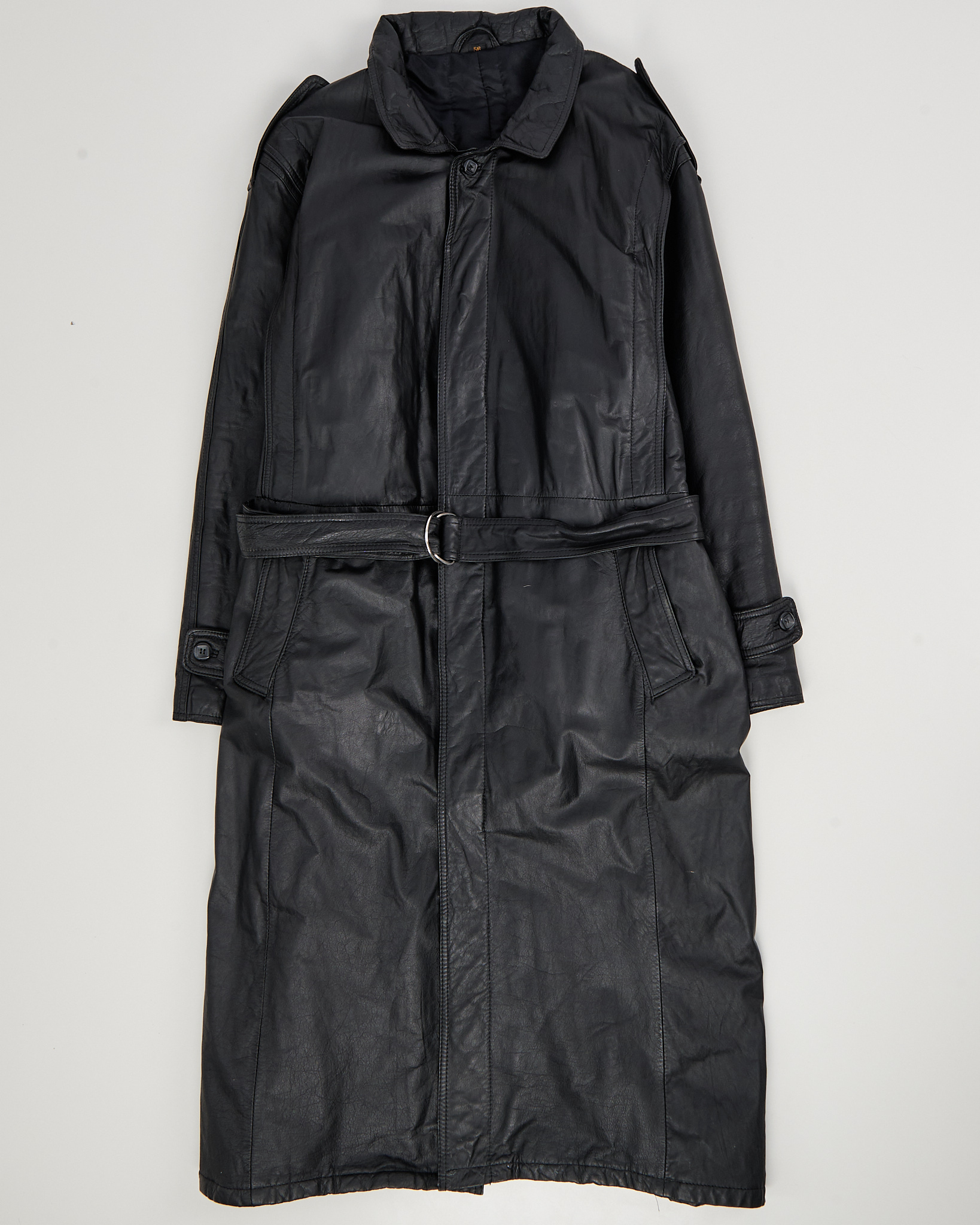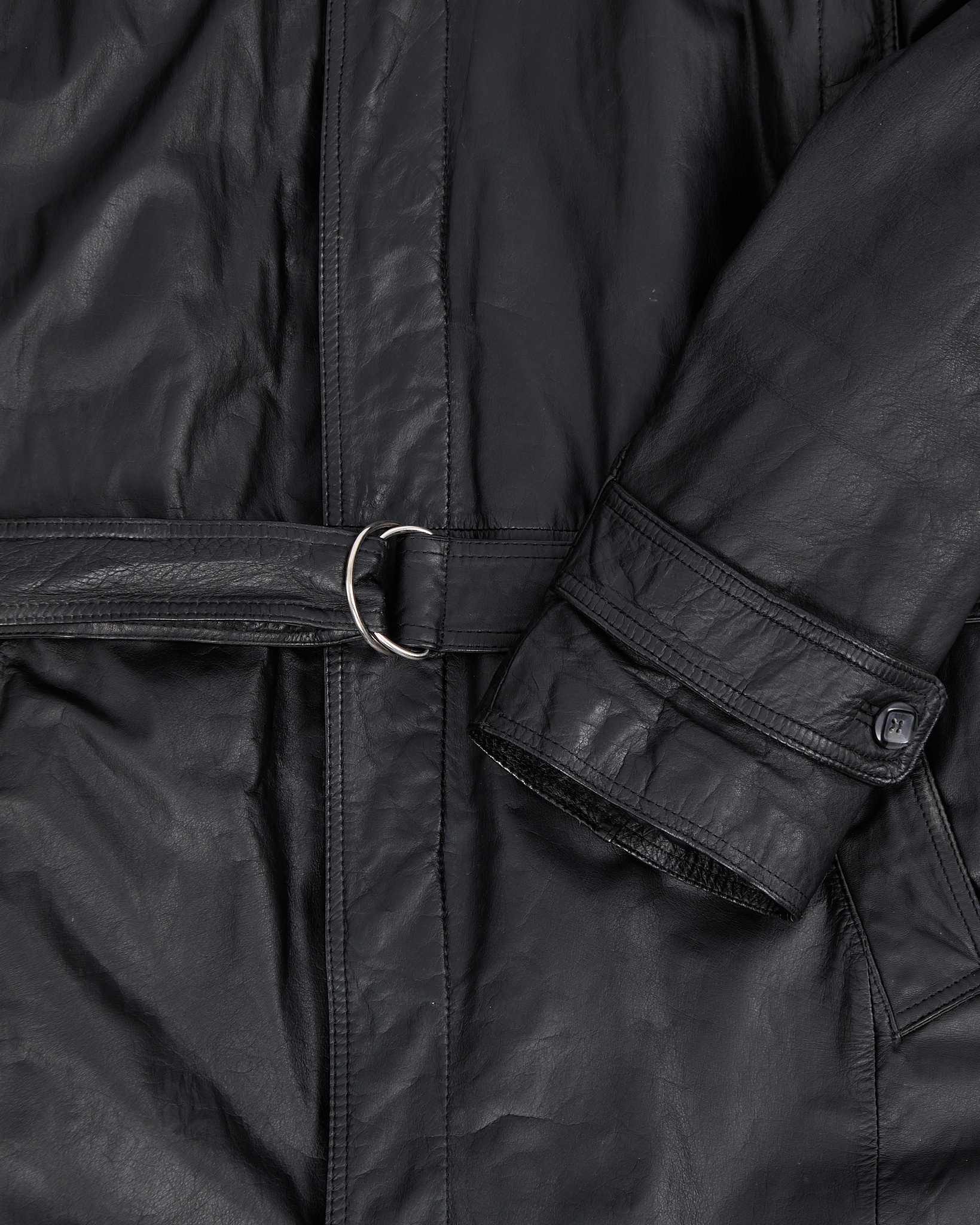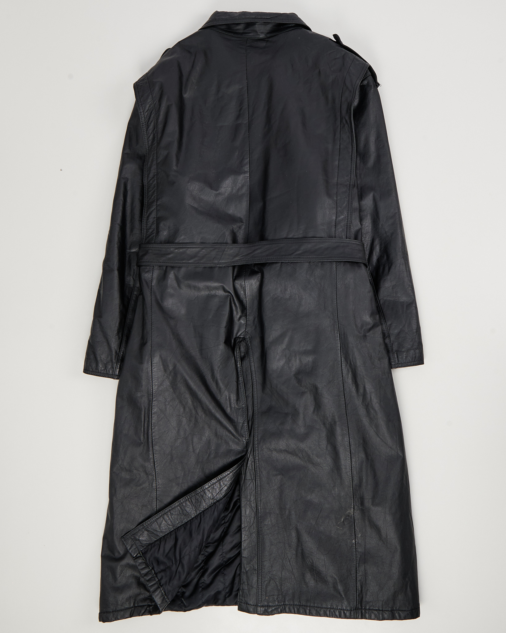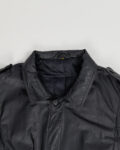 Плащ выполнен из натуральной кожи графитового цвета. Посадка свободная, пояс формирует линию талии. Широкий воротник, погоны на плечах и функциональные карманы