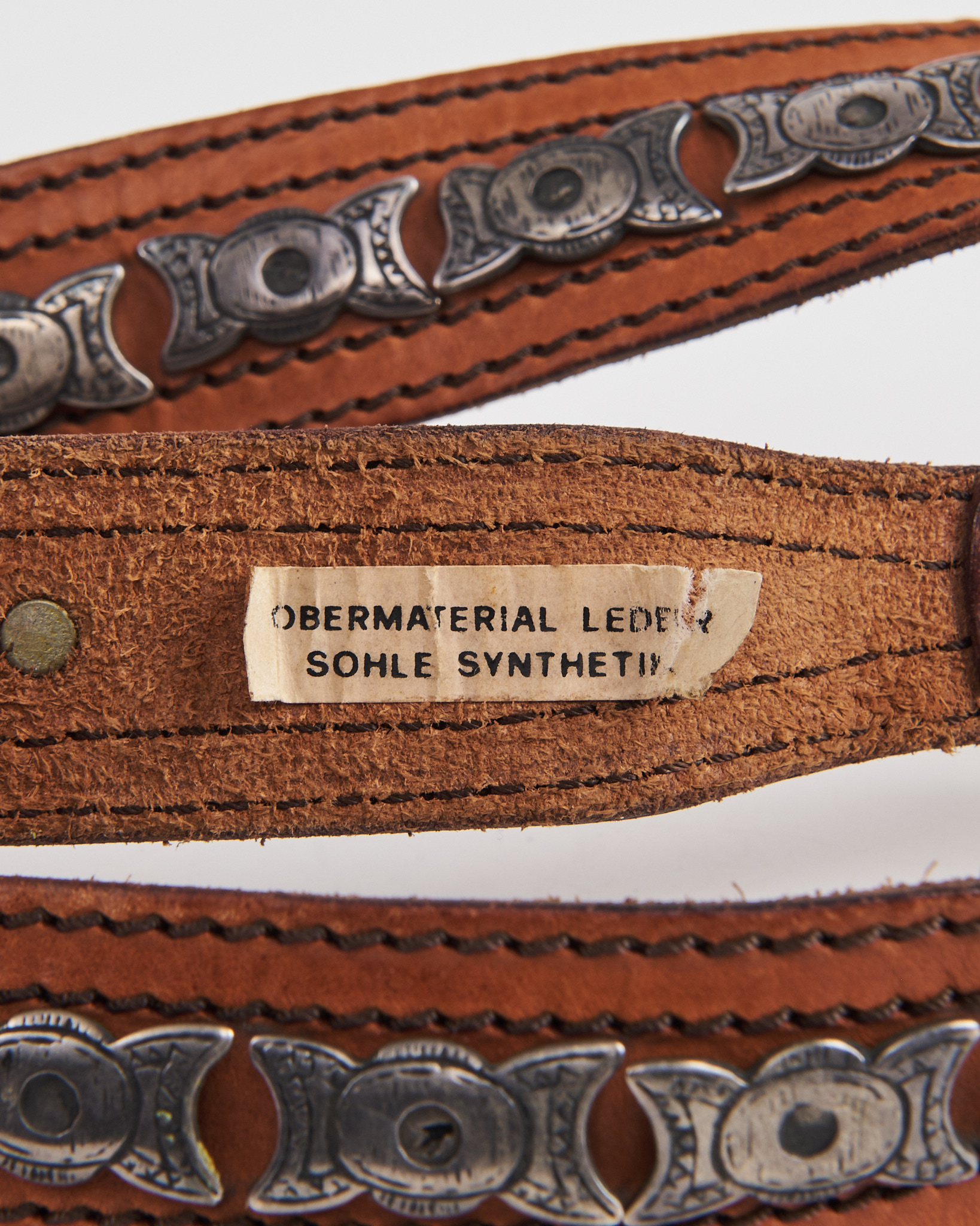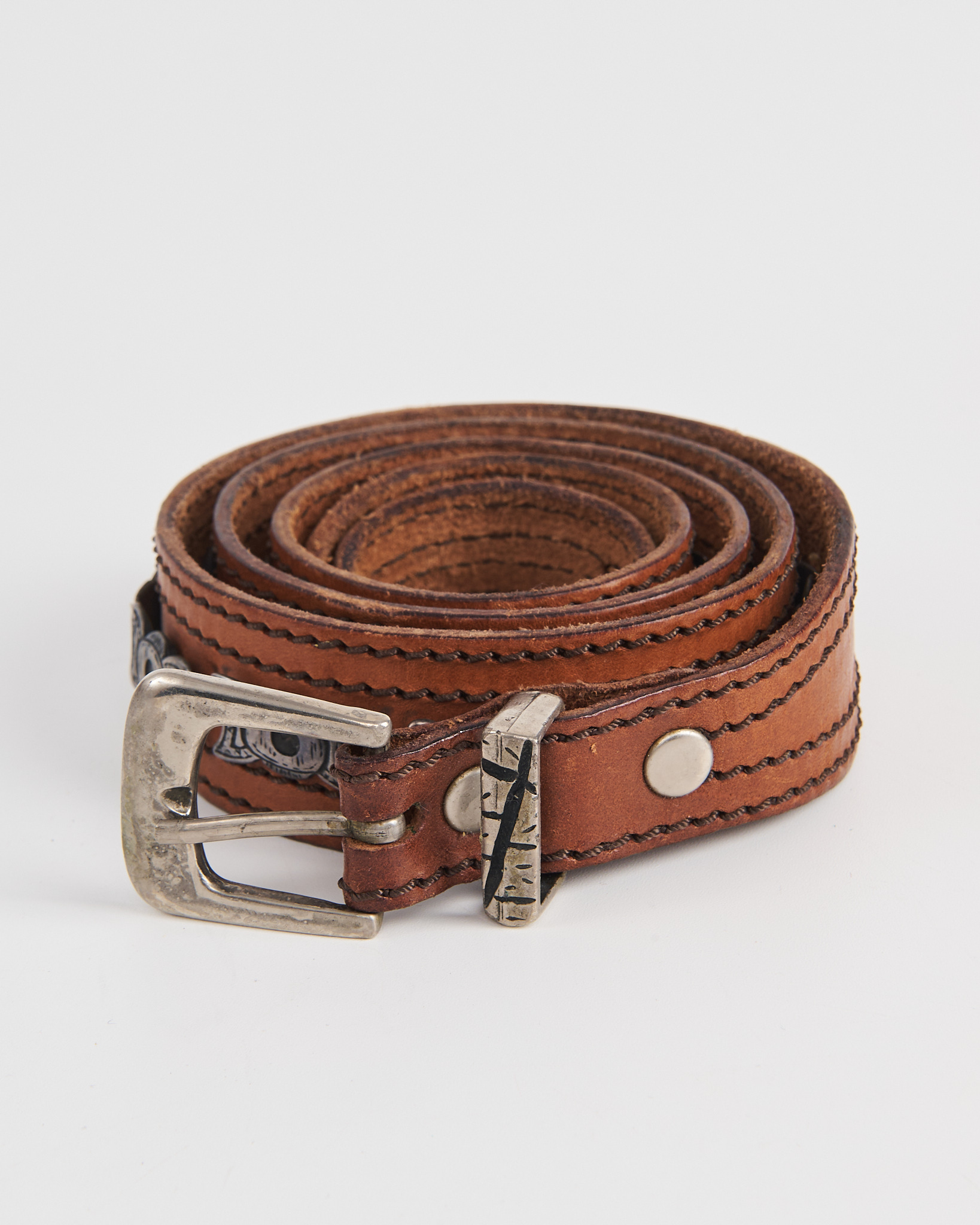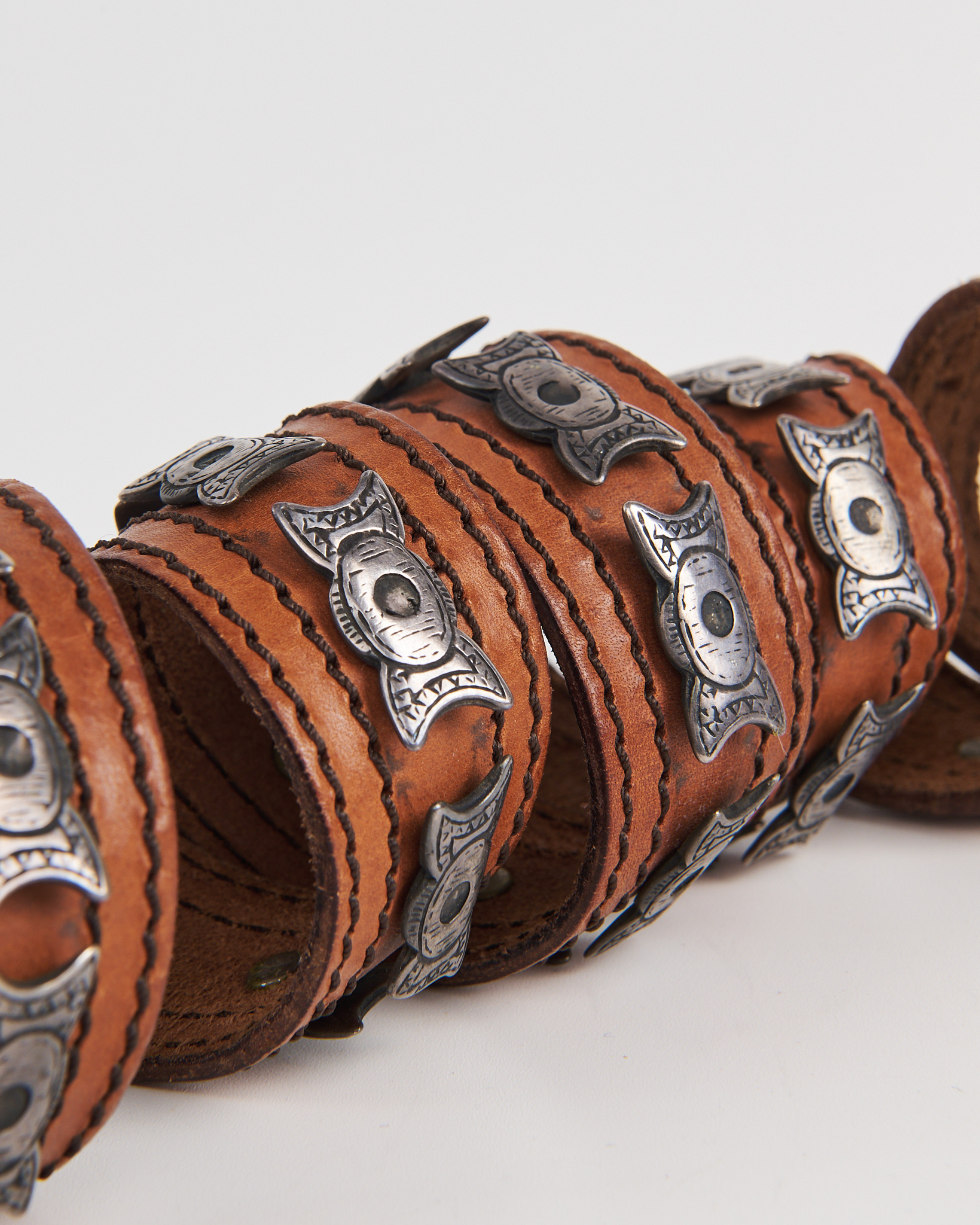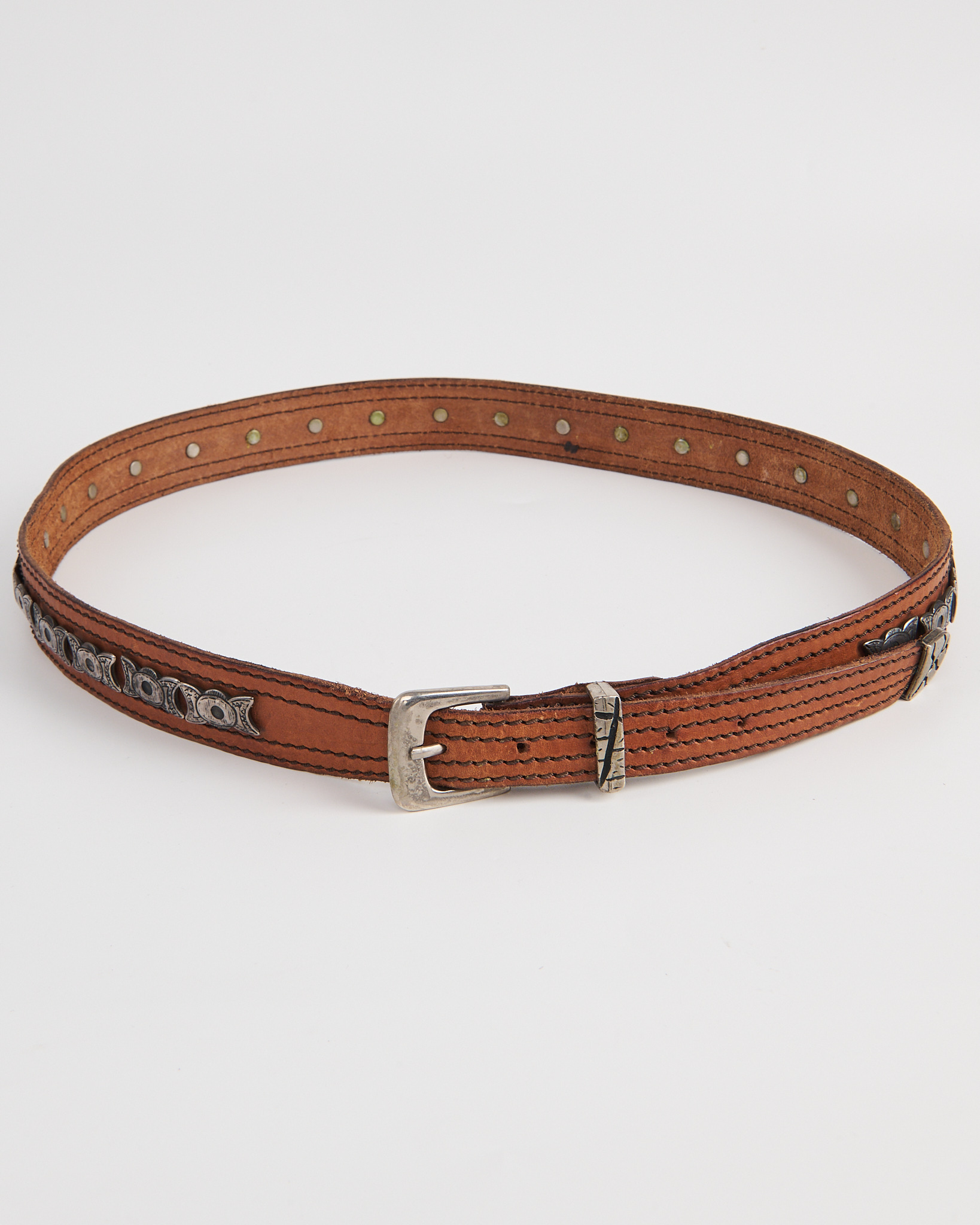 Ремень из плотной натуральной кожи тёплого коричневого оттенка. Посадка регулируемая, ремень уверенно фиксируется и держит форму на талии. Декор в виде металлических вставок и клёпок формирует рисунок по всей длине. Фактурная пряжка и прошивка добавляют акцент.