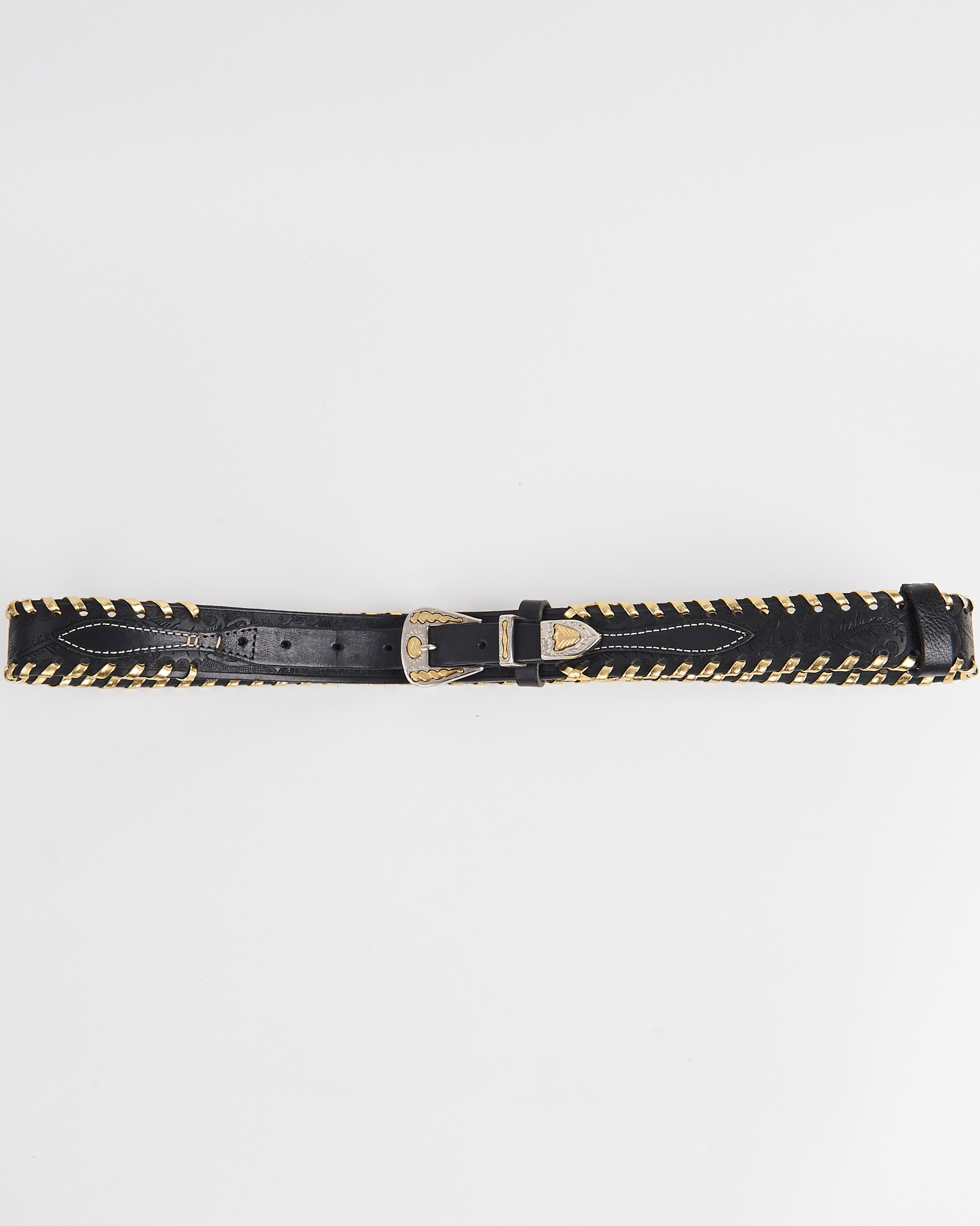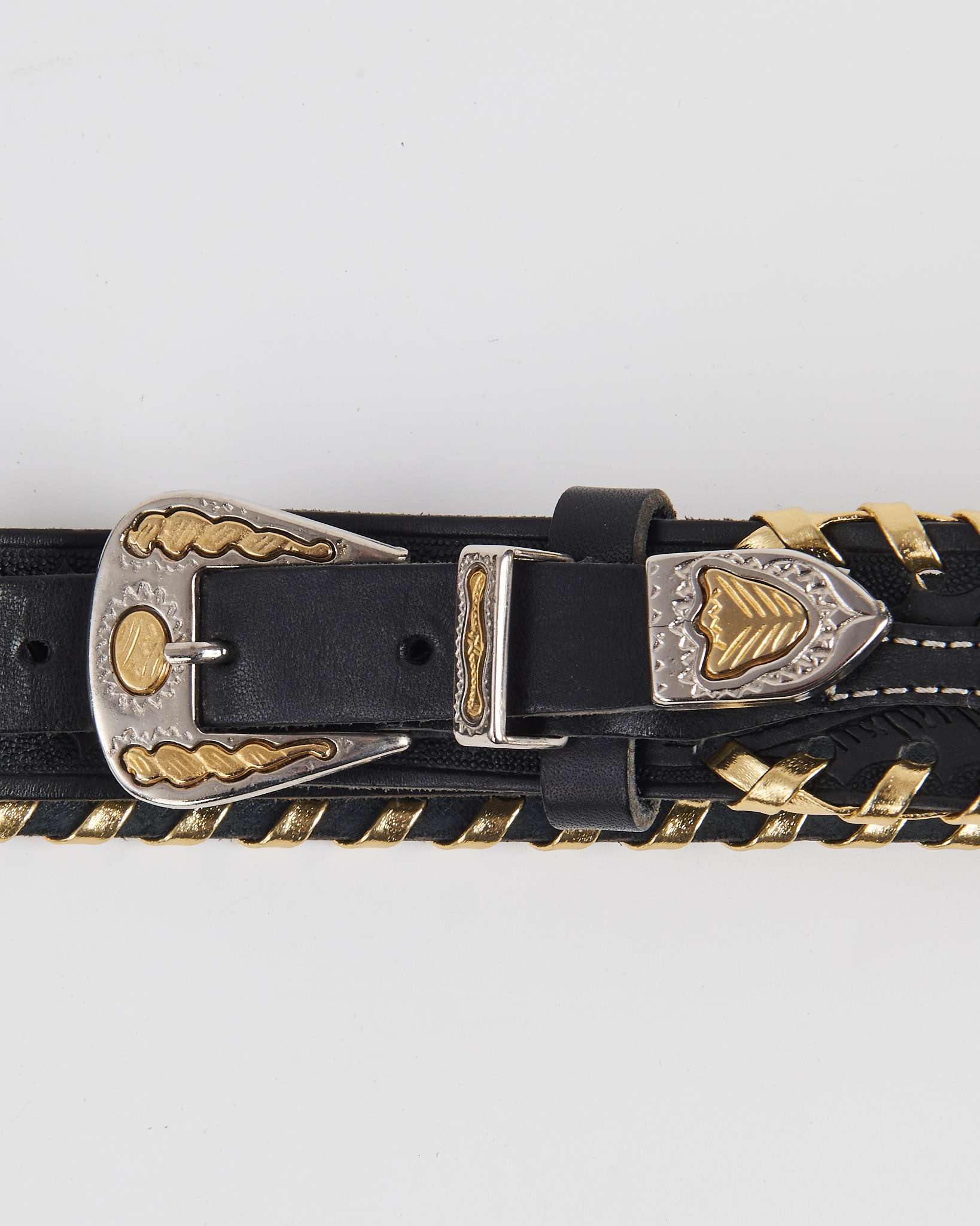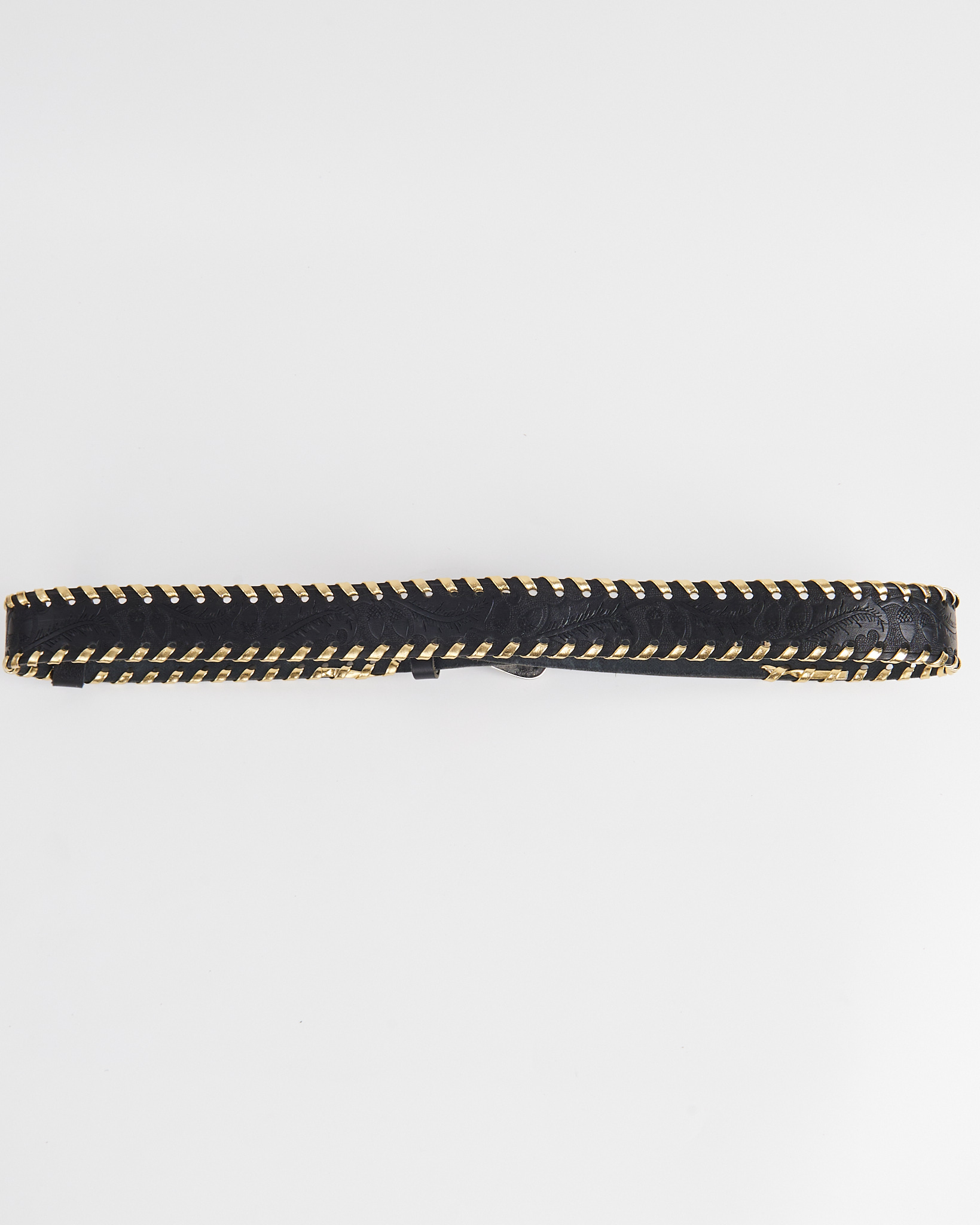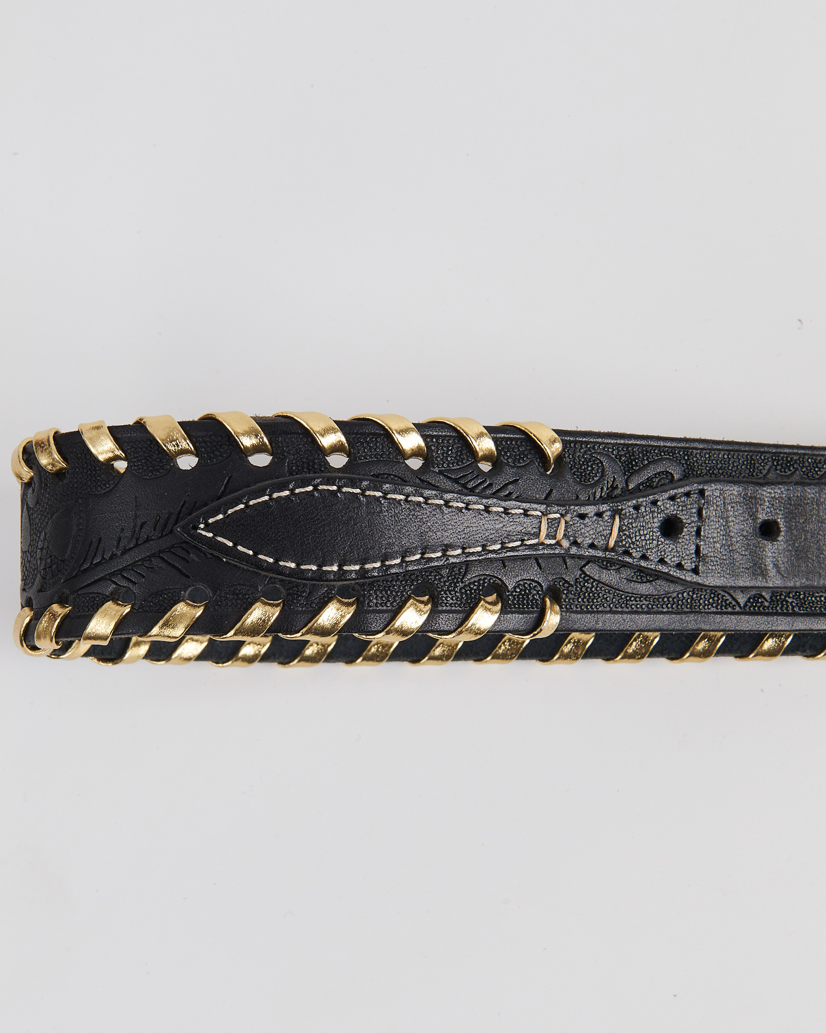 Ремень из плотной кожи. Посадка регулируется, уверенно фиксируется на талии. По краям проходит декоративное плетение с металлическими элементами. Пряжка с контрастной отделкой и тиснение придают акцент.