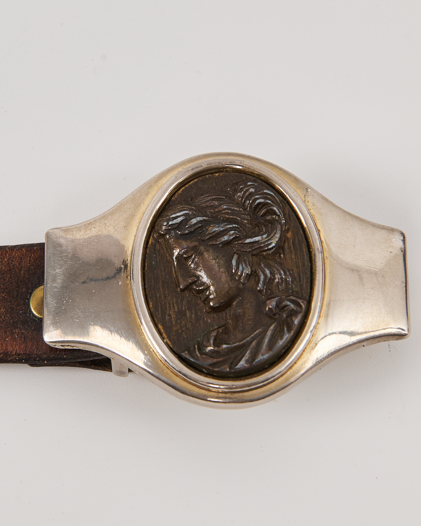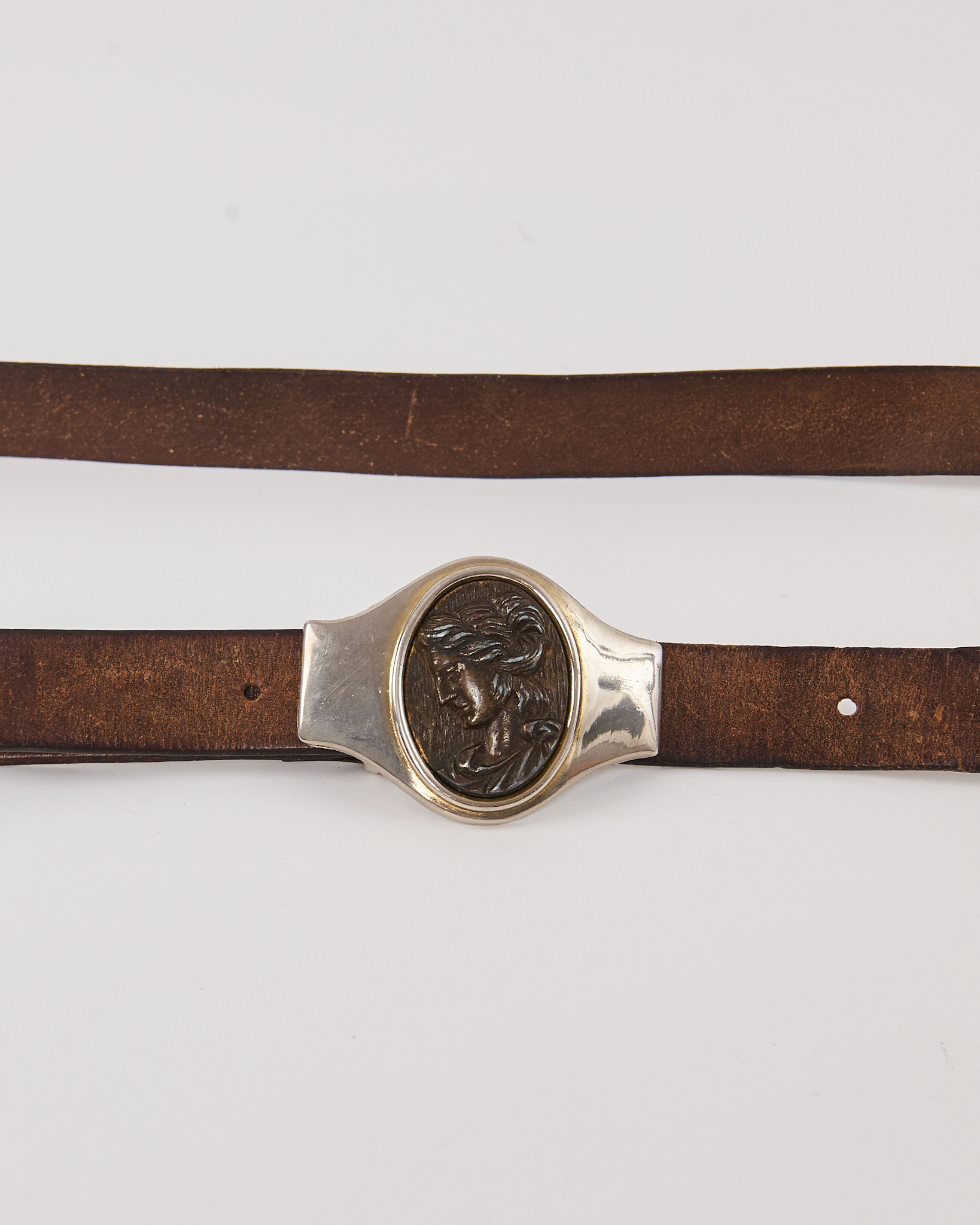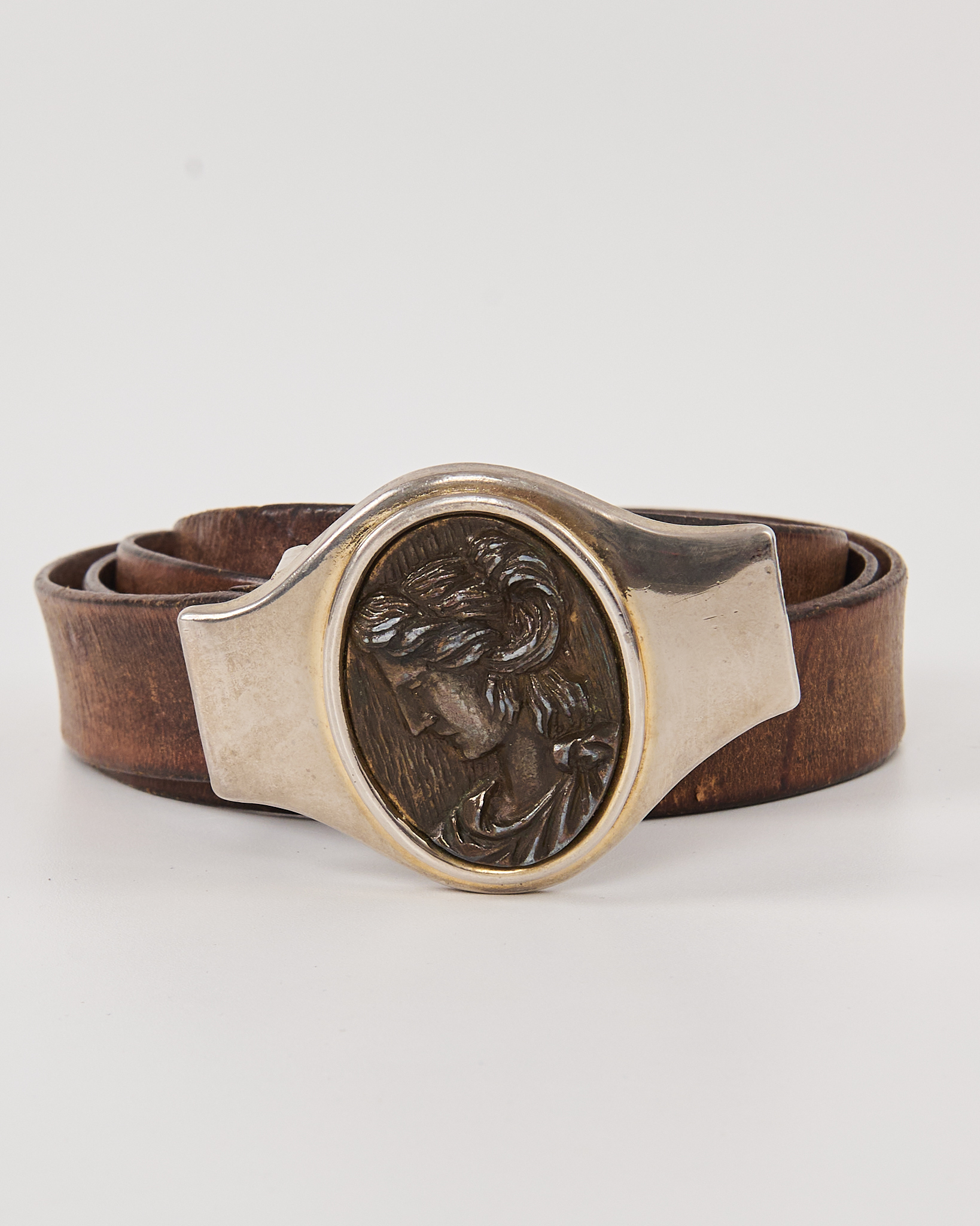 Ремень из натуральной кожи коричневого цвета с мягкими переходами. Крупная металлическая пряжка с овальной вставкой в виде камеи с профильным изображением.