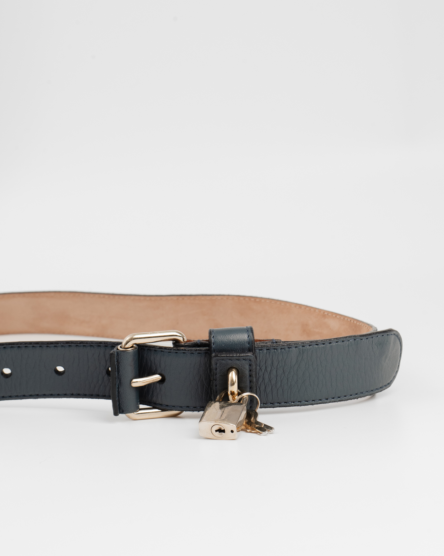 - Фурнитура в золотистом оттенке гармонирует с глубоким графитово-синим цветом кожи