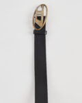 Ремень из плотной 100% натуральной кожи глубокого чёрного цвета. Широкая форма уверенно фиксируется на талии и создаёт чёткую посадку. Центральный акцент — крупная металлическая пряжка овальной формы с графичным элементом. Металл с выраженной патиной.