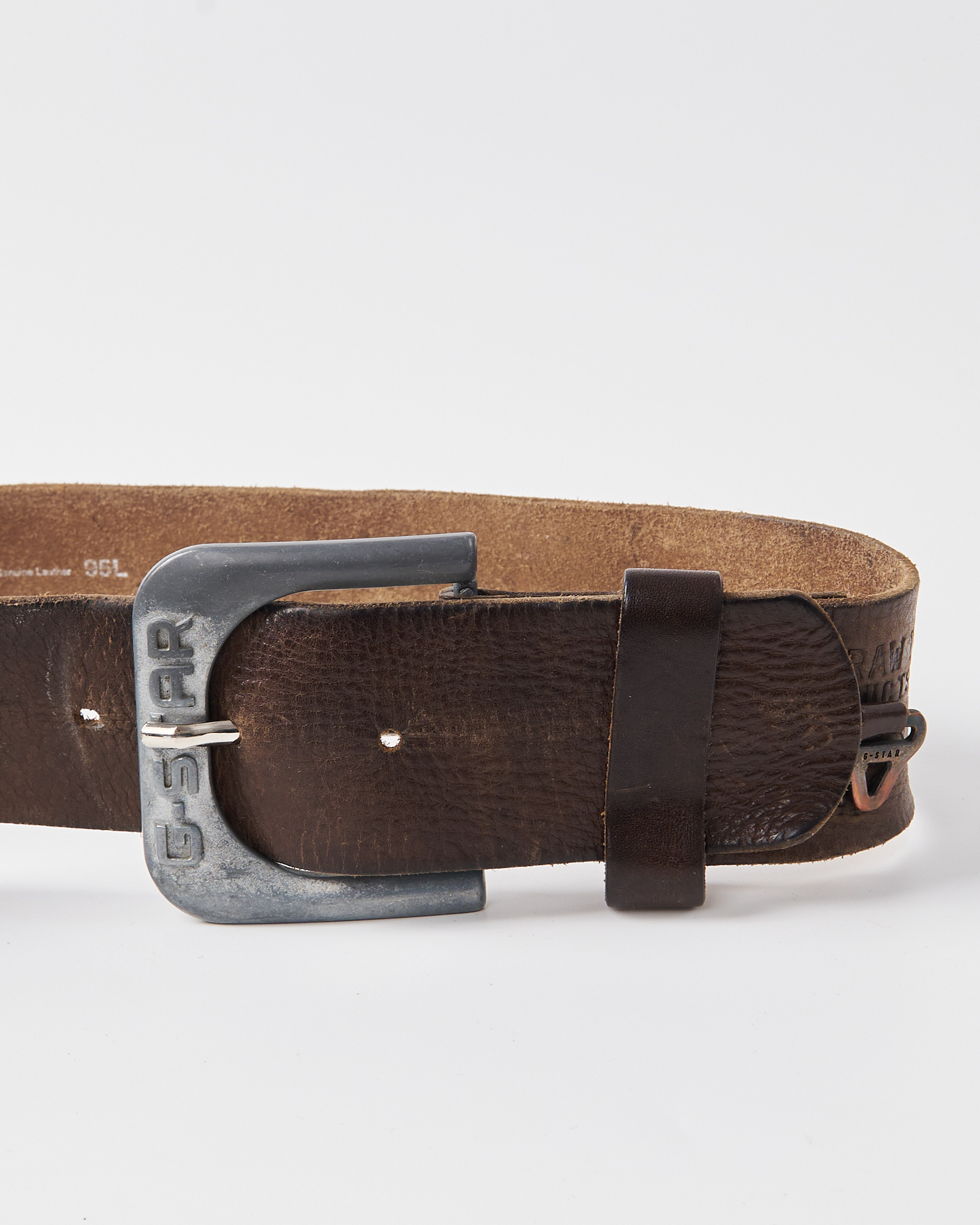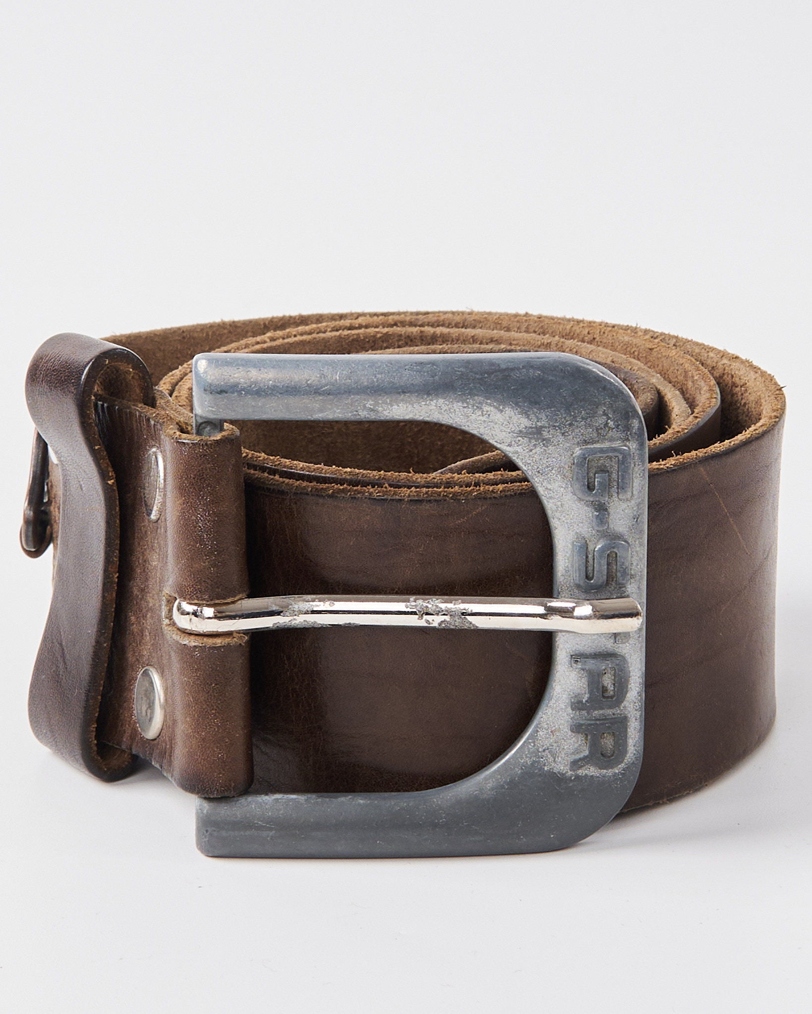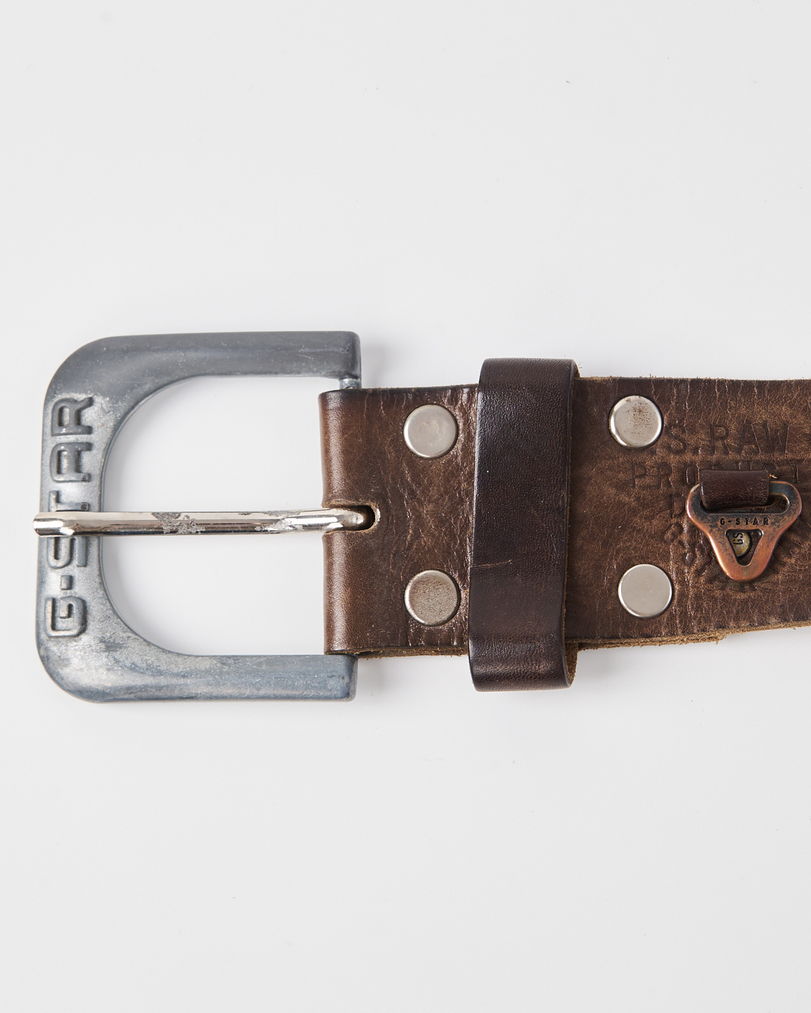 Кожаный ремень в коричневом оттенке от G-Star. Пряжка массивная, с выгравированным названием бренда. Рядом с пряжкой заклепан треугольный элемент с гравировкой, предназначенный для крепления дополнительных аксессуаров.