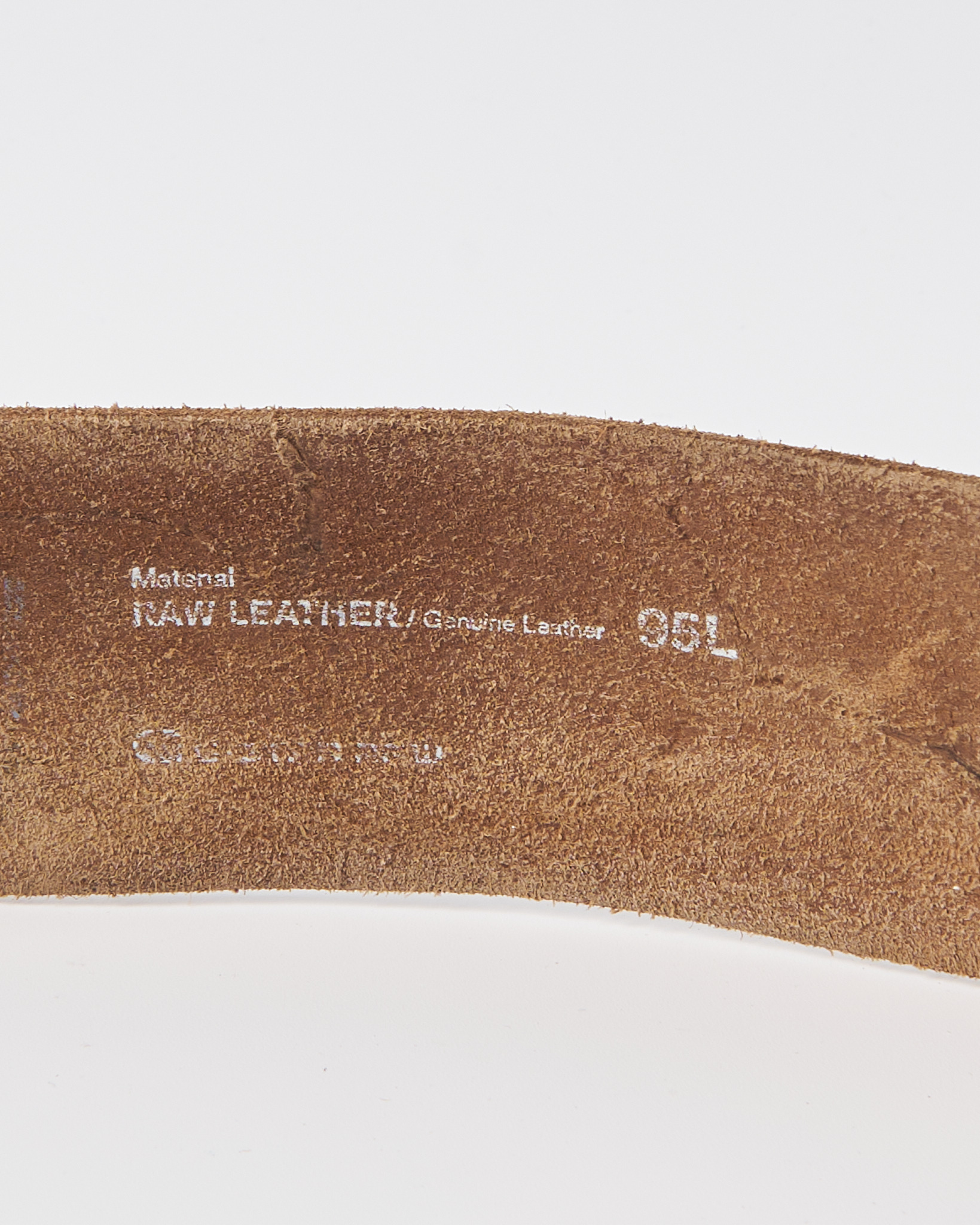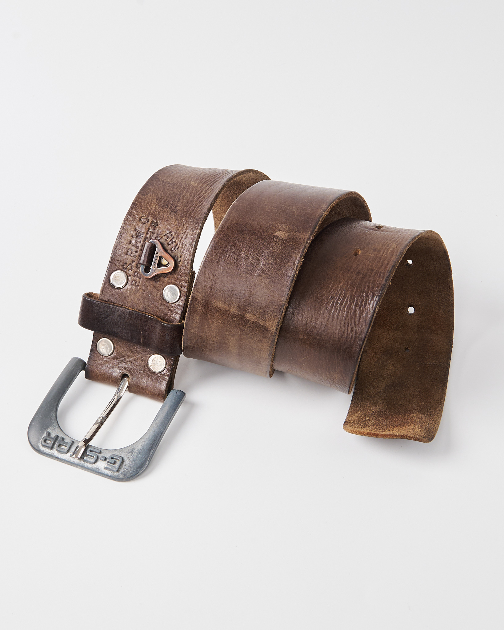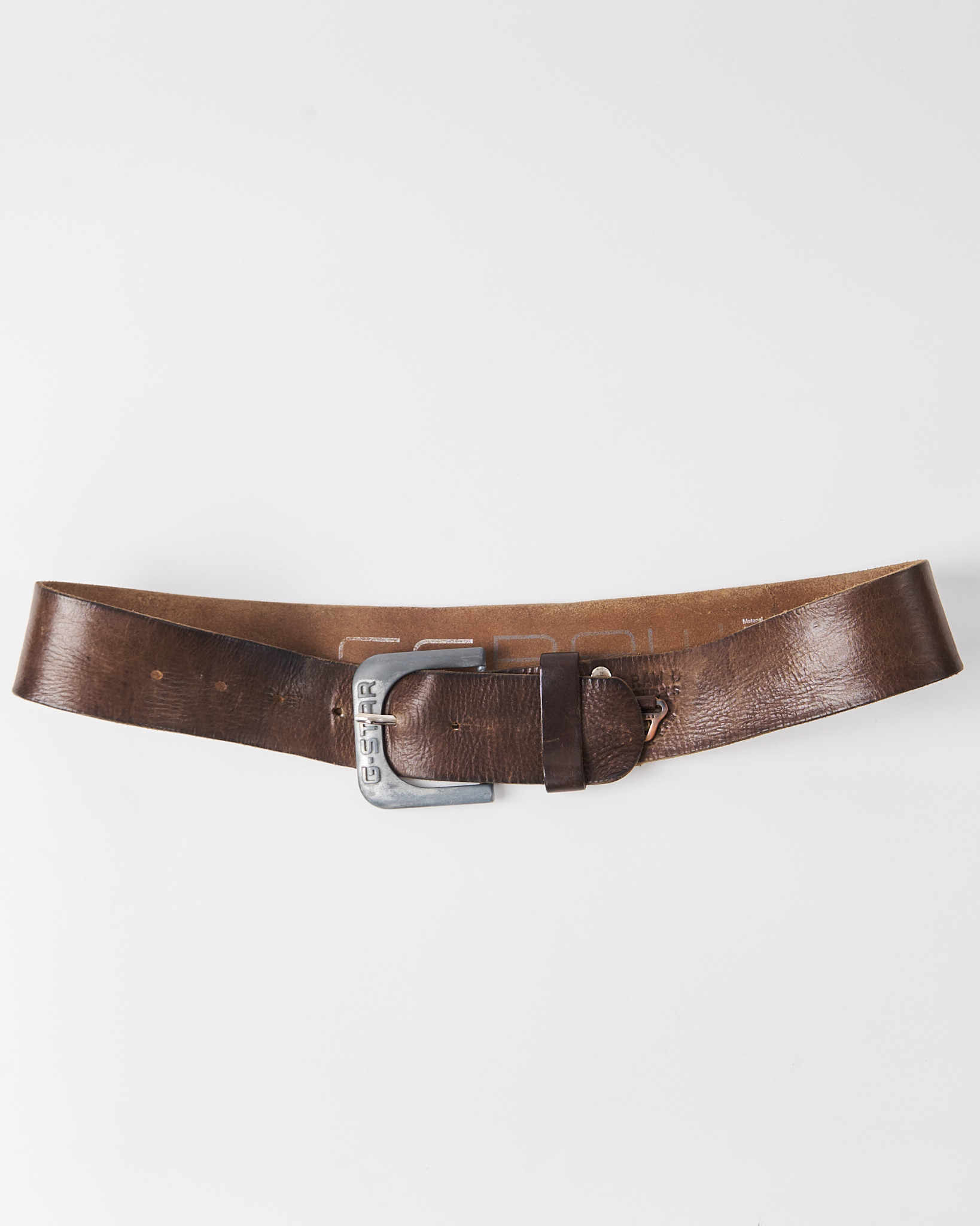 Кожаный ремень в коричневом оттенке от G-Star. Пряжка массивная, с выгравированным названием бренда. Рядом с пряжкой заклепан треугольный элемент с гравировкой, предназначенный для крепления дополнительных аксессуаров.