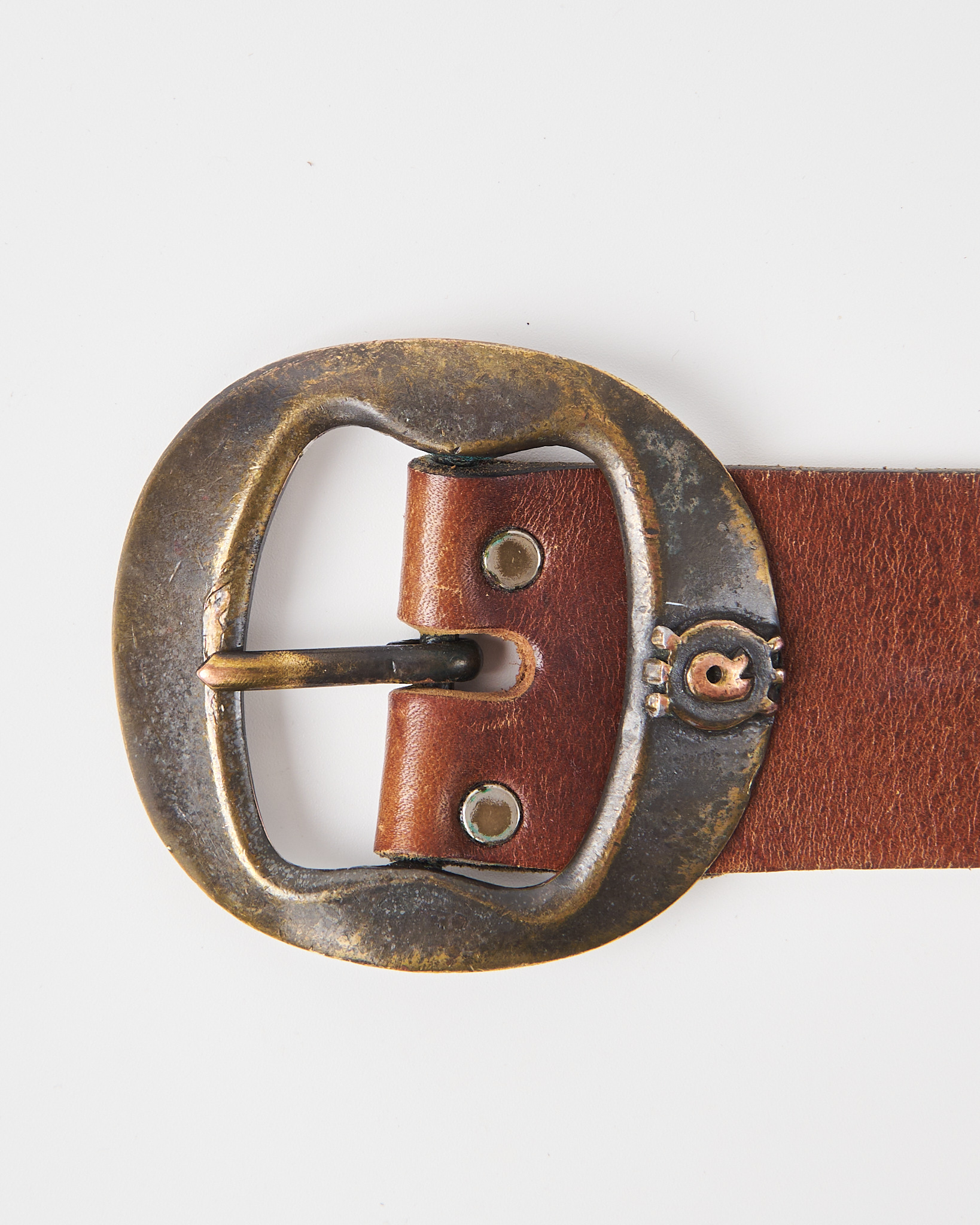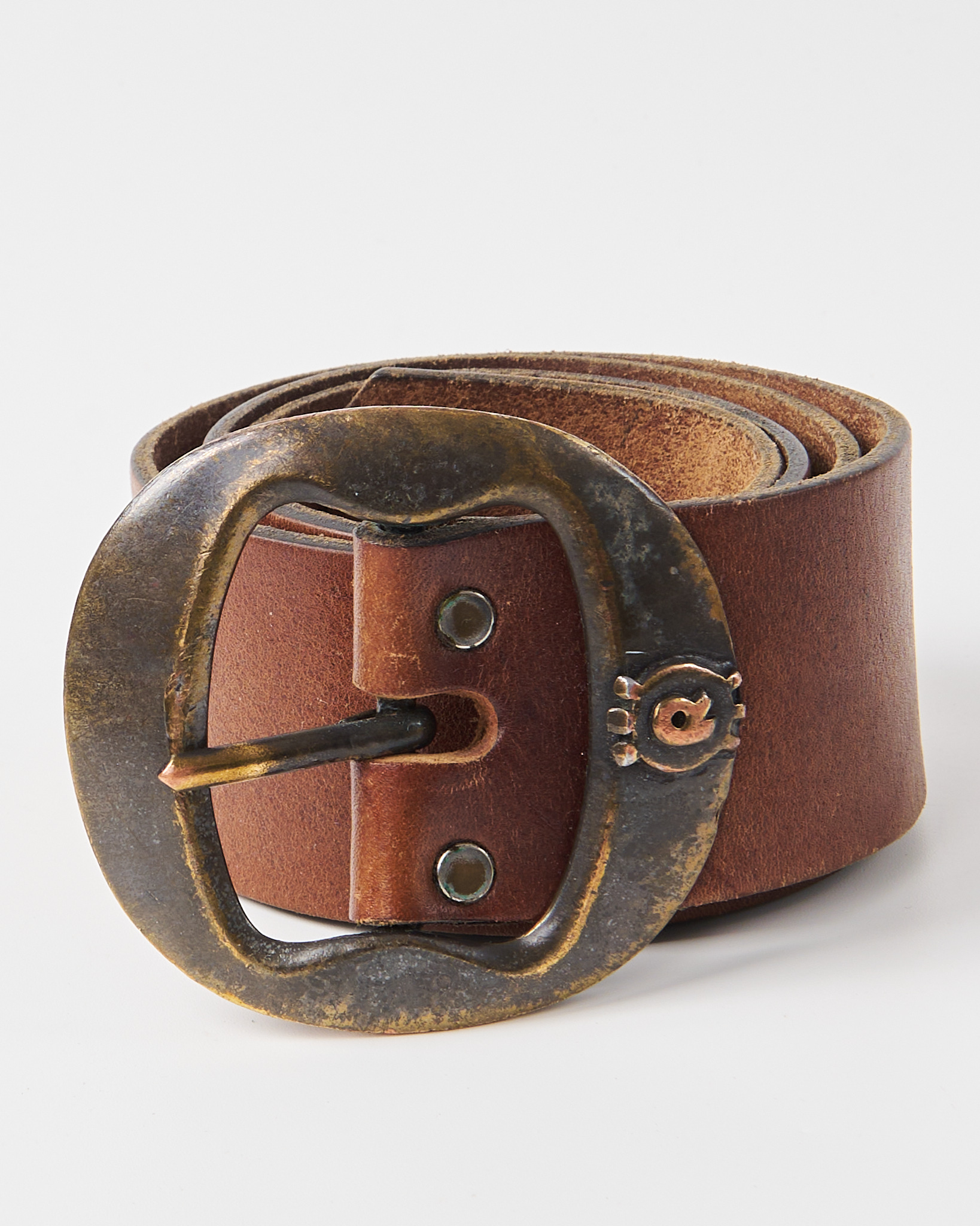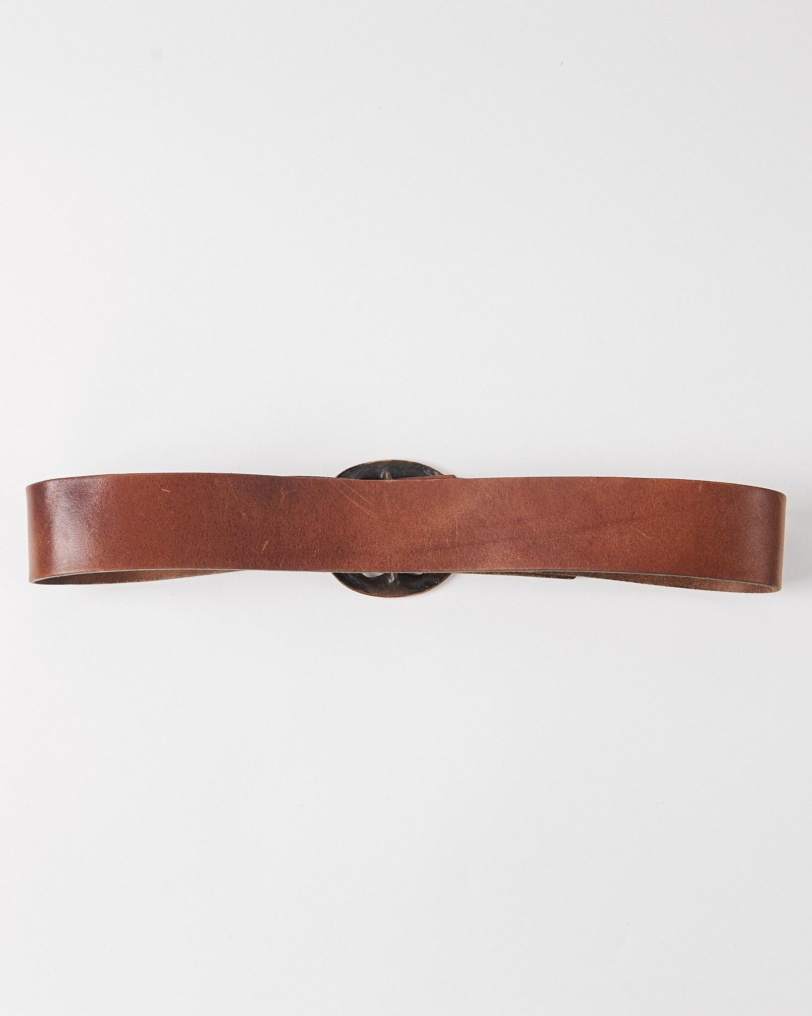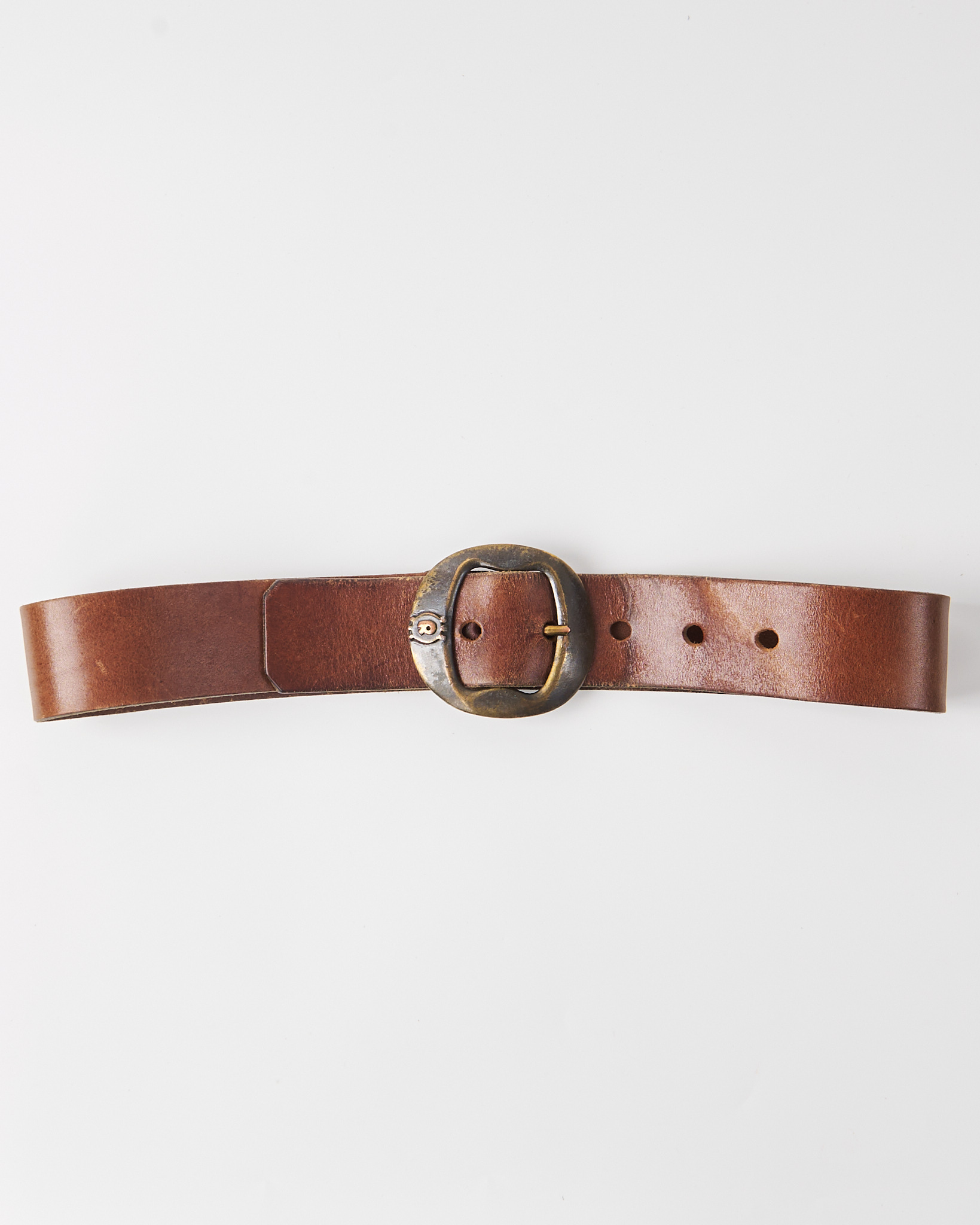 Ремень из плотной натуральной кожи Joel Ronez Paris. Посадка регулируется, акцентная крупная металлическая пряжка с патиной.