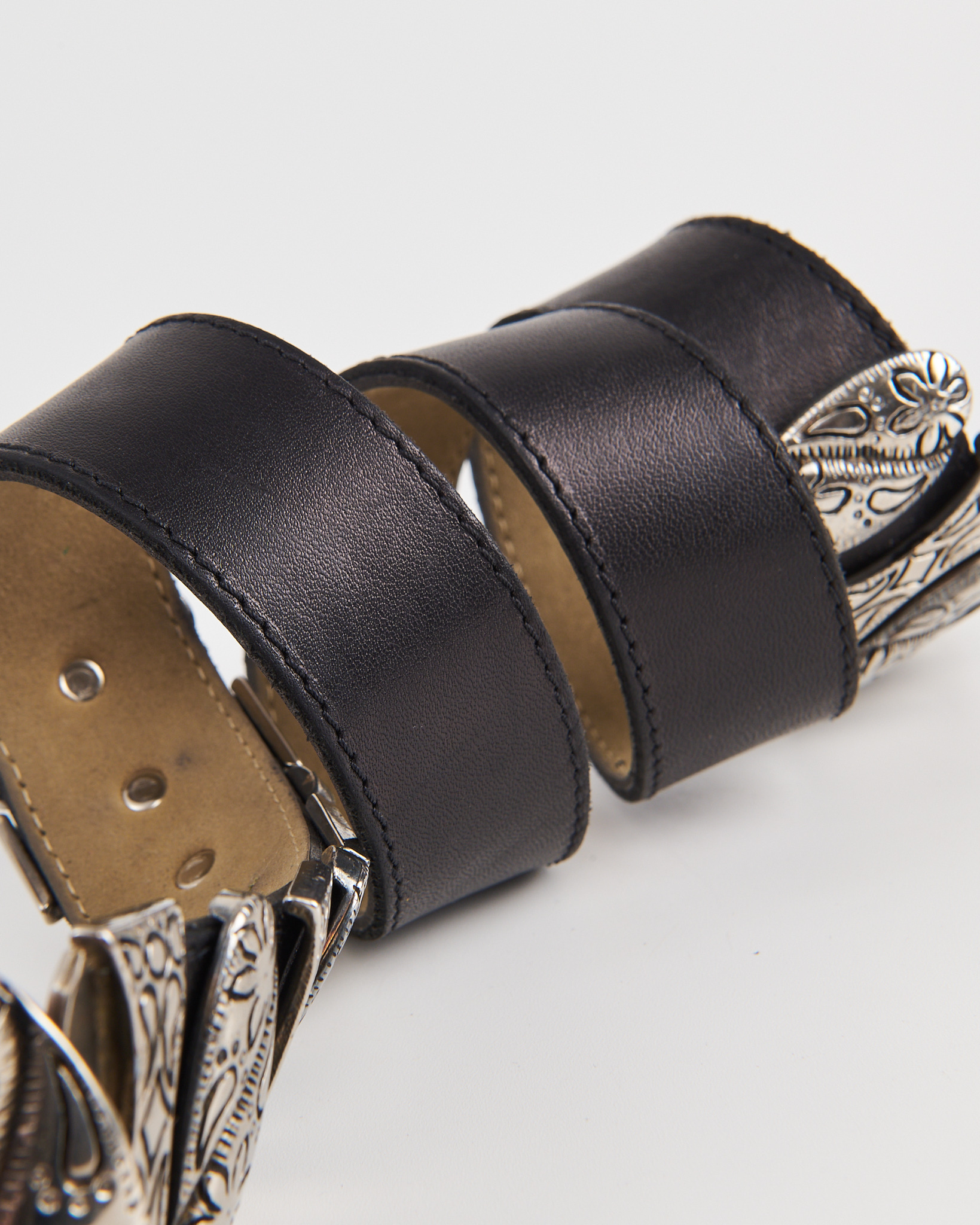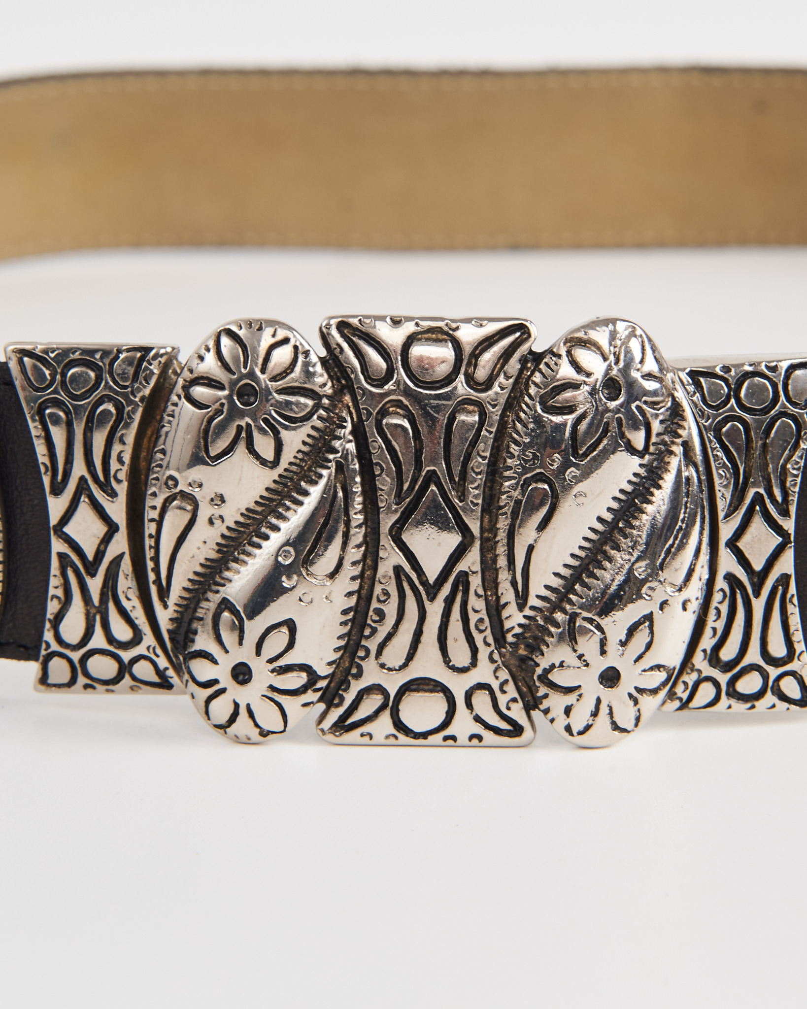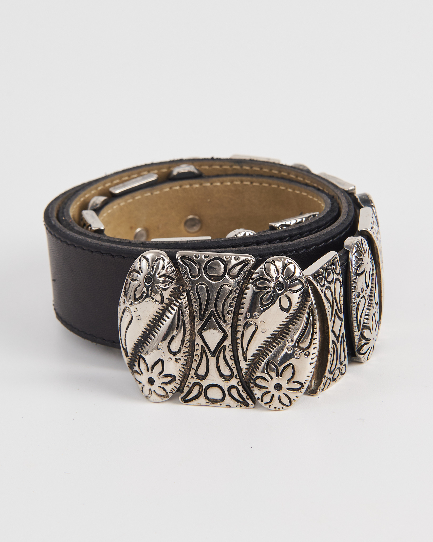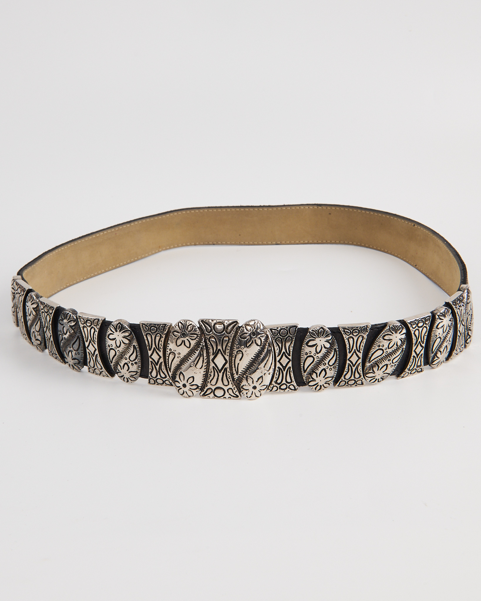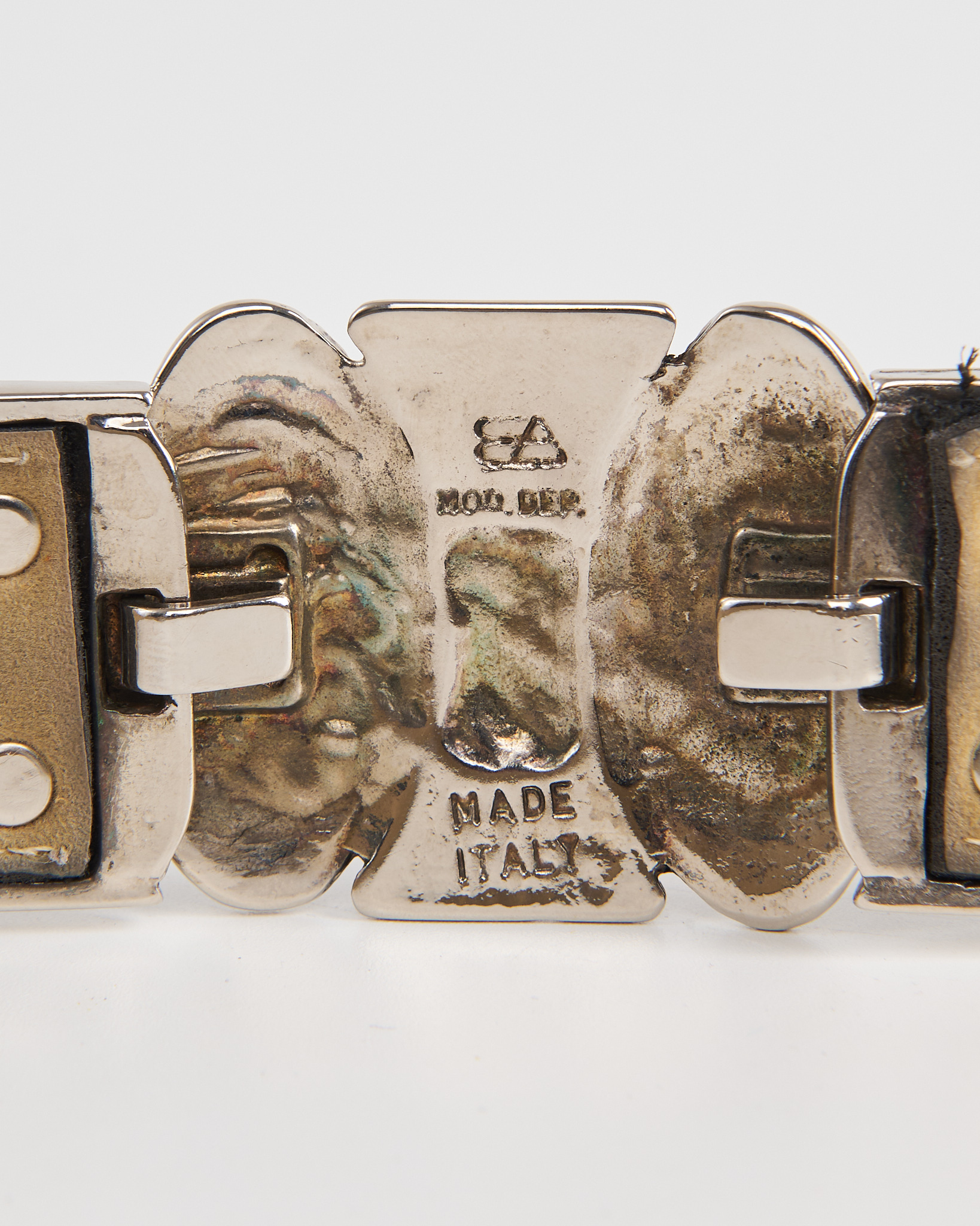 Ремень из натуральной кожи с металлическими декоративными сегментами. Посадка регулируется, ремень плотно фиксируется за счёт скрытой застёжки. Фактурные элементы с рельефным орнаментом придают выразительный акцент. Итальянское качество, о чём говорит маркировка на изнанке.