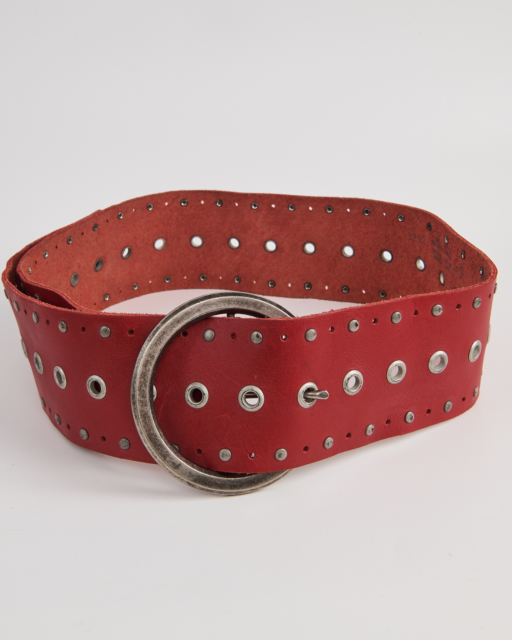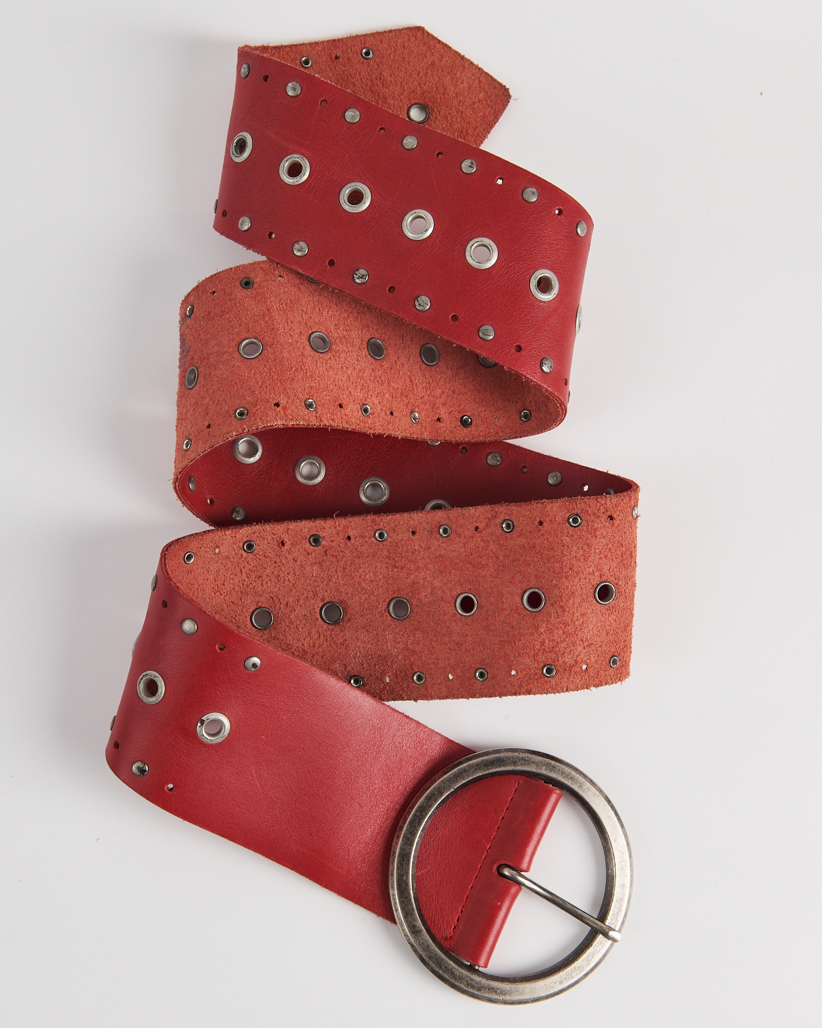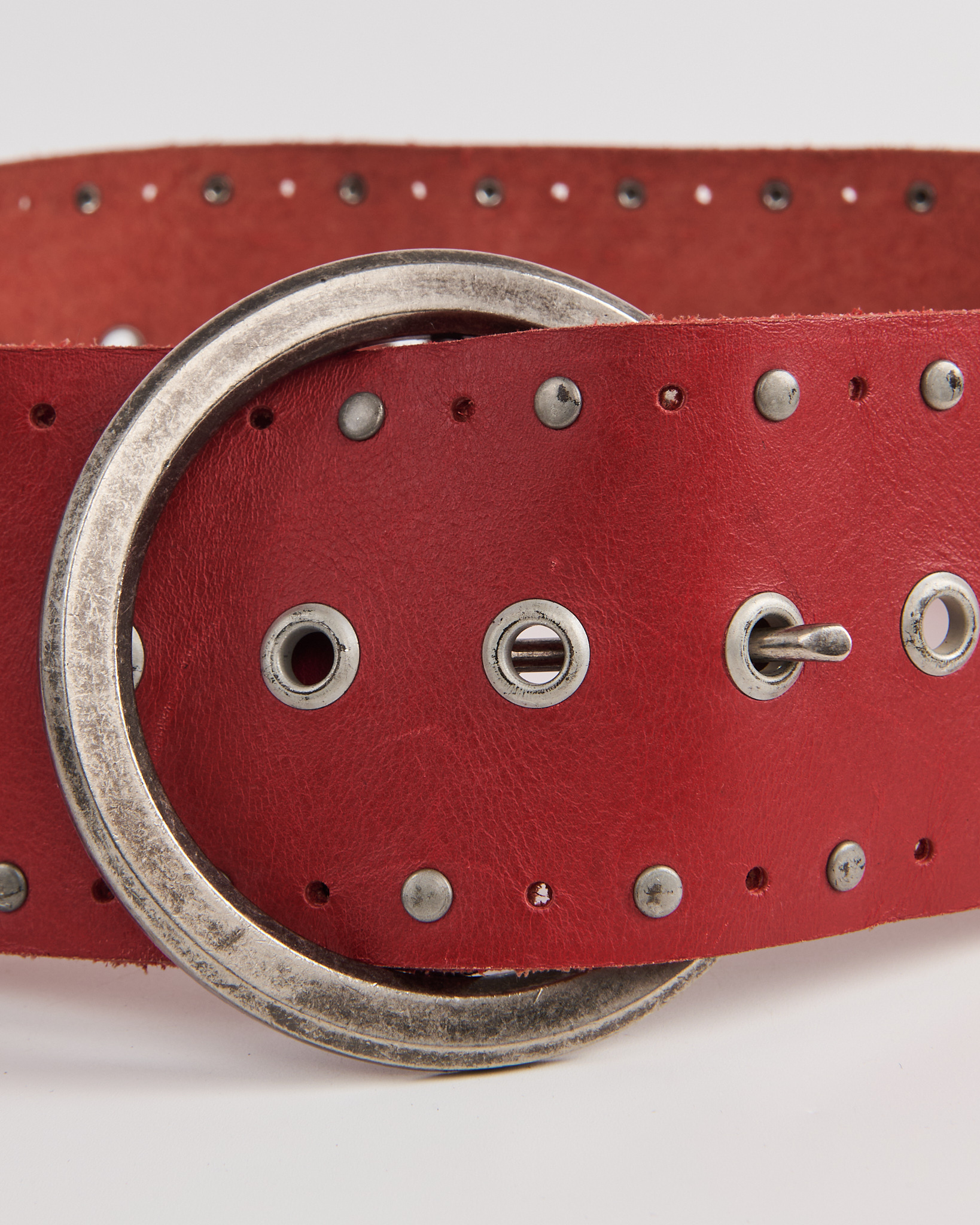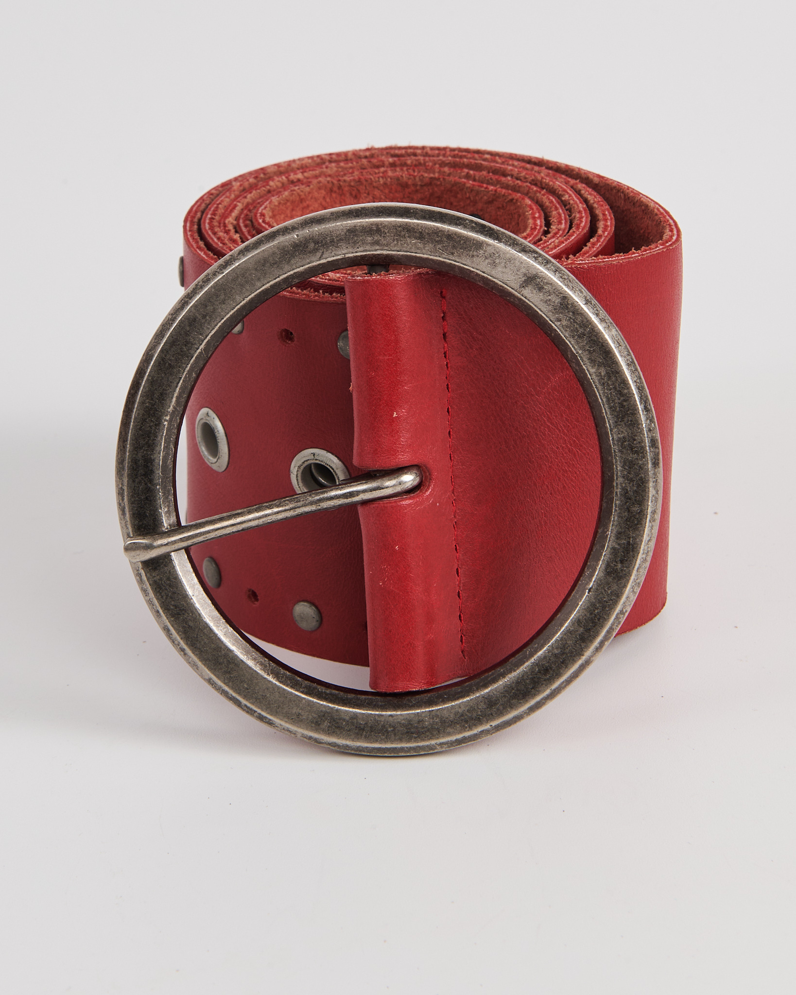 Ремень из натуральной кожи насыщенного красного цвета с крупной круглой пряжкой. Посадка регулируется, ремень плотно фиксируется и уверенно держится на талии. Металлические люверсы и заклёпки и массивная крупная пряжка.