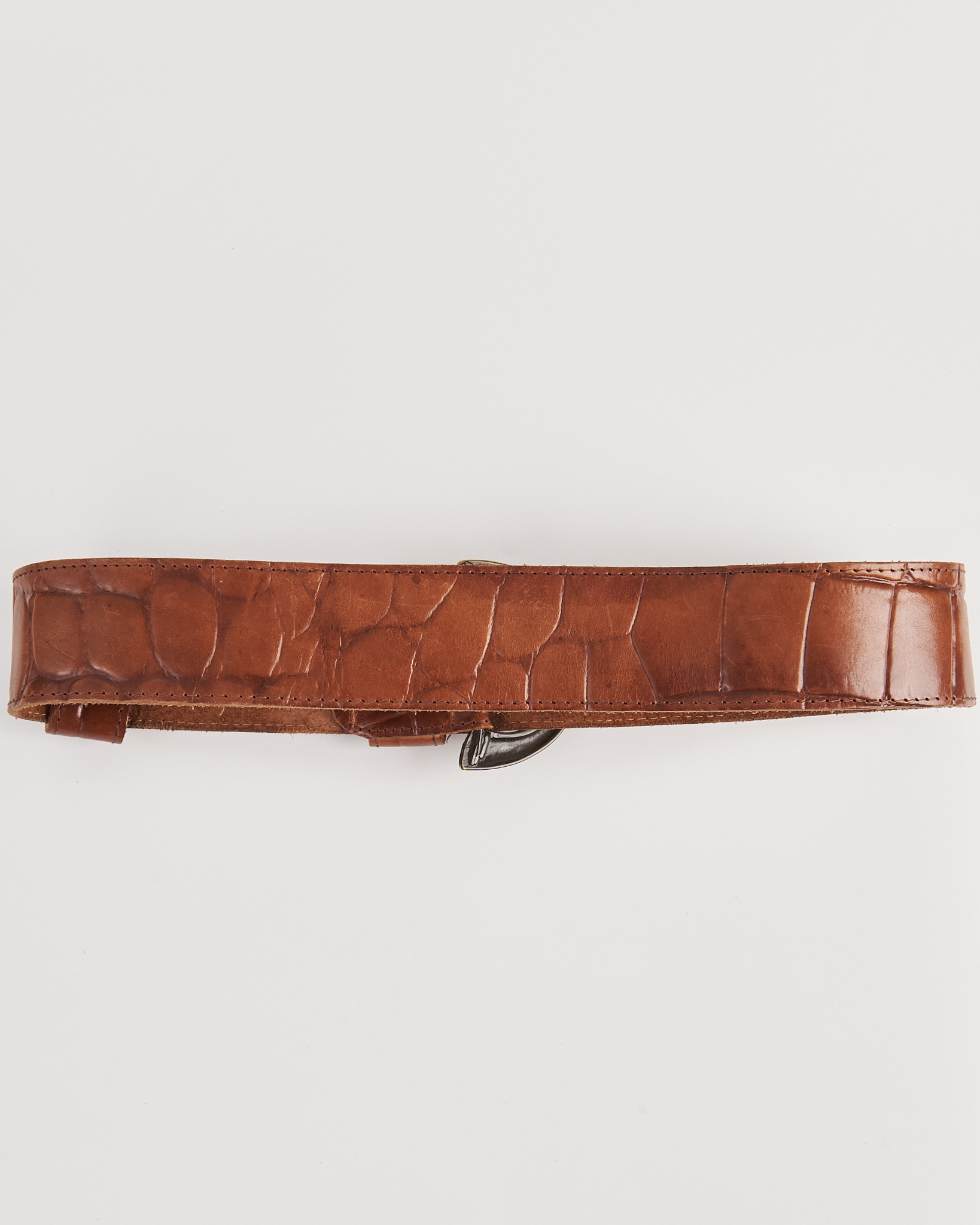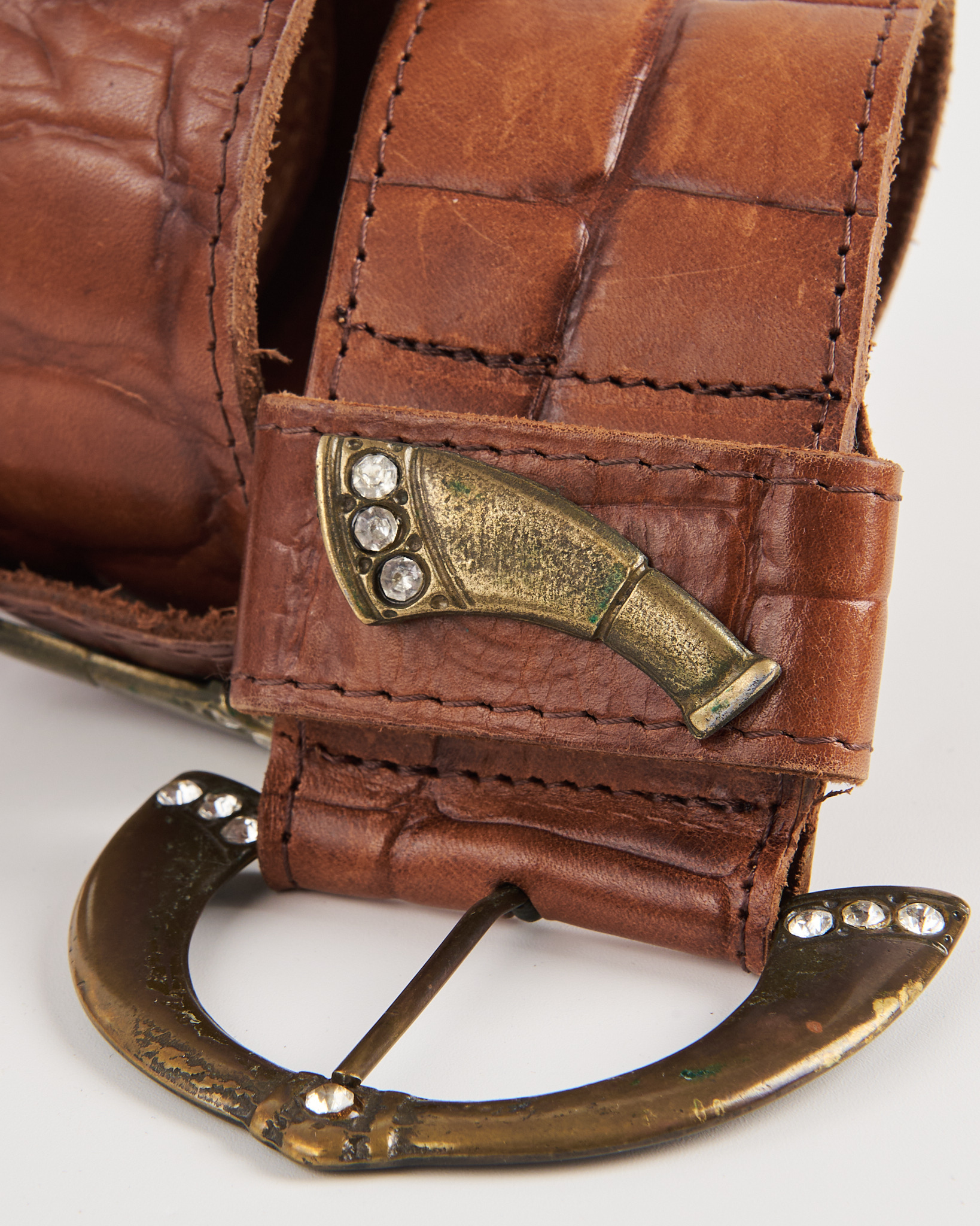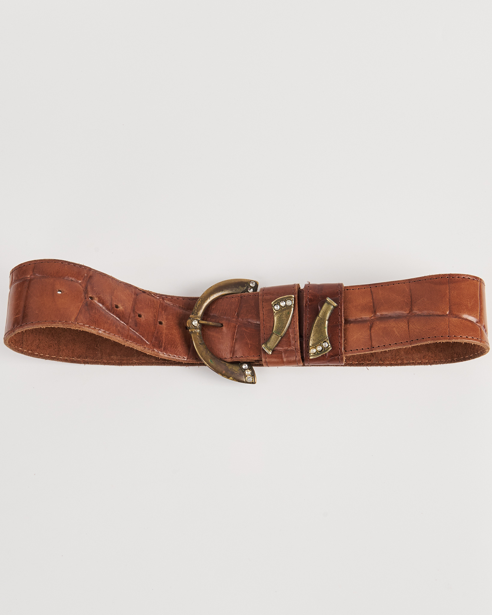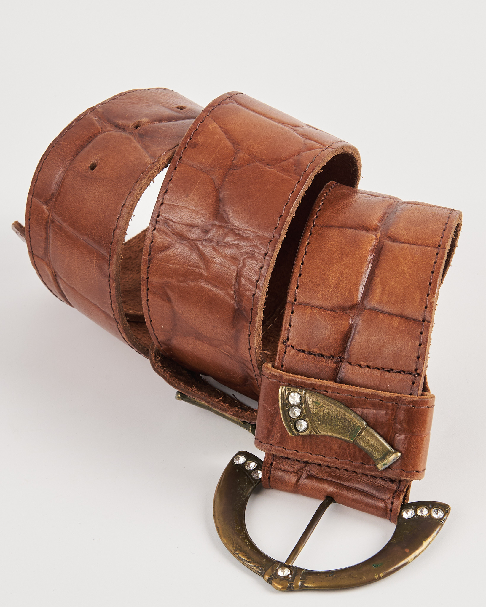Ремень из натуральной кожи с выразительным тиснением под крокодила. Выполнен в тёплом коричневом оттенке с естественной патиной и мягкими заломами. Широкий формат с акцентной полукруглой пряжкой из состаренного металла и декоративными вставками со стразами. Дополнен декоративными элементами на шлёвке