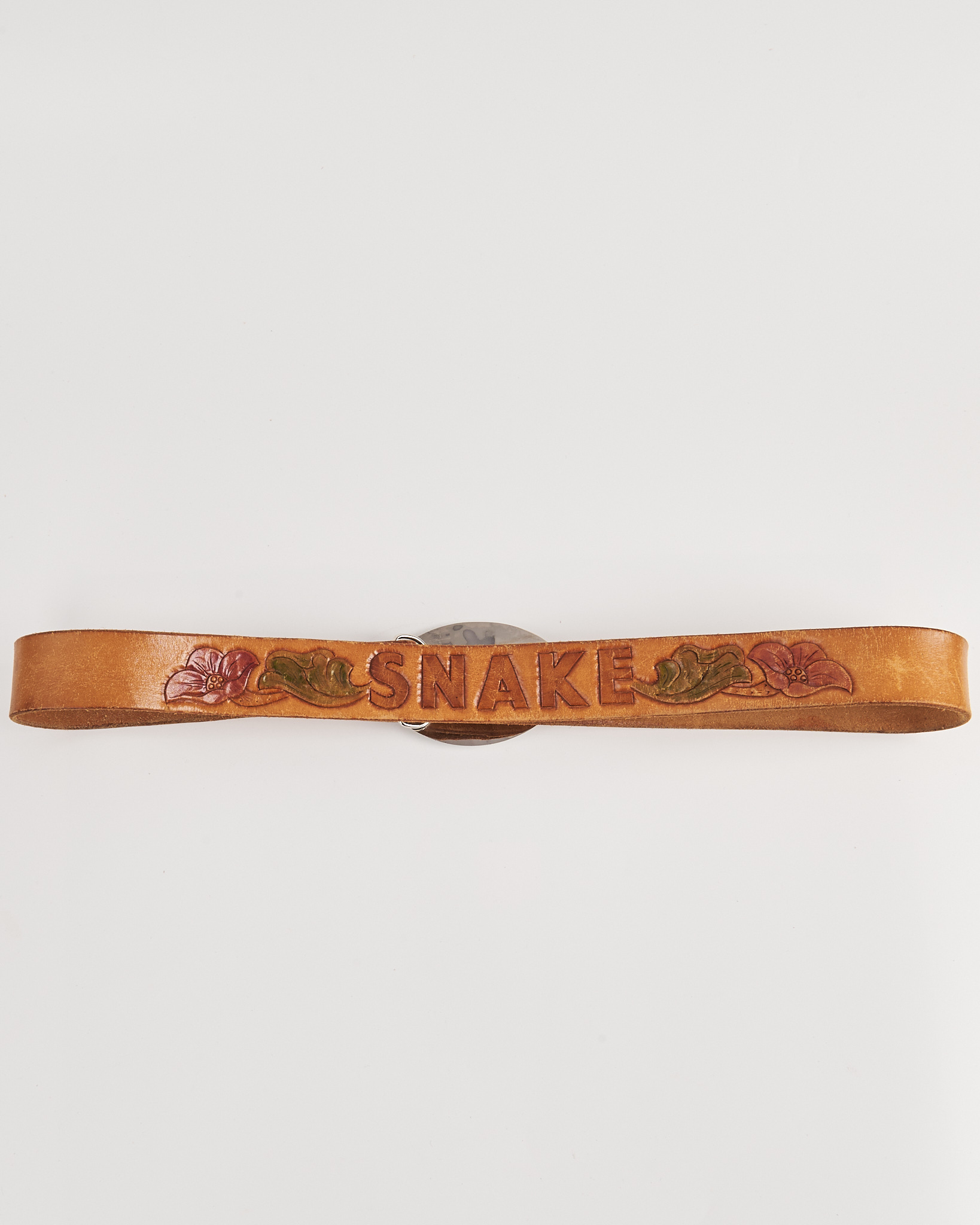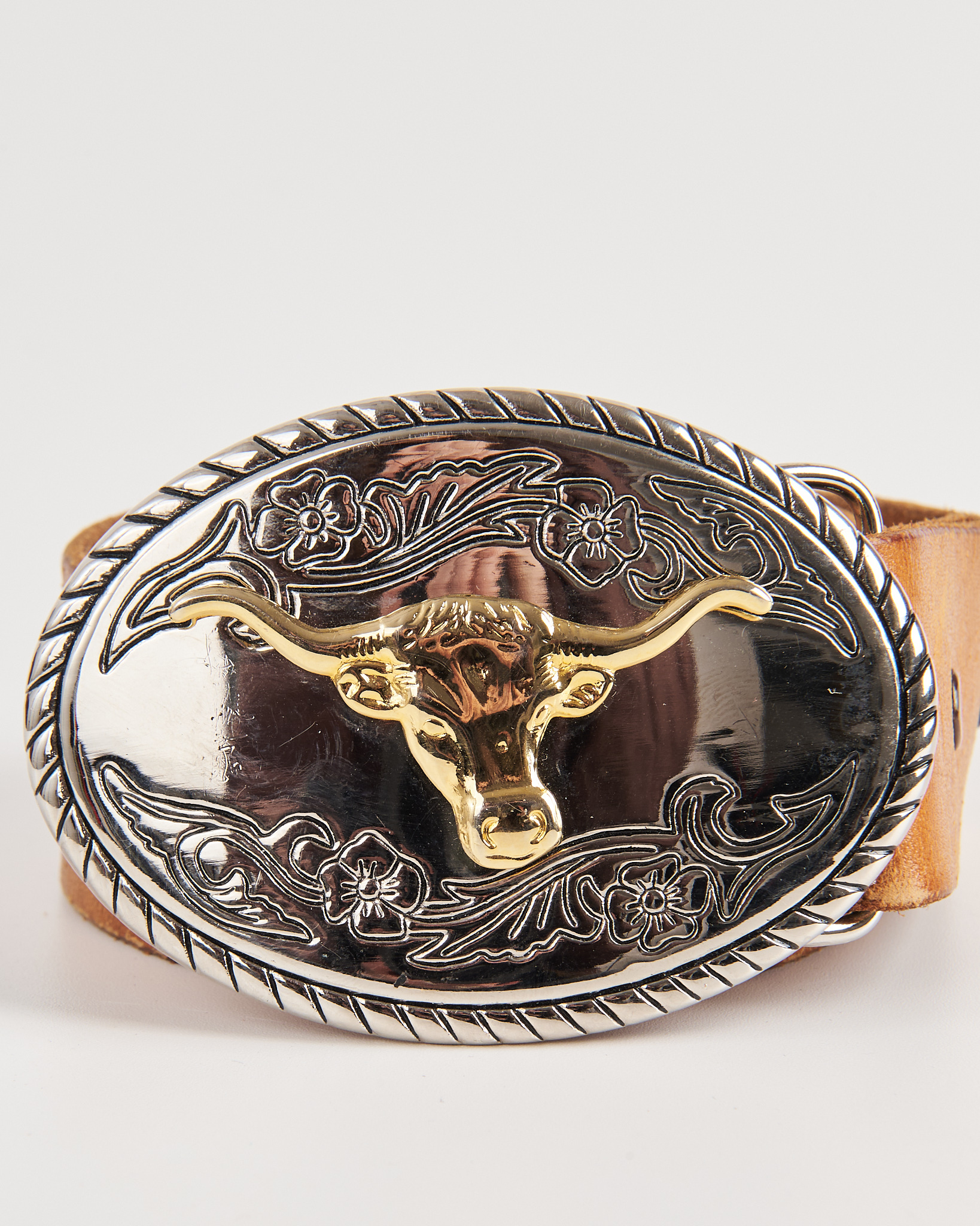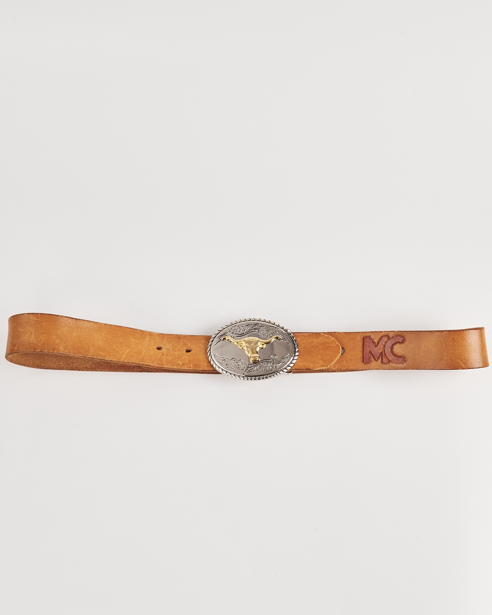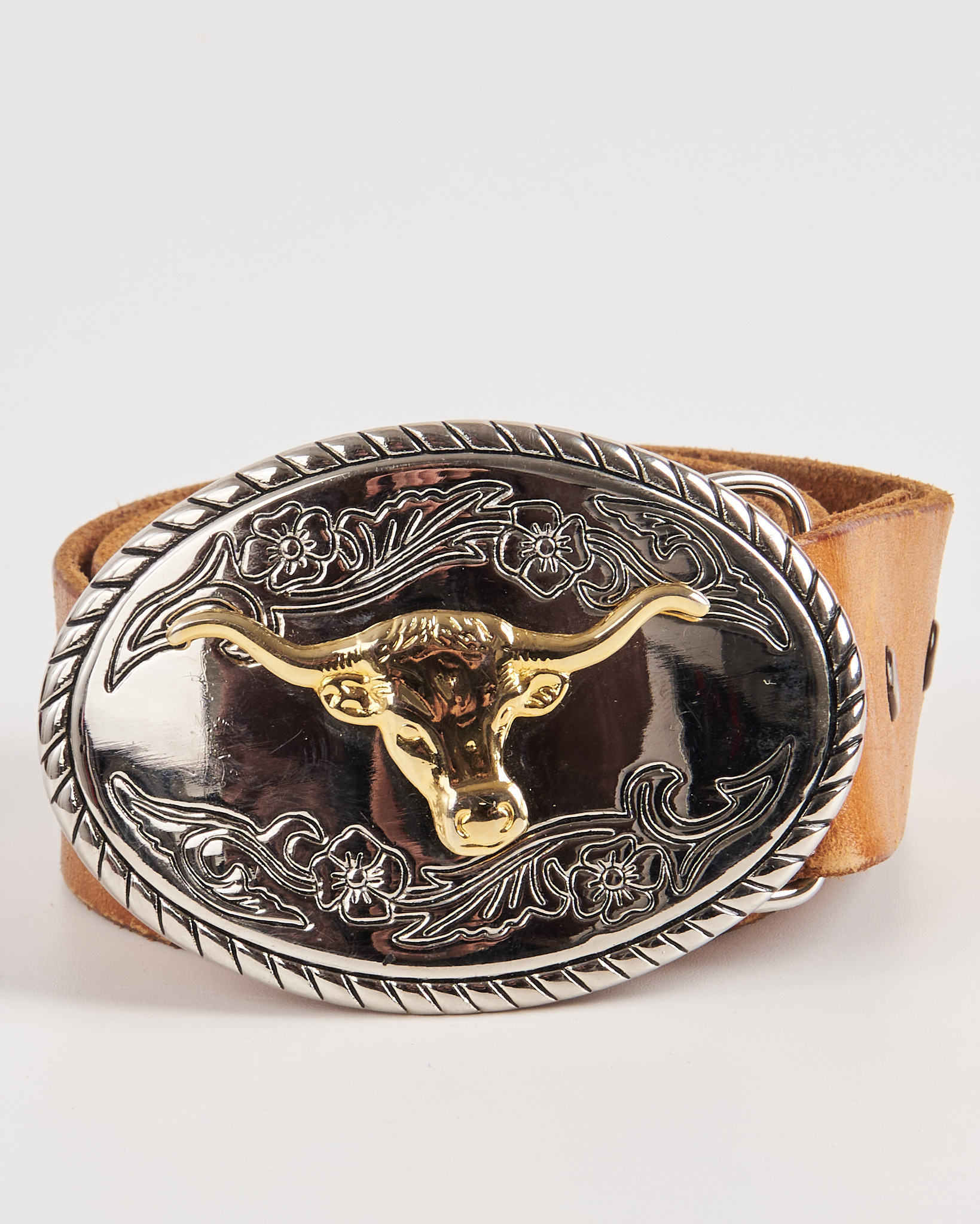 Ремень из натуральной кожи светлого оттенка. Посадка регулируется, ремень хорошо фиксируется и держит форму. Овальная пряжка с рельефным орнаментом и головой быка придает акцент. Тиснение с надписью и цветочным мотивом.