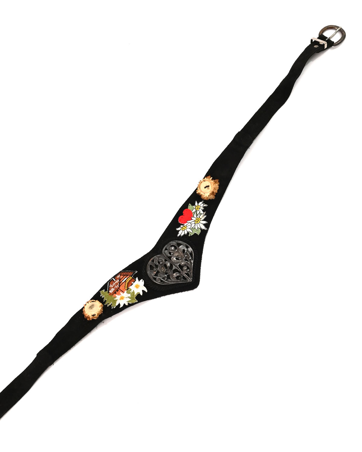 - Декорирован вышивкой в виде альпийских цветов, металлическим сердцем с орнаментом и декоративными пуговицами из дерева
