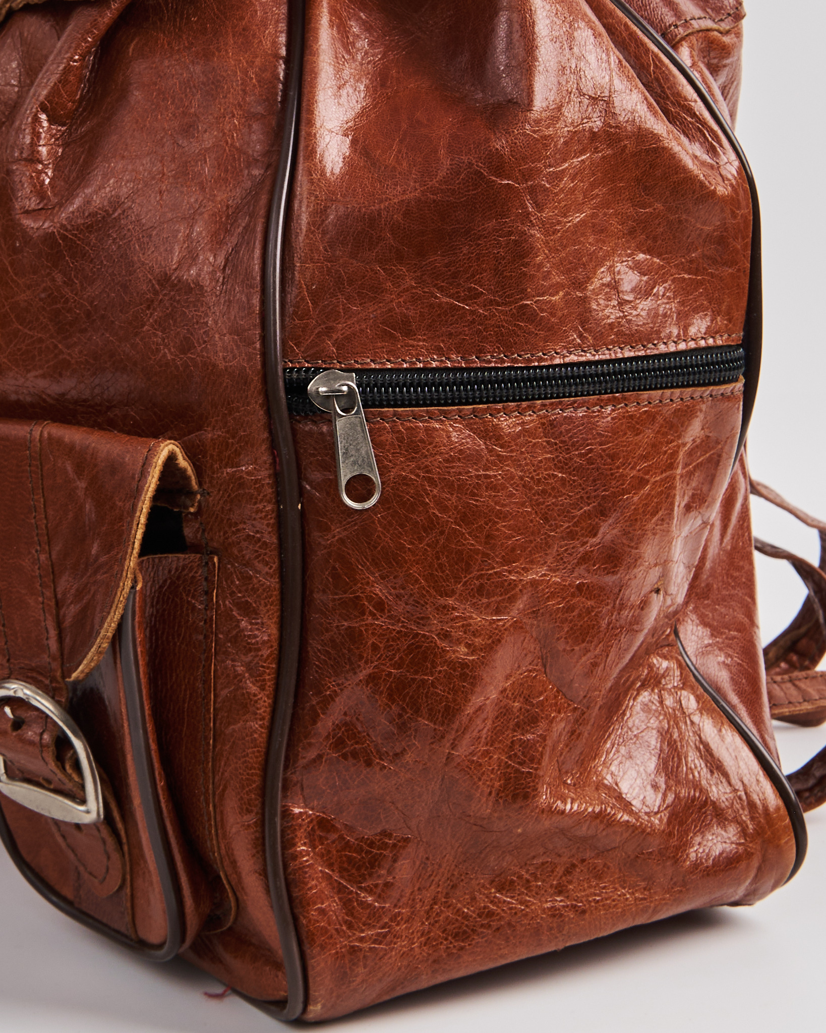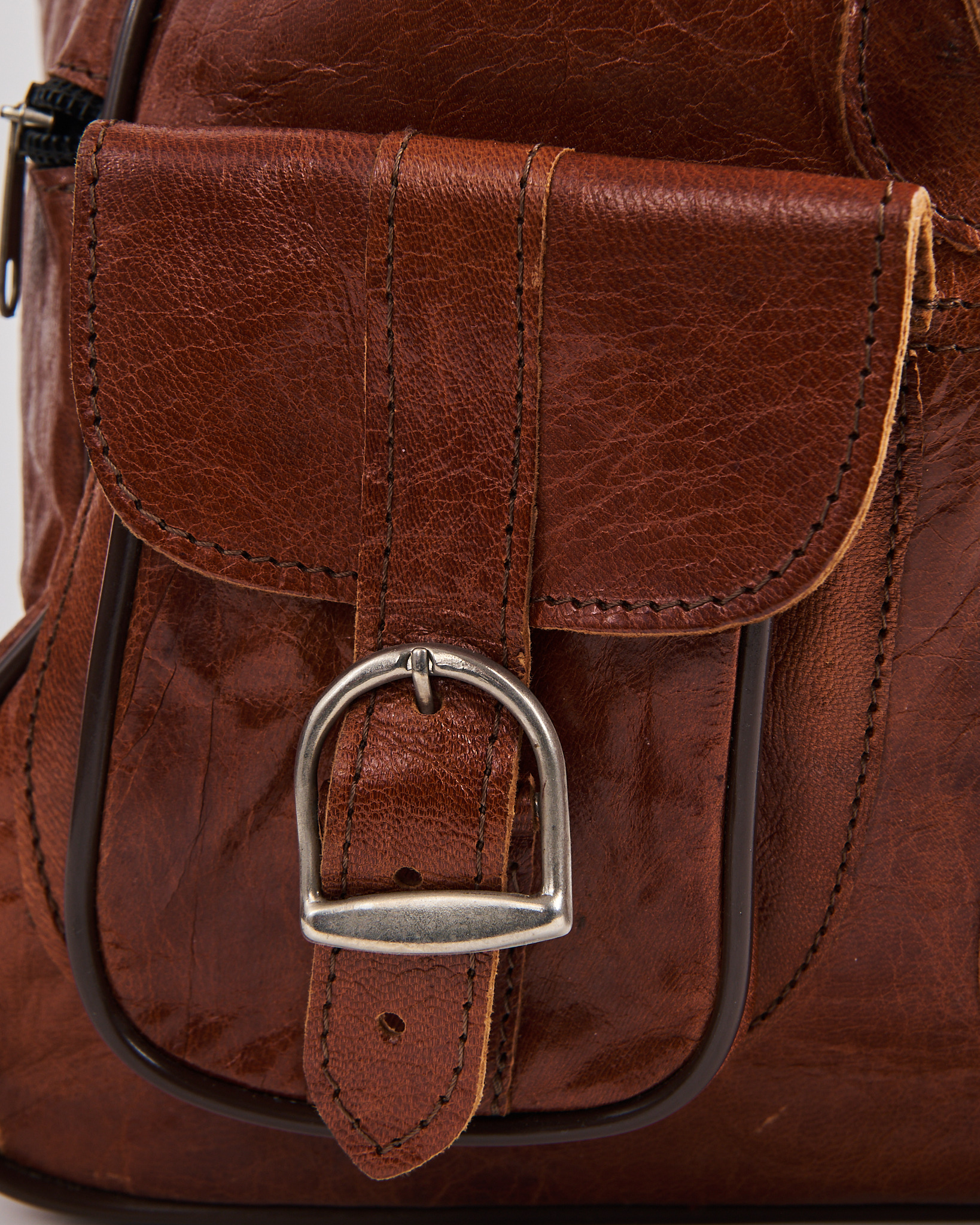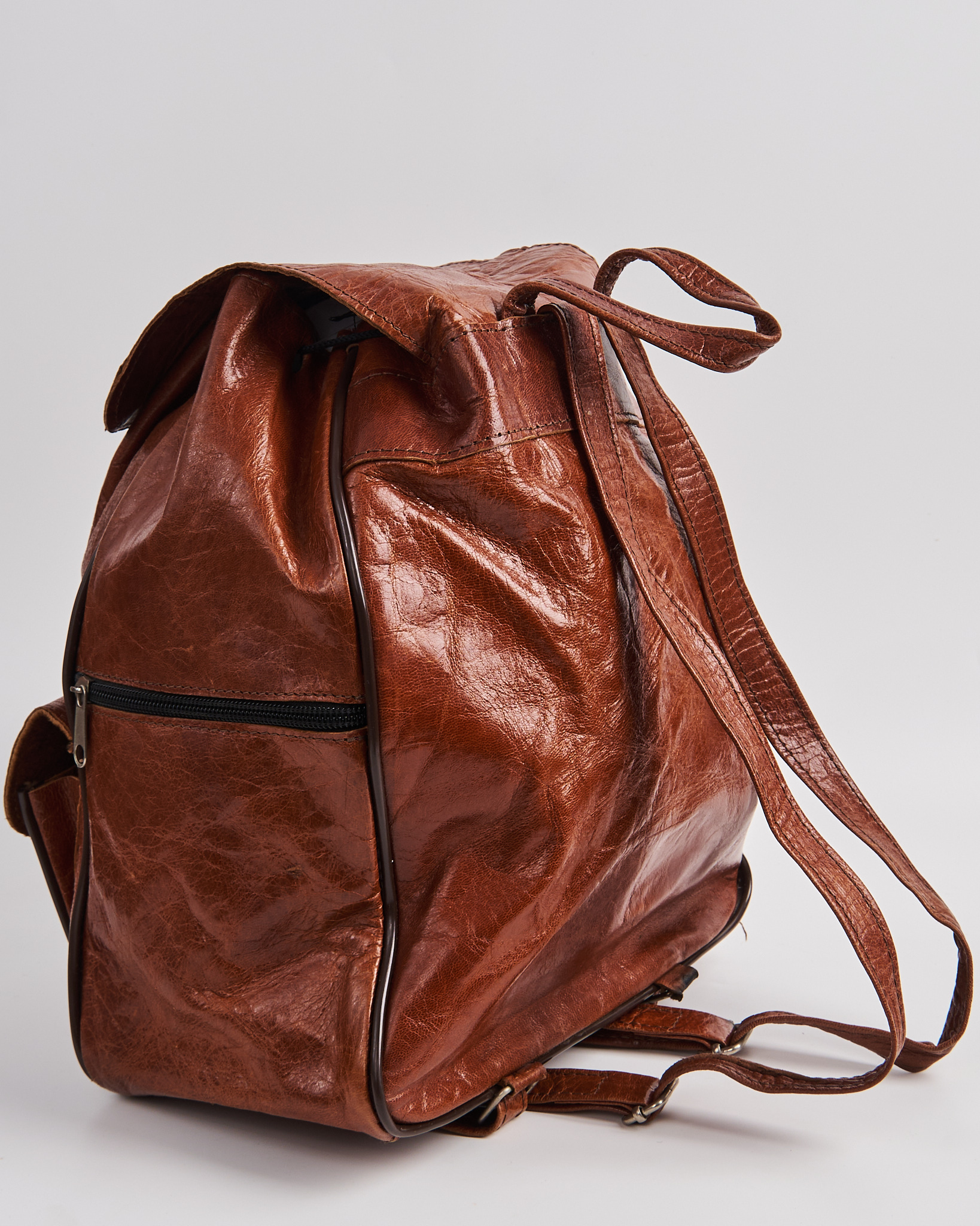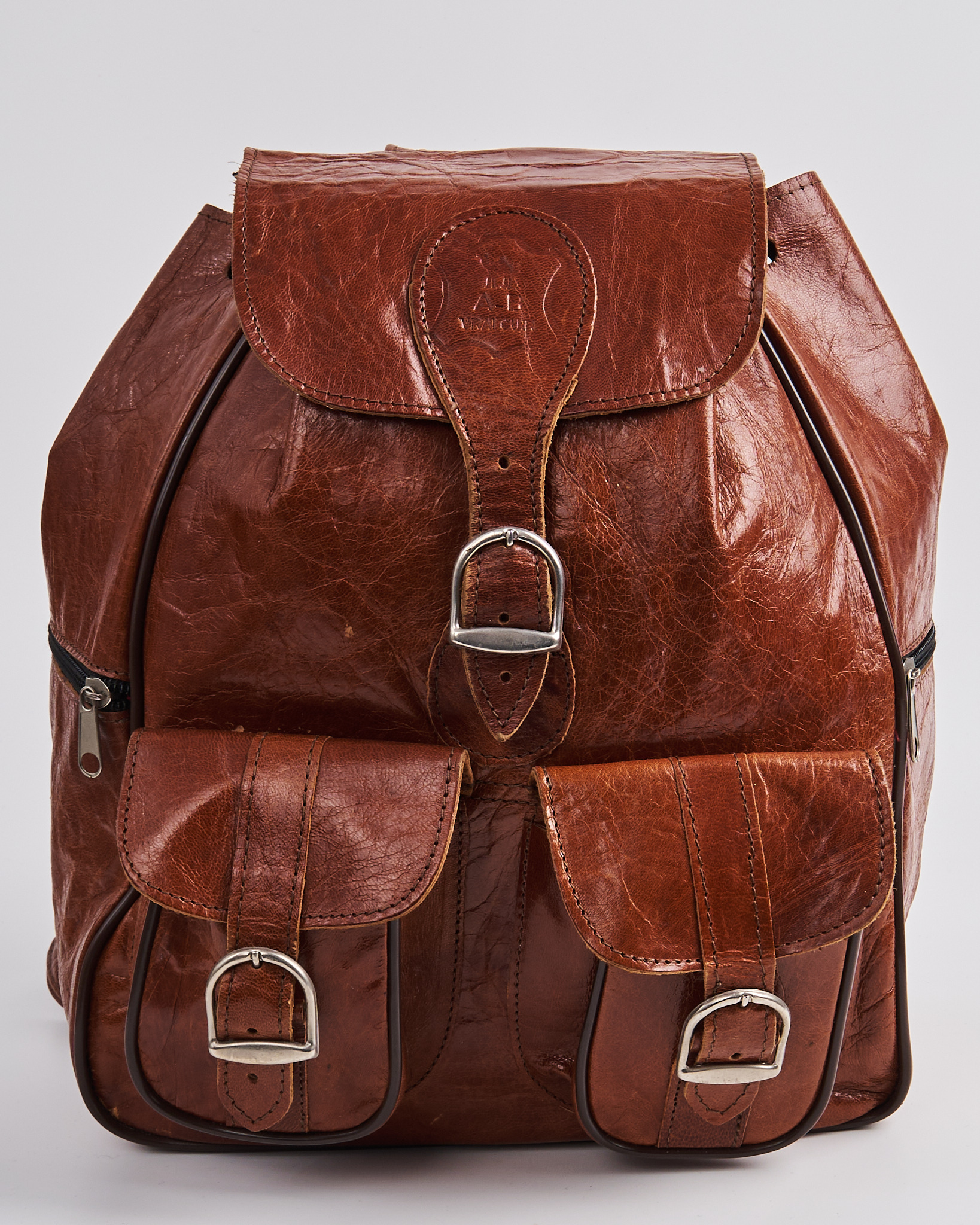 Рюкзак из натуральной кожи. Удобная посадка за счет регулируемых ручек. Застежка на ремешок, кулиска на резинке с помощью которой можно менять объем рюкзака. Фронтальные карманы с клапанами и металлическими пряжками придают акцент.