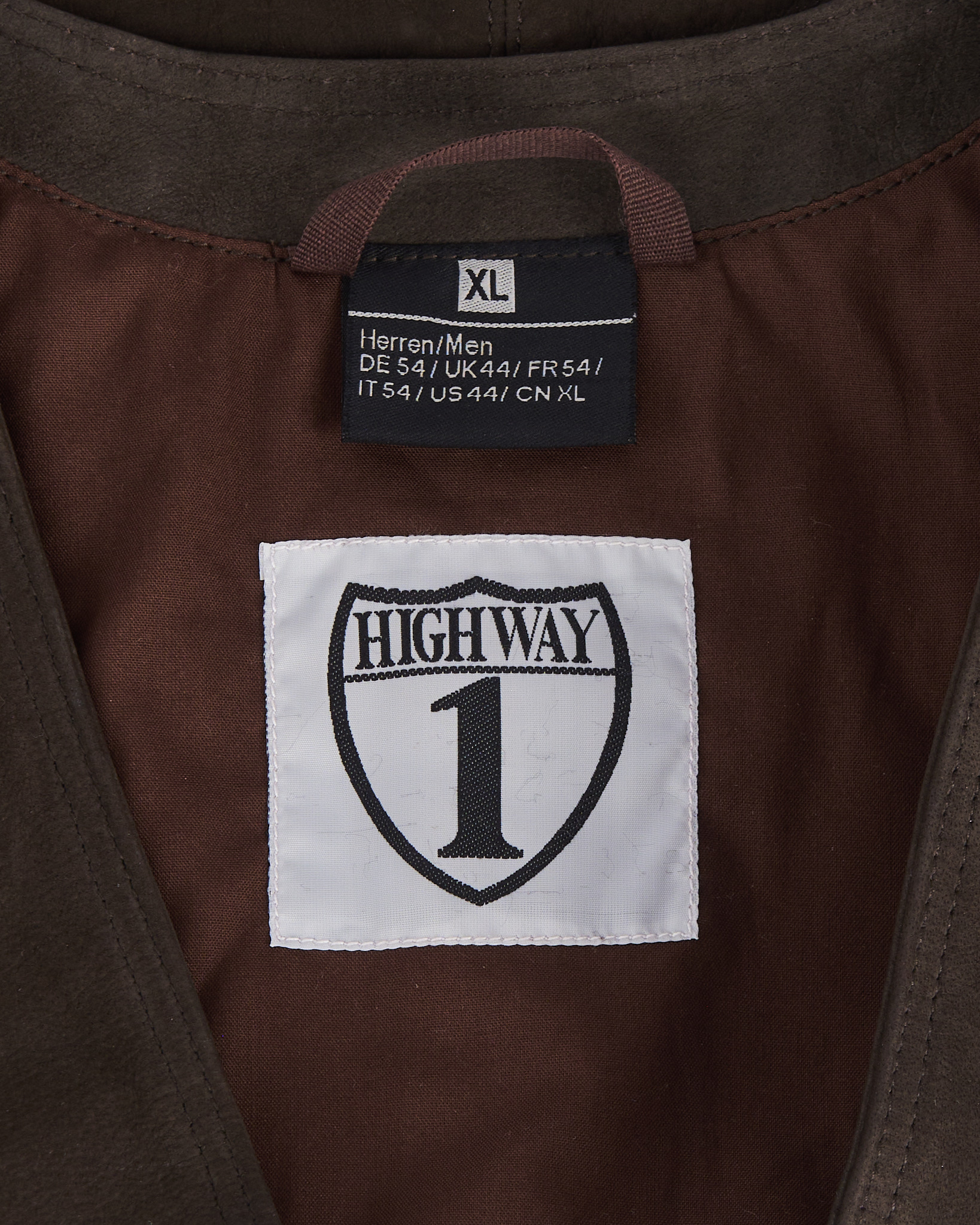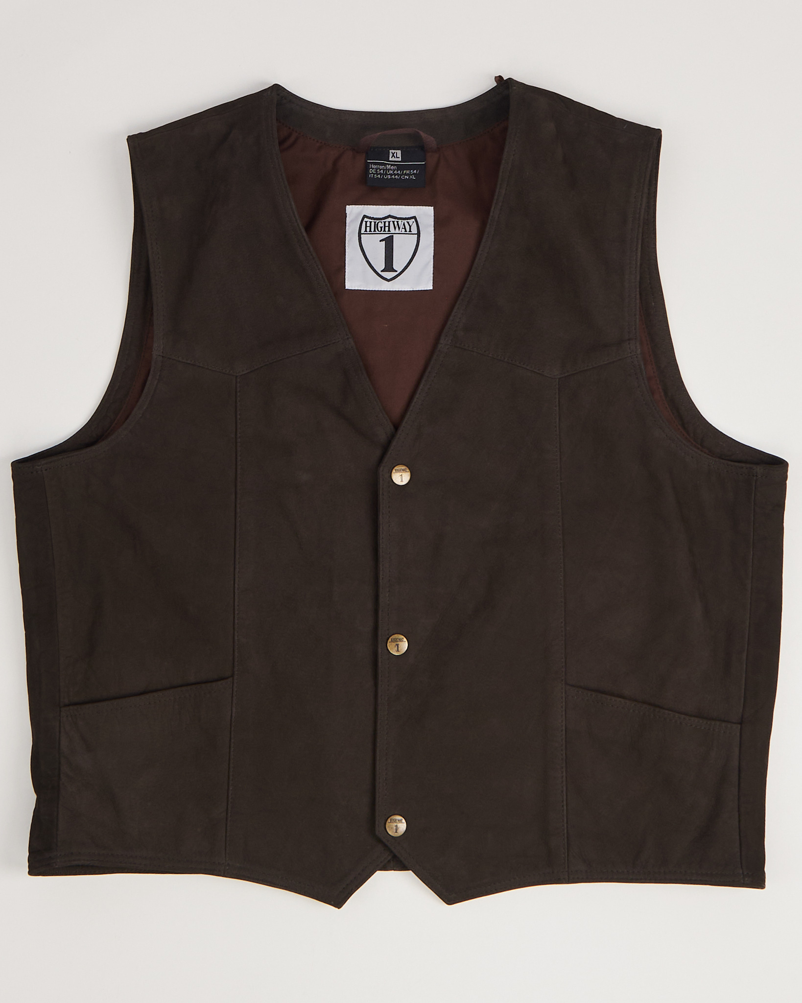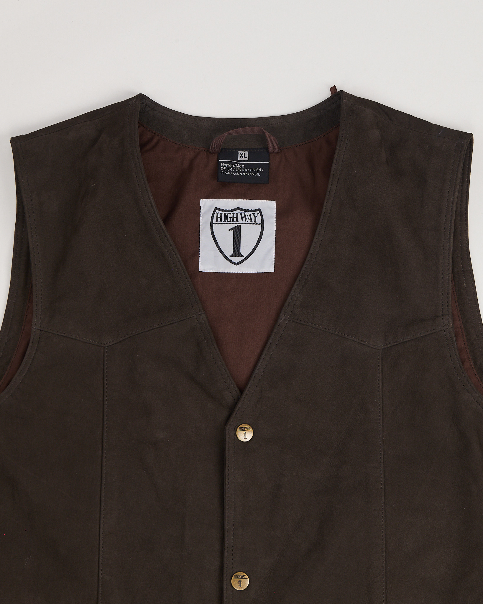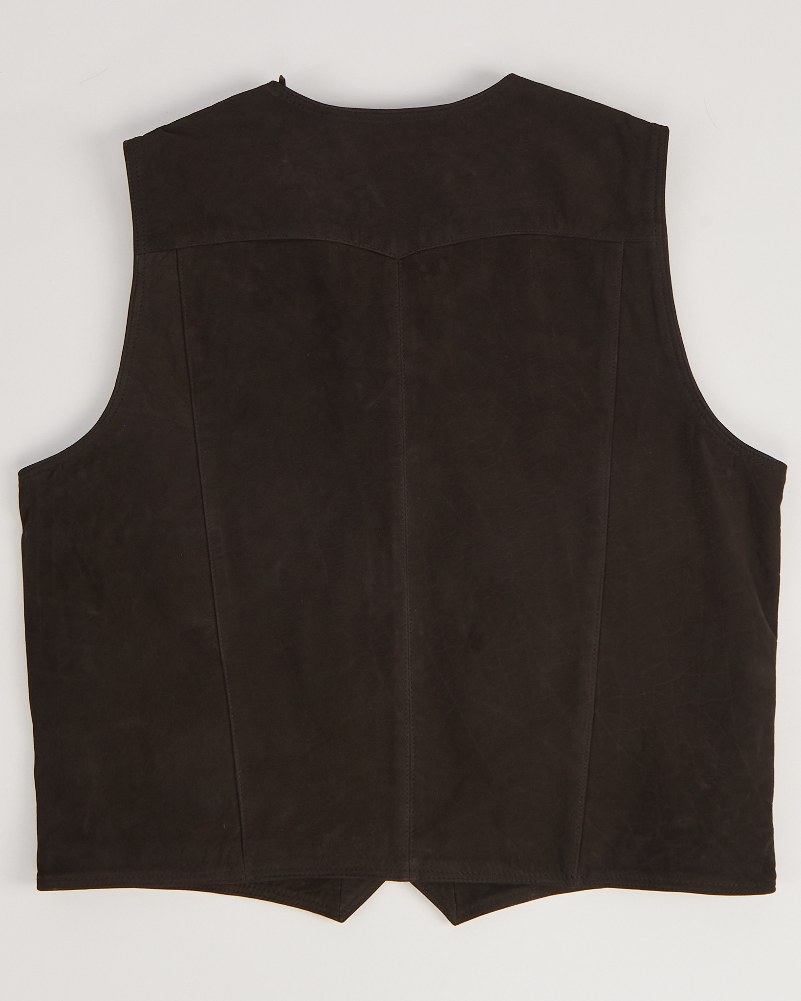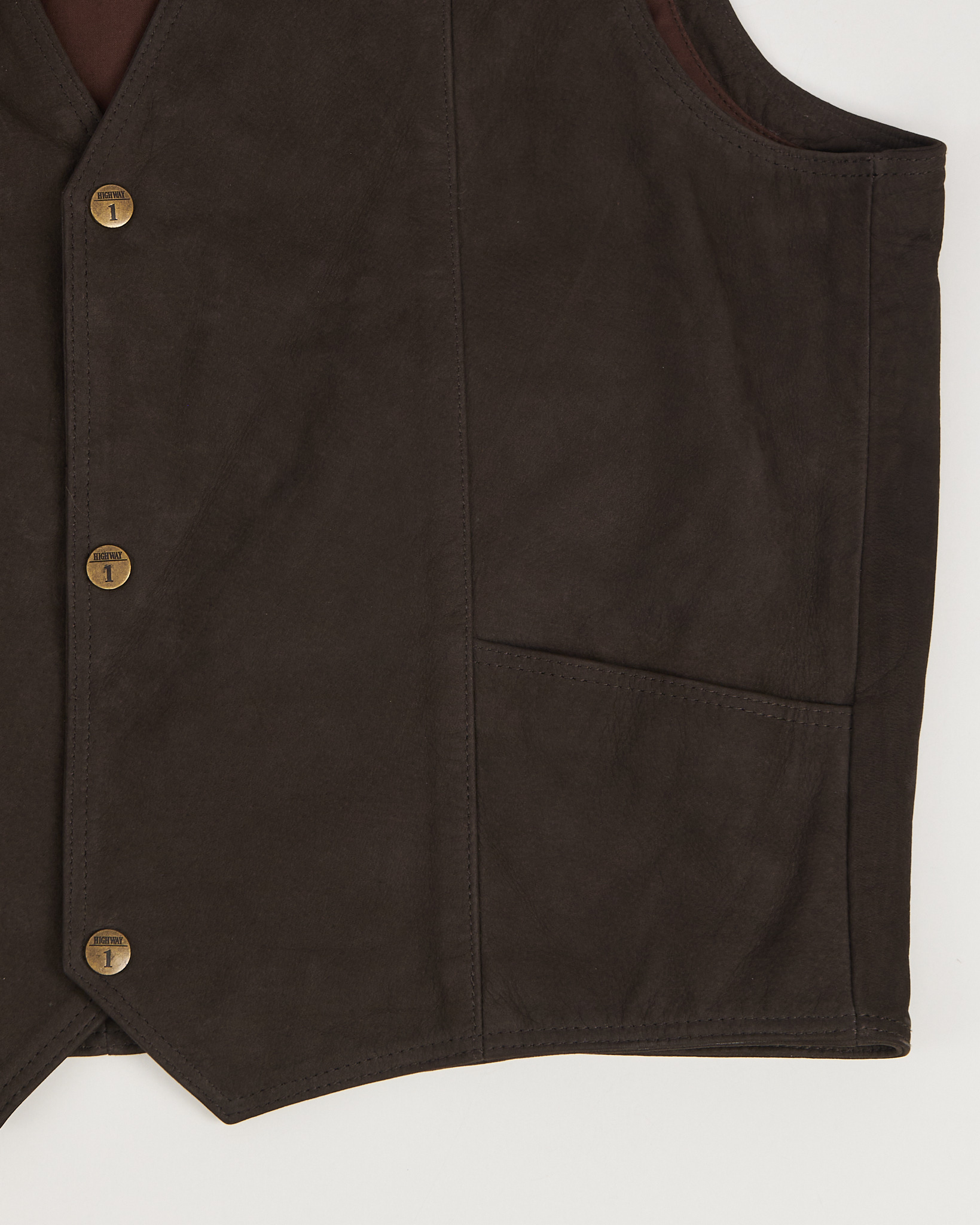 Жилет из натуральной кожи глубокого коричневого оттенка. Прямой силуэт с V-образным вырезом, застёжка на металлические кнопки.