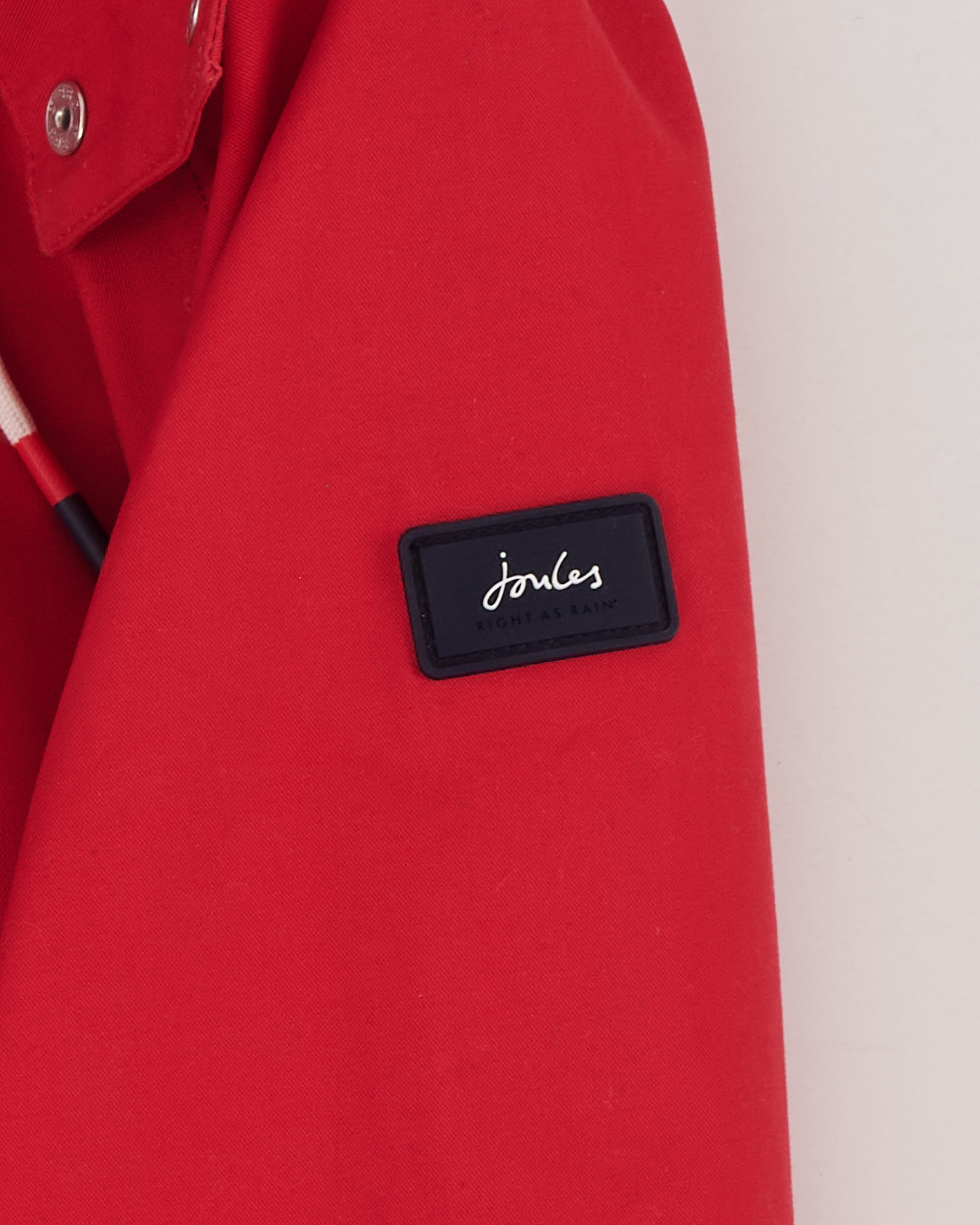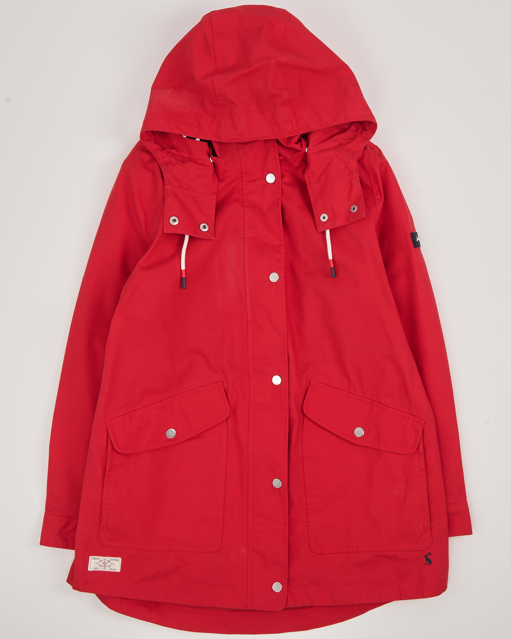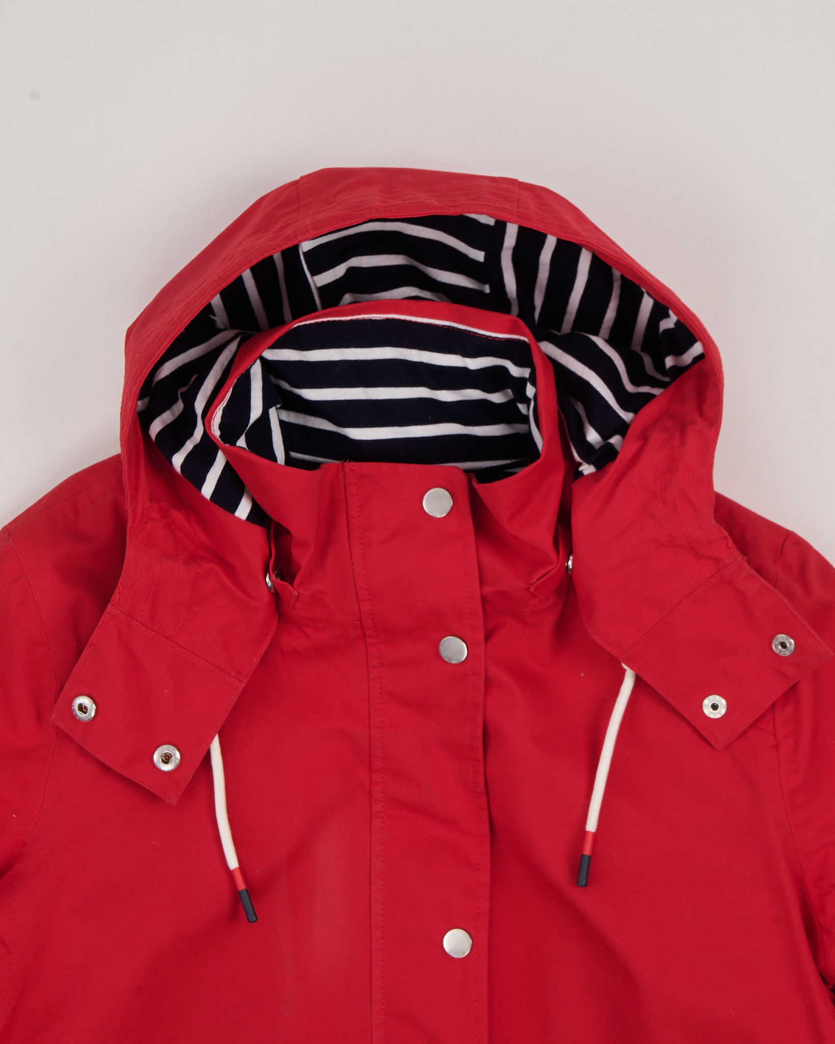 Парка Joules из плотного хлопкоа. Прямой крой, свободная посадка. Ткань гладкая, плотная, держит форму, внутри мягкая подкладка с рисунком в полоску. Капюшон с утяжками, крупные карманы и металлические кнопки добавляют акцент.
