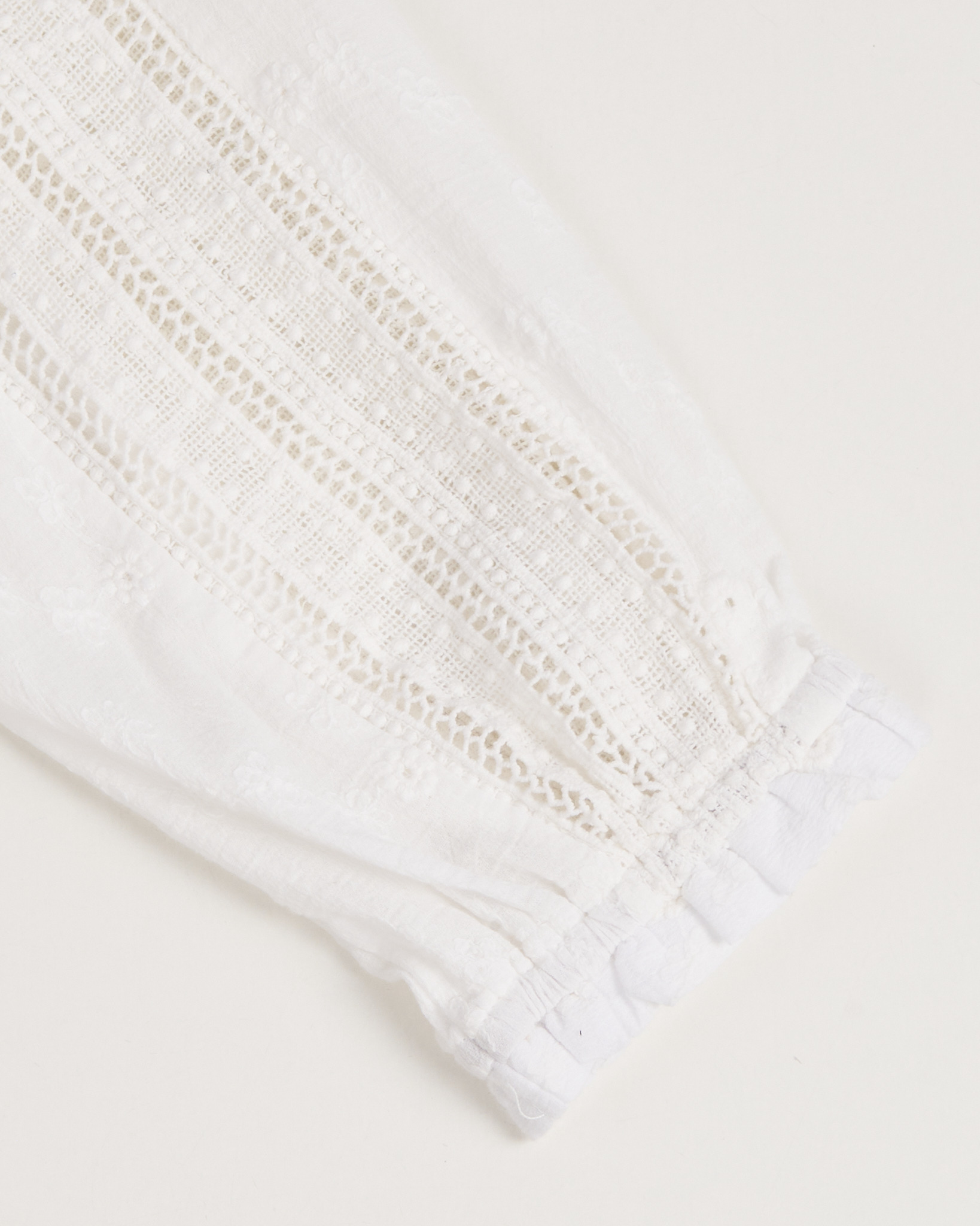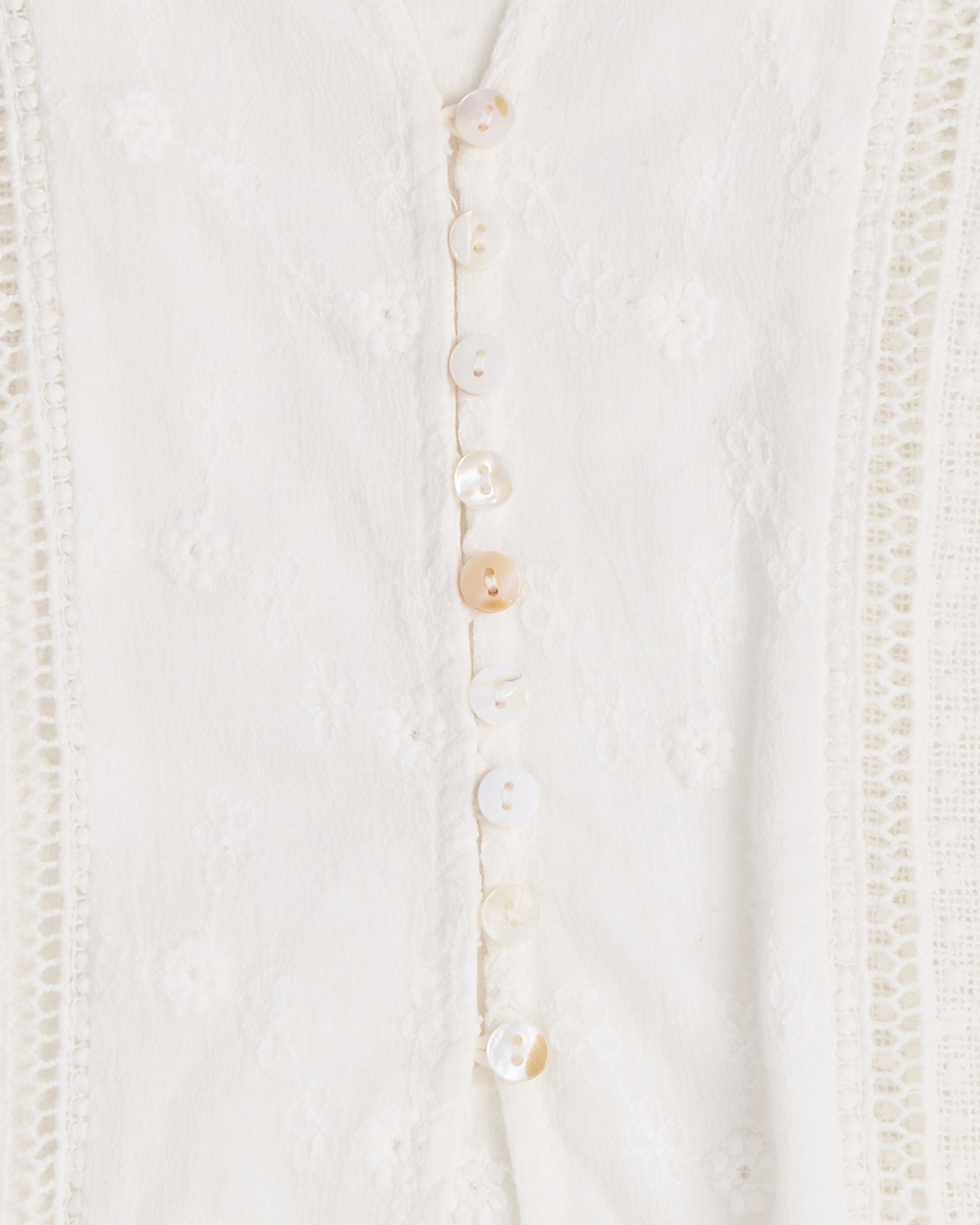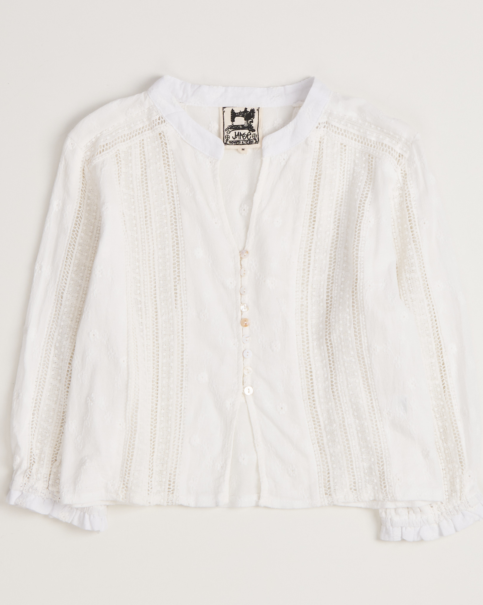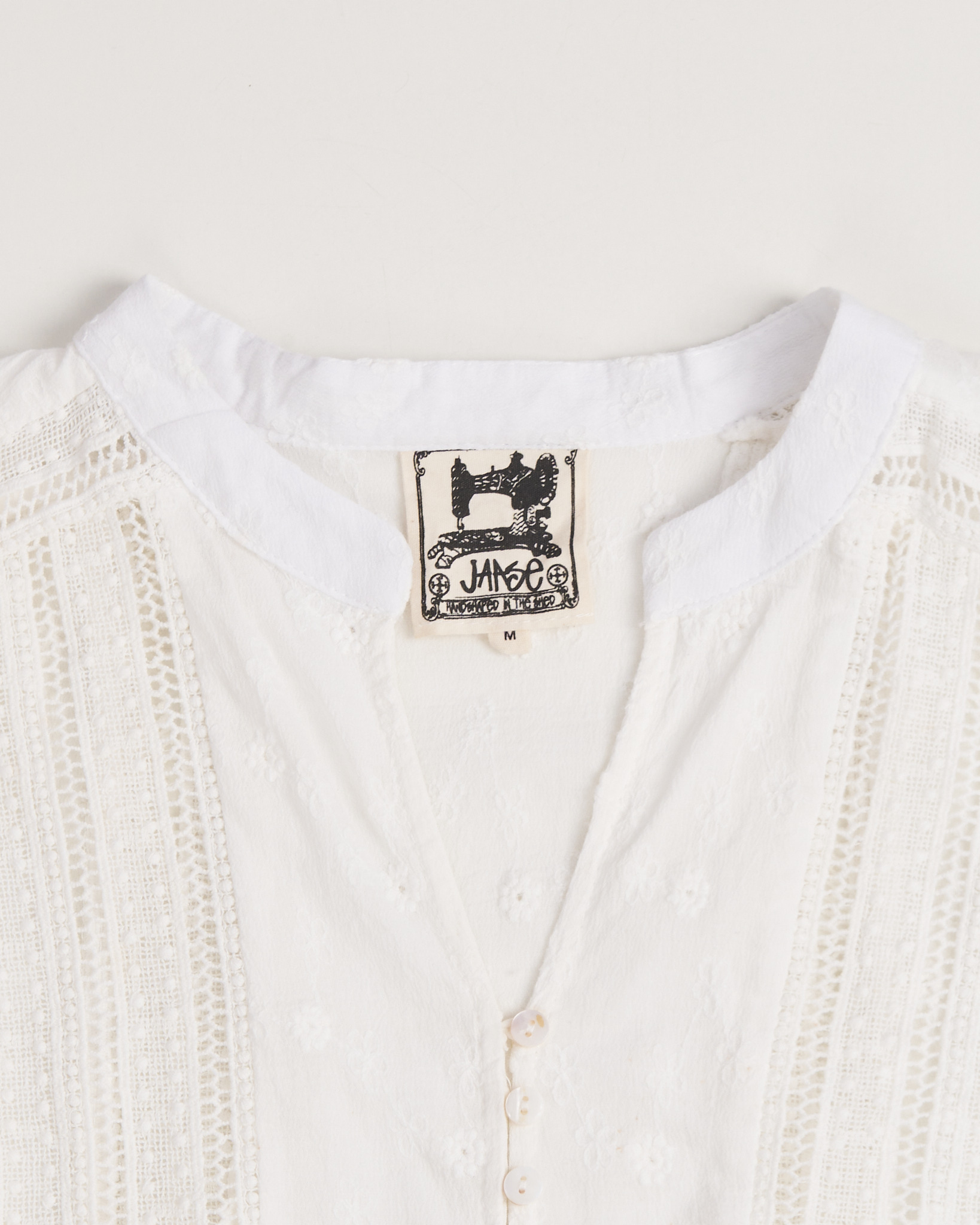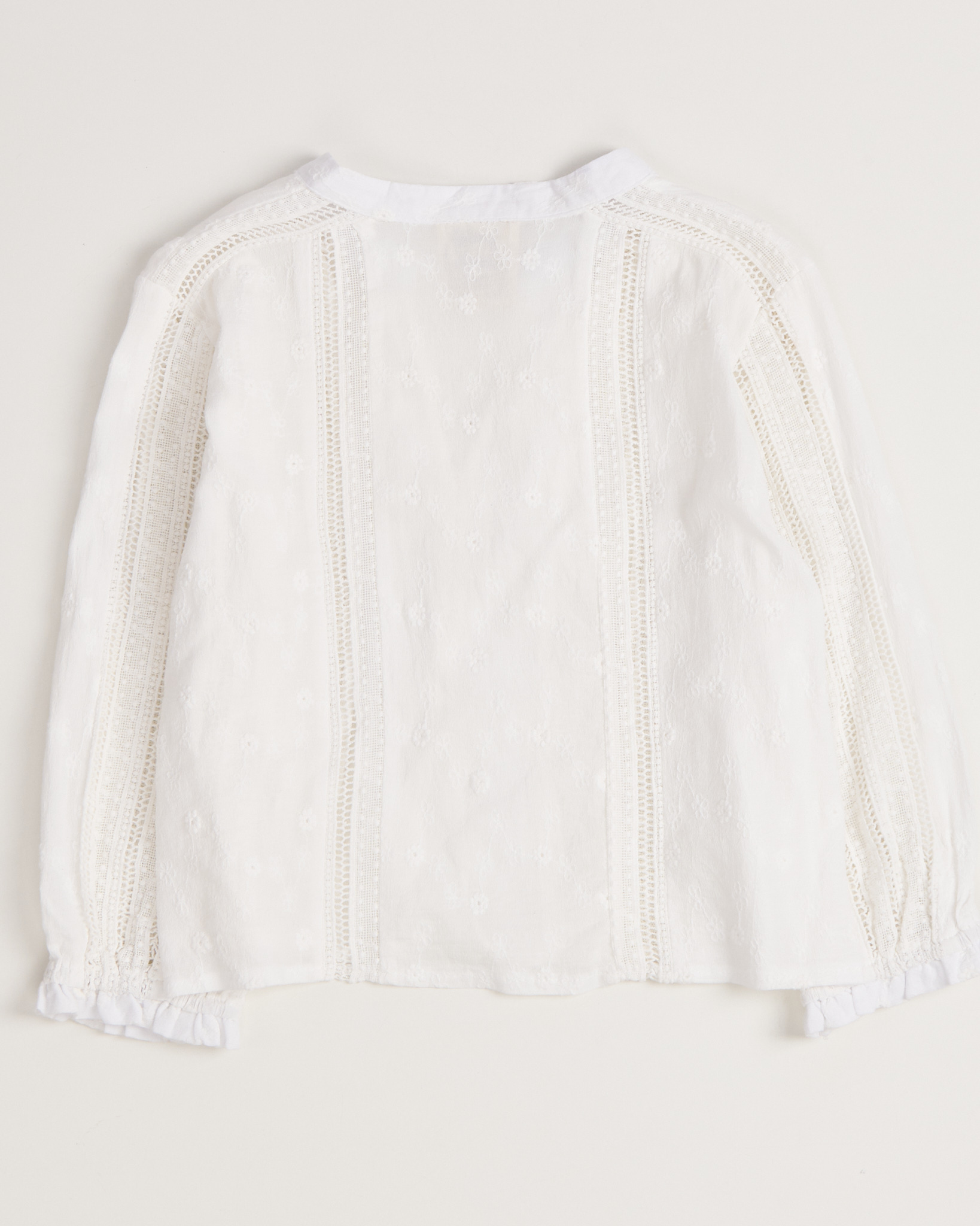 Белая кружевная блуза от Jaase. Свободный крой, длинные рукава с изящными сборками на манжетах. Потертые пуговицы, ажурные вставки и цветочная вышивка. Бохо-эстетика с элементами романтики.
