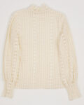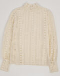 Нежный джемпер выполнен из ажурного текстиля светло-кремового оттенка. Вертикальный орнамент с цветочными мотивами