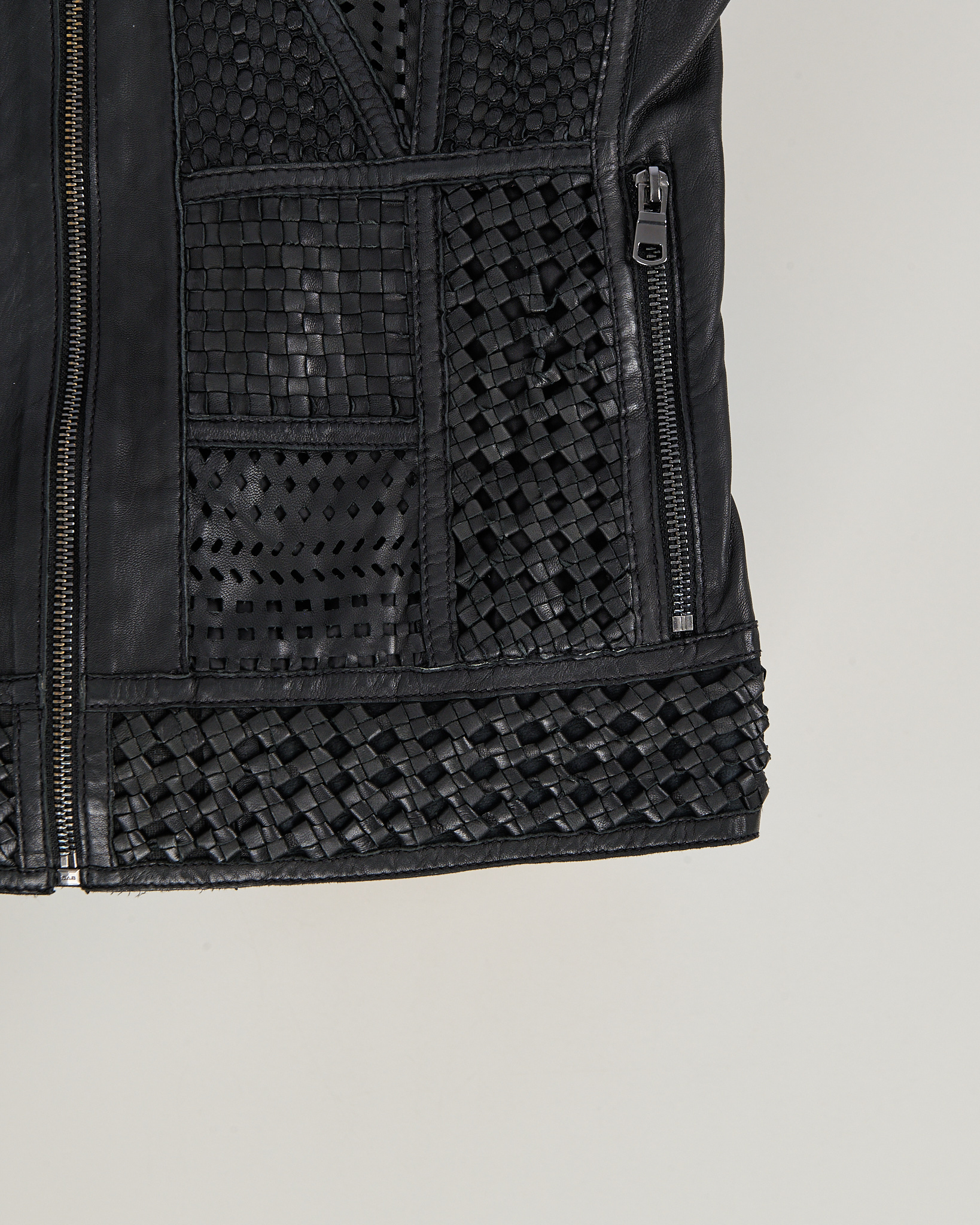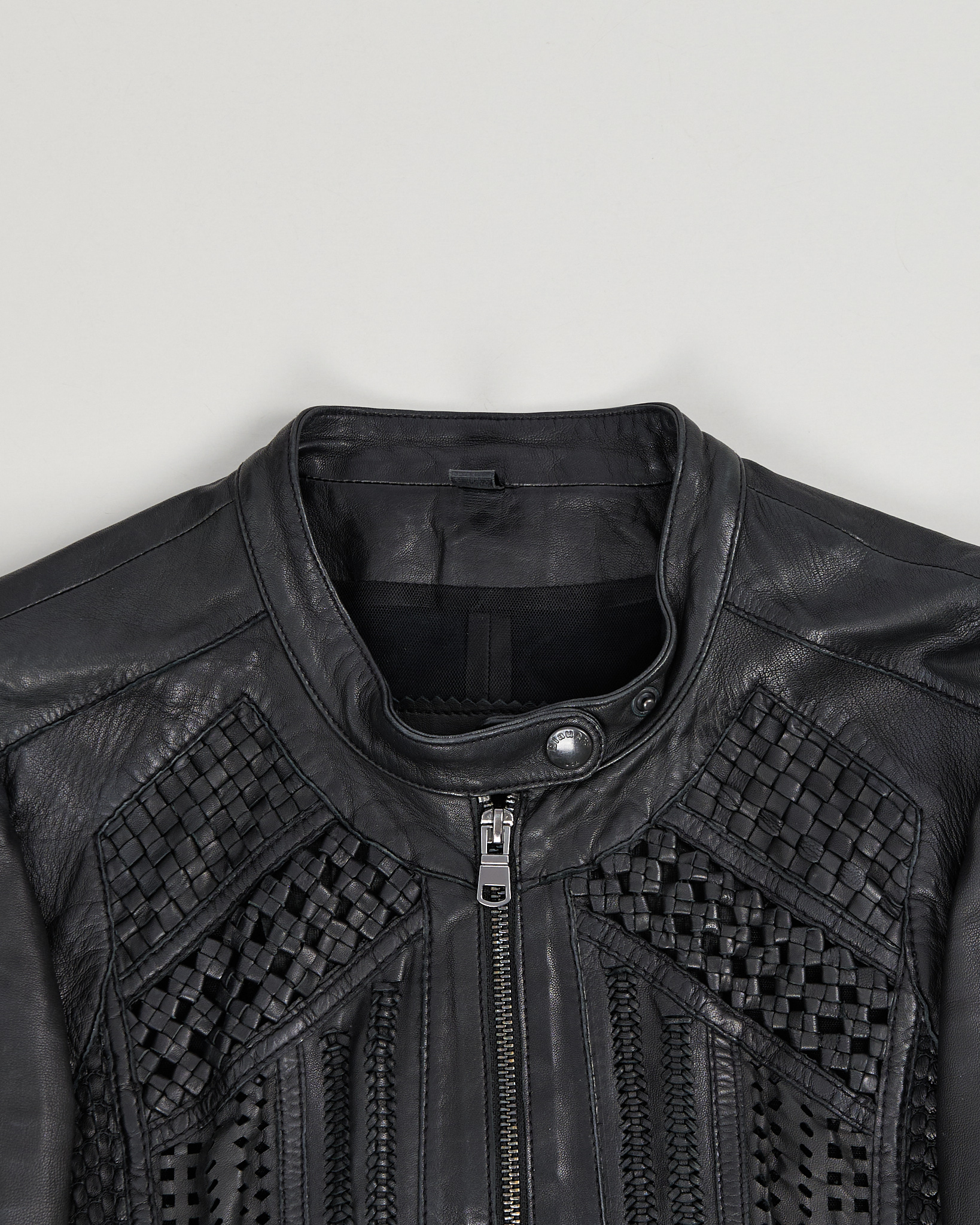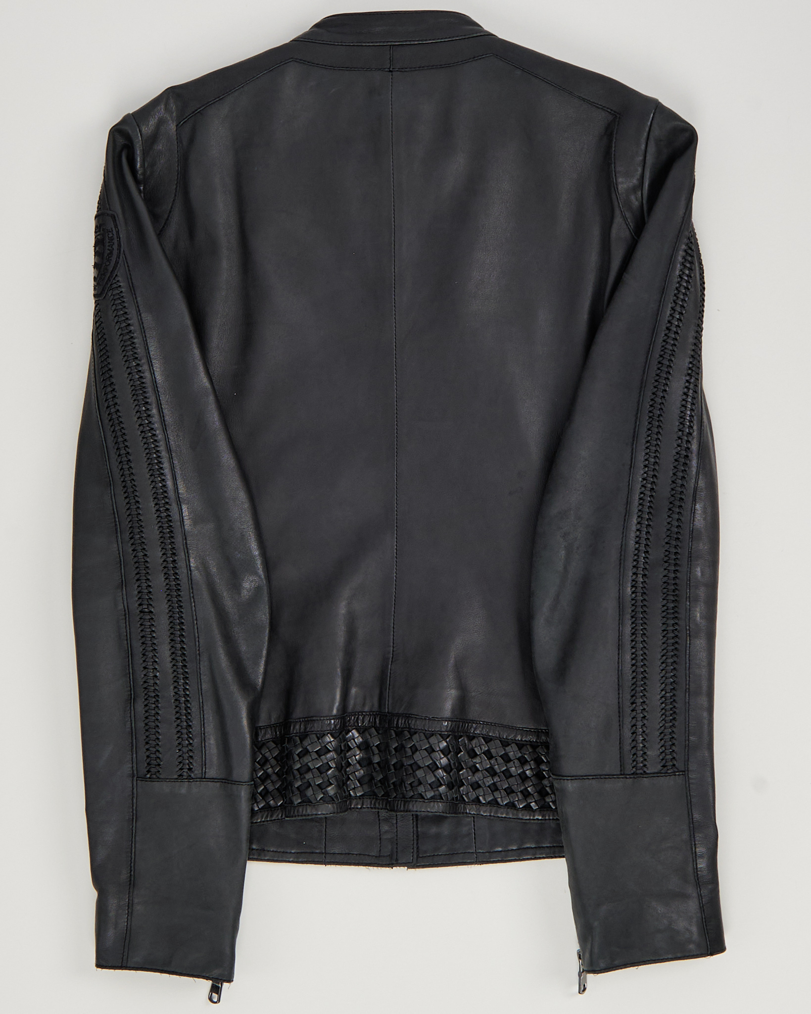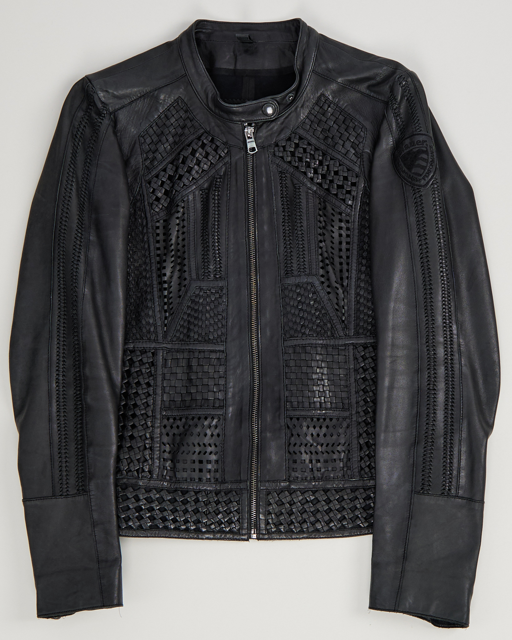 Материал 100% натуральная кожа (овечья). Прямой фасон с круглым воротником на кнопке. Декорирована вставками из кожи с плетением и перфорацией. Фирменный патч с логотипом Blauer на плече. Застежка на металлическую молнию спереди.