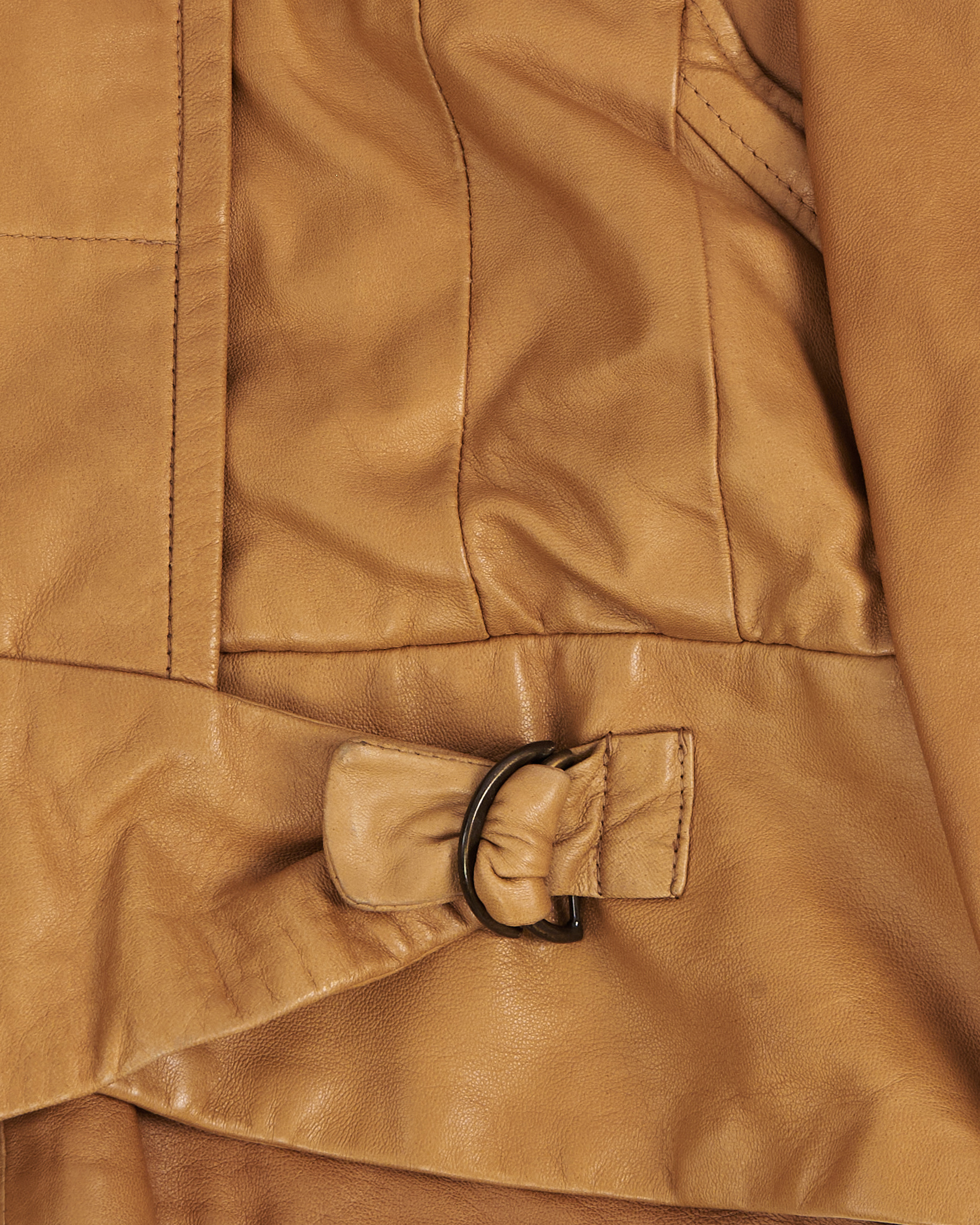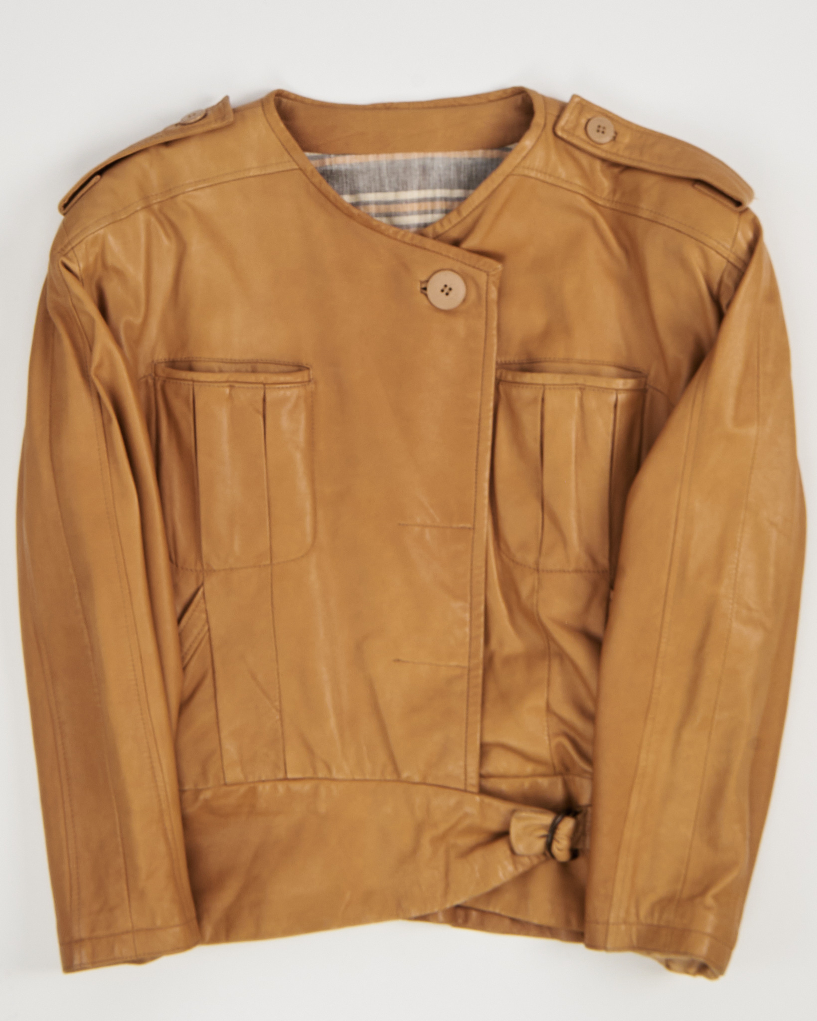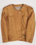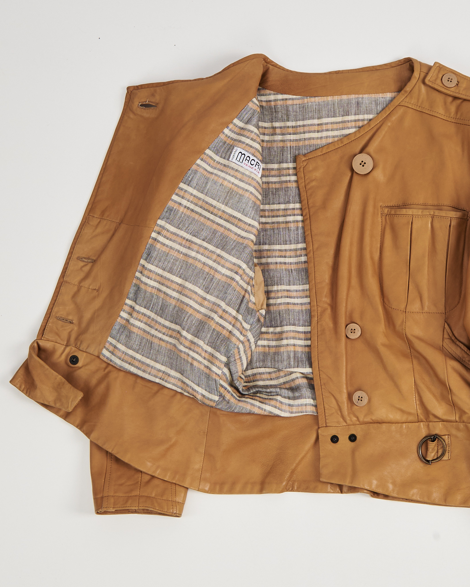 Куртка Macri Venezia из натуральной кожи. Прямой крой, аккуратная посадка подчёркивает силуэт. Накладные карманы с вертикальными складками и погоны на плечах. Пояс с металлическим кольцом на талии придает куртке акцент.