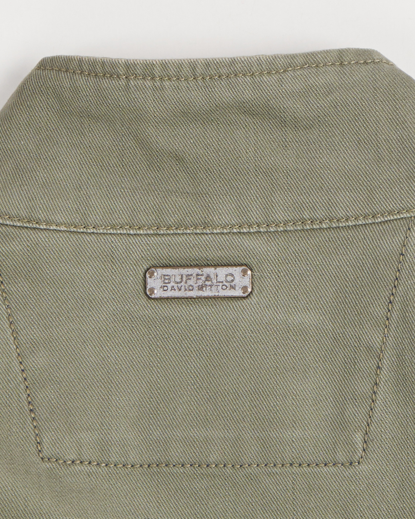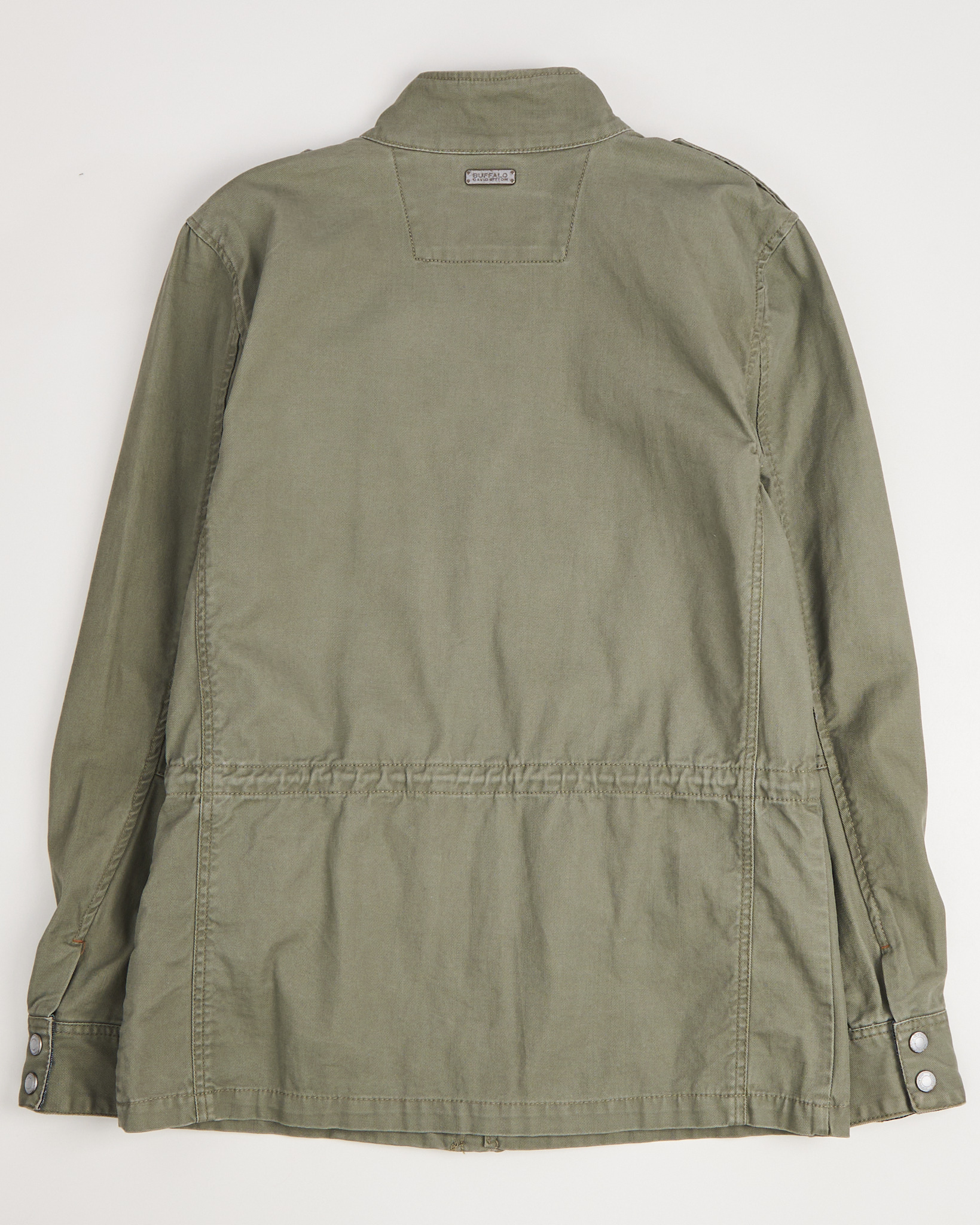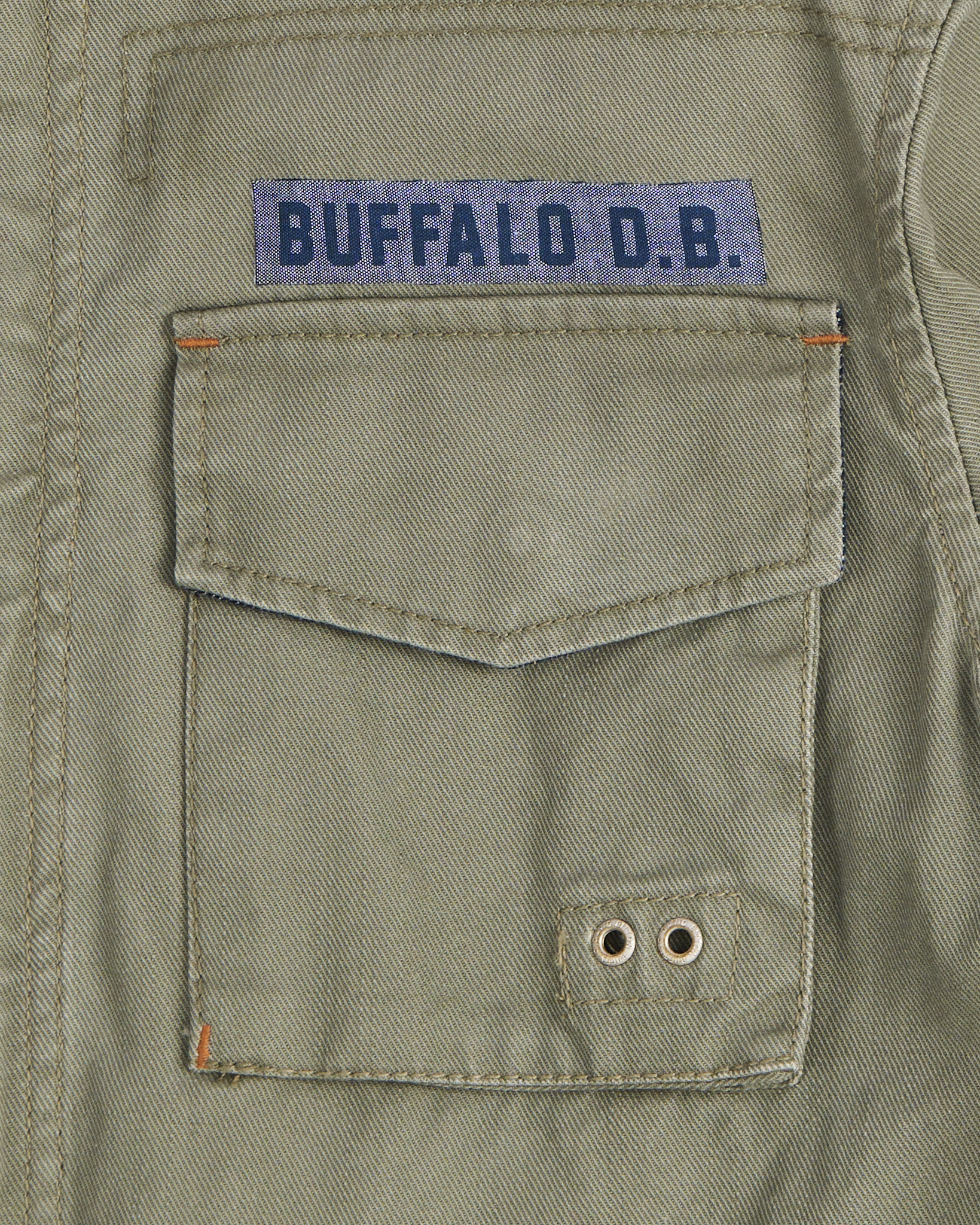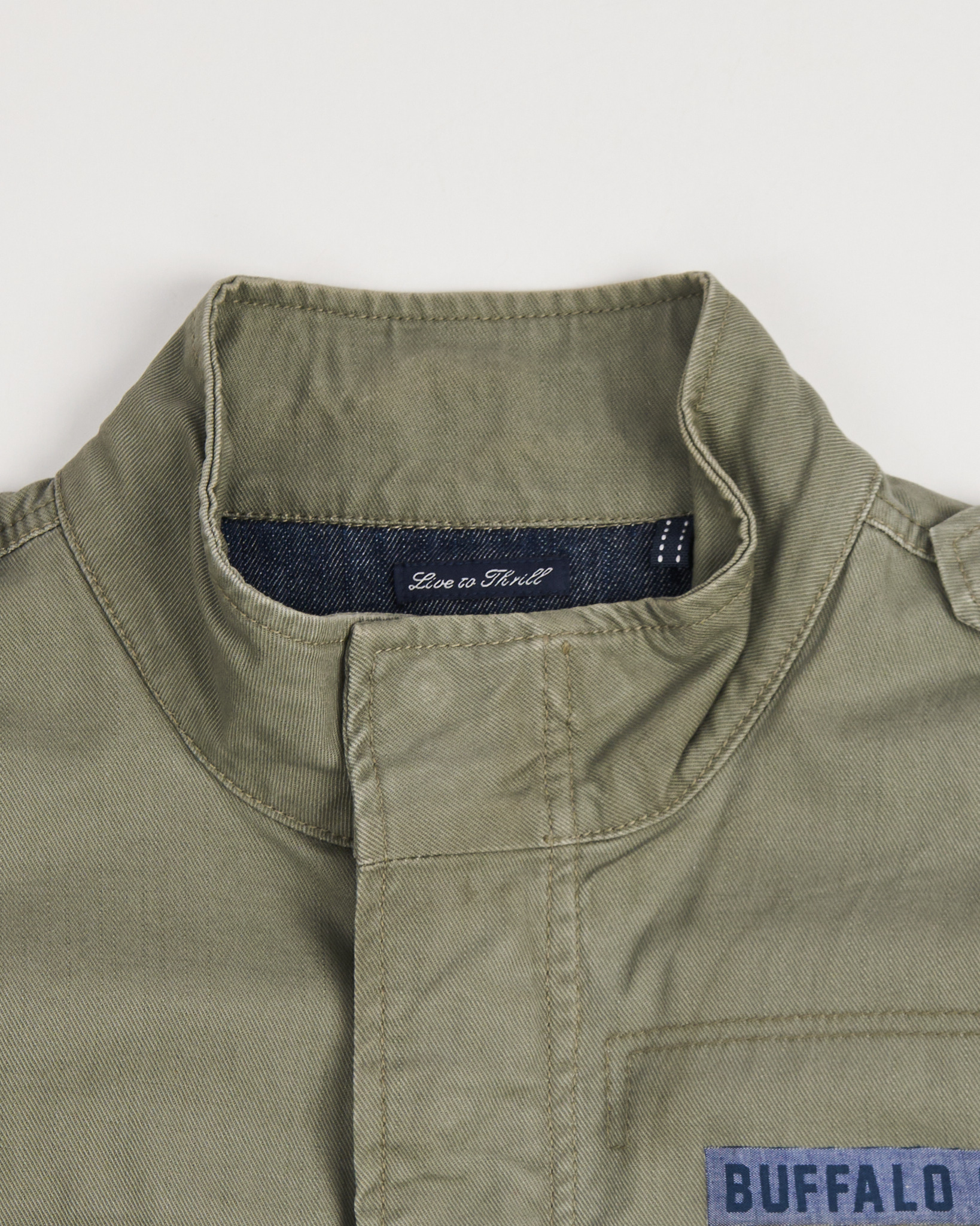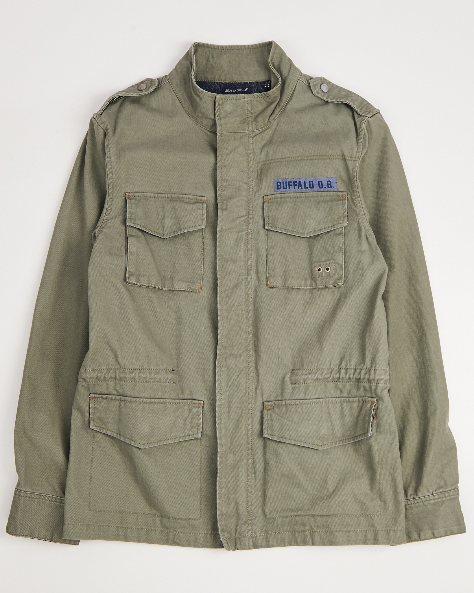 Куртка из хлопка, прямого силуэта, посадка свободная. Модель выполнена в оливковом оттенке, на груди накладные карманы и нашивка с названием бренда, по низу расположены вместительные карманы с клапанами.