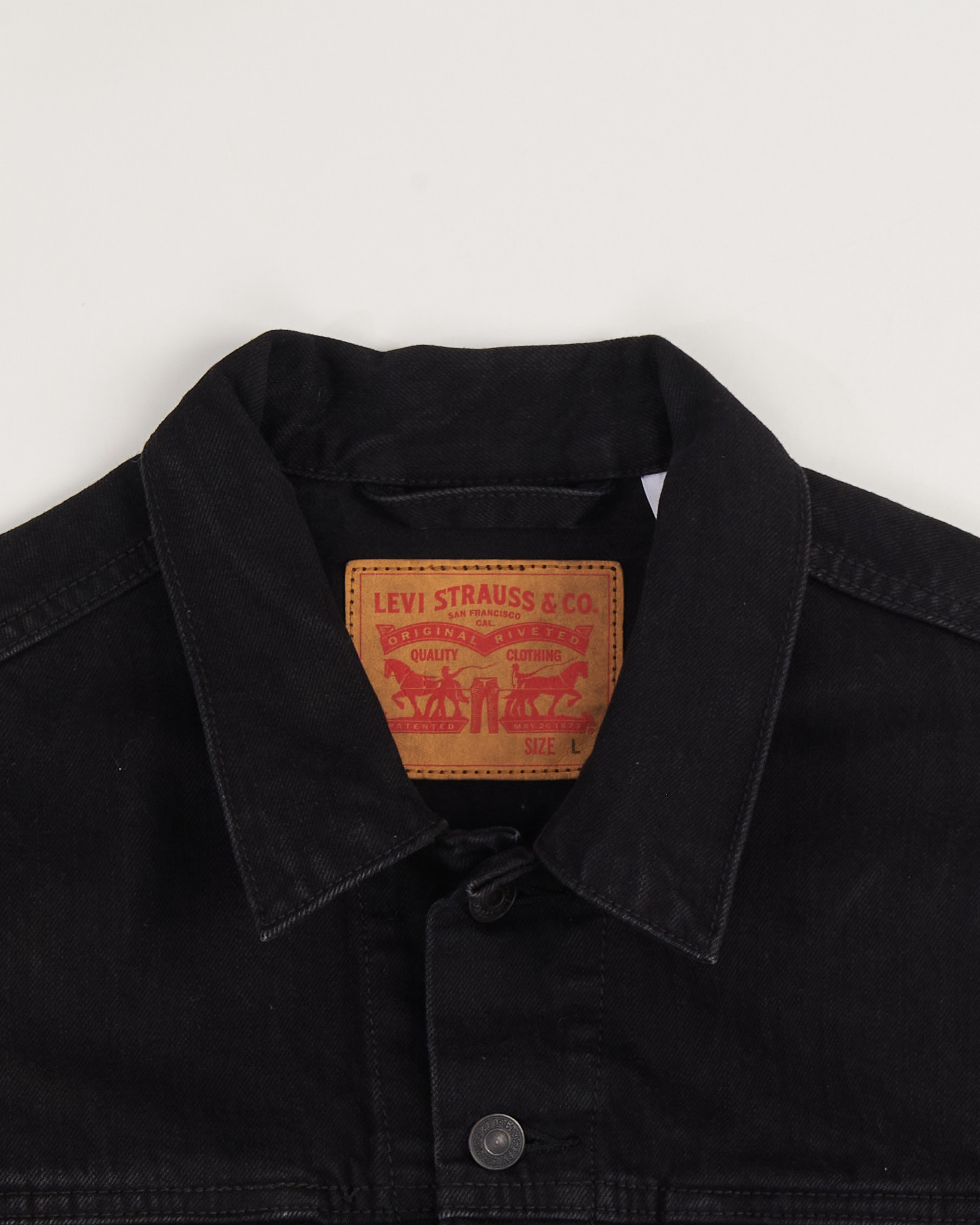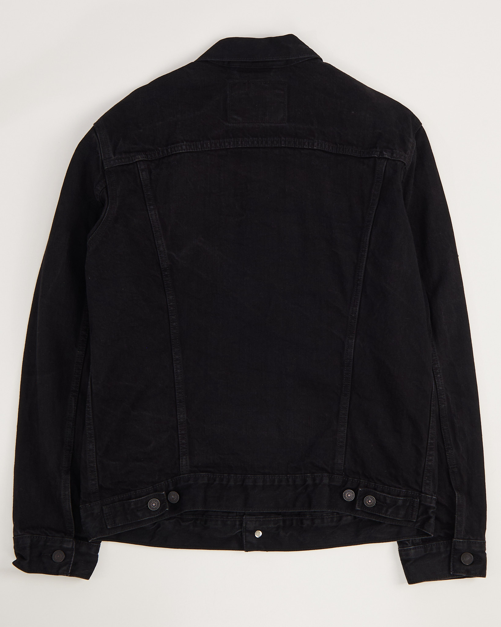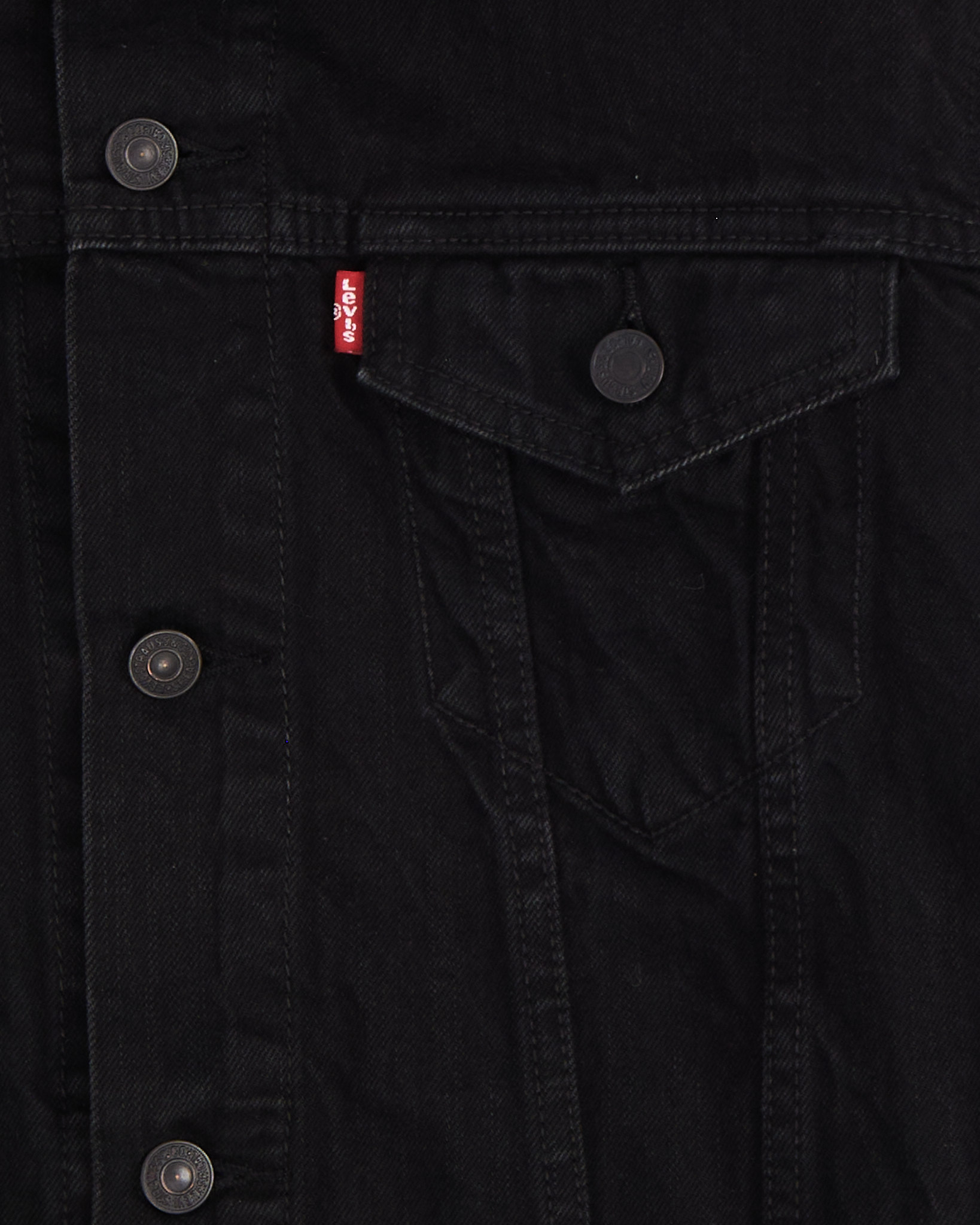 Джинсовая куртка Levi’s черного цвета. Классический силуэт. Прямая посадка. Застежка на металлические пуговицы. На груди два кармана с клапанами, по бокам прорезные карманы. Контрастная кожаная нашивка на спинке воротника. Фирменный красный таб на кармане.