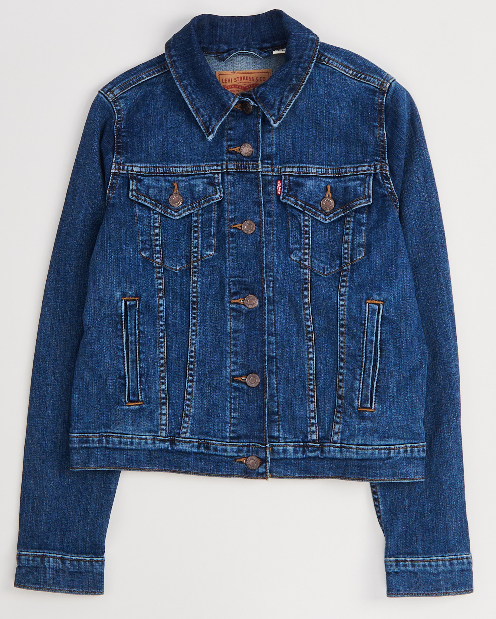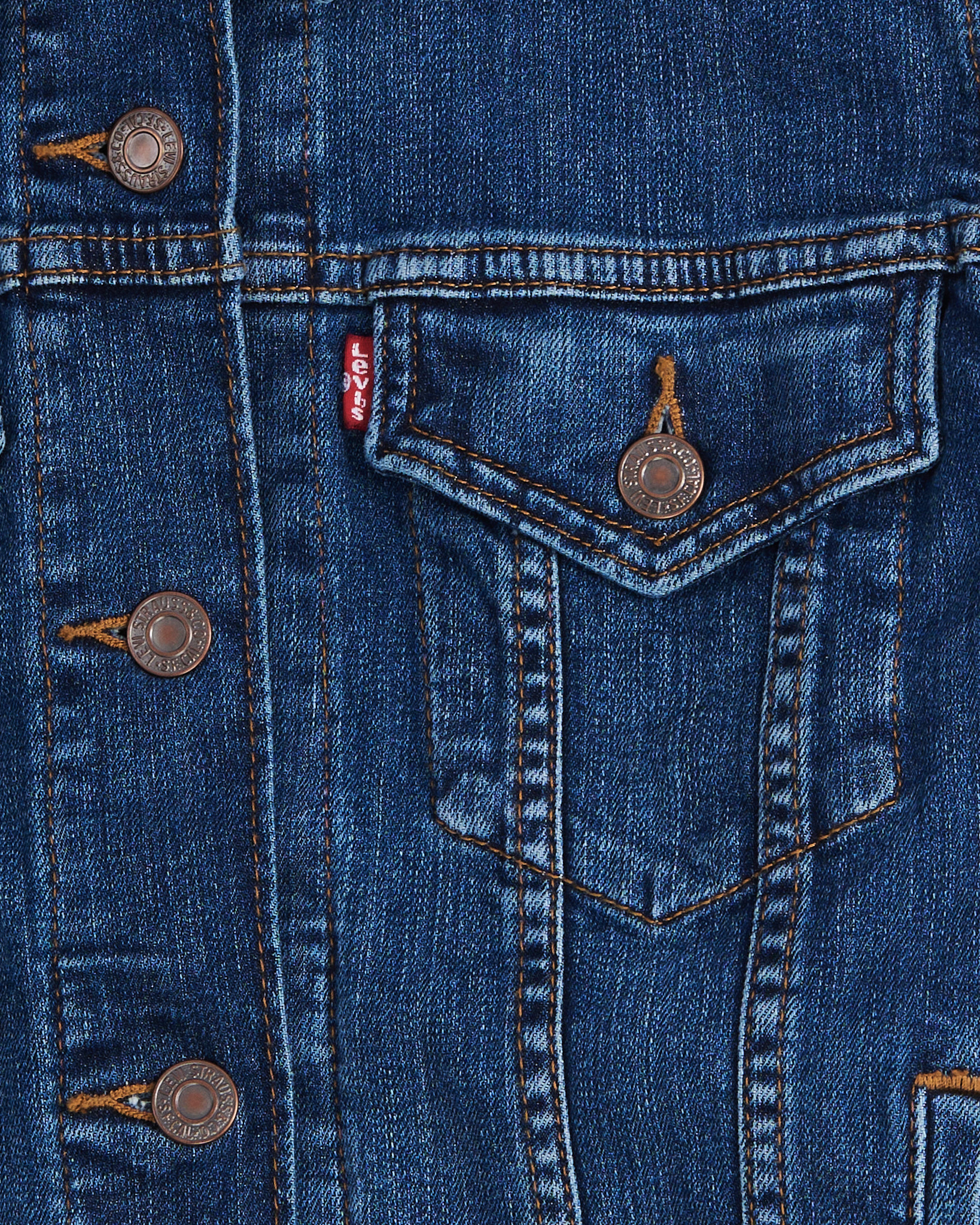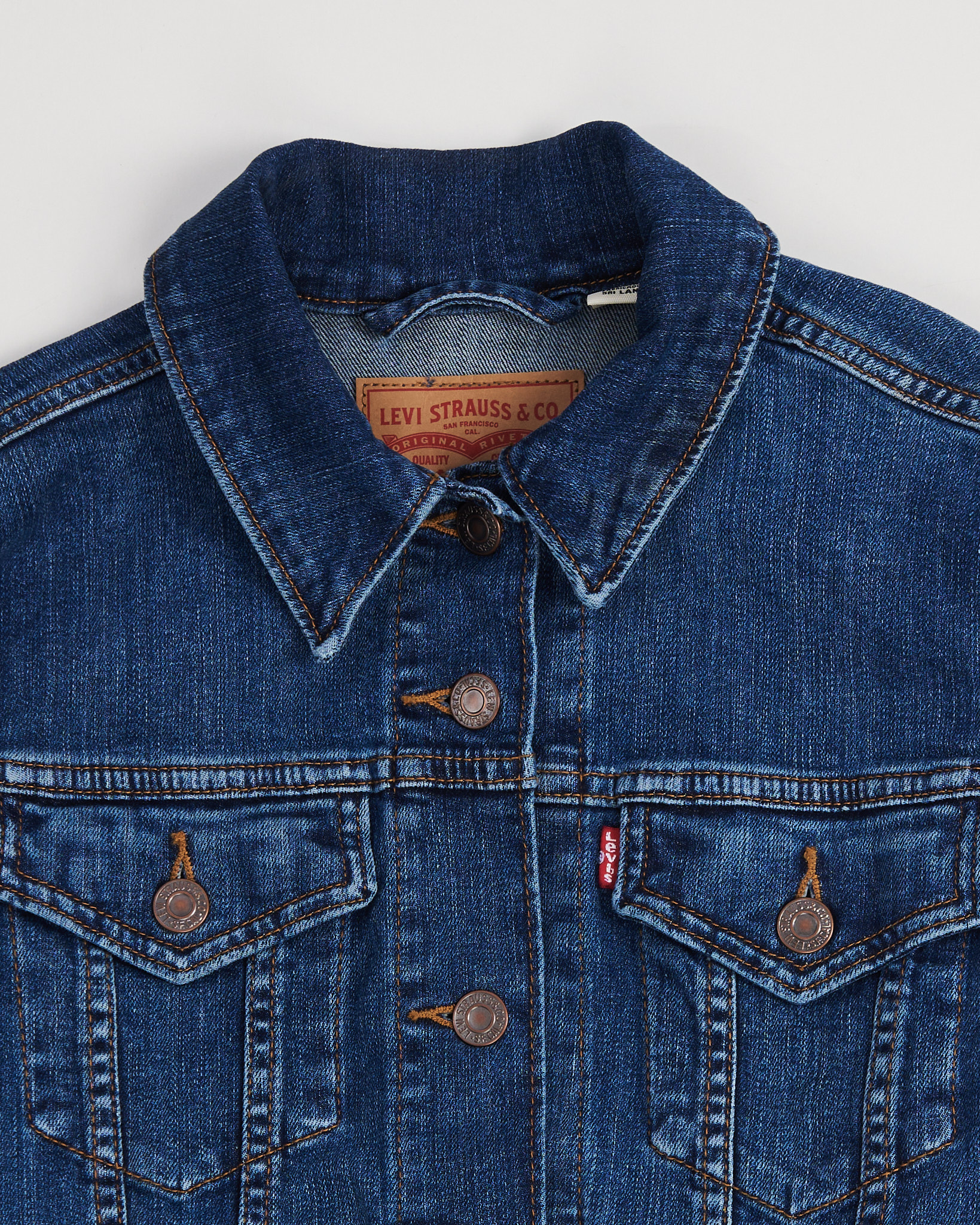 Джинсовая куртка Levi’s синего цвета с естественными высветлениями по швам. Плотная ткань с характерной зернистой фактурой. Спереди металлические брендированные пуговицы. Два функциональных нагрудных кармана с клапанами и пуговицами. Боковые прорезные карманы. Красный ярлык с логотипом на кармане.