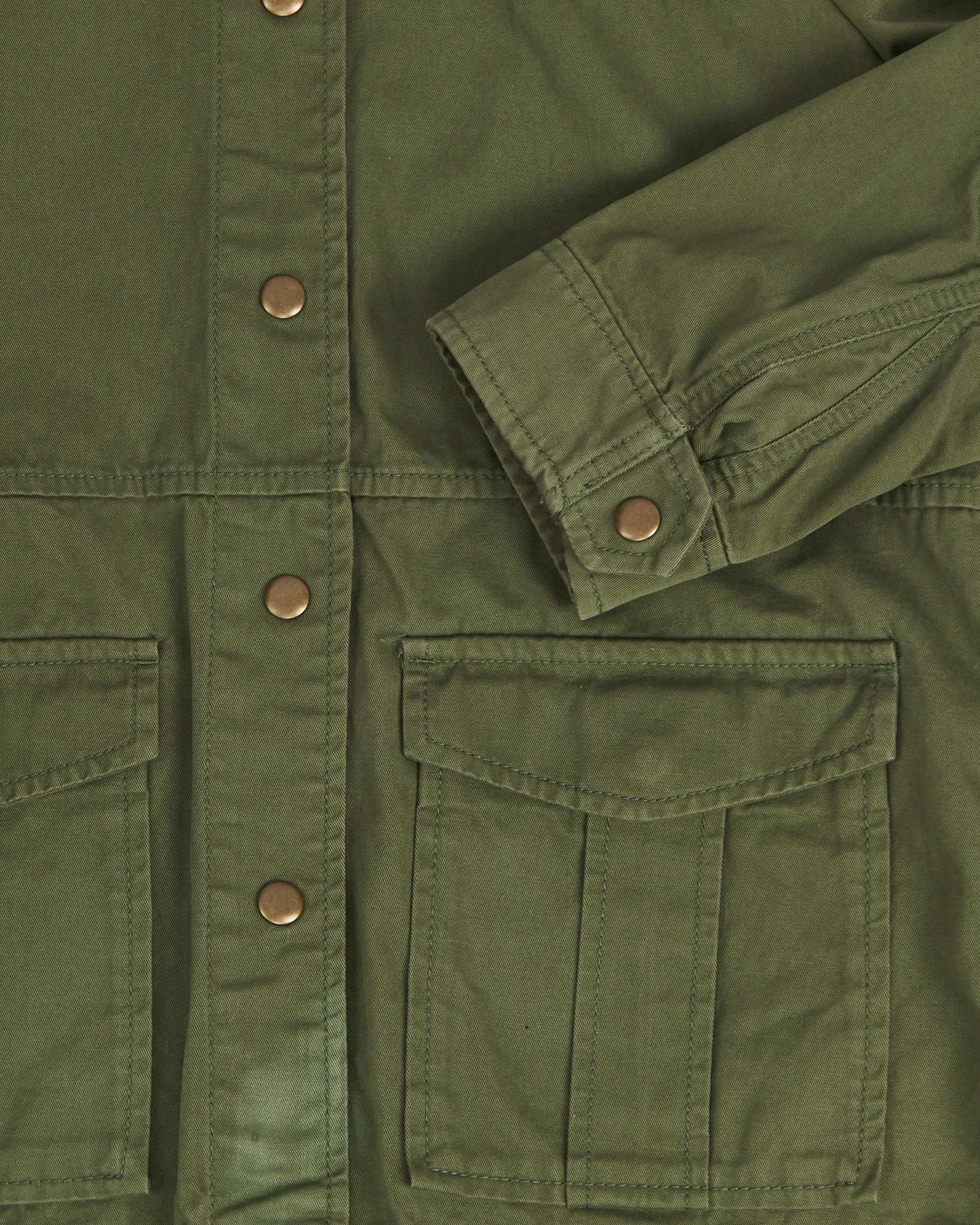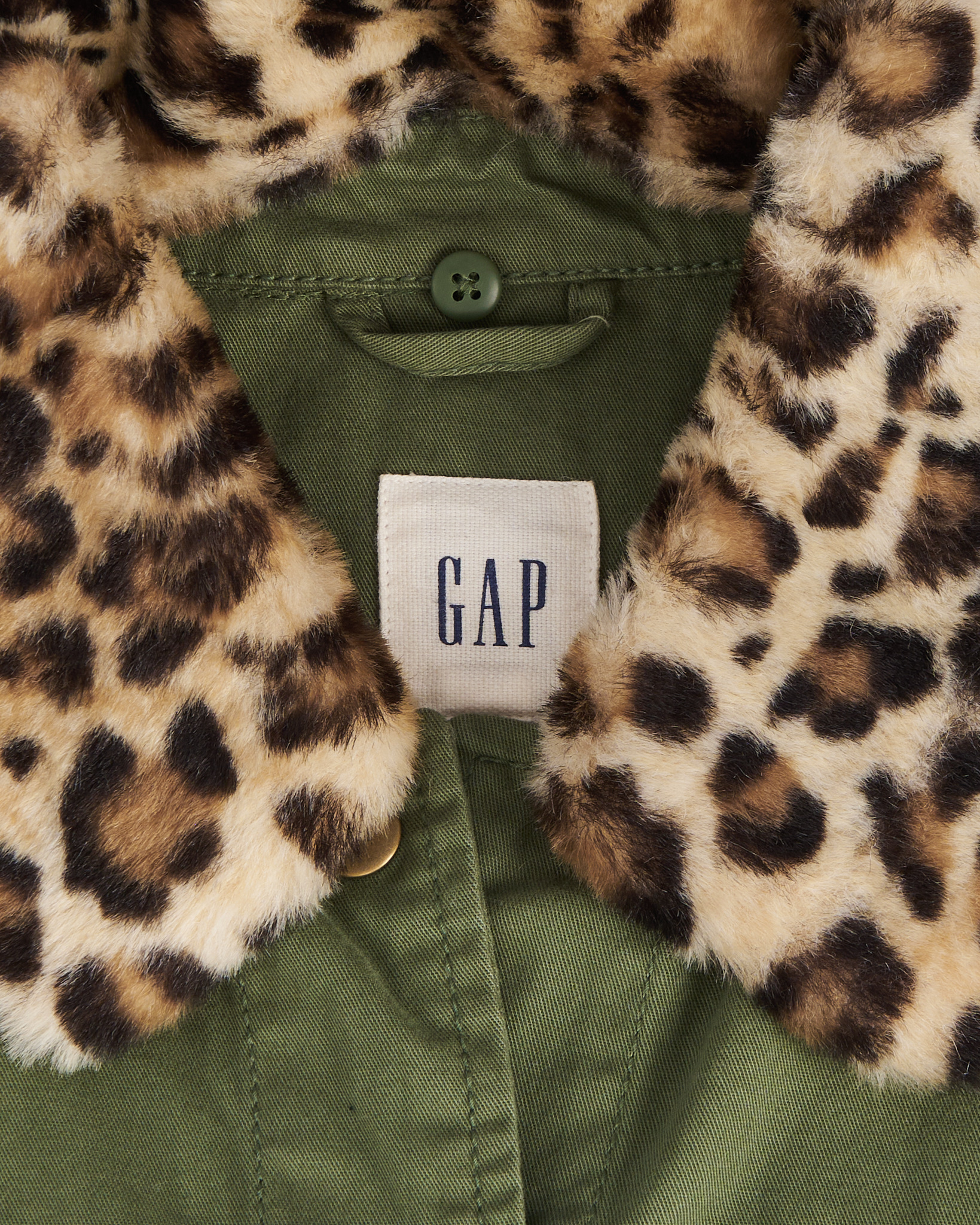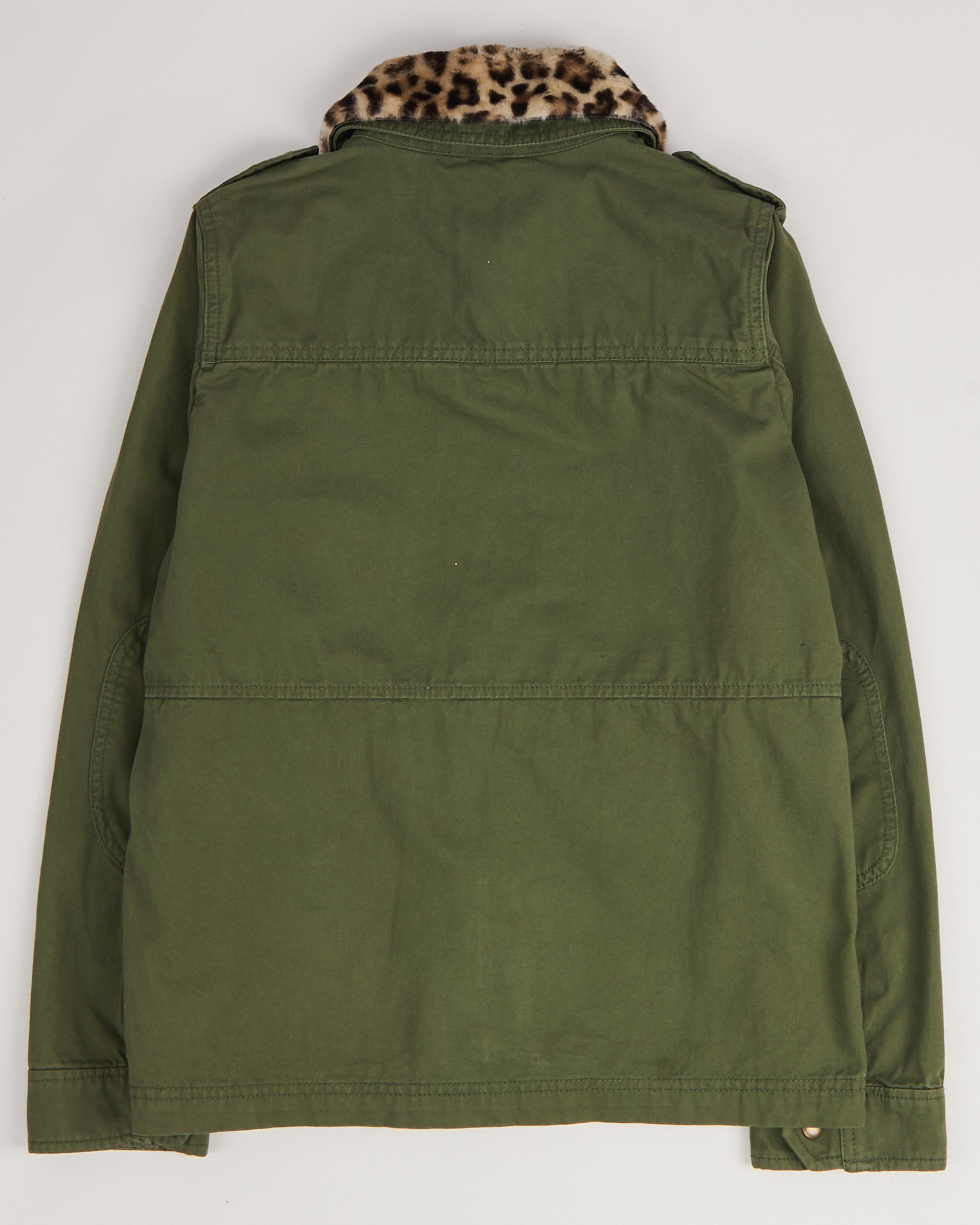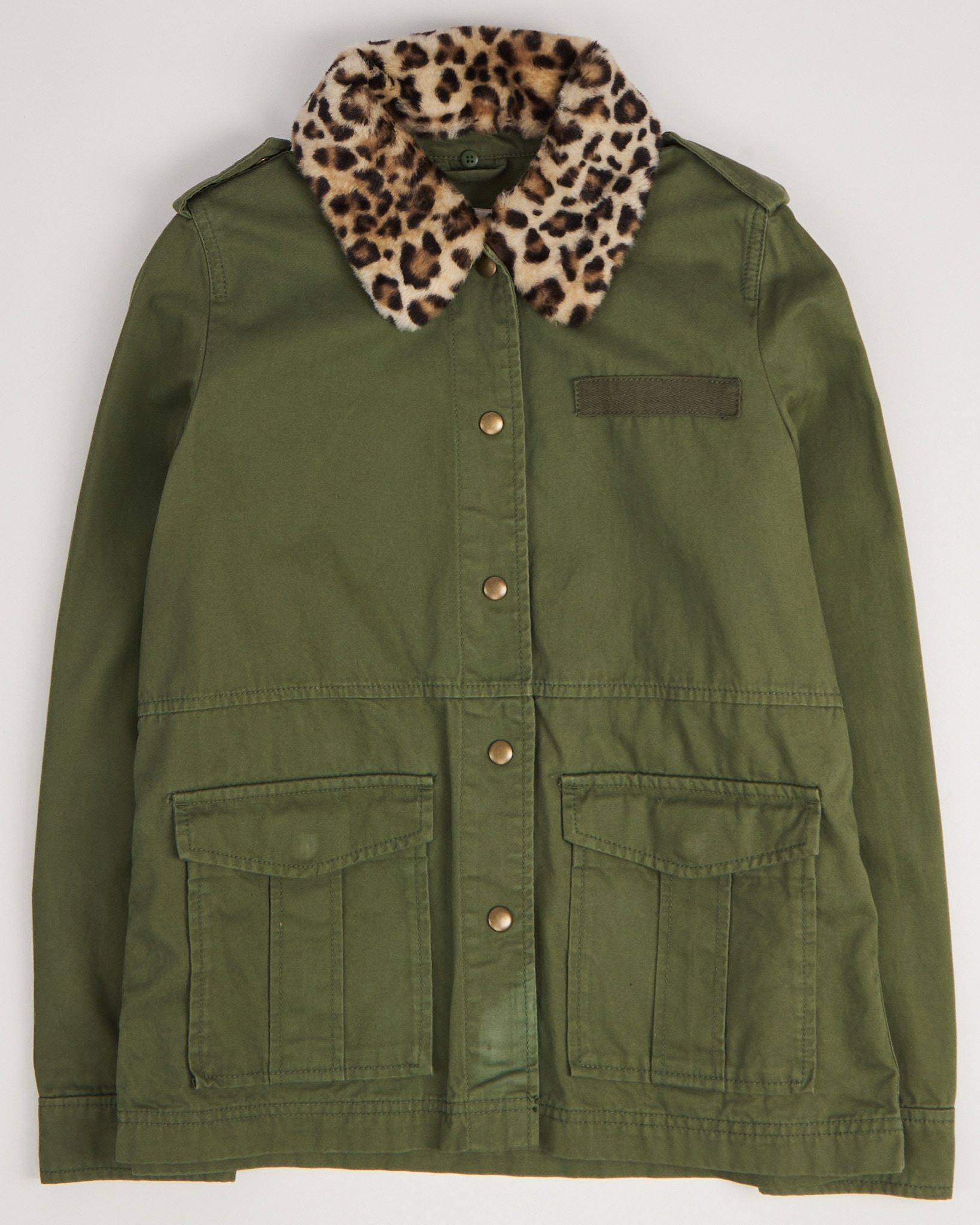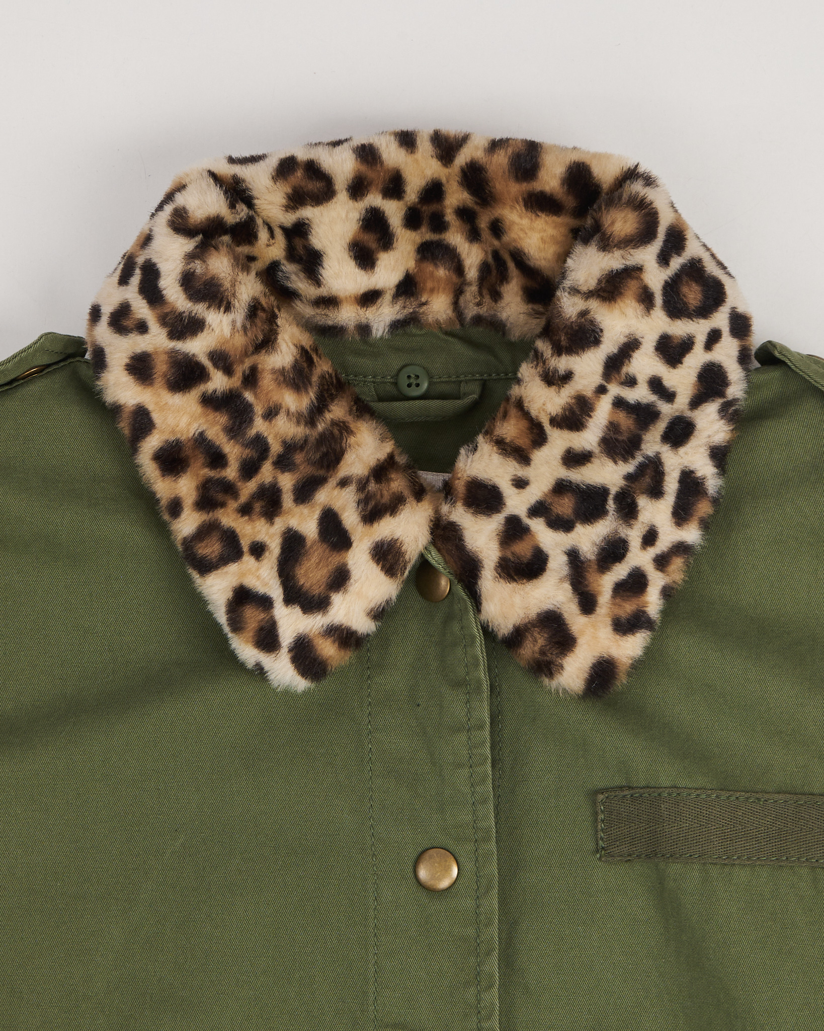 Выполнена из плотного хлопка. Прямого силуэта, с застёжкой на кнопках и крупными накладными карманами. Куртка дополнена воротником с леопардовым притом.